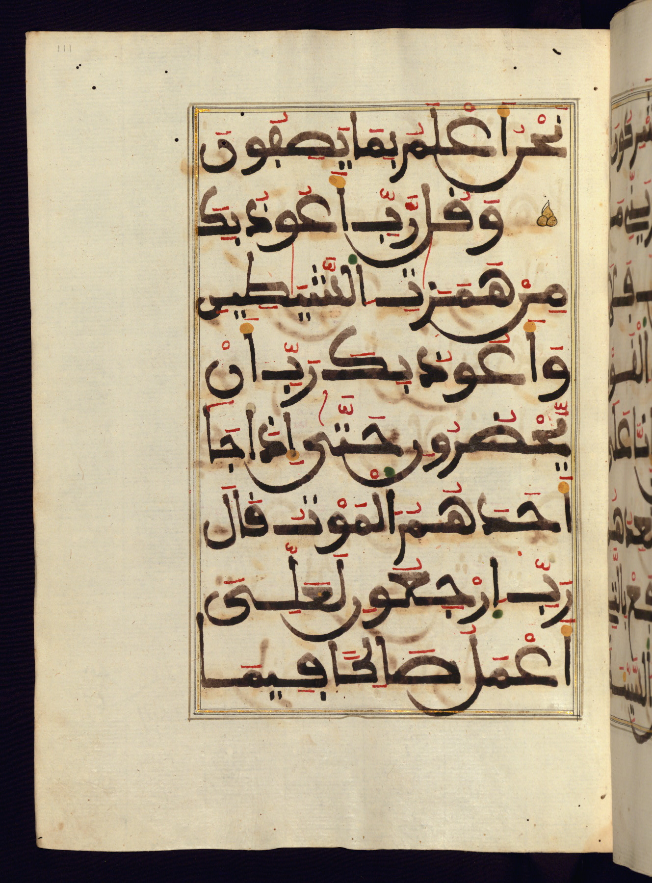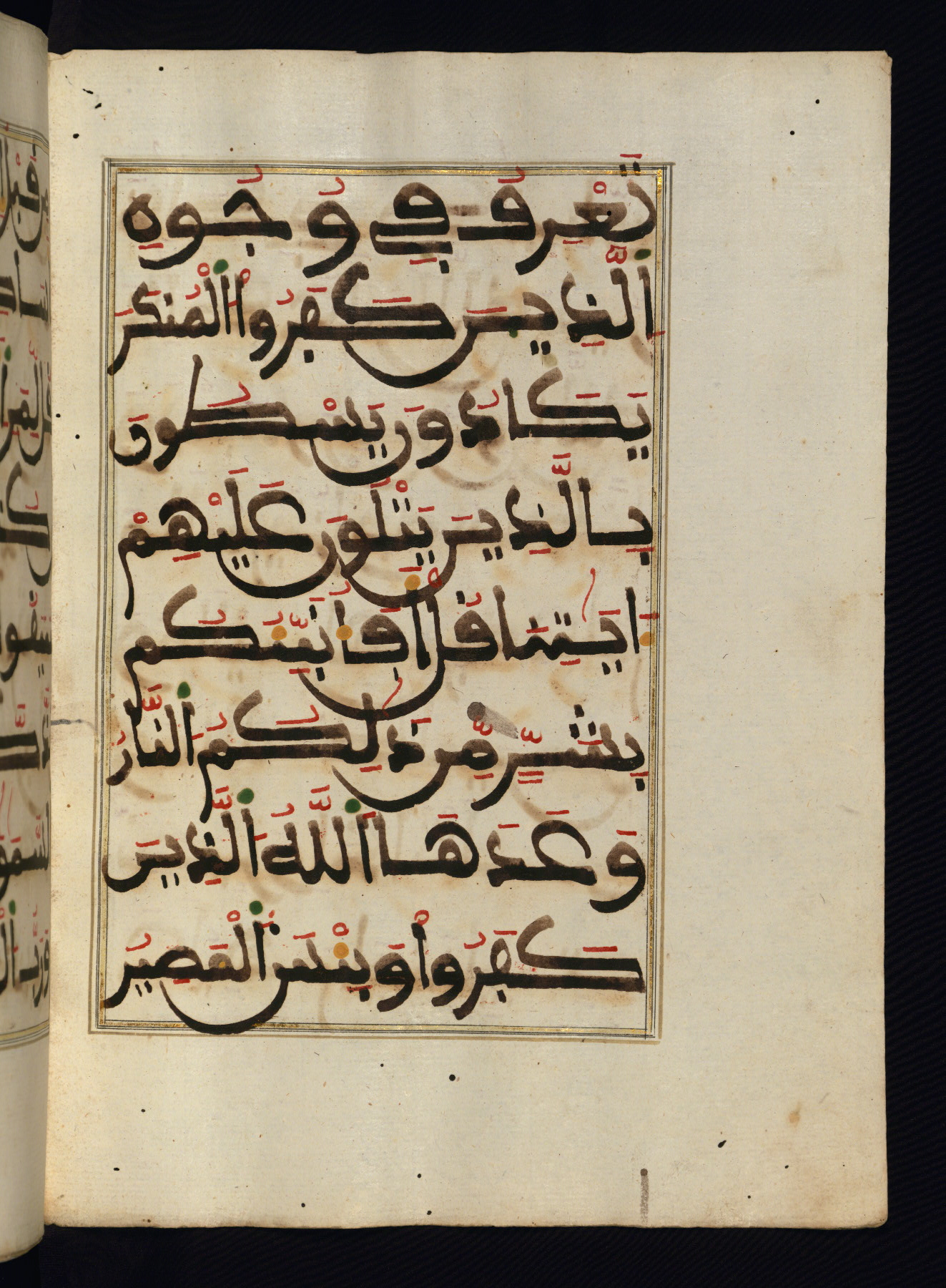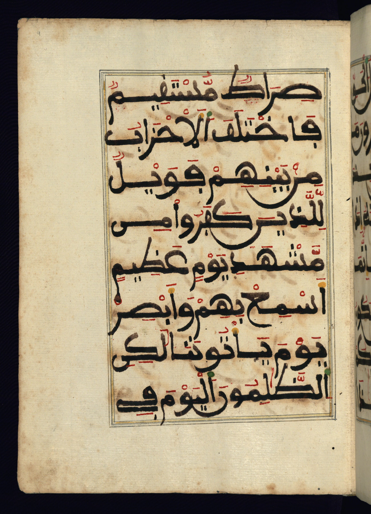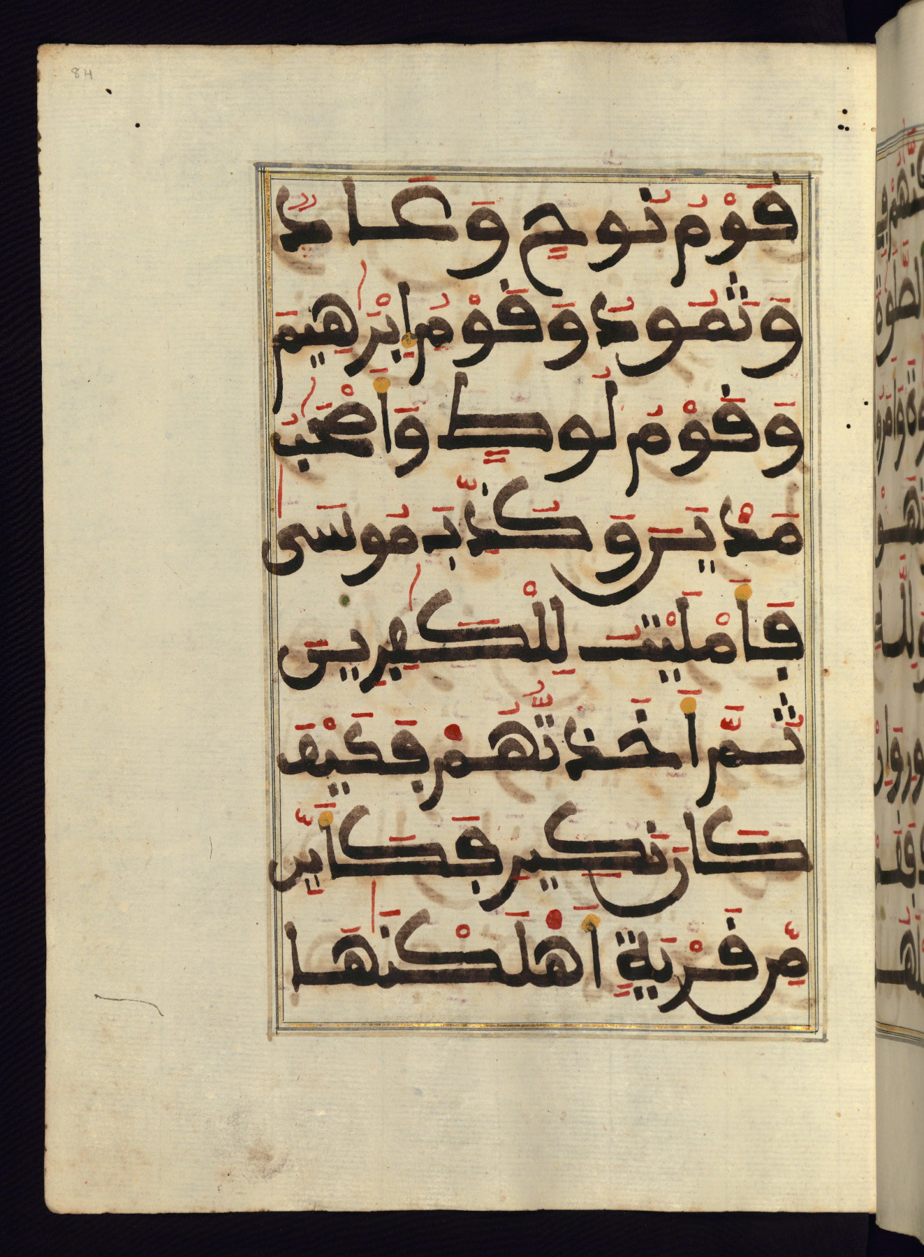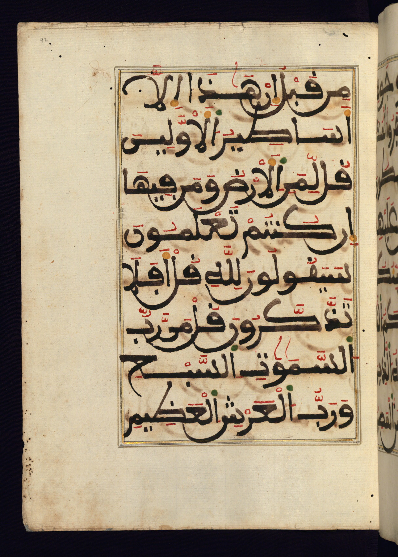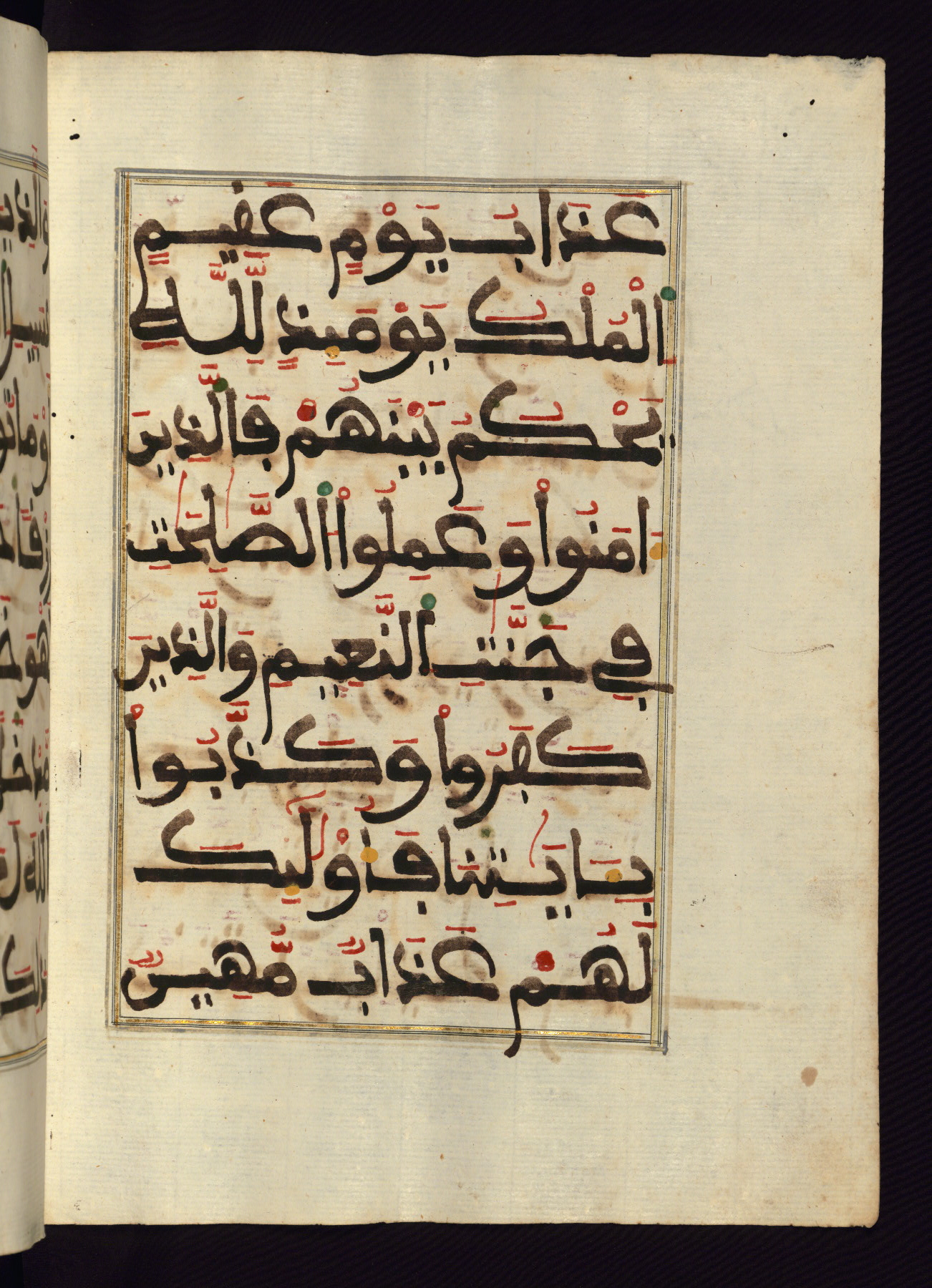 This manuscript is a fragment of the Qur'an, consisting of chapters 19 (Sūrat Maryam) through 23 (Sūrat al-muʾminūn). It was produced in the Maghreb and dates to the twelfth century AH / eighteenth CE. The text is written in a large Maghribī script, with vocalization in red, green, and yellow ink on Italian paper. The codex opens with an illuminated chapter heading for chapter 19 (Sūrat Maryam) written in the New Abbasid (broken cursive) style (fol. 1b) in gold ink within a decorative headpiece. The titles of other chapters are written in the New Abbasid (broken cursive) style in gold ink (fols. 21a, 47b, 70a, and 102a) with a marginal medallion. The blind-tooled goatskin binding is not contemporary with the manuscript and probably dates to the thirteenth century AH / nineteenth CE.