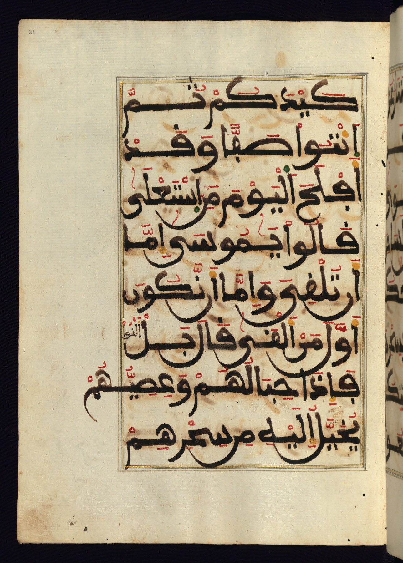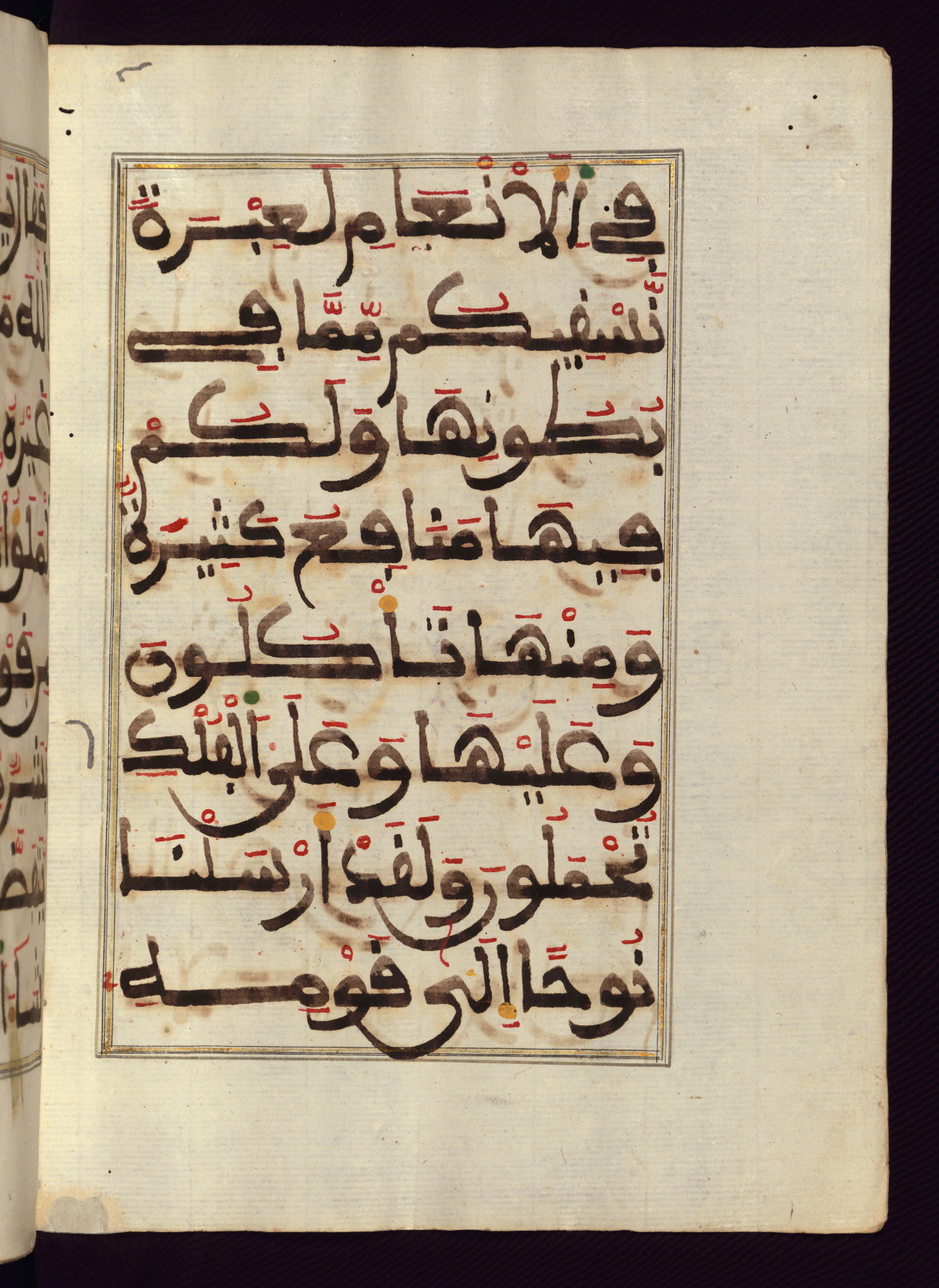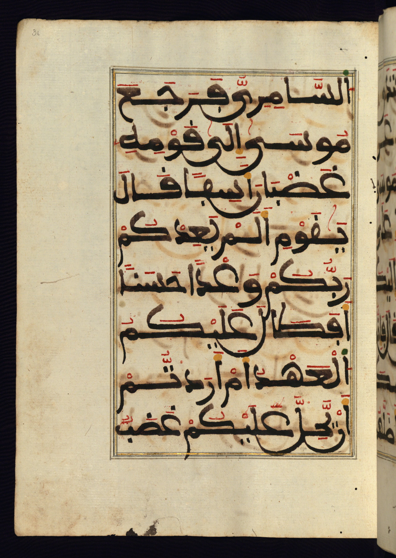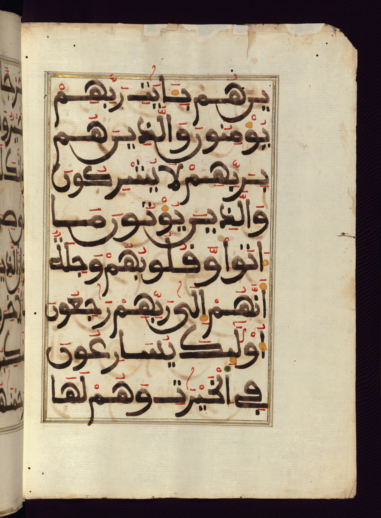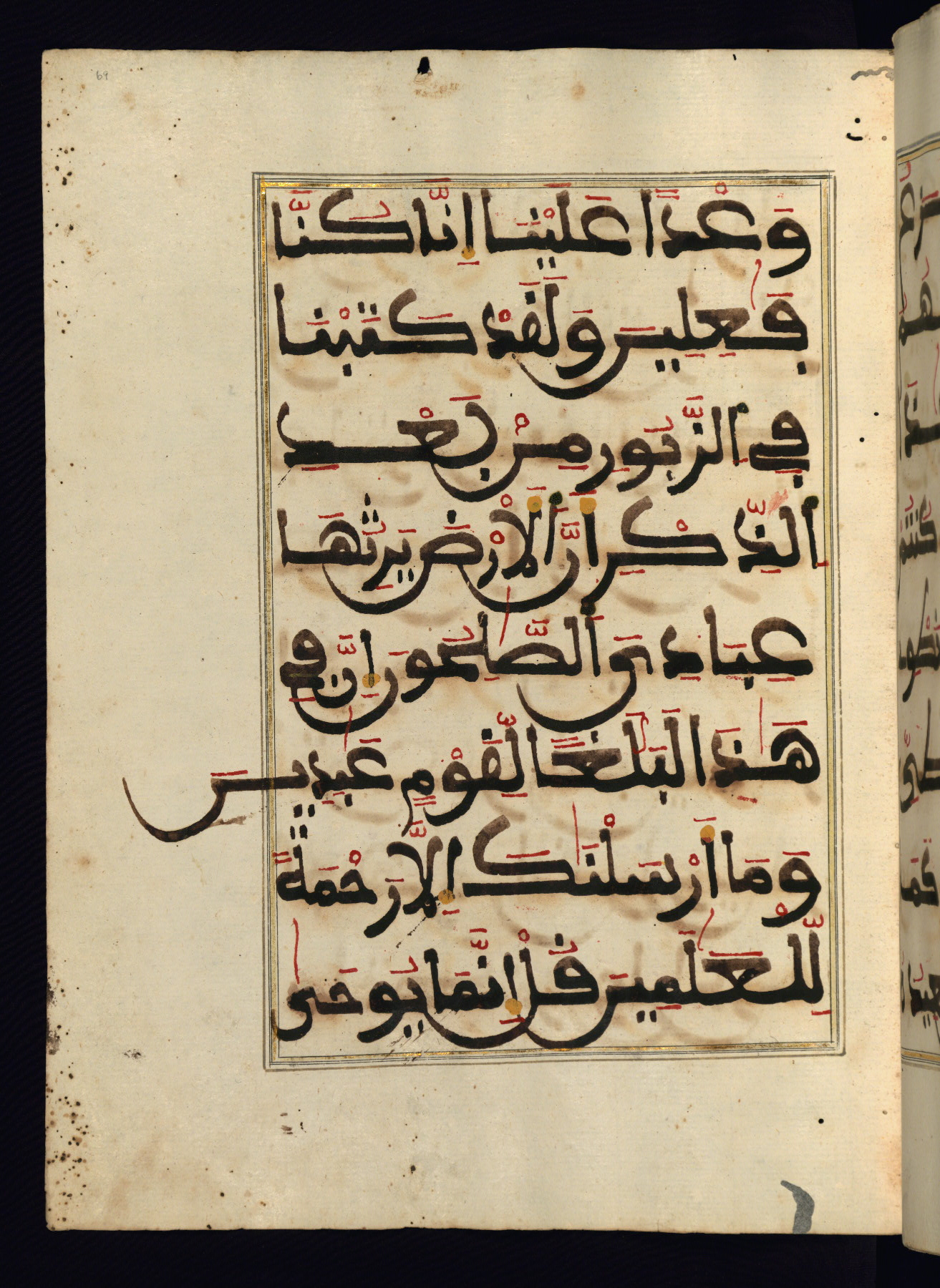 This manuscript is a fragment of the Qur'an, consisting of chapters 19 (Sūrat Maryam) through 23 (Sūrat al-muʾminūn). It was produced in the Maghreb and dates to the twelfth century AH / eighteenth CE. The text is written in a large Maghribī script, with vocalization in red, green, and yellow ink on Italian paper. The codex opens with an illuminated chapter heading for chapter 19 (Sūrat Maryam) written in the New Abbasid (broken cursive) style (fol. 1b) in gold ink within a decorative headpiece. The titles of other chapters are written in the New Abbasid (broken cursive) style in gold ink (fols. 21a, 47b, 70a, and 102a) with a marginal medallion. The blind-tooled goatskin binding is not contemporary with the manuscript and probably dates to the thirteenth century AH / nineteenth CE.