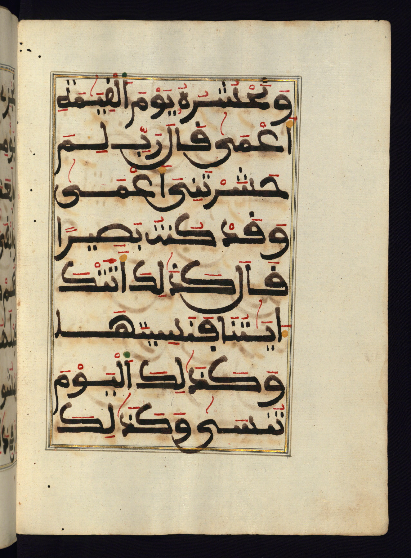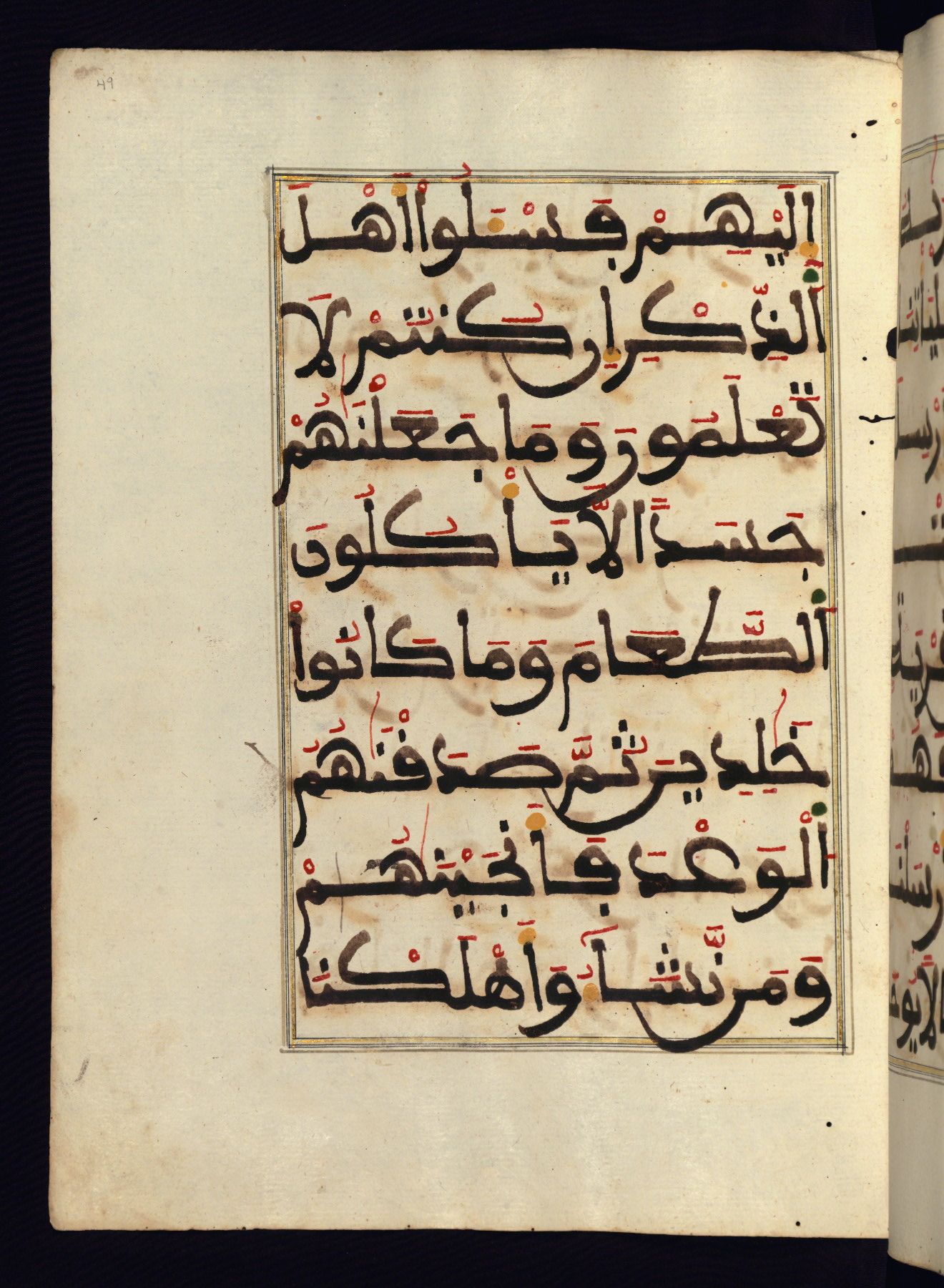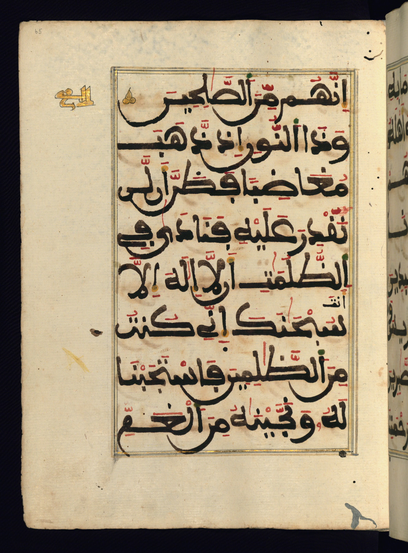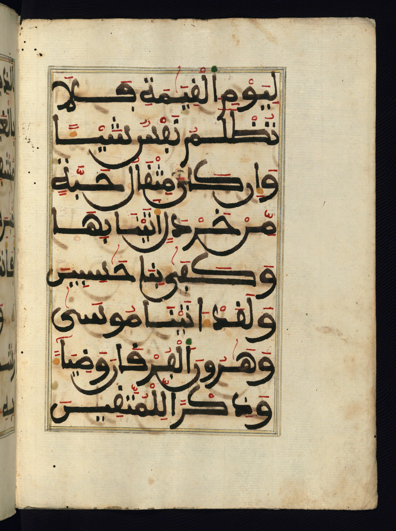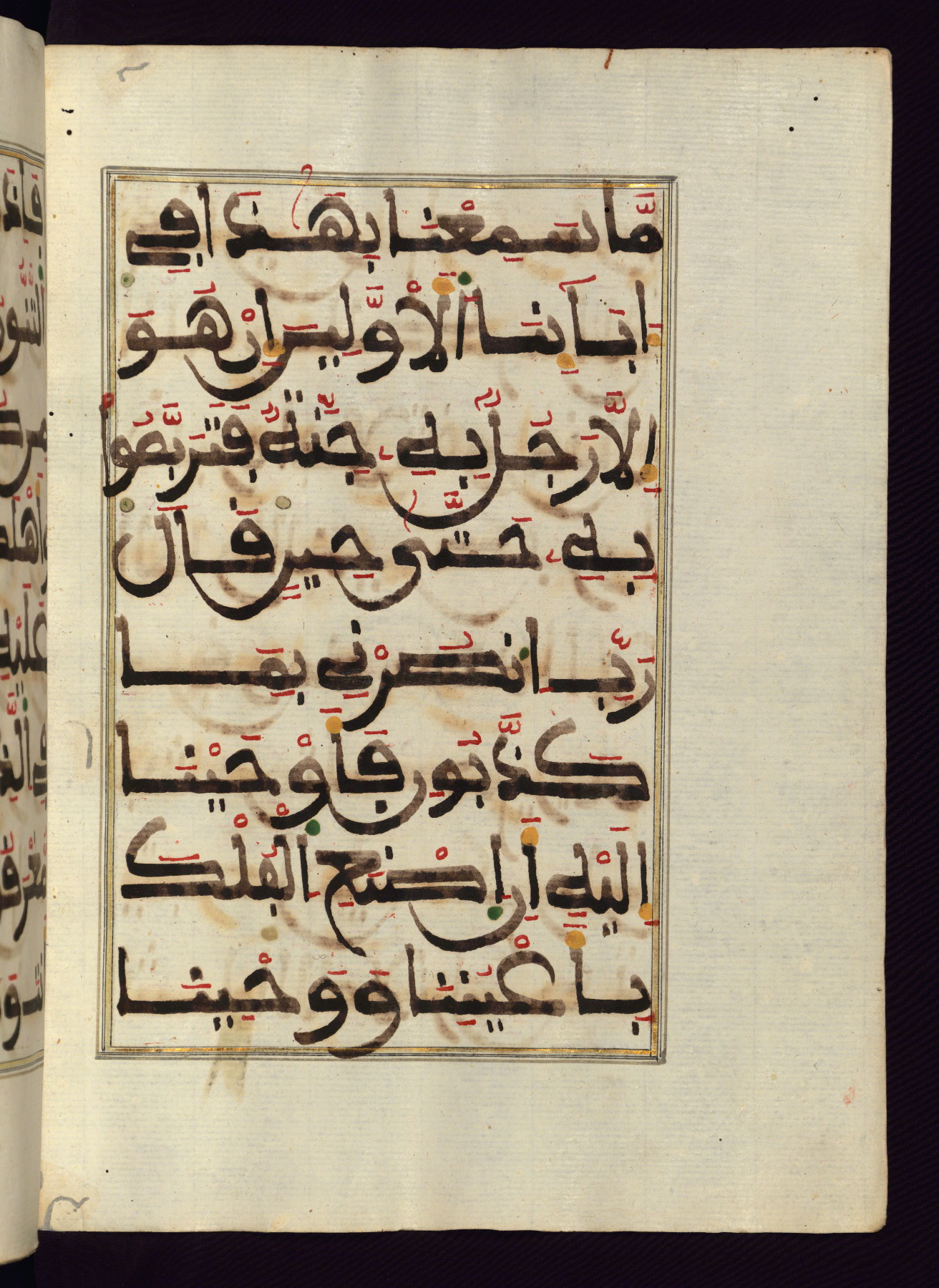 This manuscript is a fragment of the Qur'an, consisting of chapters 19 (Sūrat Maryam) through 23 (Sūrat al-muʾminūn). It was produced in the Maghreb and dates to the twelfth century AH / eighteenth CE. The text is written in a large Maghribī script, with vocalization in red, green, and yellow ink on Italian paper. The codex opens with an illuminated chapter heading for chapter 19 (Sūrat Maryam) written in the New Abbasid (broken cursive) style (fol. 1b) in gold ink within a decorative headpiece. The titles of other chapters are written in the New Abbasid (broken cursive) style in gold ink (fols. 21a, 47b, 70a, and 102a) with a marginal medallion. The blind-tooled goatskin binding is not contemporary with the manuscript and probably dates to the thirteenth century AH / nineteenth CE.