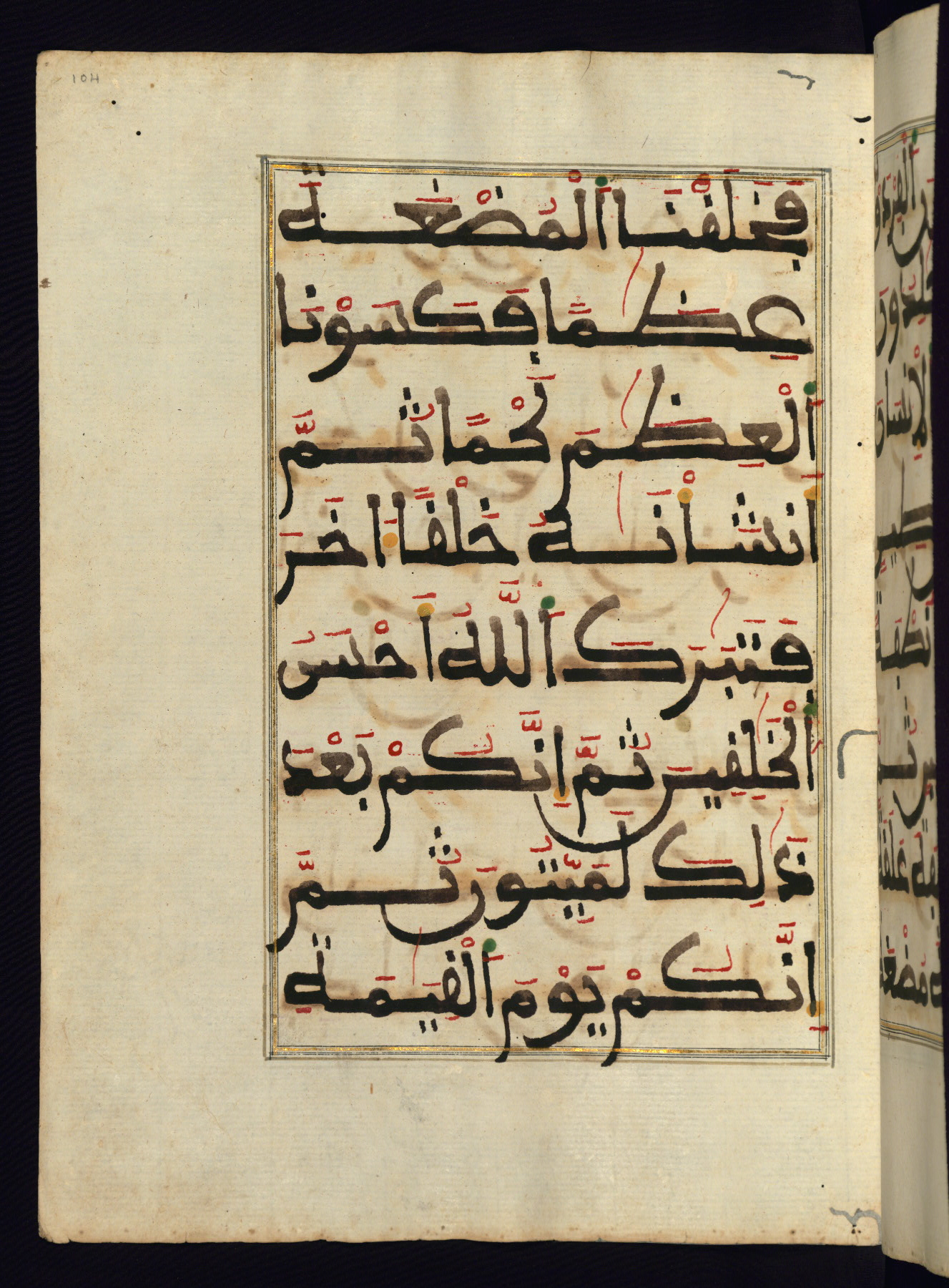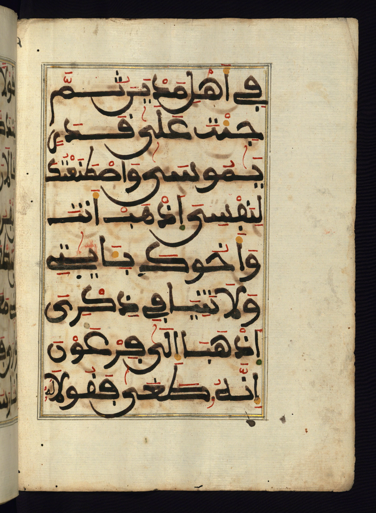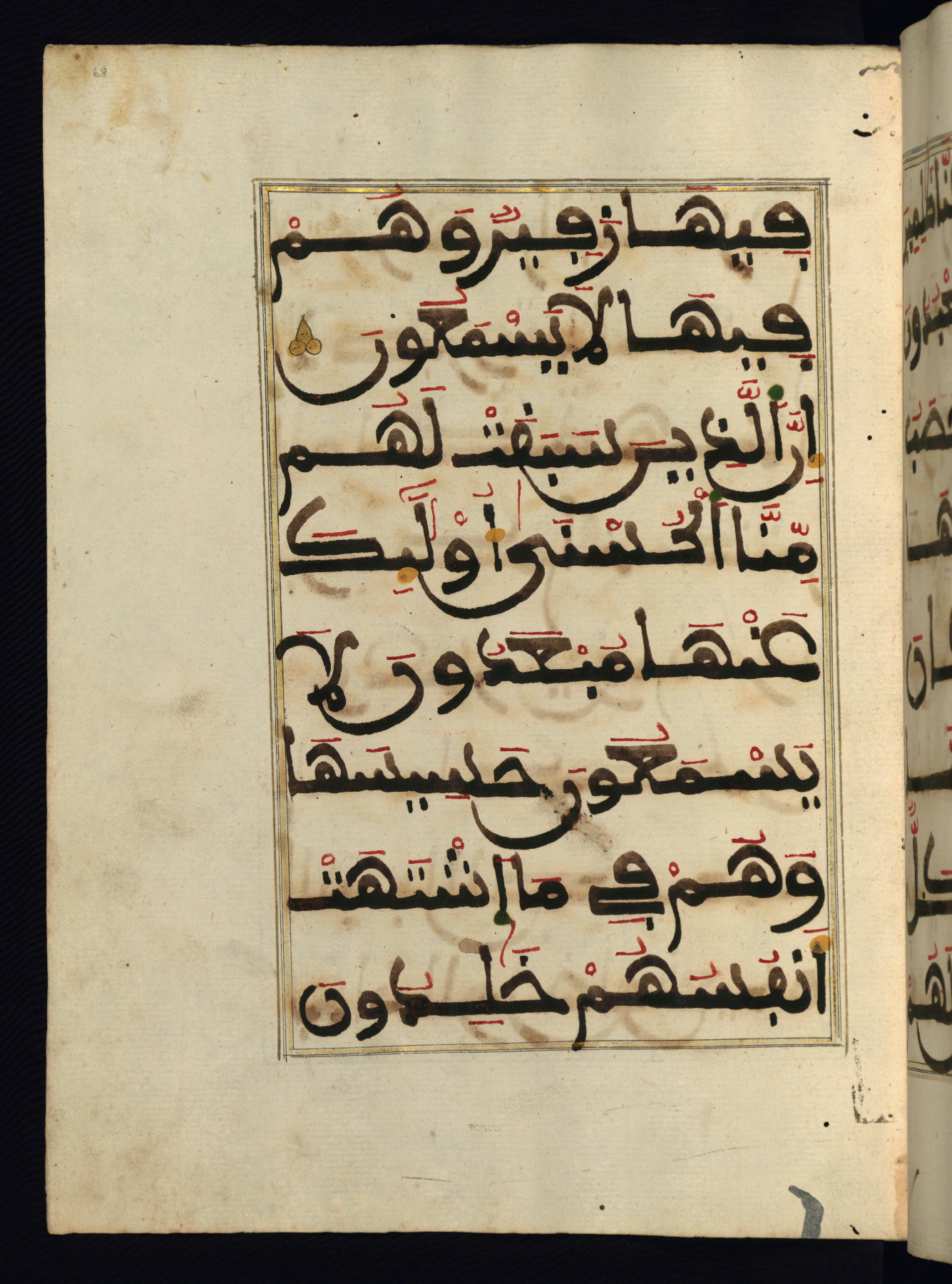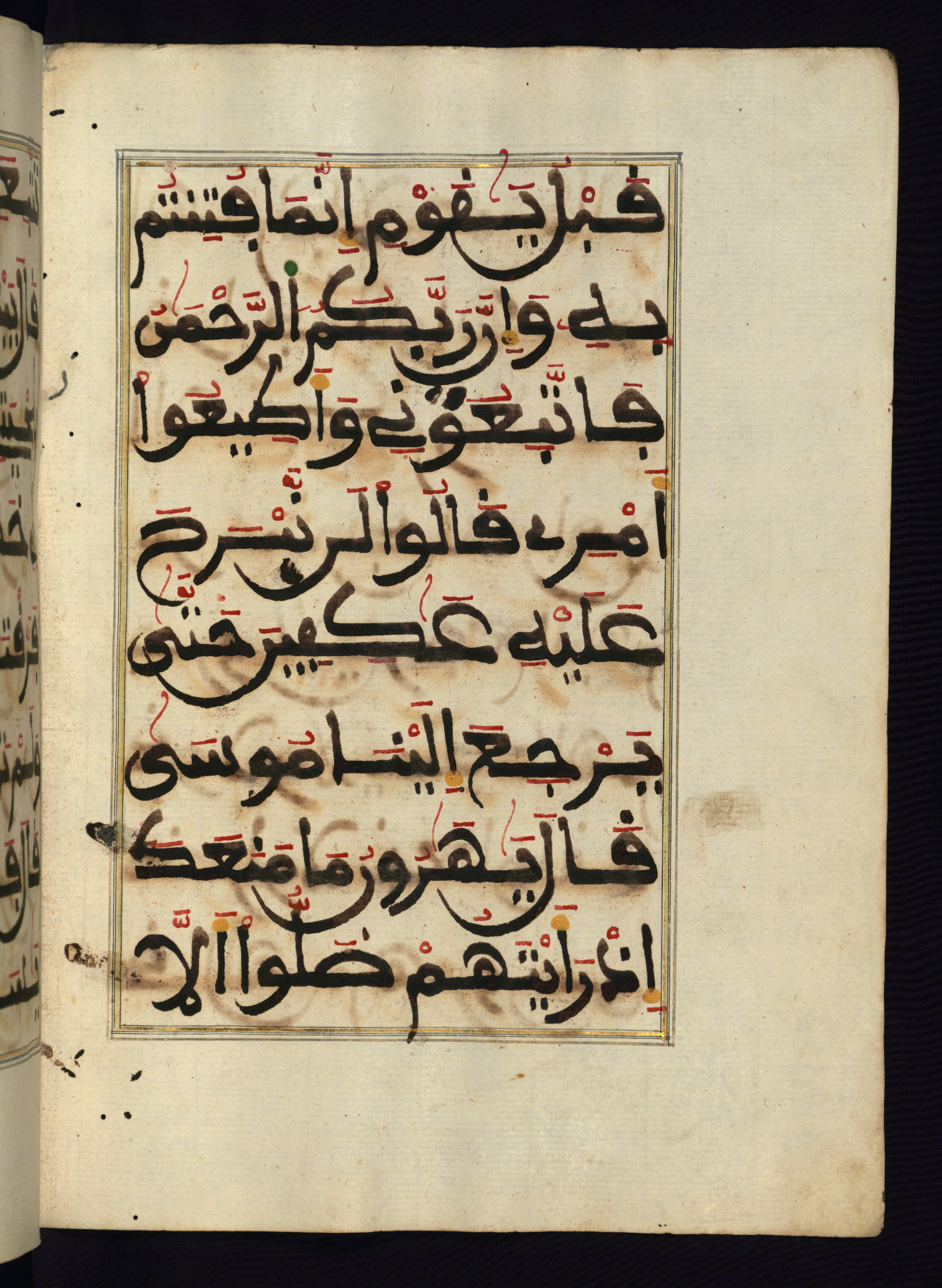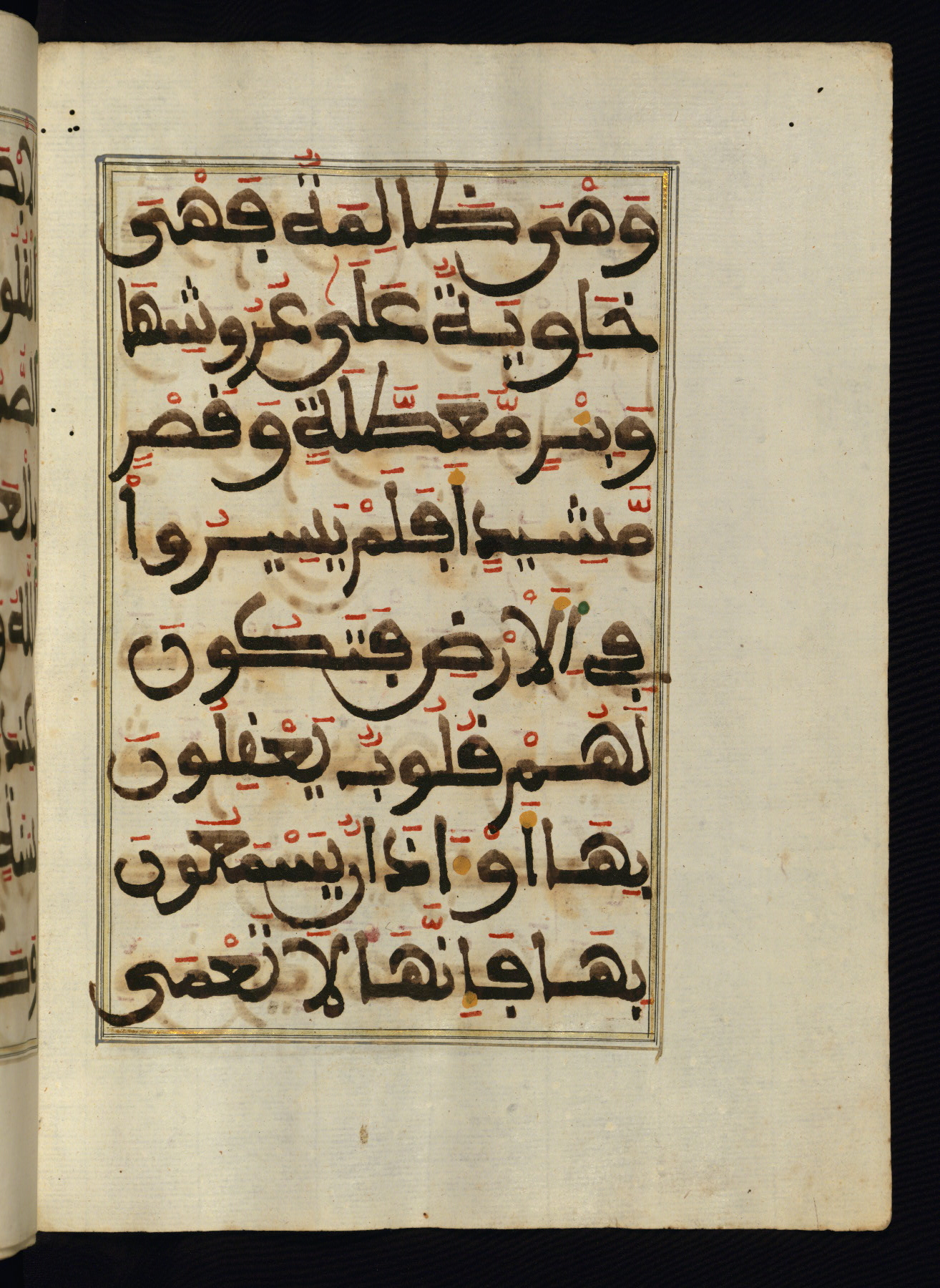 This manuscript is a fragment of the Qur'an, consisting of chapters 19 (Sūrat Maryam) through 23 (Sūrat al-muʾminūn). It was produced in the Maghreb and dates to the twelfth century AH / eighteenth CE. The text is written in a large Maghribī script, with vocalization in red, green, and yellow ink on Italian paper. The codex opens with an illuminated chapter heading for chapter 19 (Sūrat Maryam) written in the New Abbasid (broken cursive) style (fol. 1b) in gold ink within a decorative headpiece. The titles of other chapters are written in the New Abbasid (broken cursive) style in gold ink (fols. 21a, 47b, 70a, and 102a) with a marginal medallion. The blind-tooled goatskin binding is not contemporary with the manuscript and probably dates to the thirteenth century AH / nineteenth CE.