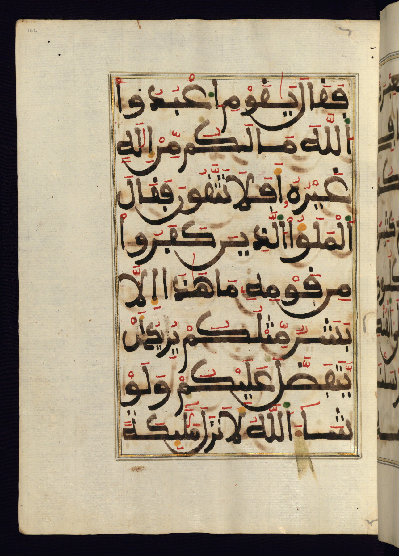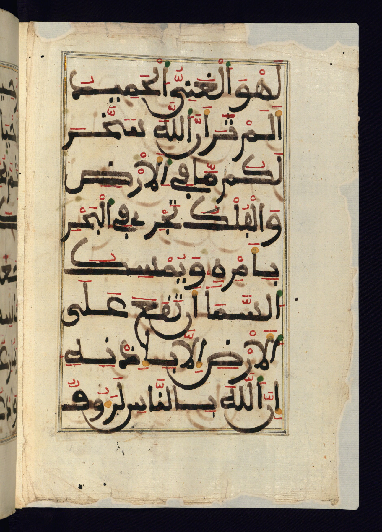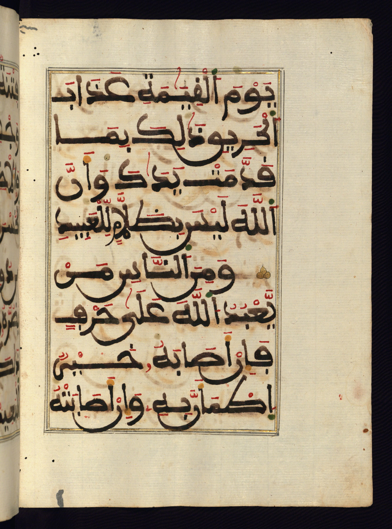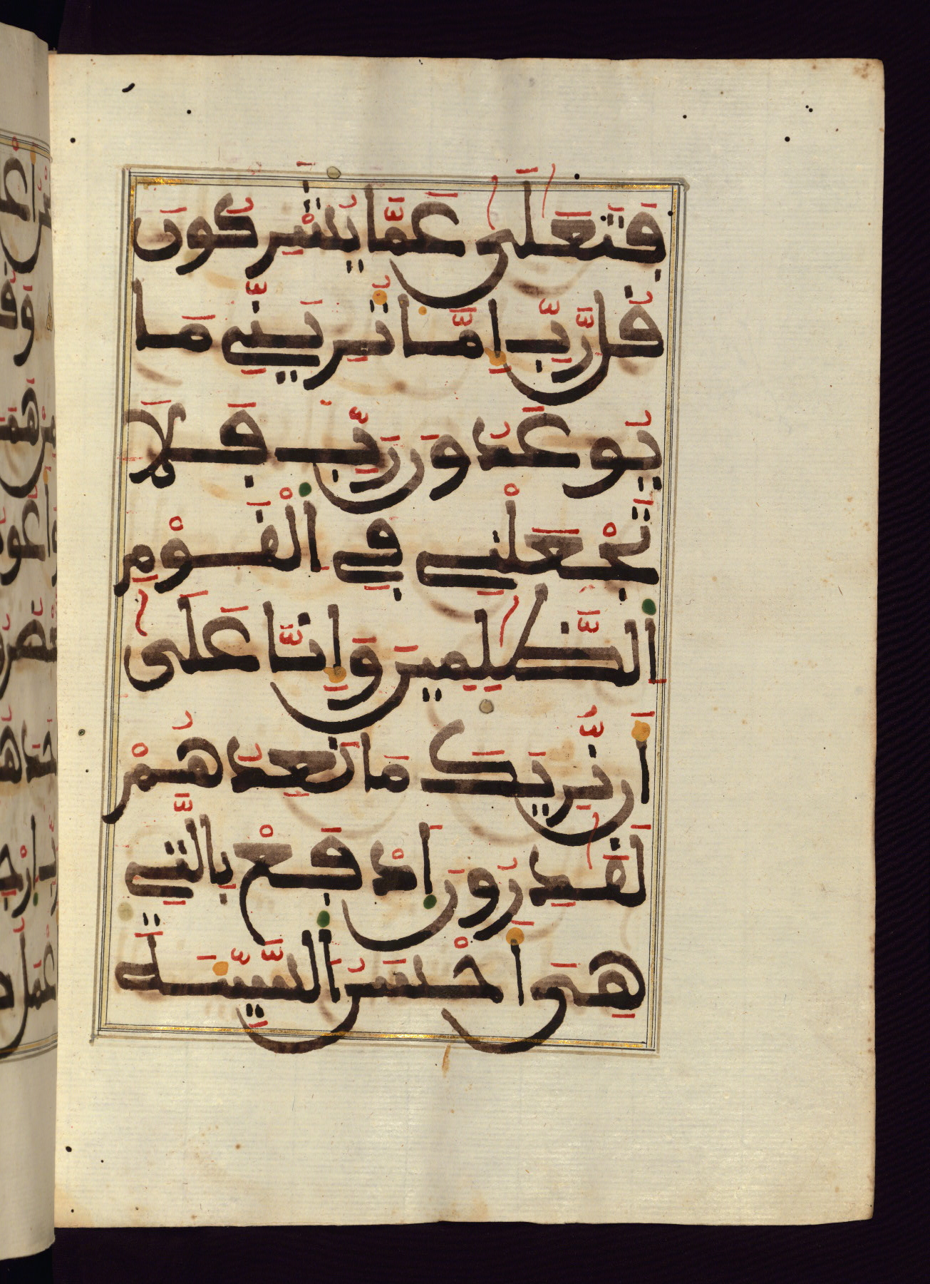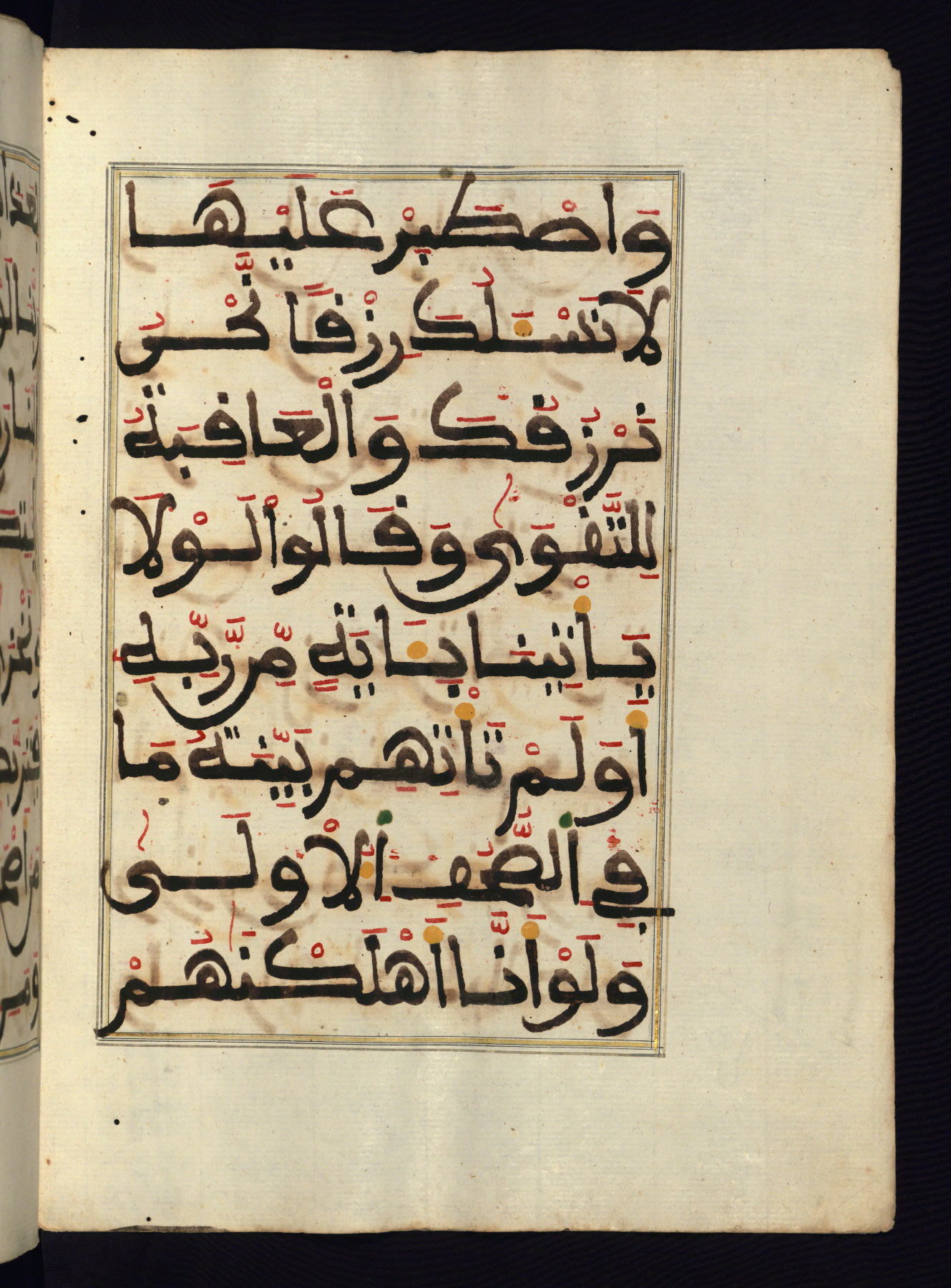 This manuscript is a fragment of the Qur'an, consisting of chapters 19 (Sūrat Maryam) through 23 (Sūrat al-muʾminūn). It was produced in the Maghreb and dates to the twelfth century AH / eighteenth CE. The text is written in a large Maghribī script, with vocalization in red, green, and yellow ink on Italian paper. The codex opens with an illuminated chapter heading for chapter 19 (Sūrat Maryam) written in the New Abbasid (broken cursive) style (fol. 1b) in gold ink within a decorative headpiece. The titles of other chapters are written in the New Abbasid (broken cursive) style in gold ink (fols. 21a, 47b, 70a, and 102a) with a marginal medallion. The blind-tooled goatskin binding is not contemporary with the manuscript and probably dates to the thirteenth century AH / nineteenth CE.