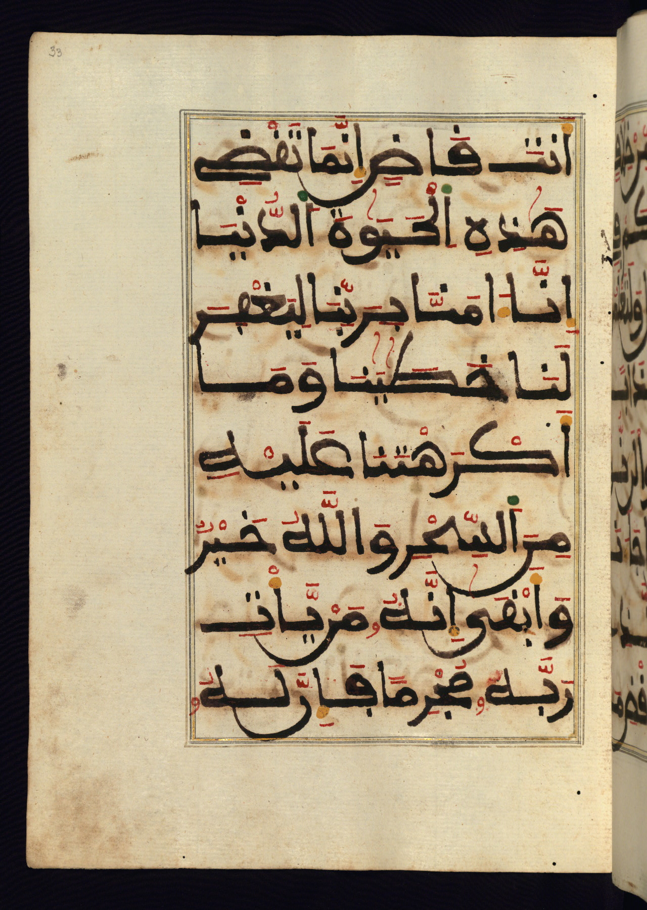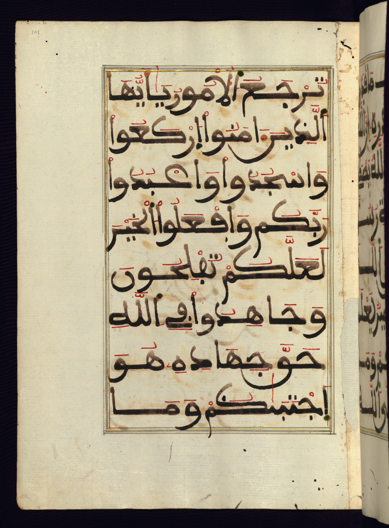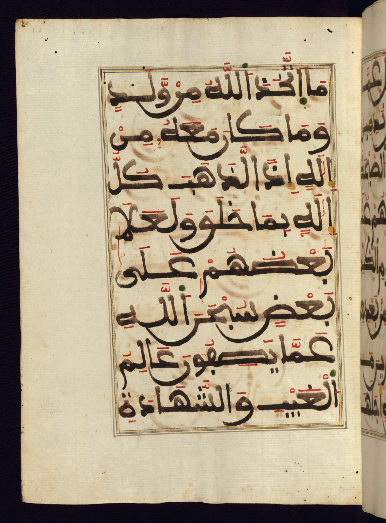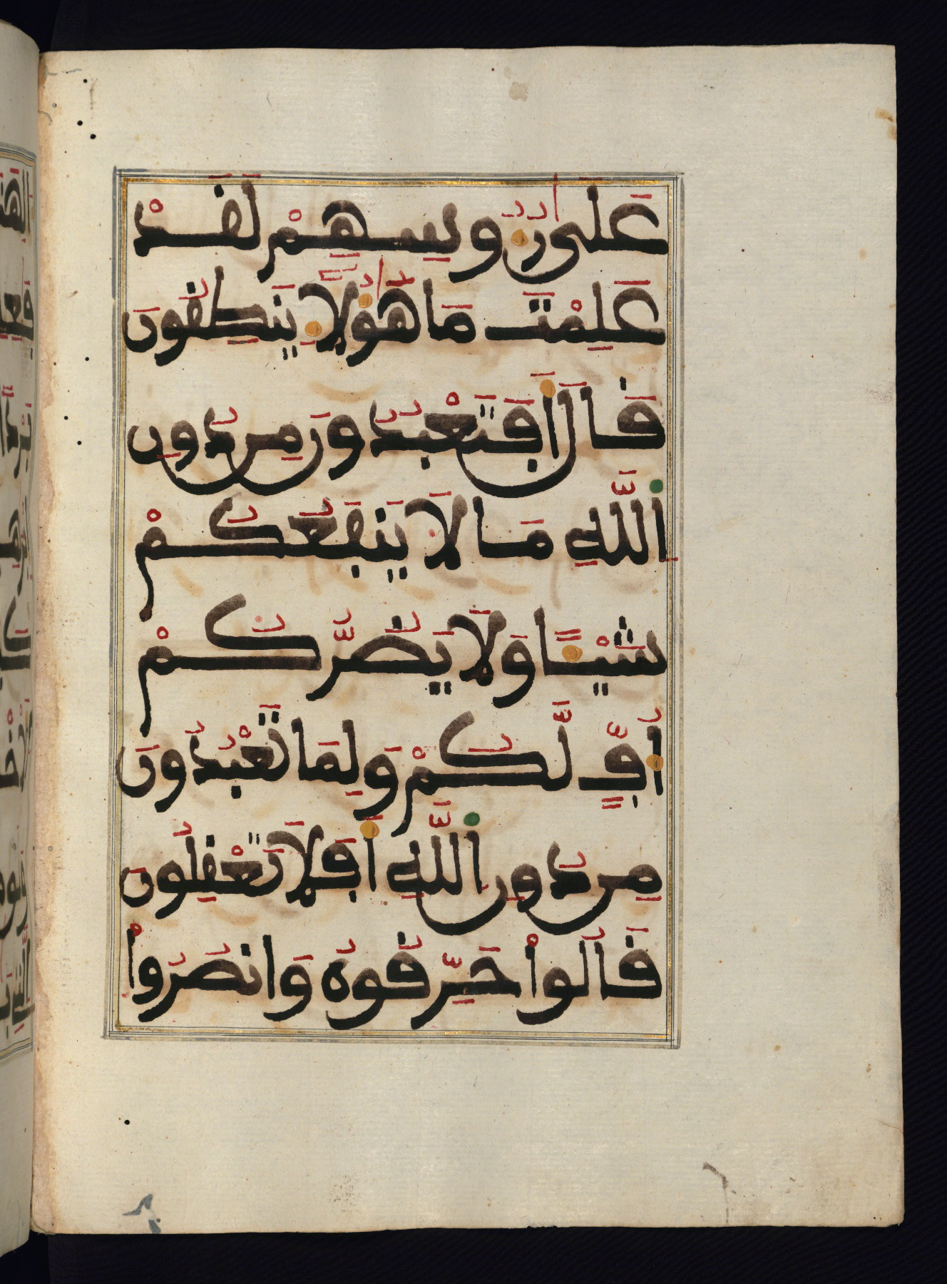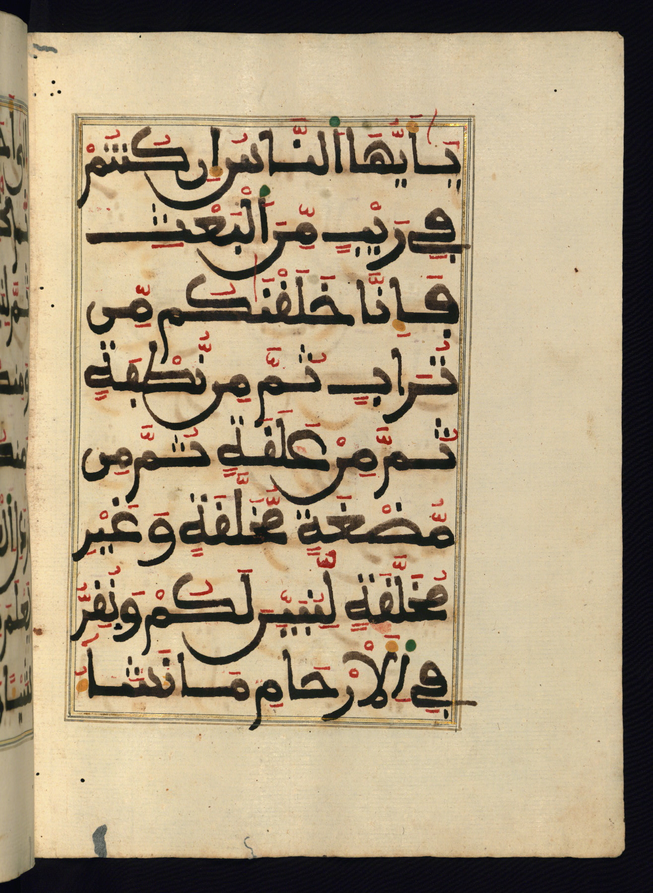 This manuscript is a fragment of the Qur'an, consisting of chapters 19 (Sūrat Maryam) through 23 (Sūrat al-muʾminūn). It was produced in the Maghreb and dates to the twelfth century AH / eighteenth CE. The text is written in a large Maghribī script, with vocalization in red, green, and yellow ink on Italian paper. The codex opens with an illuminated chapter heading for chapter 19 (Sūrat Maryam) written in the New Abbasid (broken cursive) style (fol. 1b) in gold ink within a decorative headpiece. The titles of other chapters are written in the New Abbasid (broken cursive) style in gold ink (fols. 21a, 47b, 70a, and 102a) with a marginal medallion. The blind-tooled goatskin binding is not contemporary with the manuscript and probably dates to the thirteenth century AH / nineteenth CE.