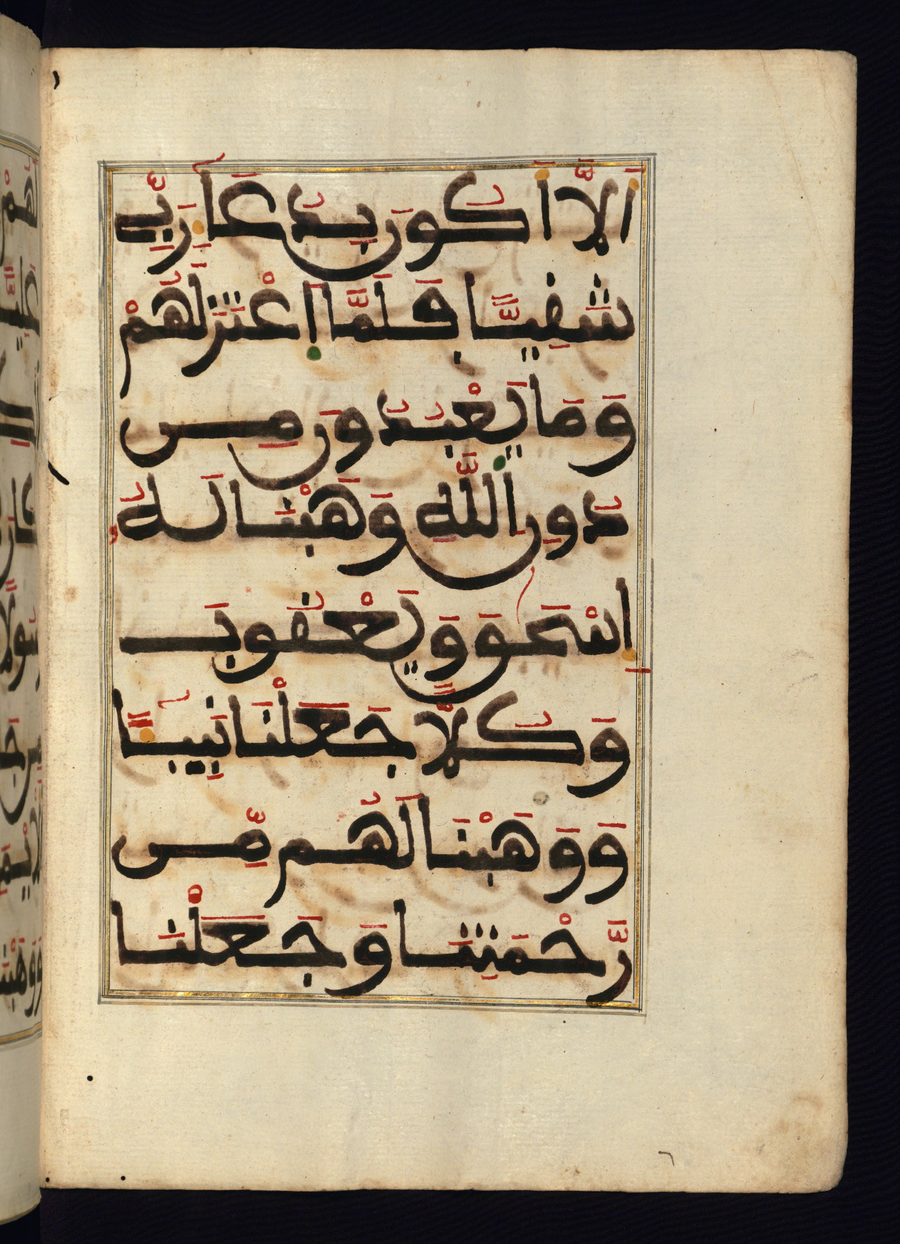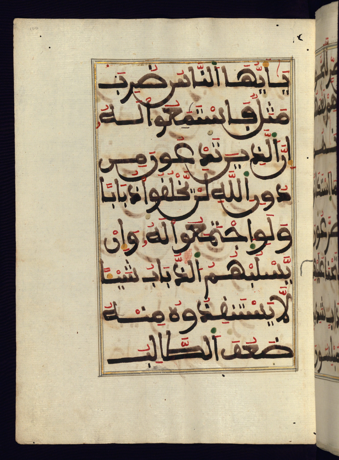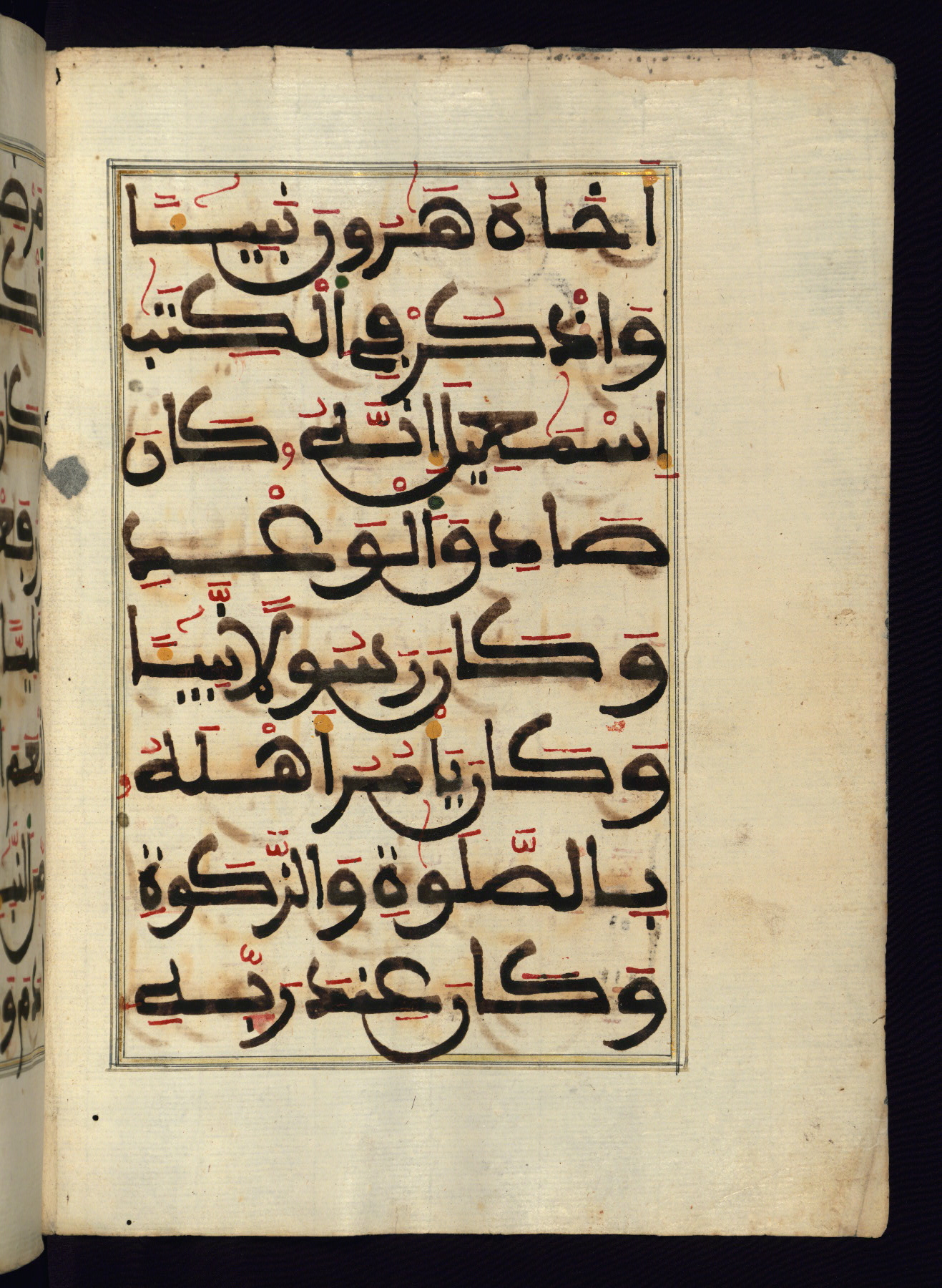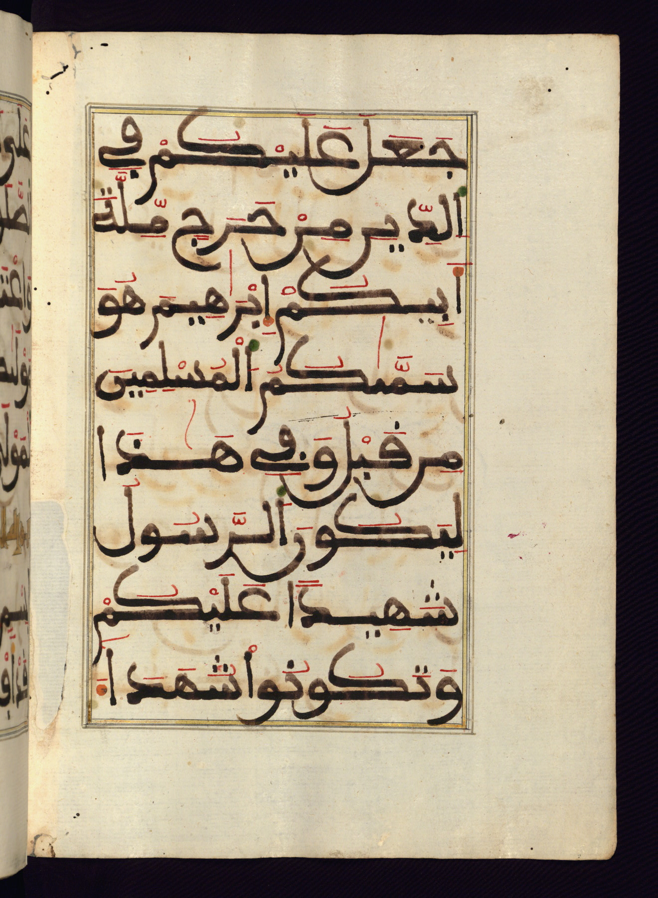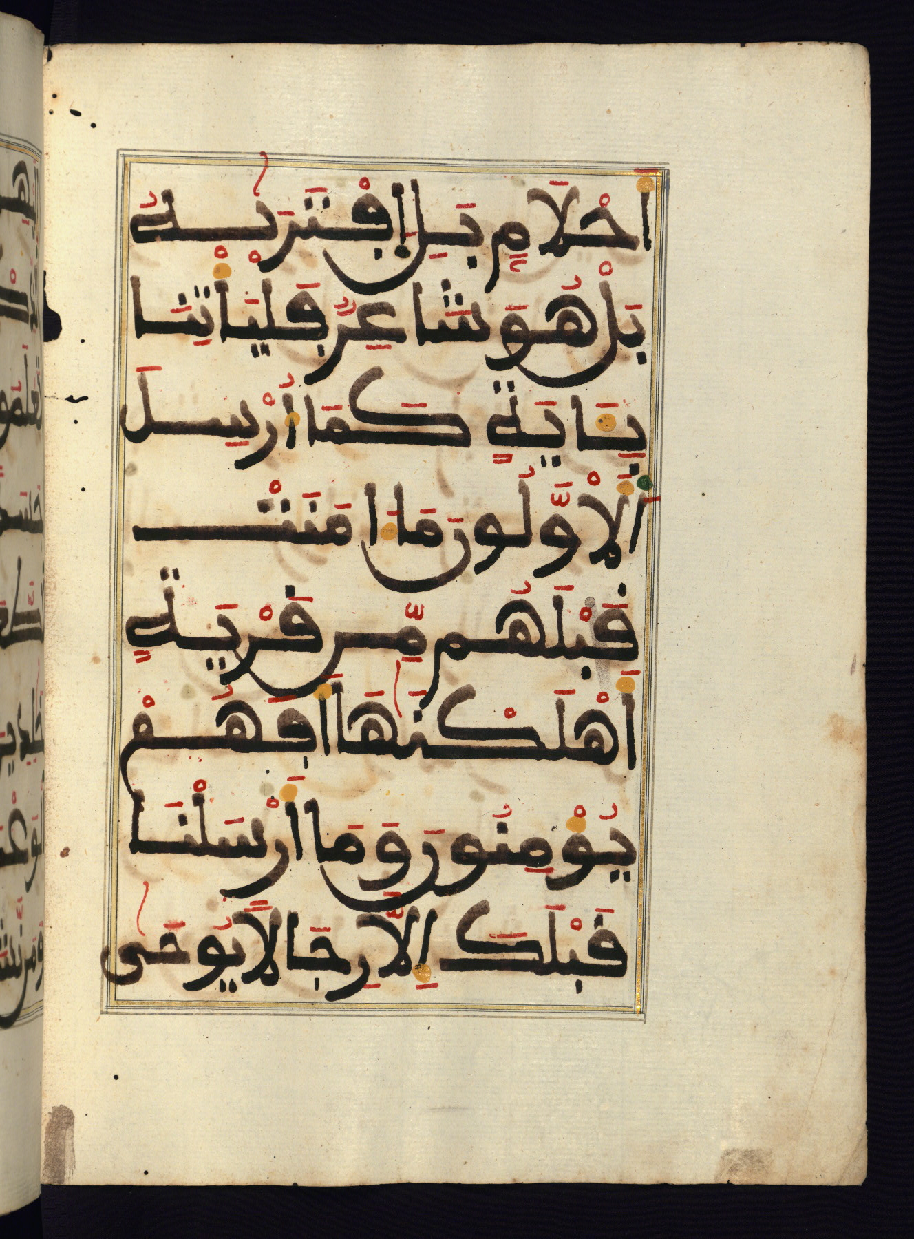 This manuscript is a fragment of the Qur'an, consisting of chapters 19 (Sūrat Maryam) through 23 (Sūrat al-muʾminūn). It was produced in the Maghreb and dates to the twelfth century AH / eighteenth CE. The text is written in a large Maghribī script, with vocalization in red, green, and yellow ink on Italian paper. The codex opens with an illuminated chapter heading for chapter 19 (Sūrat Maryam) written in the New Abbasid (broken cursive) style (fol. 1b) in gold ink within a decorative headpiece. The titles of other chapters are written in the New Abbasid (broken cursive) style in gold ink (fols. 21a, 47b, 70a, and 102a) with a marginal medallion. The blind-tooled goatskin binding is not contemporary with the manuscript and probably dates to the thirteenth century AH / nineteenth CE.