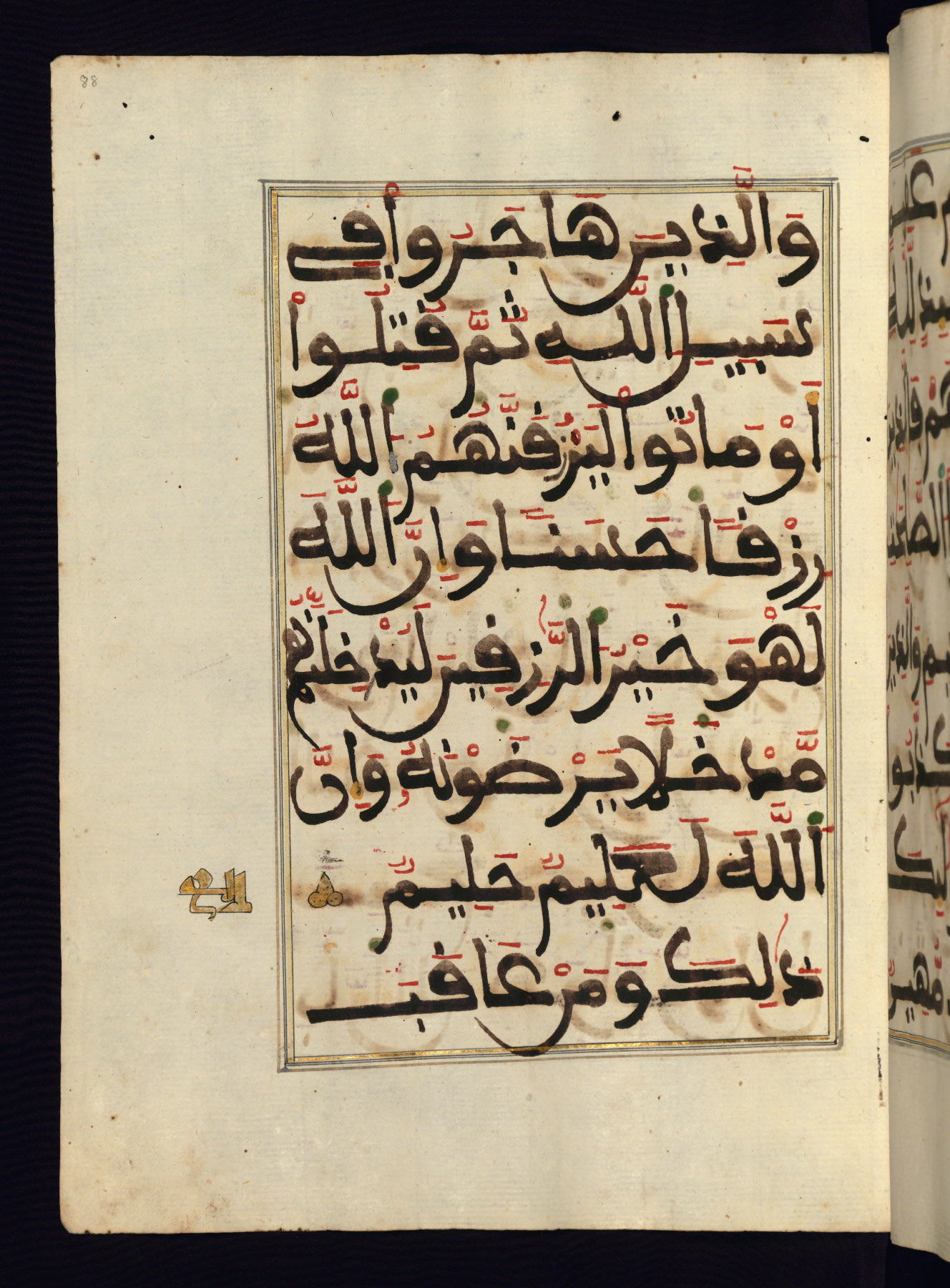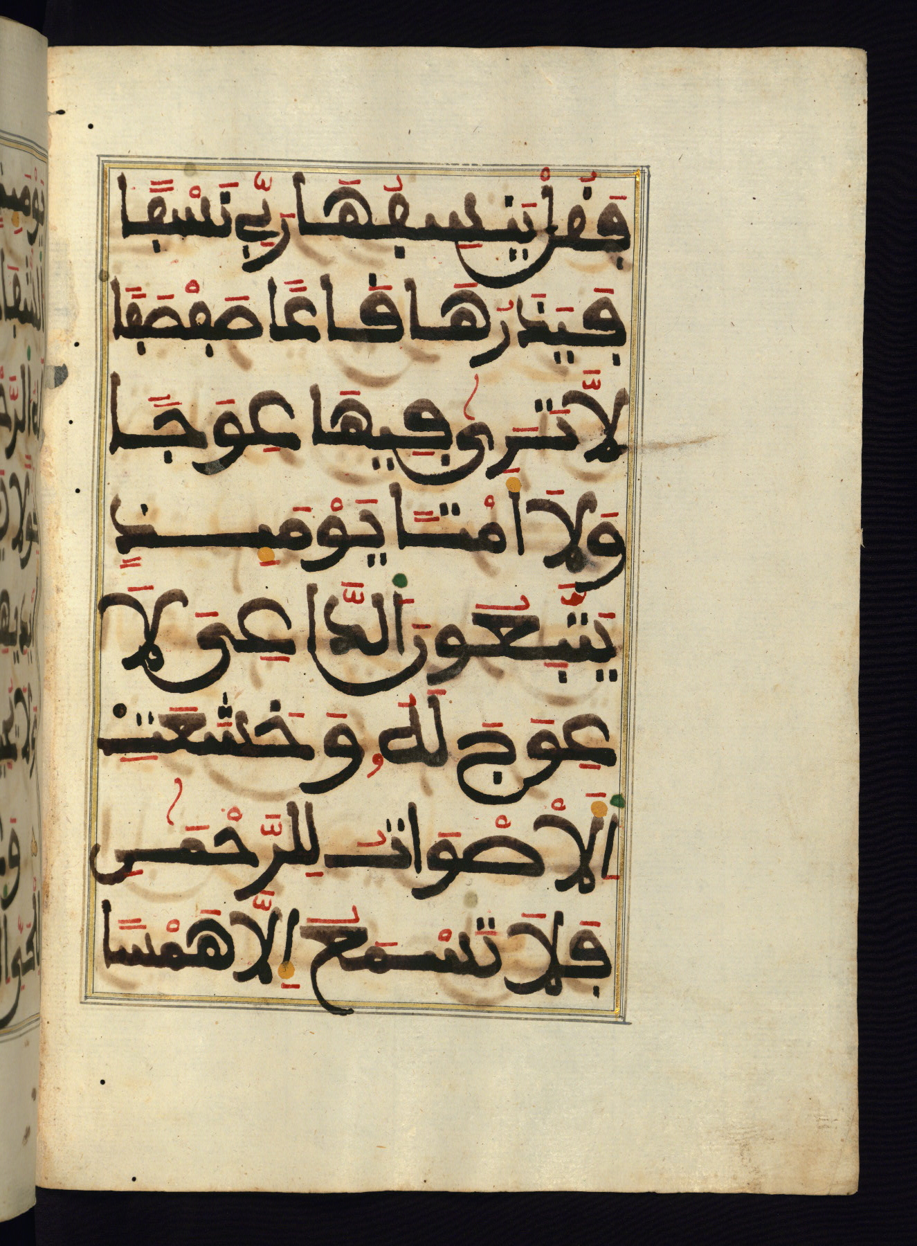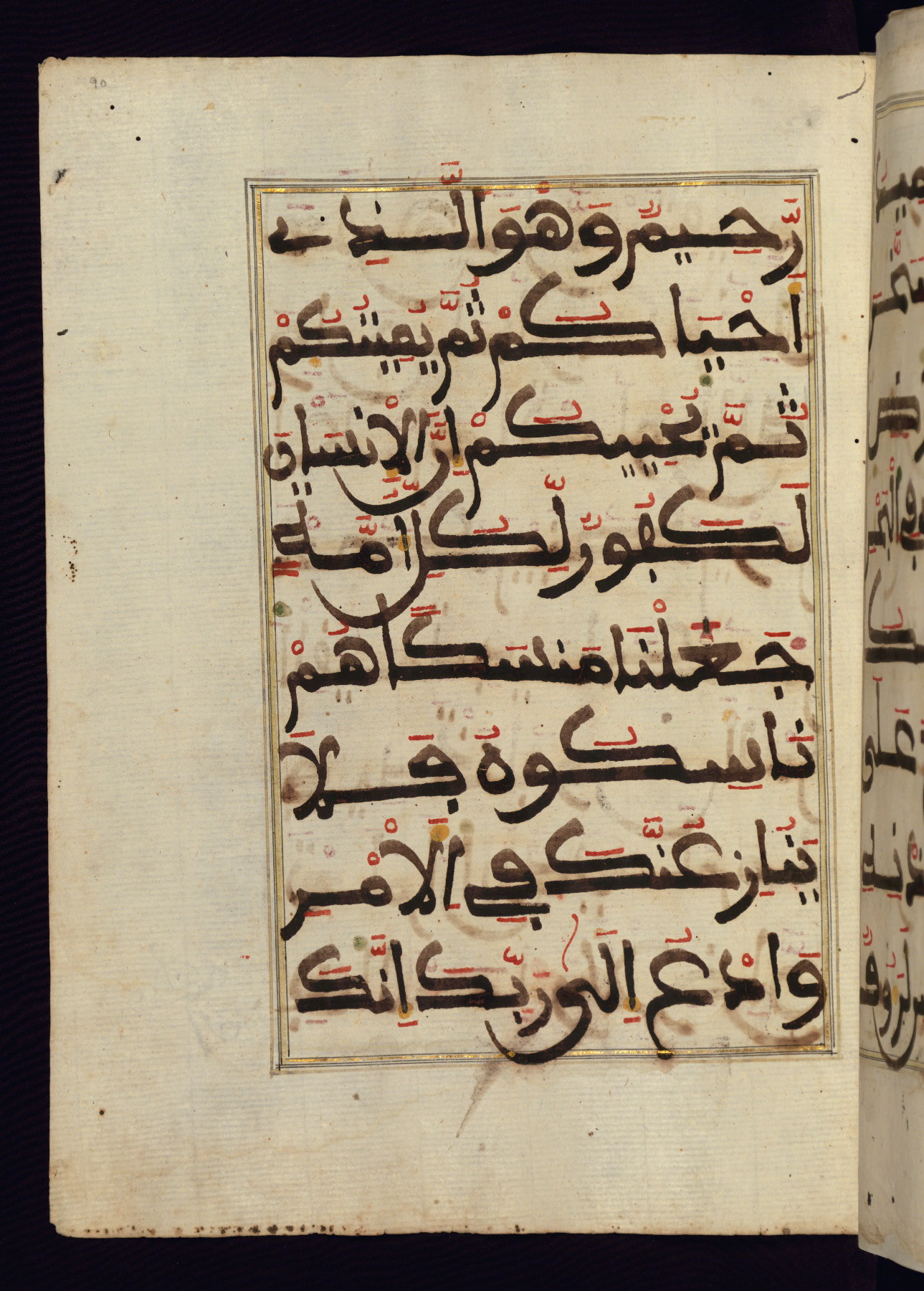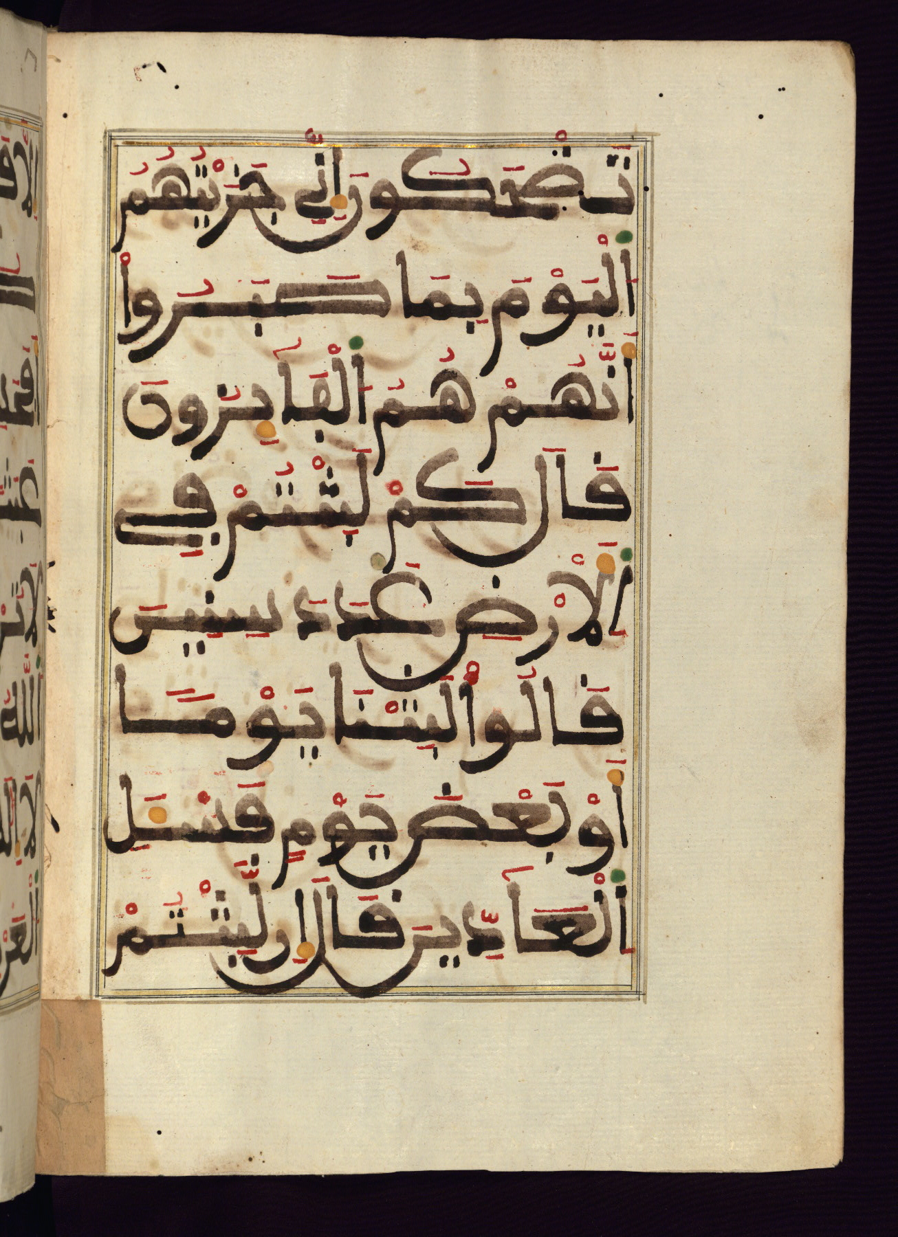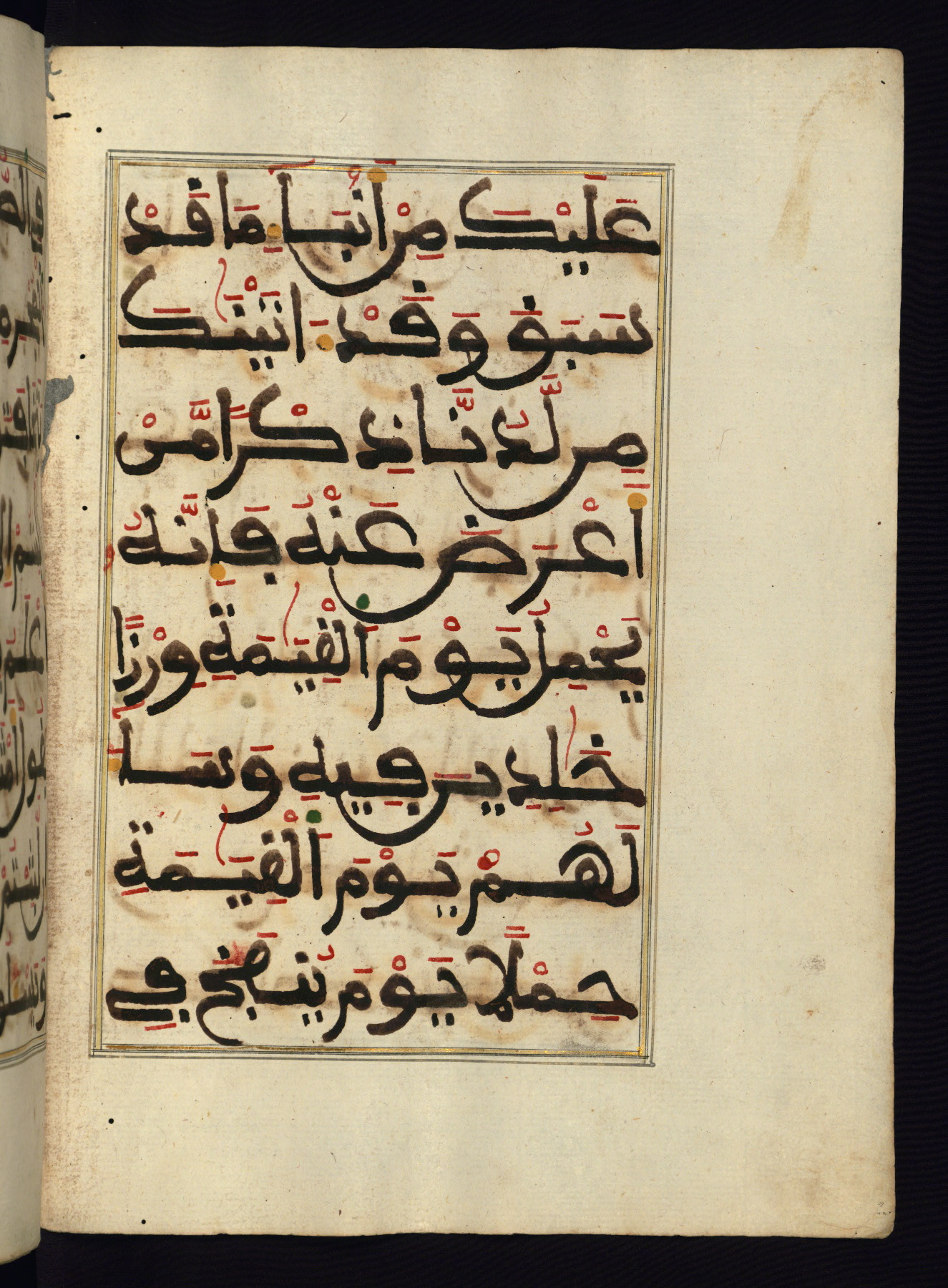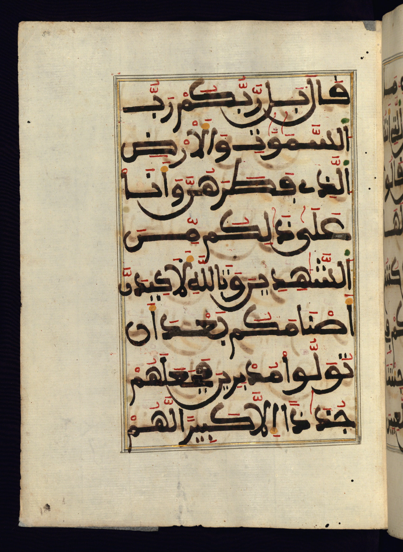 This manuscript is a fragment of the Qur'an, consisting of chapters 19 (Sūrat Maryam) through 23 (Sūrat al-muʾminūn). It was produced in the Maghreb and dates to the twelfth century AH / eighteenth CE. The text is written in a large Maghribī script, with vocalization in red, green, and yellow ink on Italian paper. The codex opens with an illuminated chapter heading for chapter 19 (Sūrat Maryam) written in the New Abbasid (broken cursive) style (fol. 1b) in gold ink within a decorative headpiece. The titles of other chapters are written in the New Abbasid (broken cursive) style in gold ink (fols. 21a, 47b, 70a, and 102a) with a marginal medallion. The blind-tooled goatskin binding is not contemporary with the manuscript and probably dates to the thirteenth century AH / nineteenth CE.