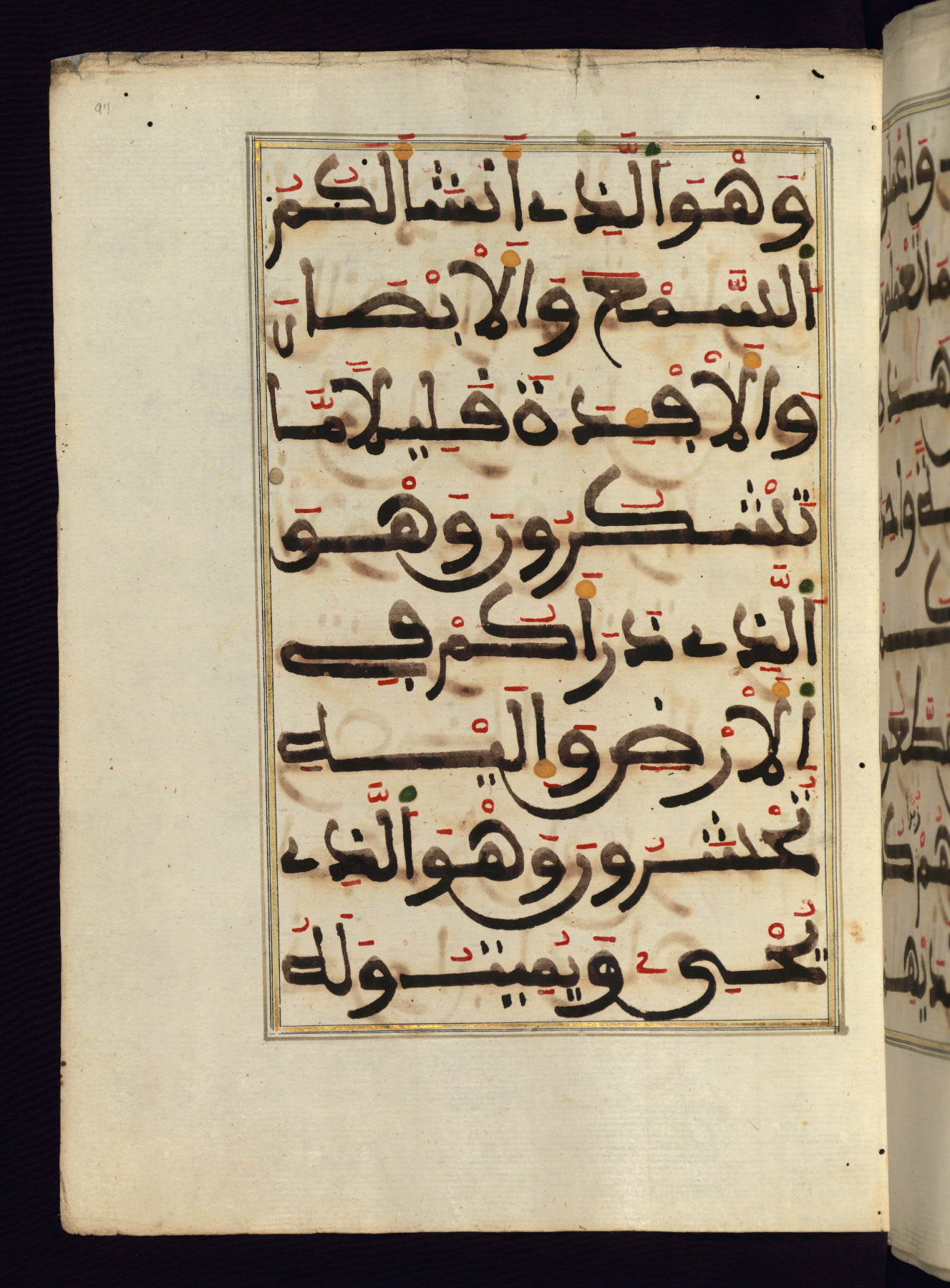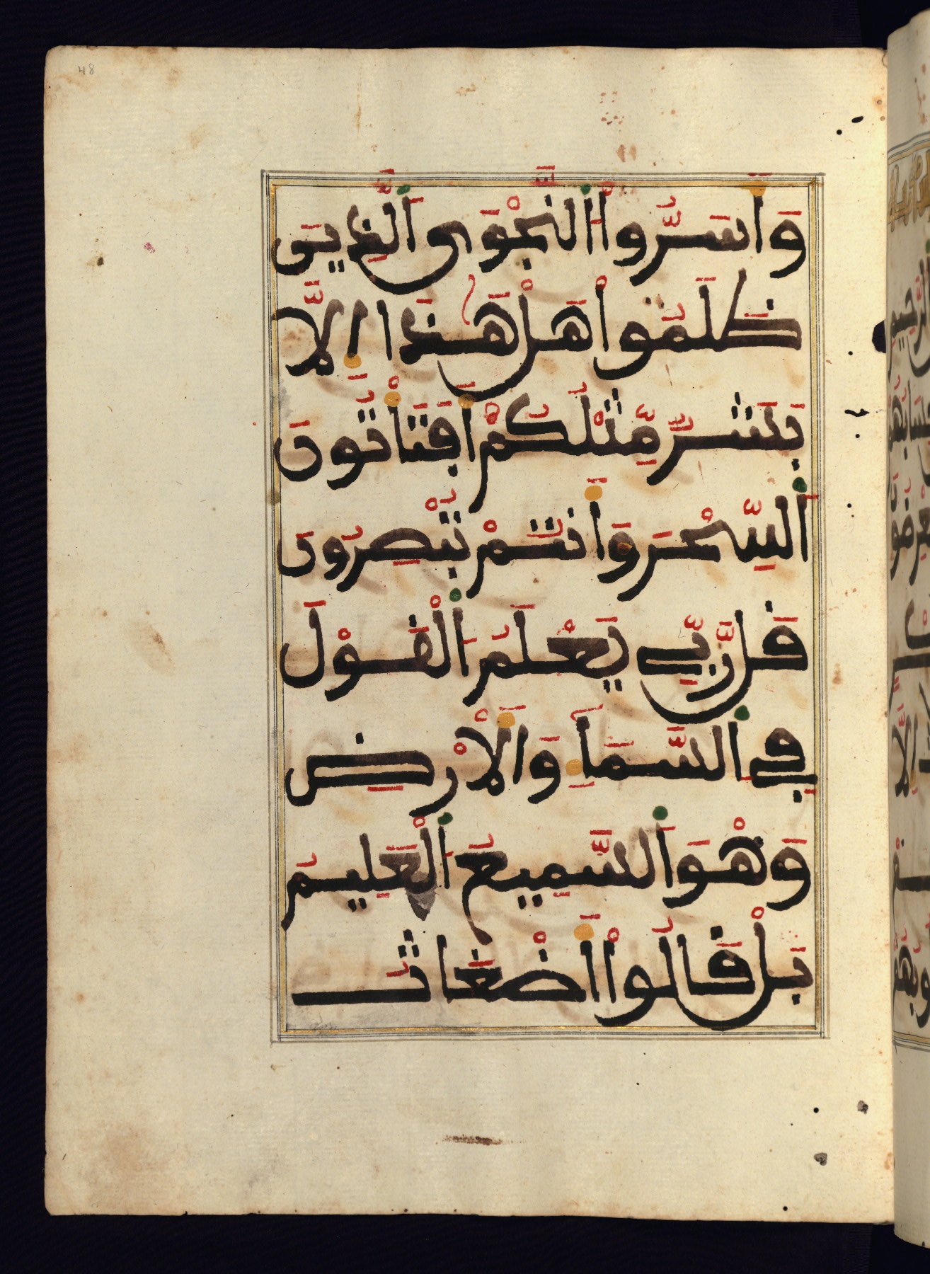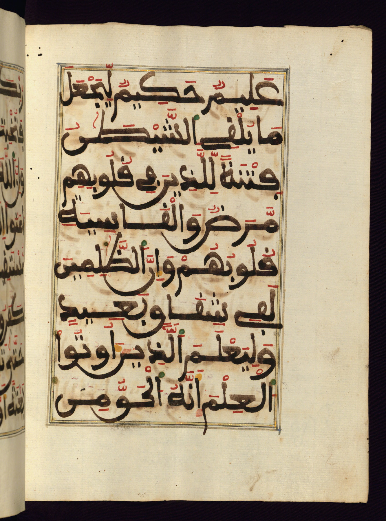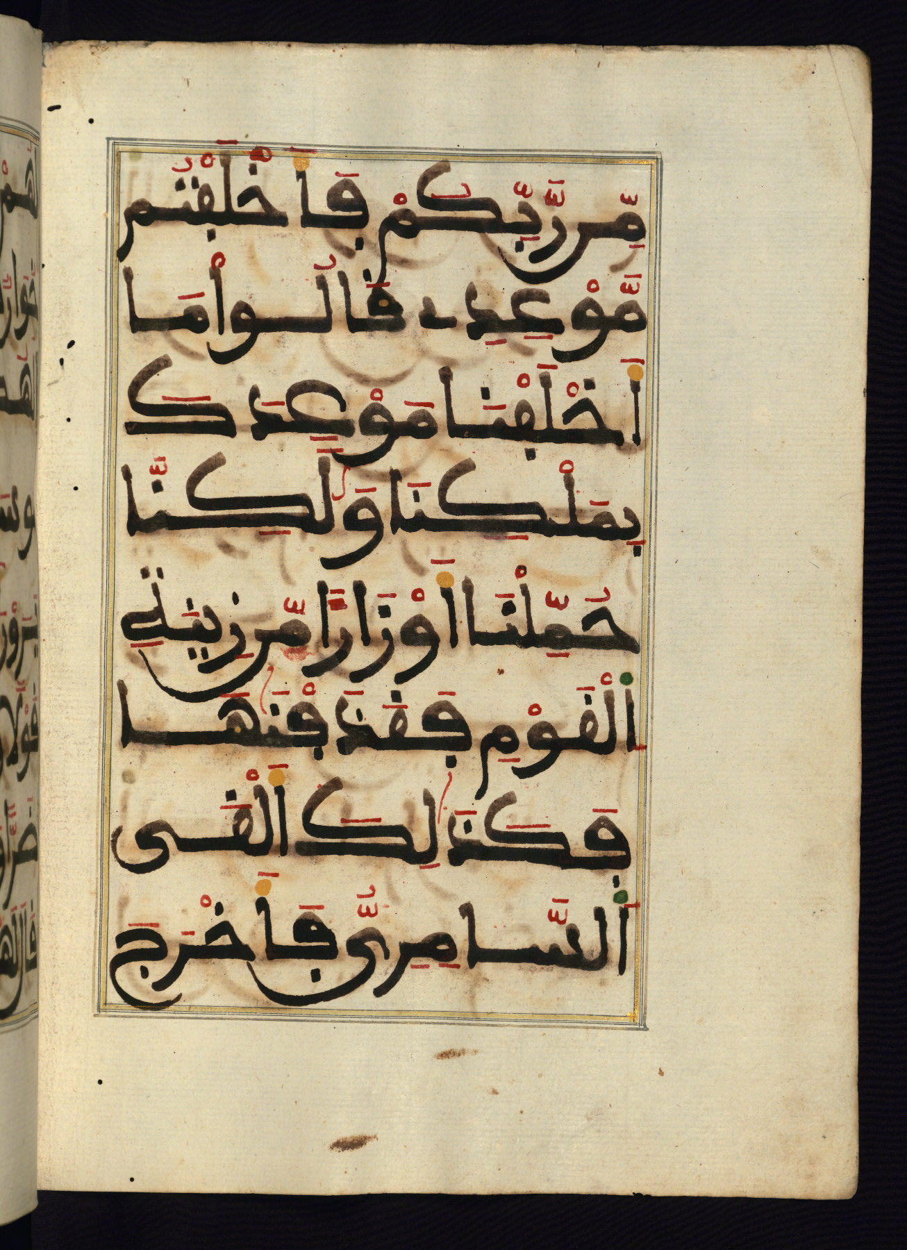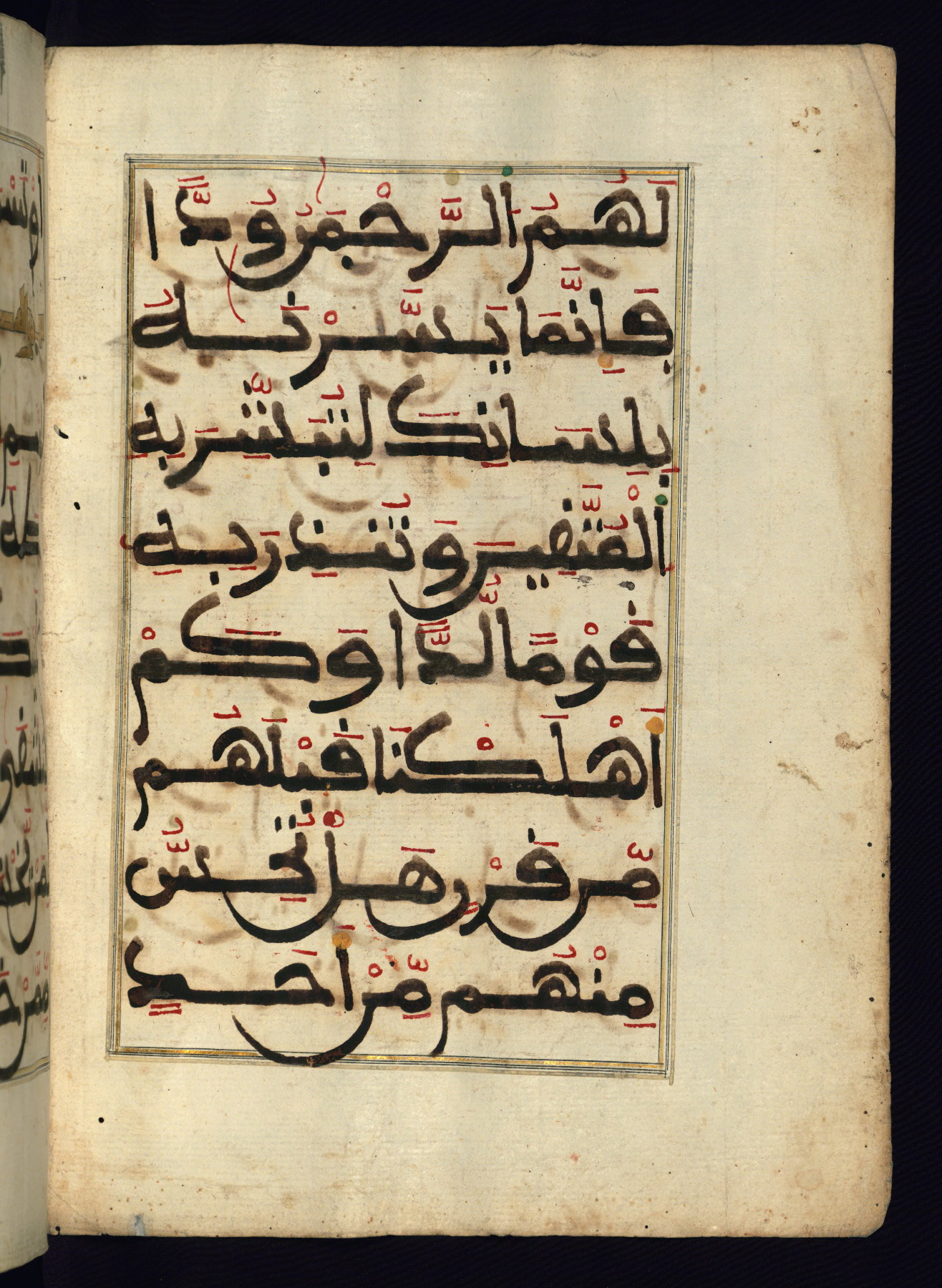 This manuscript is a fragment of the Qur'an, consisting of chapters 19 (Sūrat Maryam) through 23 (Sūrat al-muʾminūn). It was produced in the Maghreb and dates to the twelfth century AH / eighteenth CE. The text is written in a large Maghribī script, with vocalization in red, green, and yellow ink on Italian paper. The codex opens with an illuminated chapter heading for chapter 19 (Sūrat Maryam) written in the New Abbasid (broken cursive) style (fol. 1b) in gold ink within a decorative headpiece. The titles of other chapters are written in the New Abbasid (broken cursive) style in gold ink (fols. 21a, 47b, 70a, and 102a) with a marginal medallion. The blind-tooled goatskin binding is not contemporary with the manuscript and probably dates to the thirteenth century AH / nineteenth CE.
