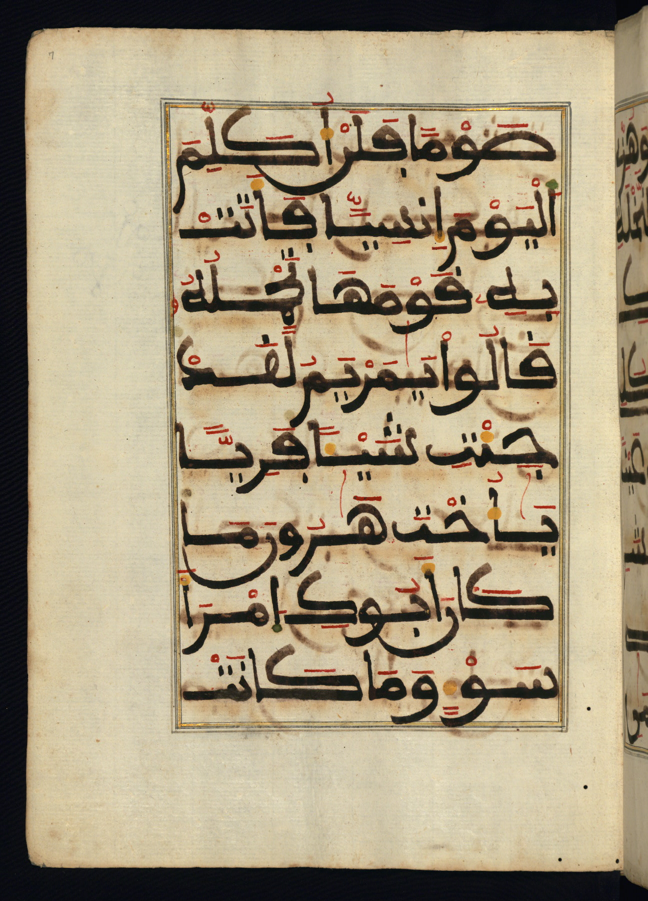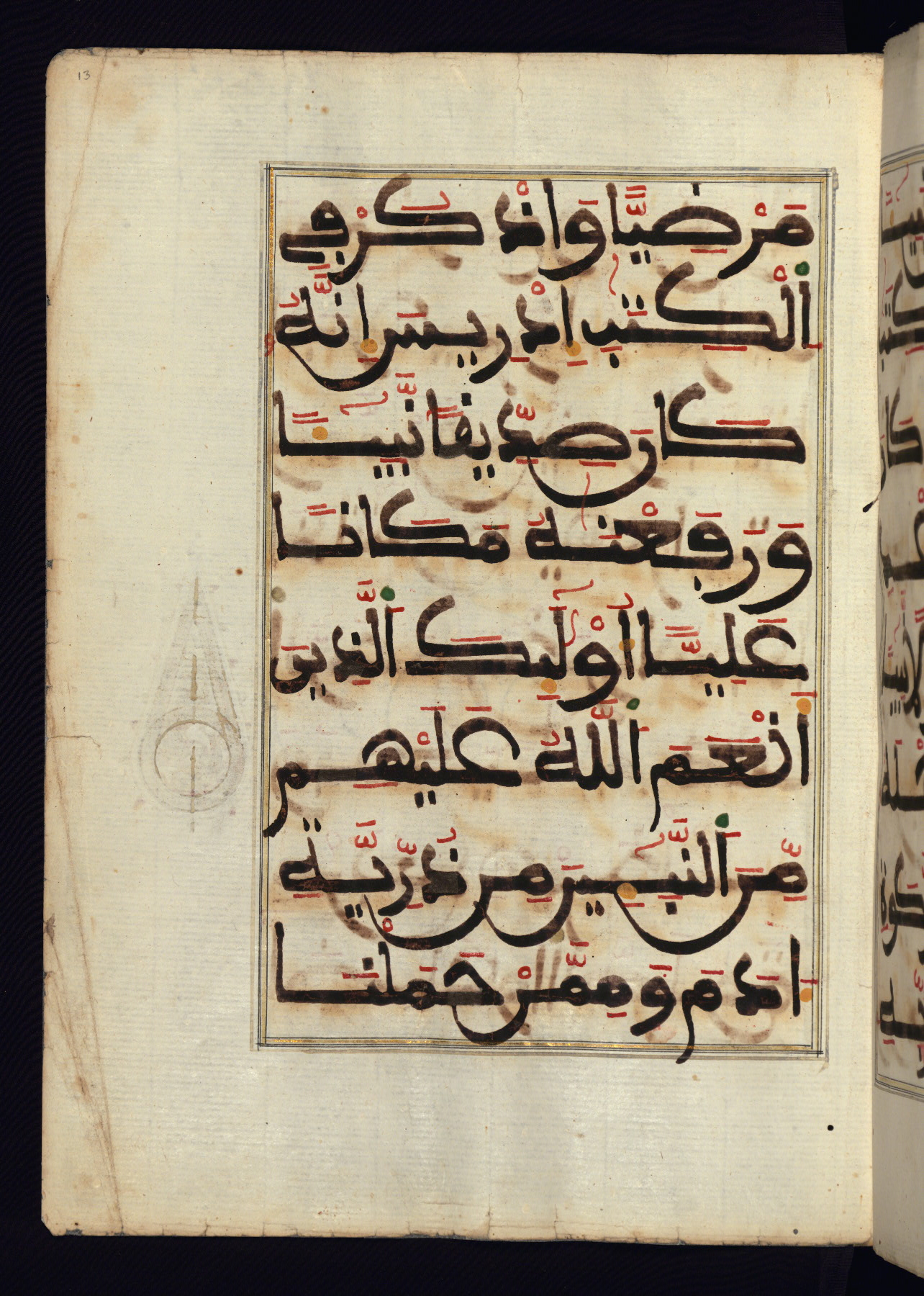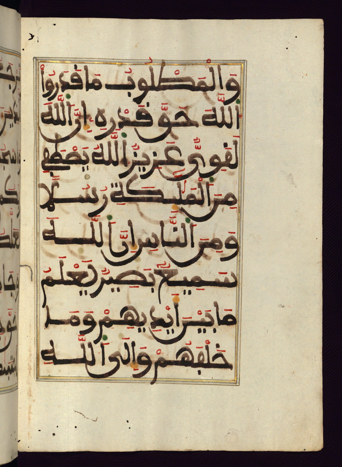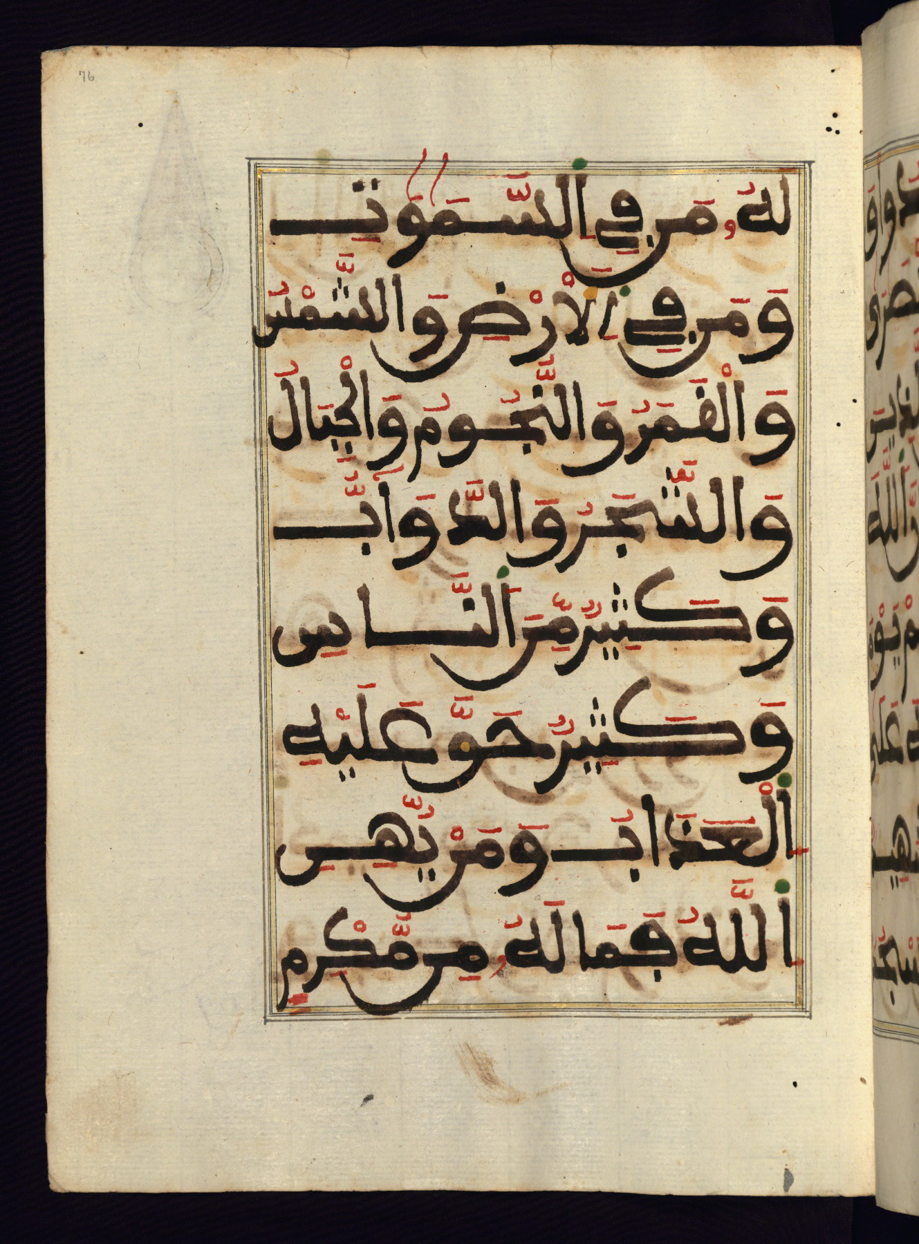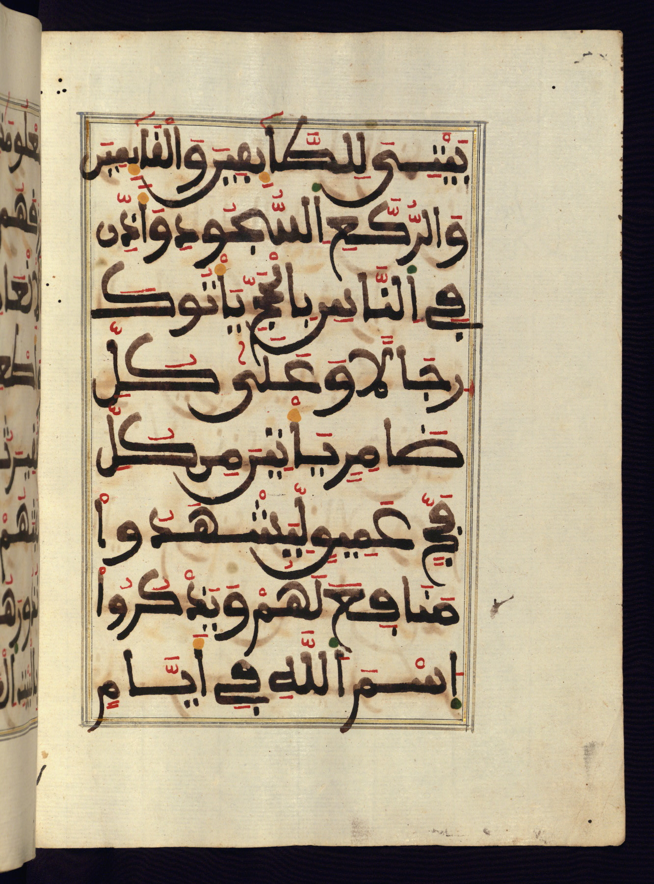 This manuscript is a fragment of the Qur'an, consisting of chapters 19 (Sūrat Maryam) through 23 (Sūrat al-muʾminūn). It was produced in the Maghreb and dates to the twelfth century AH / eighteenth CE. The text is written in a large Maghribī script, with vocalization in red, green, and yellow ink on Italian paper. The codex opens with an illuminated chapter heading for chapter 19 (Sūrat Maryam) written in the New Abbasid (broken cursive) style (fol. 1b) in gold ink within a decorative headpiece. The titles of other chapters are written in the New Abbasid (broken cursive) style in gold ink (fols. 21a, 47b, 70a, and 102a) with a marginal medallion. The blind-tooled goatskin binding is not contemporary with the manuscript and probably dates to the thirteenth century AH / nineteenth CE.
