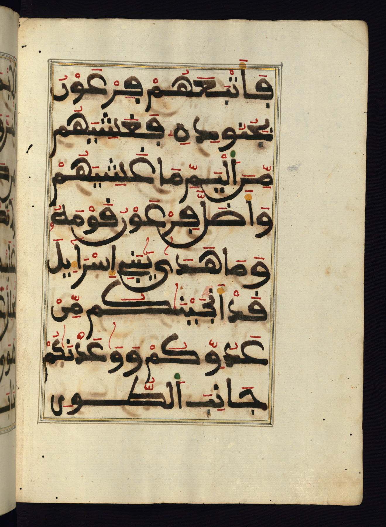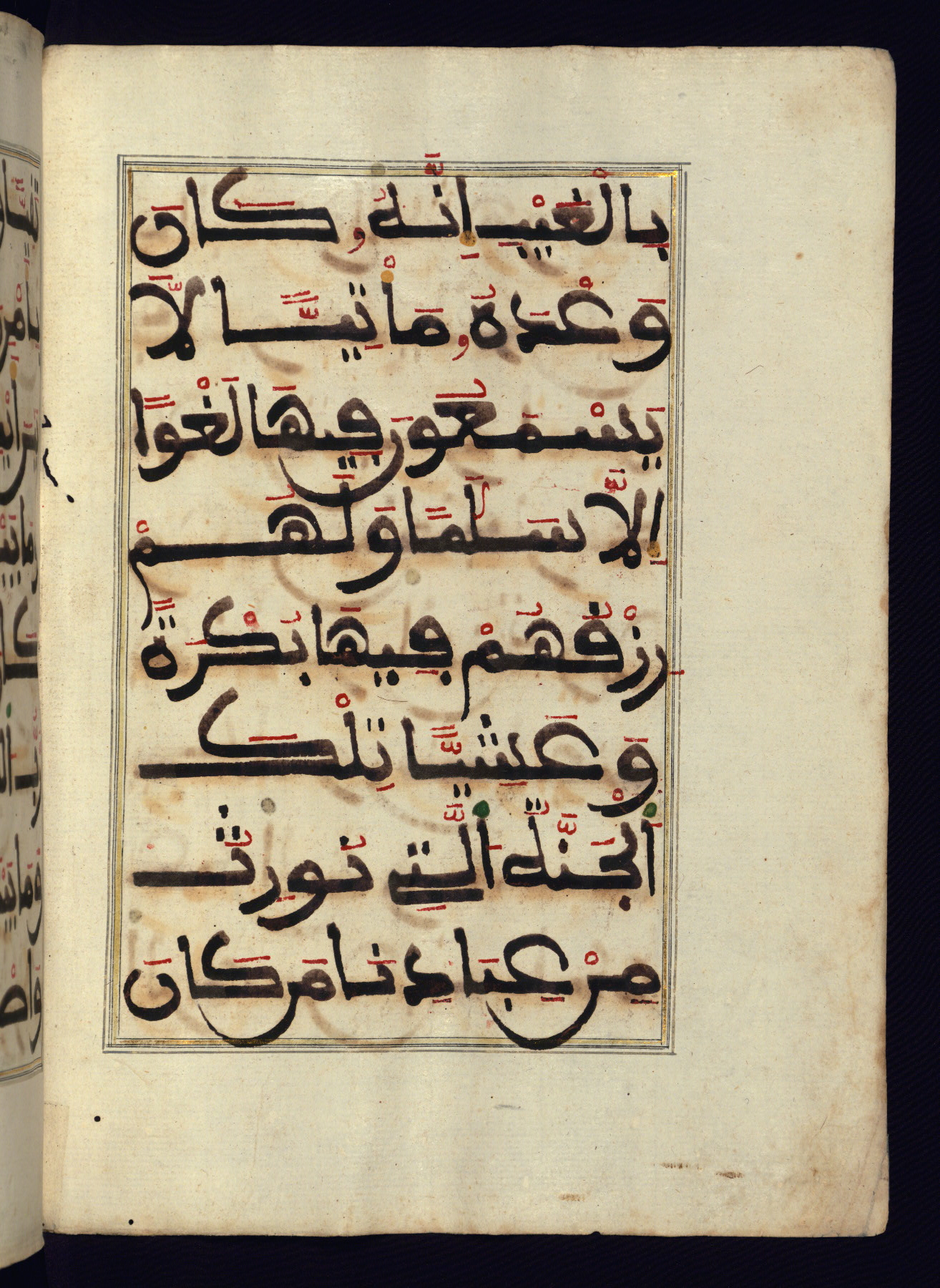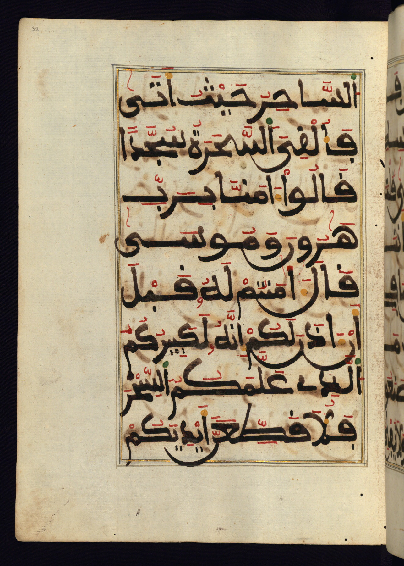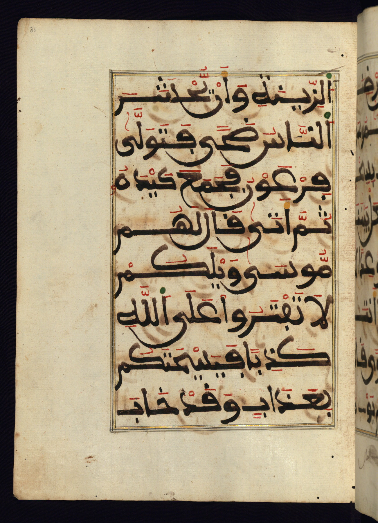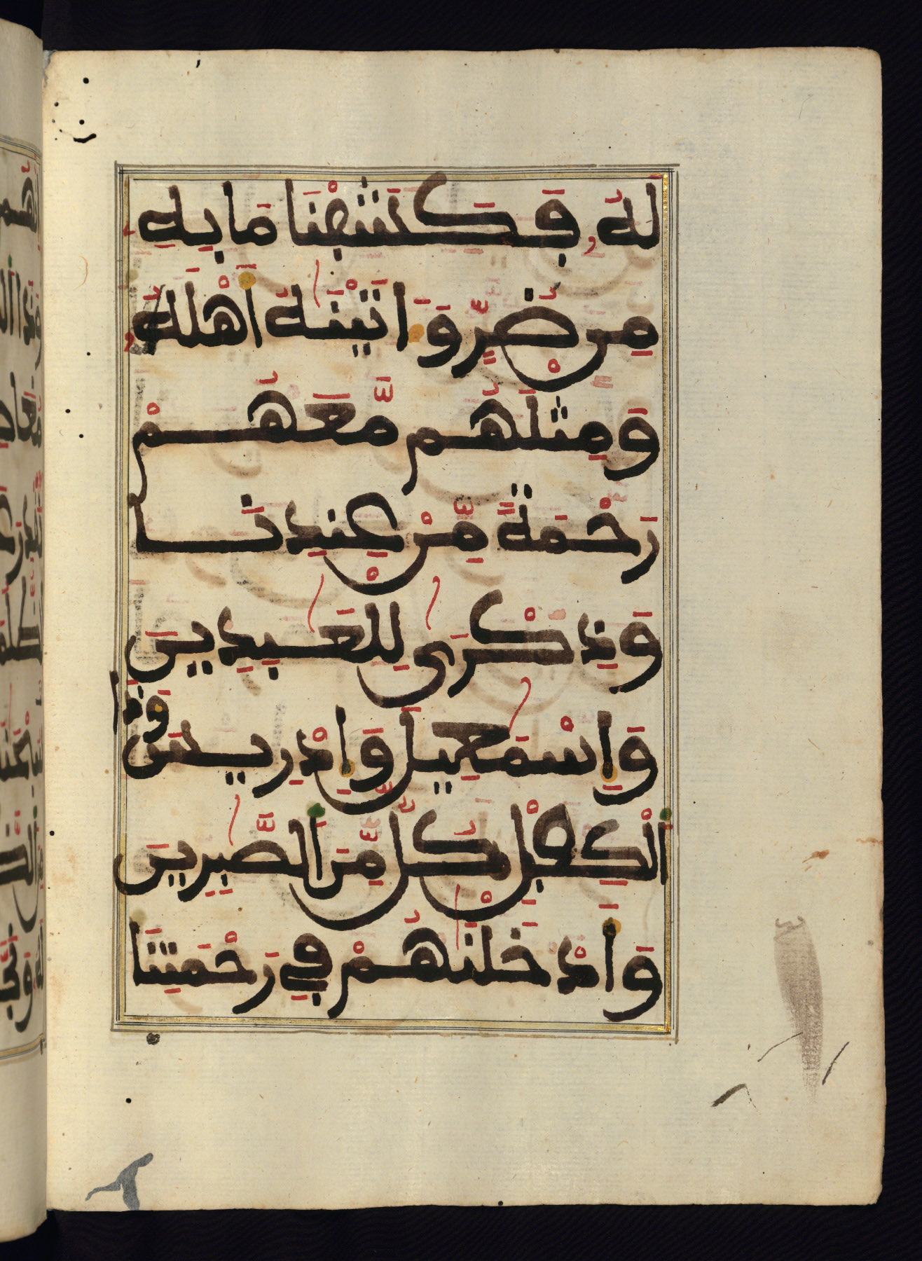 This manuscript is a fragment of the Qur'an, consisting of chapters 19 (Sūrat Maryam) through 23 (Sūrat al-muʾminūn). It was produced in the Maghreb and dates to the twelfth century AH / eighteenth CE. The text is written in a large Maghribī script, with vocalization in red, green, and yellow ink on Italian paper. The codex opens with an illuminated chapter heading for chapter 19 (Sūrat Maryam) written in the New Abbasid (broken cursive) style (fol. 1b) in gold ink within a decorative headpiece. The titles of other chapters are written in the New Abbasid (broken cursive) style in gold ink (fols. 21a, 47b, 70a, and 102a) with a marginal medallion. The blind-tooled goatskin binding is not contemporary with the manuscript and probably dates to the thirteenth century AH / nineteenth CE.