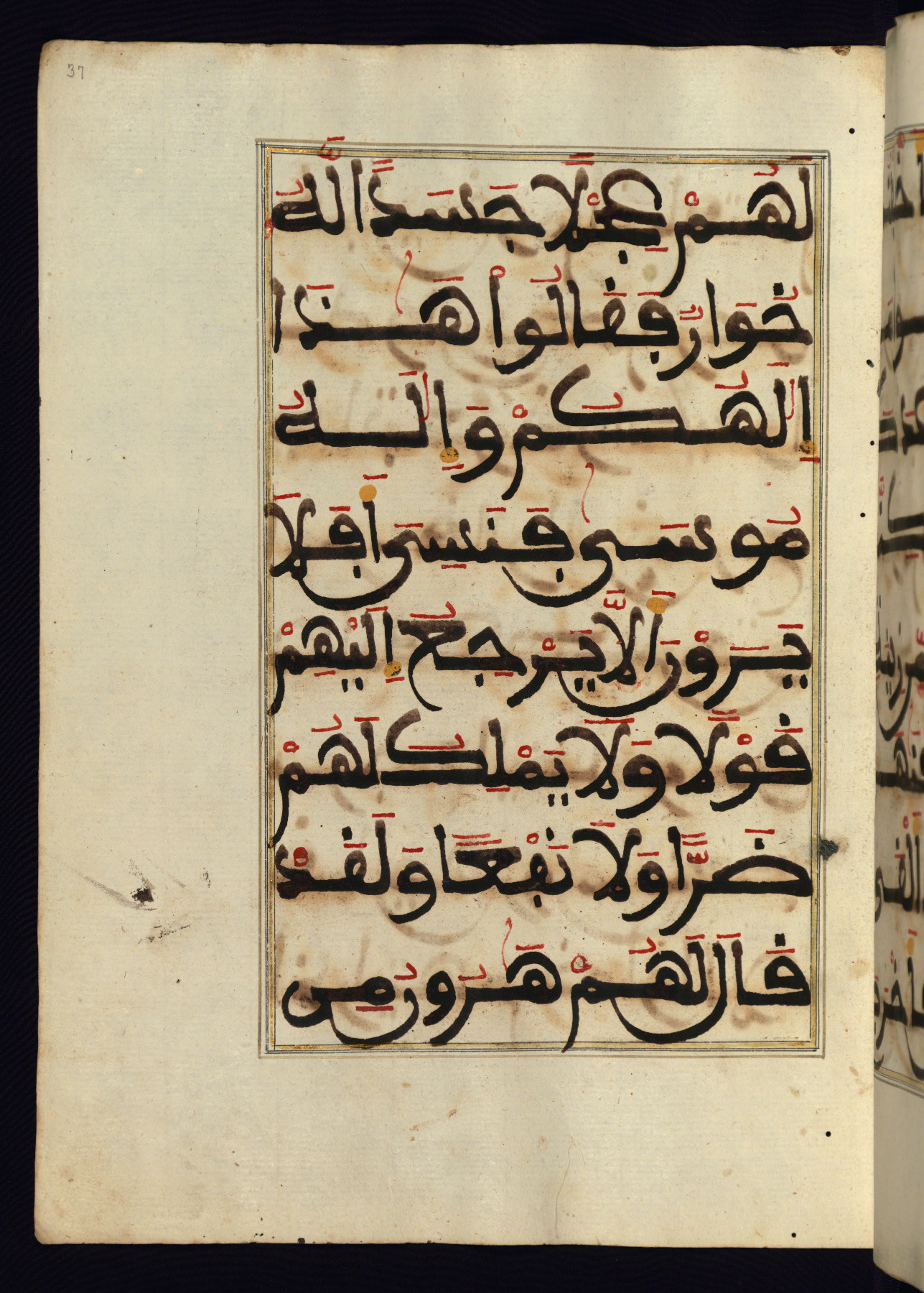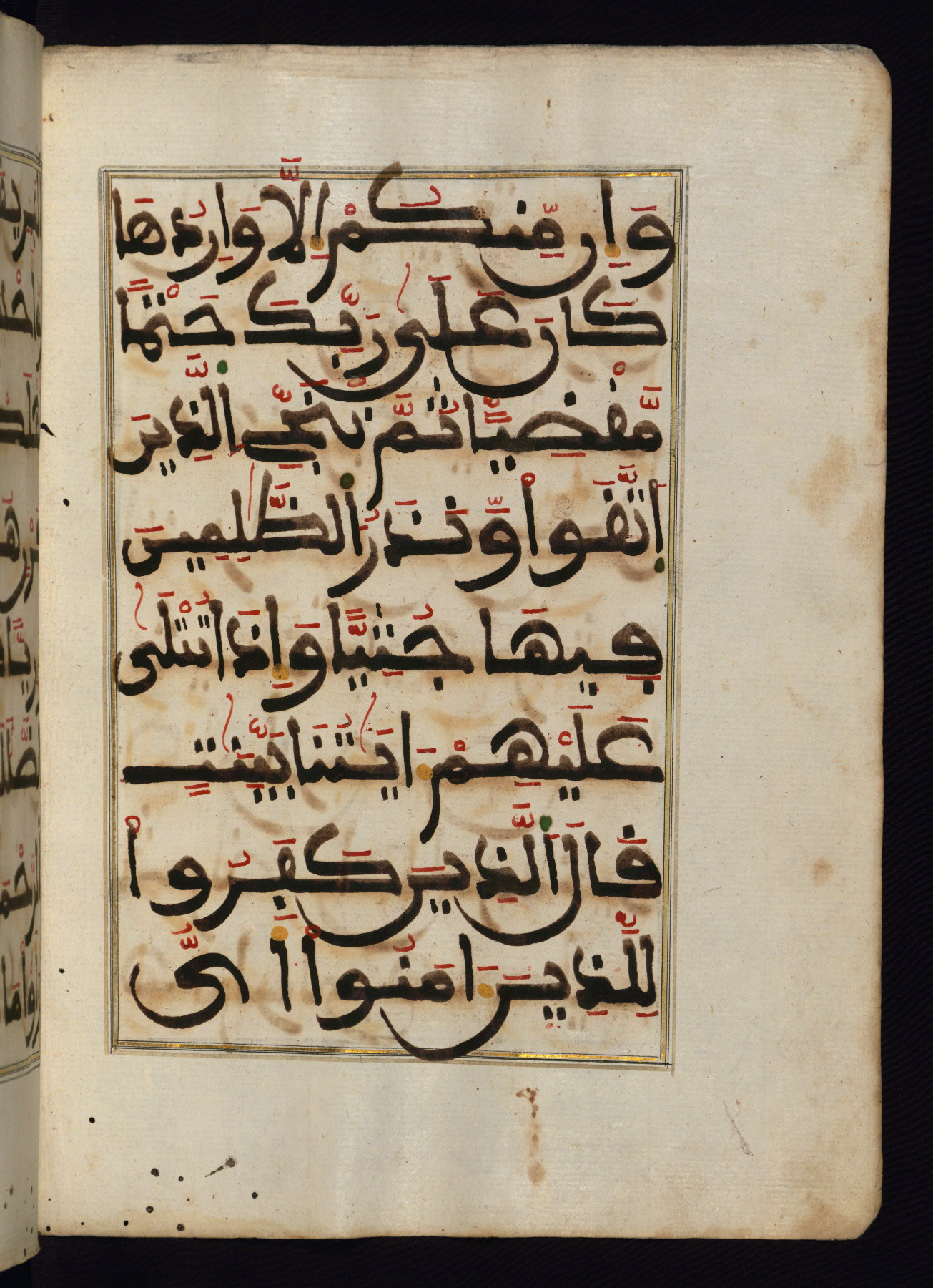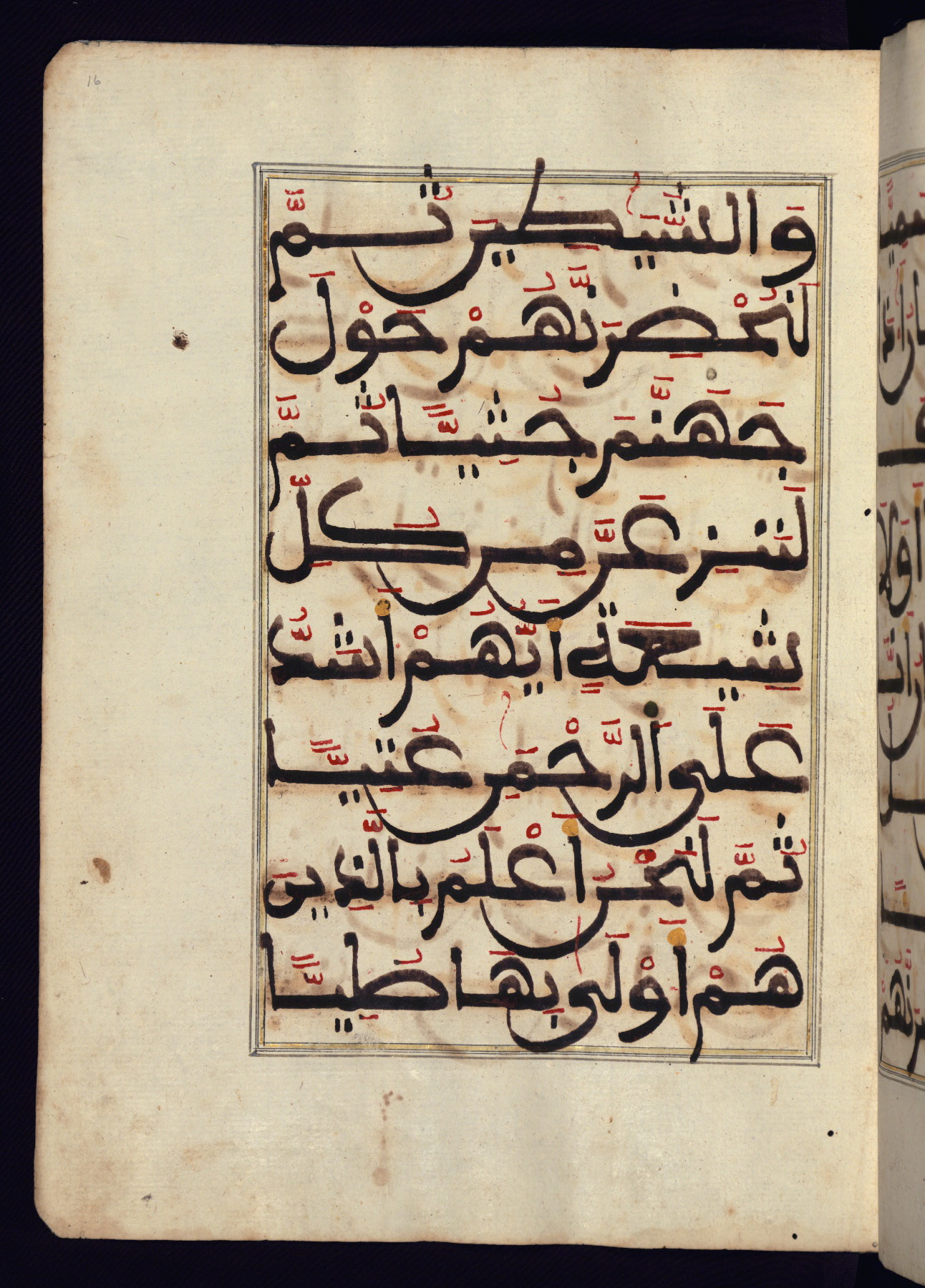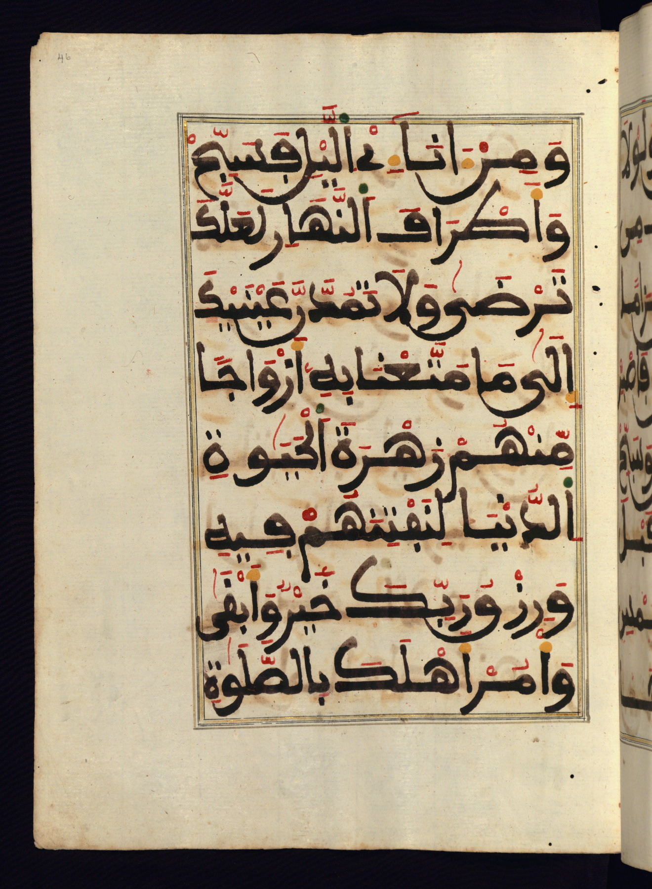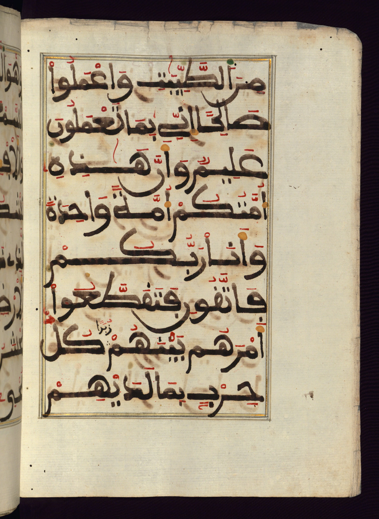 This manuscript is a fragment of the Qur'an, consisting of chapters 19 (Sūrat Maryam) through 23 (Sūrat al-muʾminūn). It was produced in the Maghreb and dates to the twelfth century AH / eighteenth CE. The text is written in a large Maghribī script, with vocalization in red, green, and yellow ink on Italian paper. The codex opens with an illuminated chapter heading for chapter 19 (Sūrat Maryam) written in the New Abbasid (broken cursive) style (fol. 1b) in gold ink within a decorative headpiece. The titles of other chapters are written in the New Abbasid (broken cursive) style in gold ink (fols. 21a, 47b, 70a, and 102a) with a marginal medallion. The blind-tooled goatskin binding is not contemporary with the manuscript and probably dates to the thirteenth century AH / nineteenth CE.