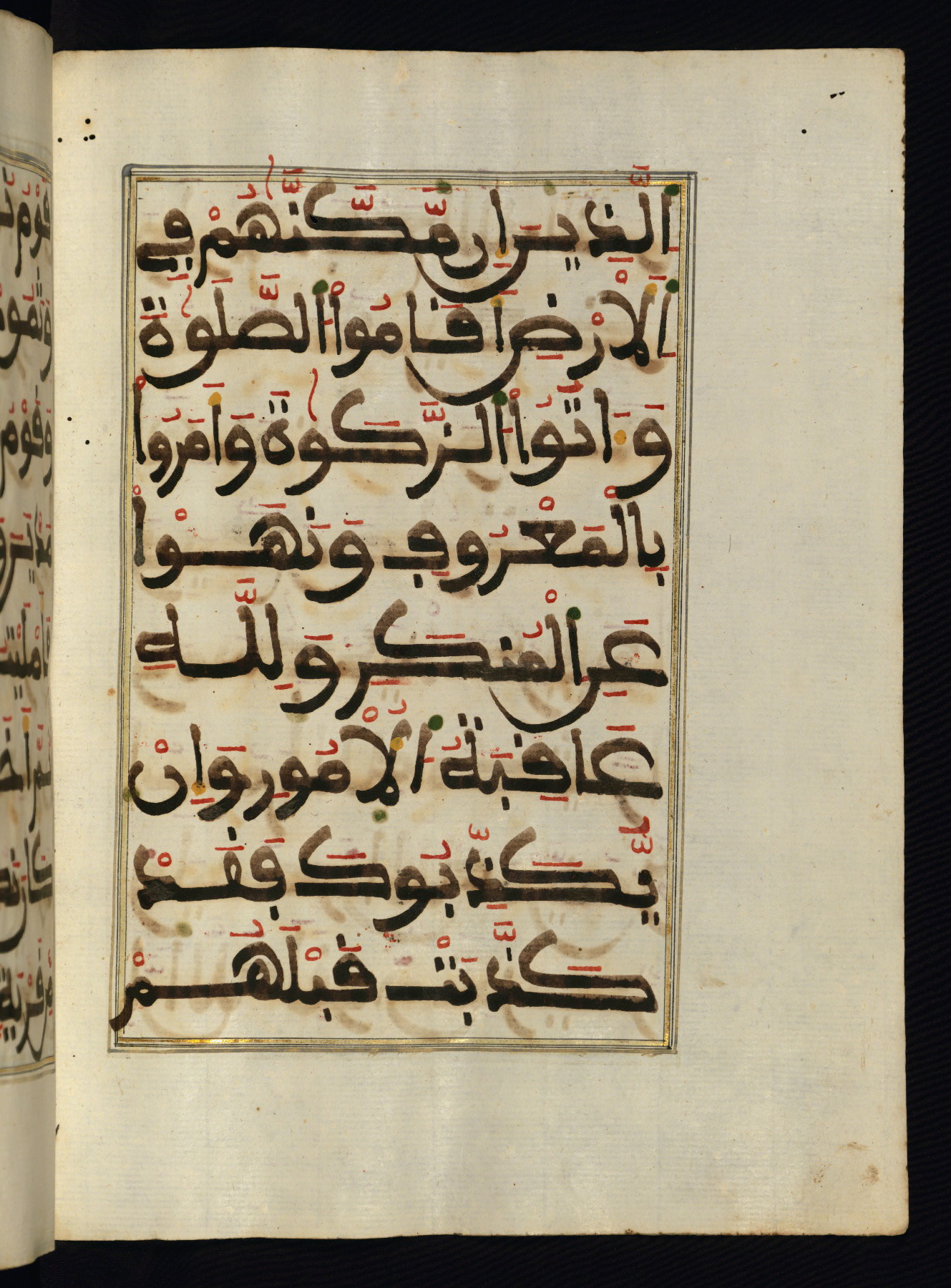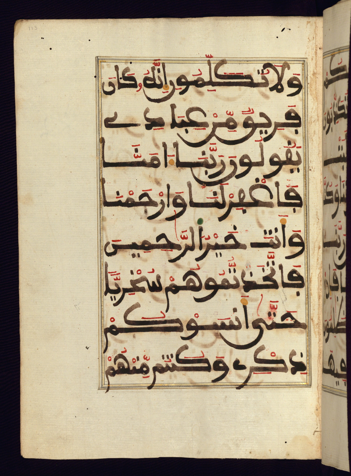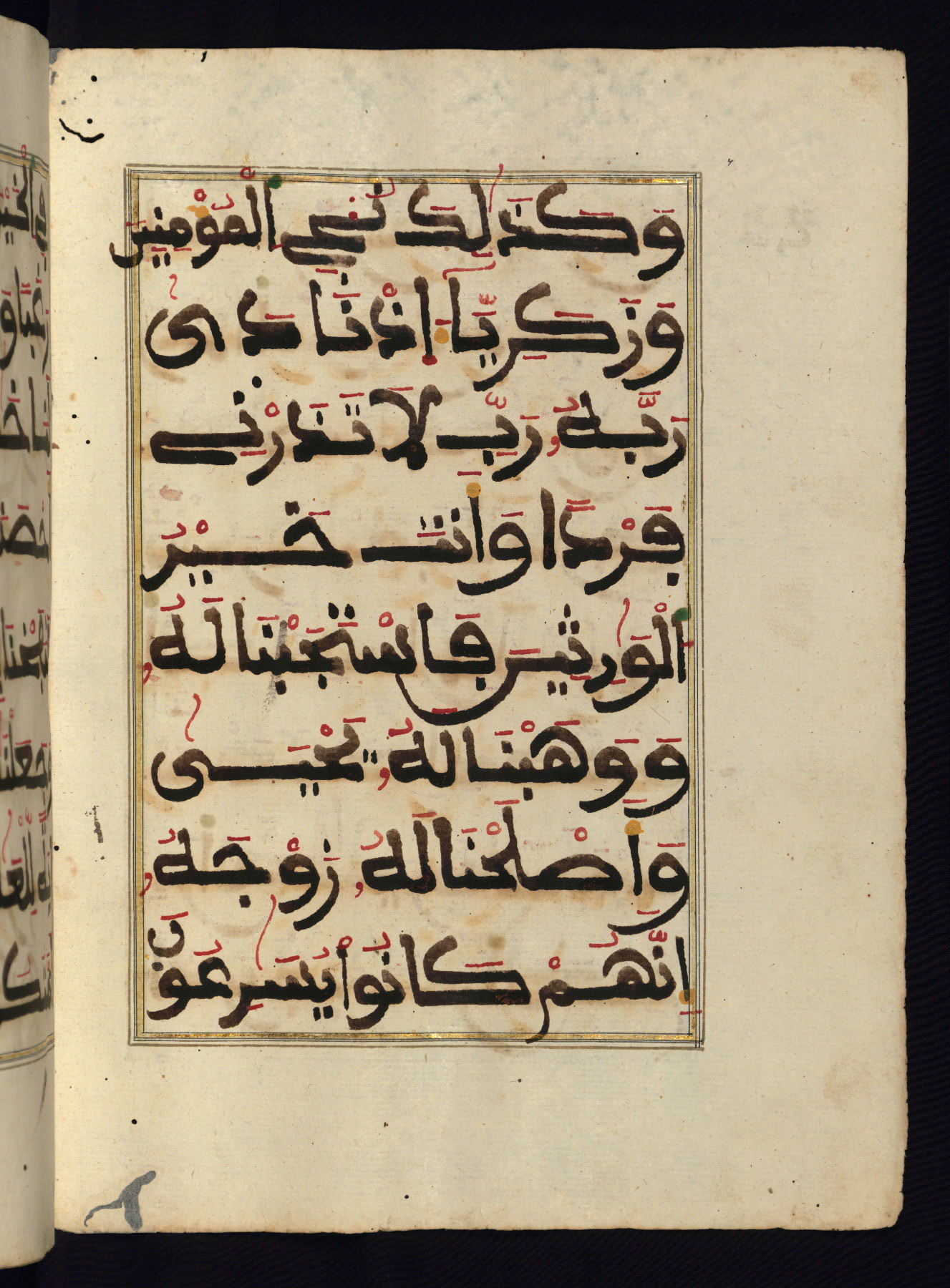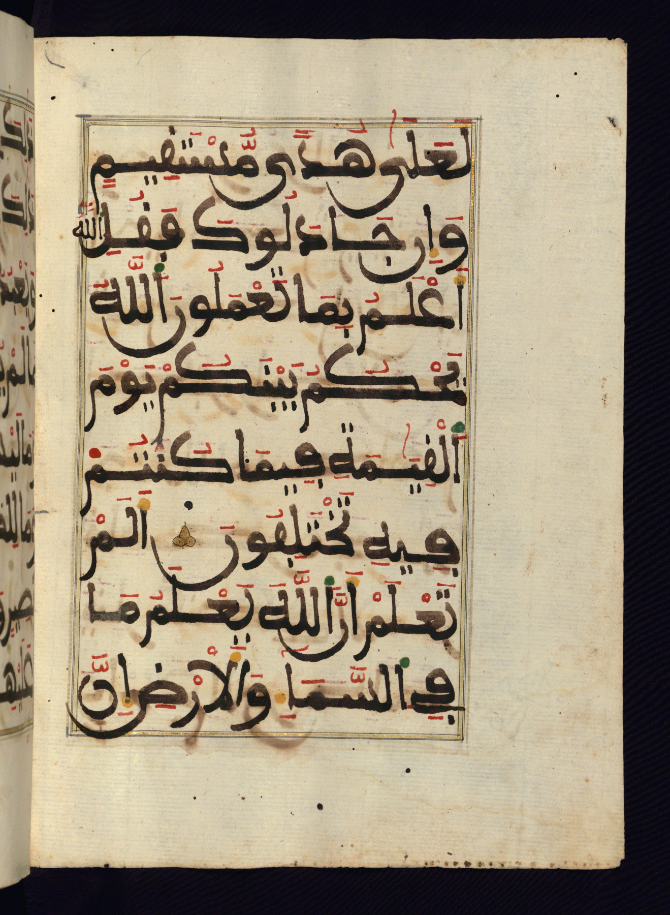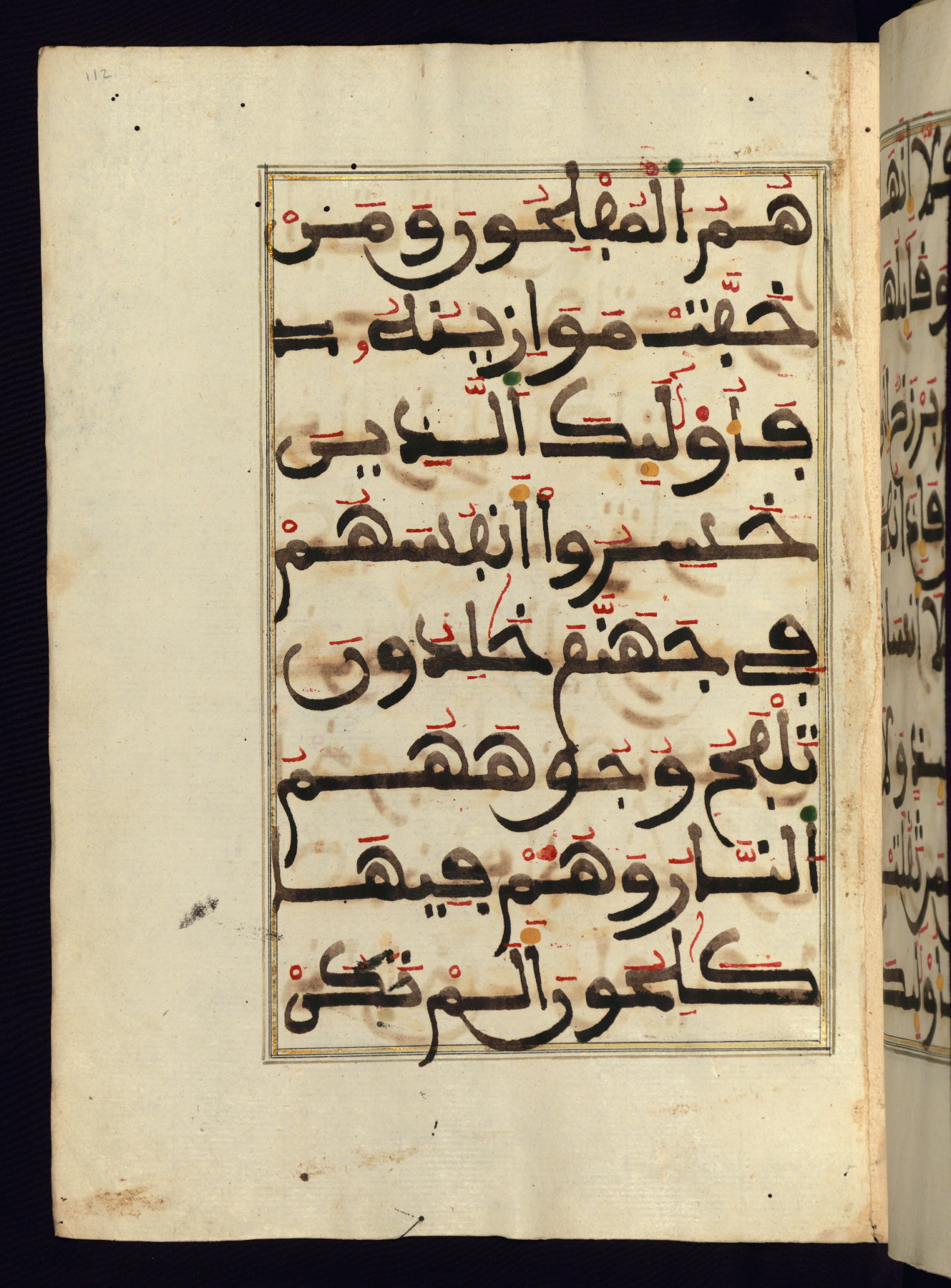 This manuscript is a fragment of the Qur'an, consisting of chapters 19 (Sūrat Maryam) through 23 (Sūrat al-muʾminūn). It was produced in the Maghreb and dates to the twelfth century AH / eighteenth CE. The text is written in a large Maghribī script, with vocalization in red, green, and yellow ink on Italian paper. The codex opens with an illuminated chapter heading for chapter 19 (Sūrat Maryam) written in the New Abbasid (broken cursive) style (fol. 1b) in gold ink within a decorative headpiece. The titles of other chapters are written in the New Abbasid (broken cursive) style in gold ink (fols. 21a, 47b, 70a, and 102a) with a marginal medallion. The blind-tooled goatskin binding is not contemporary with the manuscript and probably dates to the thirteenth century AH / nineteenth CE.