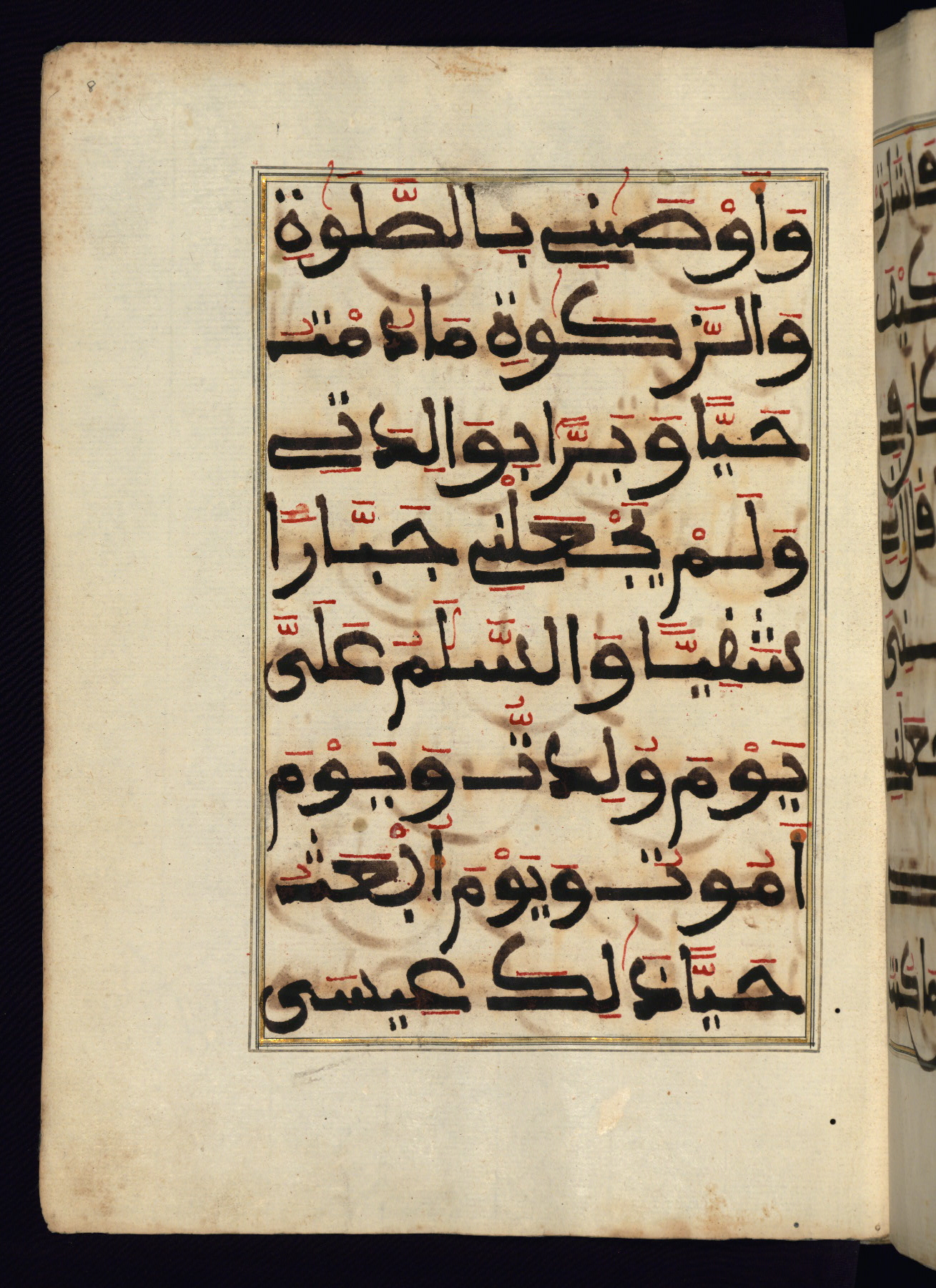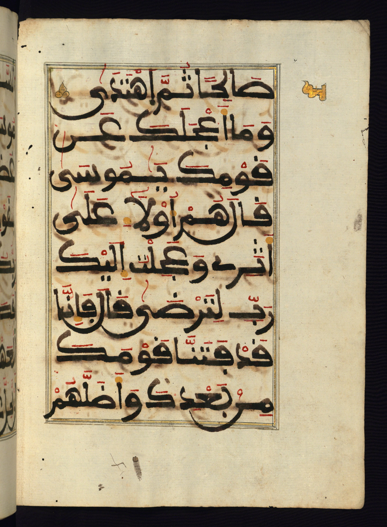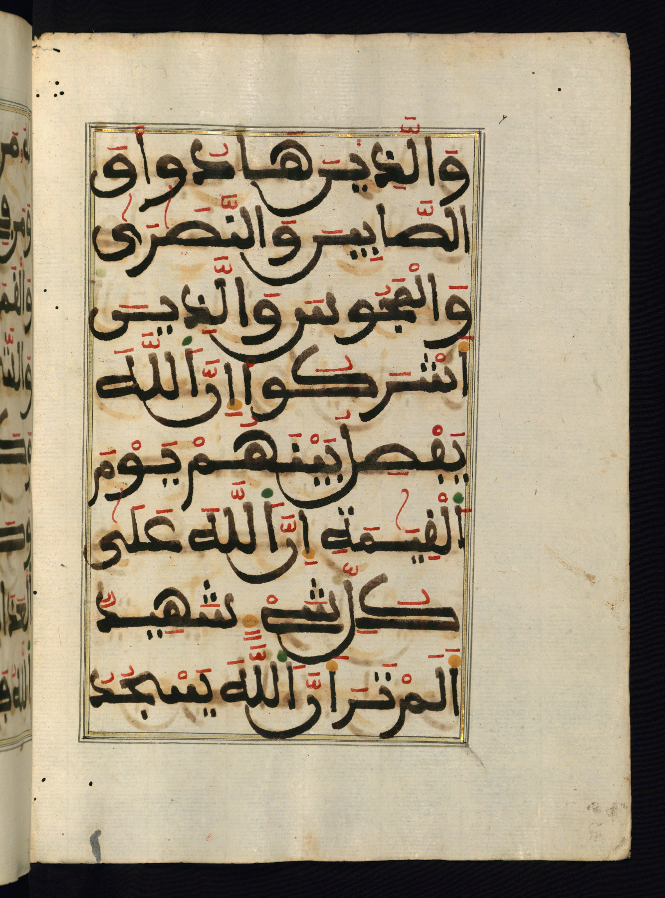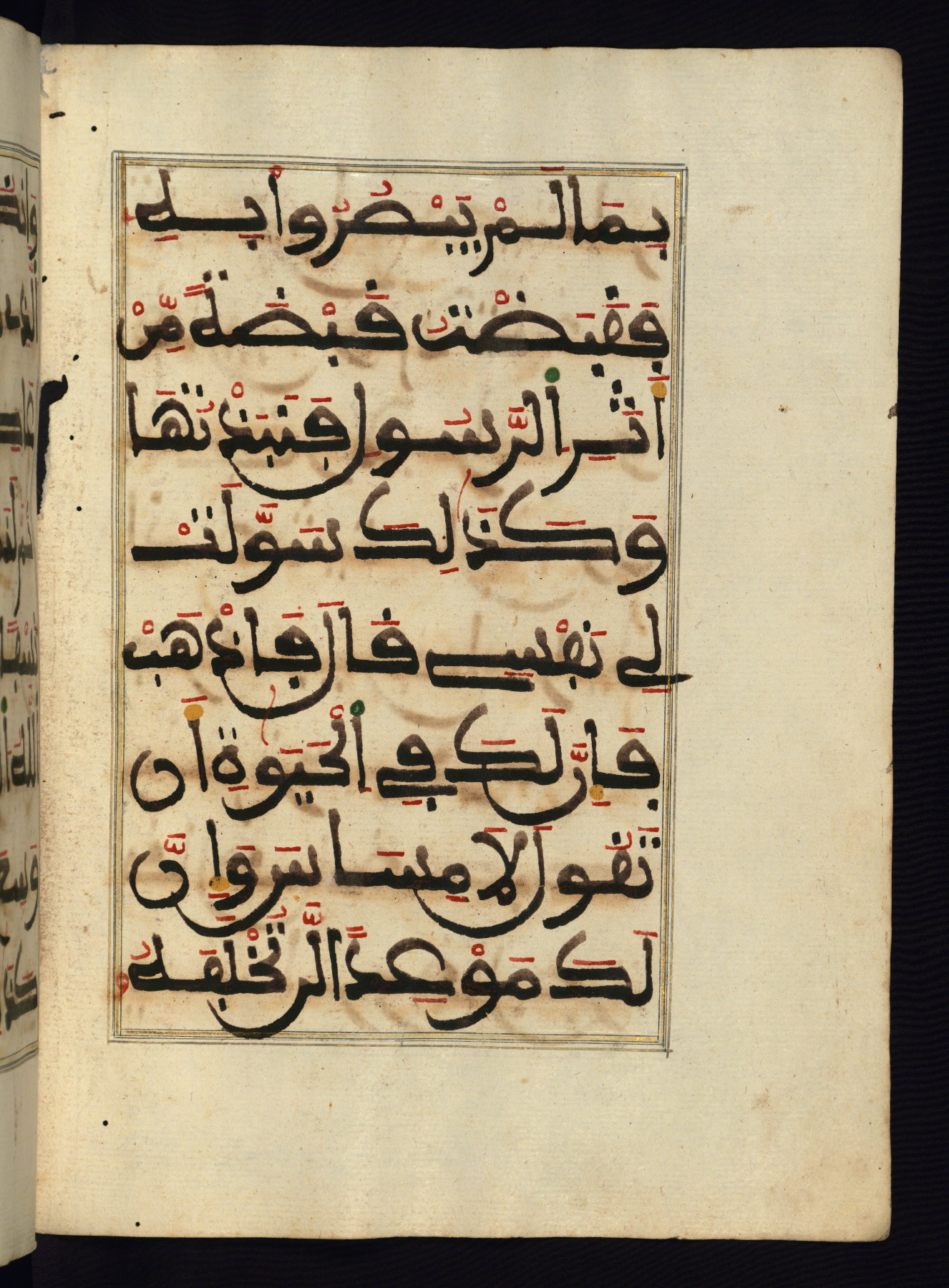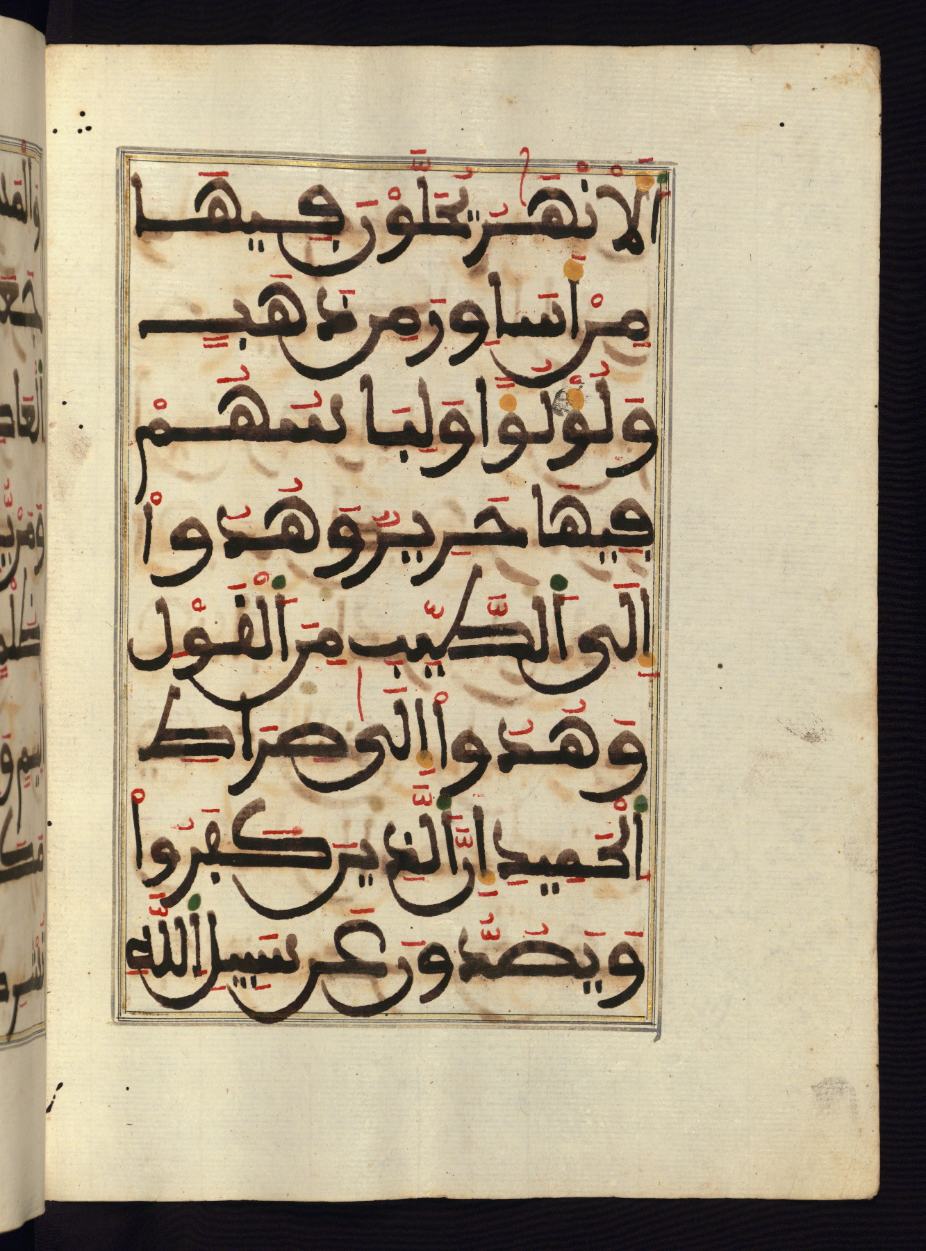 This manuscript is a fragment of the Qur'an, consisting of chapters 19 (Sūrat Maryam) through 23 (Sūrat al-muʾminūn). It was produced in the Maghreb and dates to the twelfth century AH / eighteenth CE. The text is written in a large Maghribī script, with vocalization in red, green, and yellow ink on Italian paper. The codex opens with an illuminated chapter heading for chapter 19 (Sūrat Maryam) written in the New Abbasid (broken cursive) style (fol. 1b) in gold ink within a decorative headpiece. The titles of other chapters are written in the New Abbasid (broken cursive) style in gold ink (fols. 21a, 47b, 70a, and 102a) with a marginal medallion. The blind-tooled goatskin binding is not contemporary with the manuscript and probably dates to the thirteenth century AH / nineteenth CE.