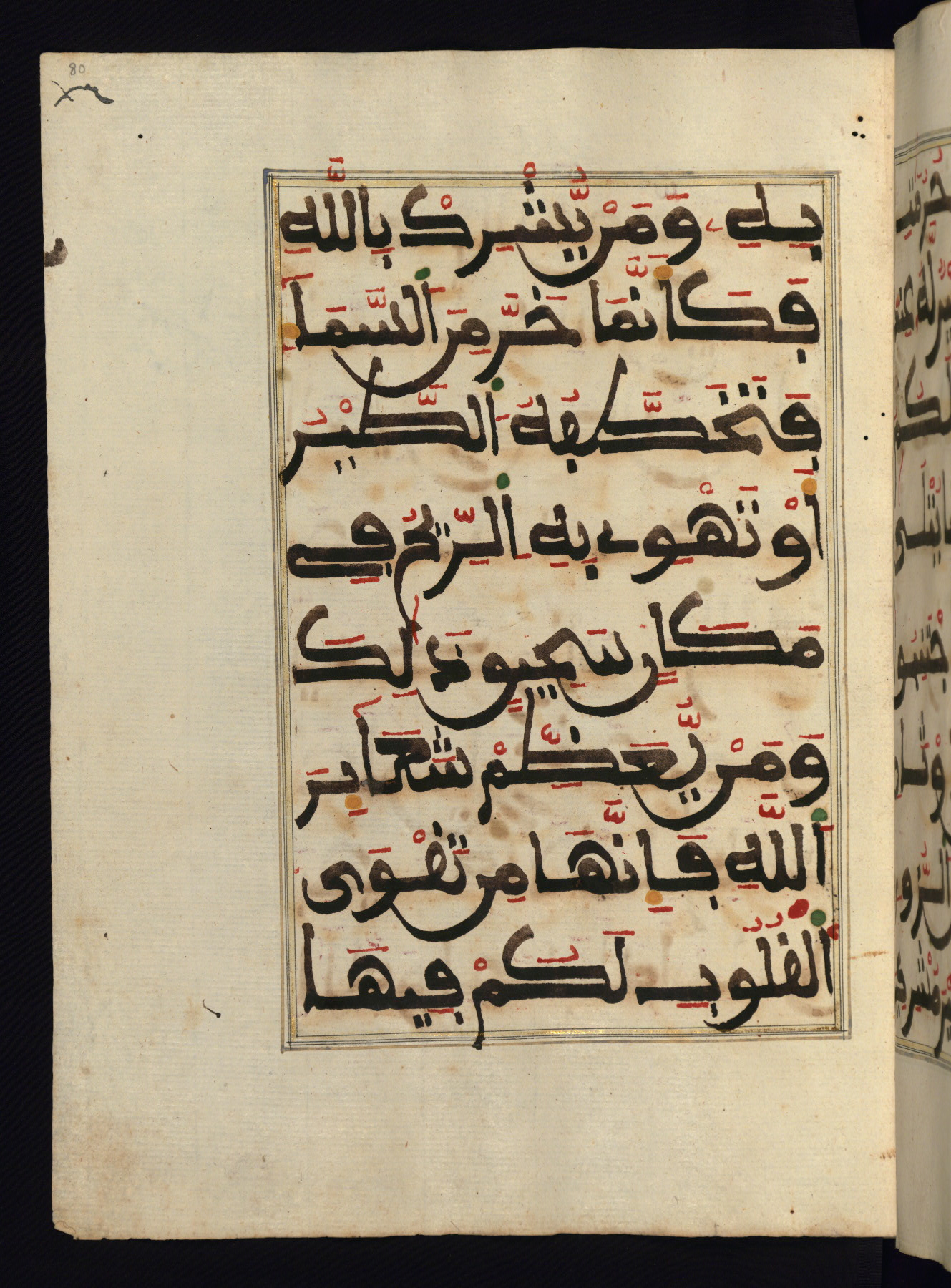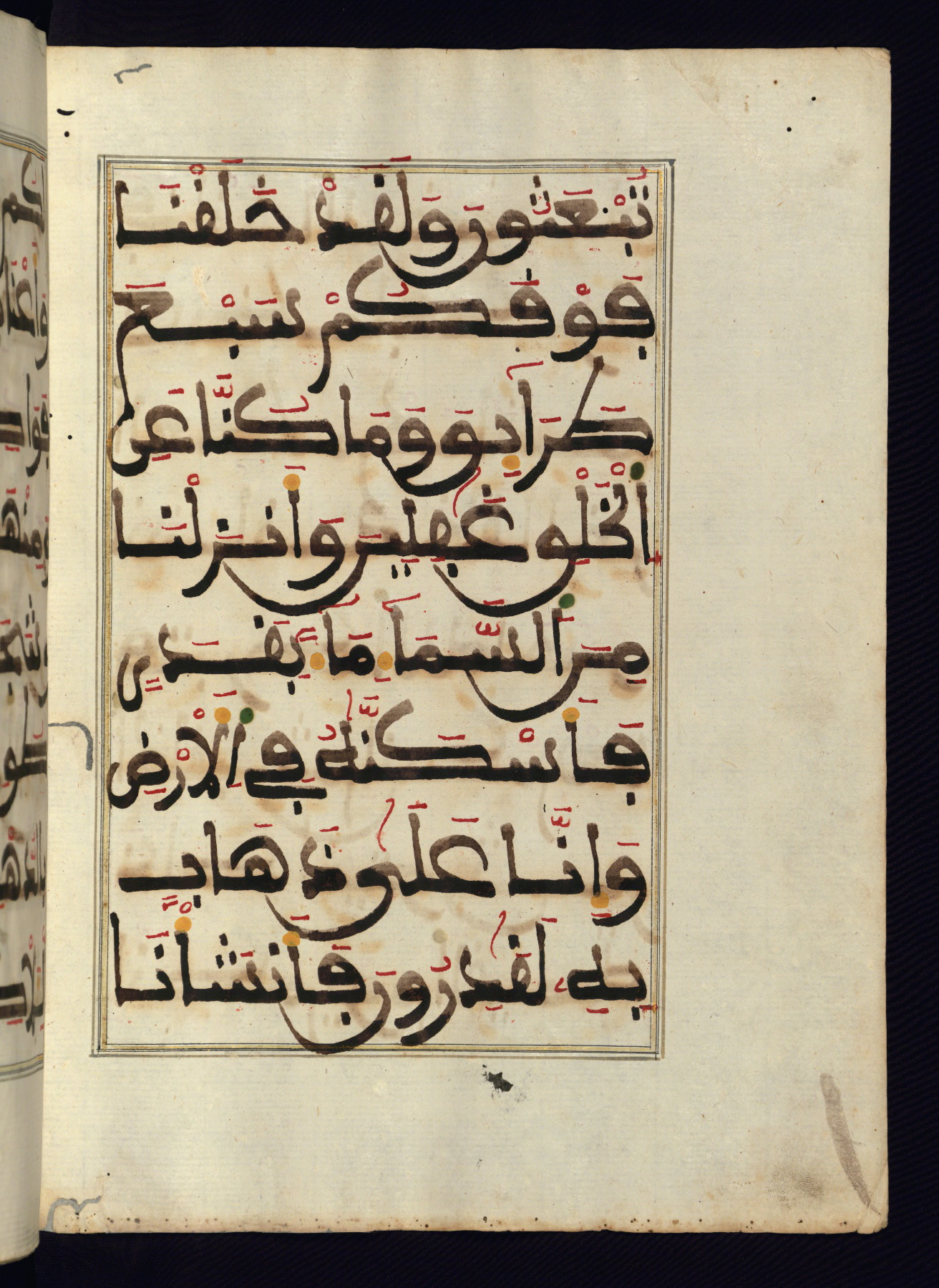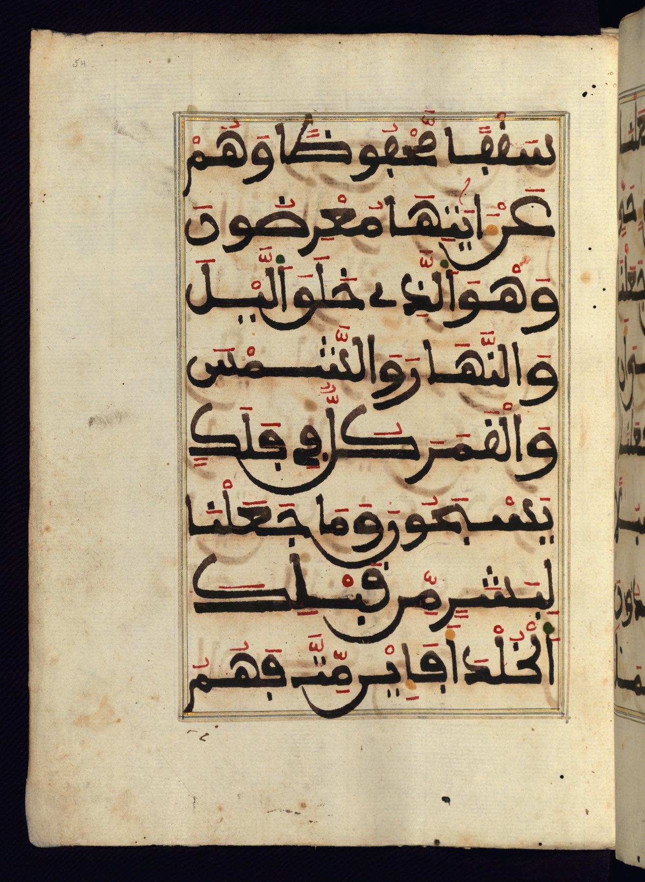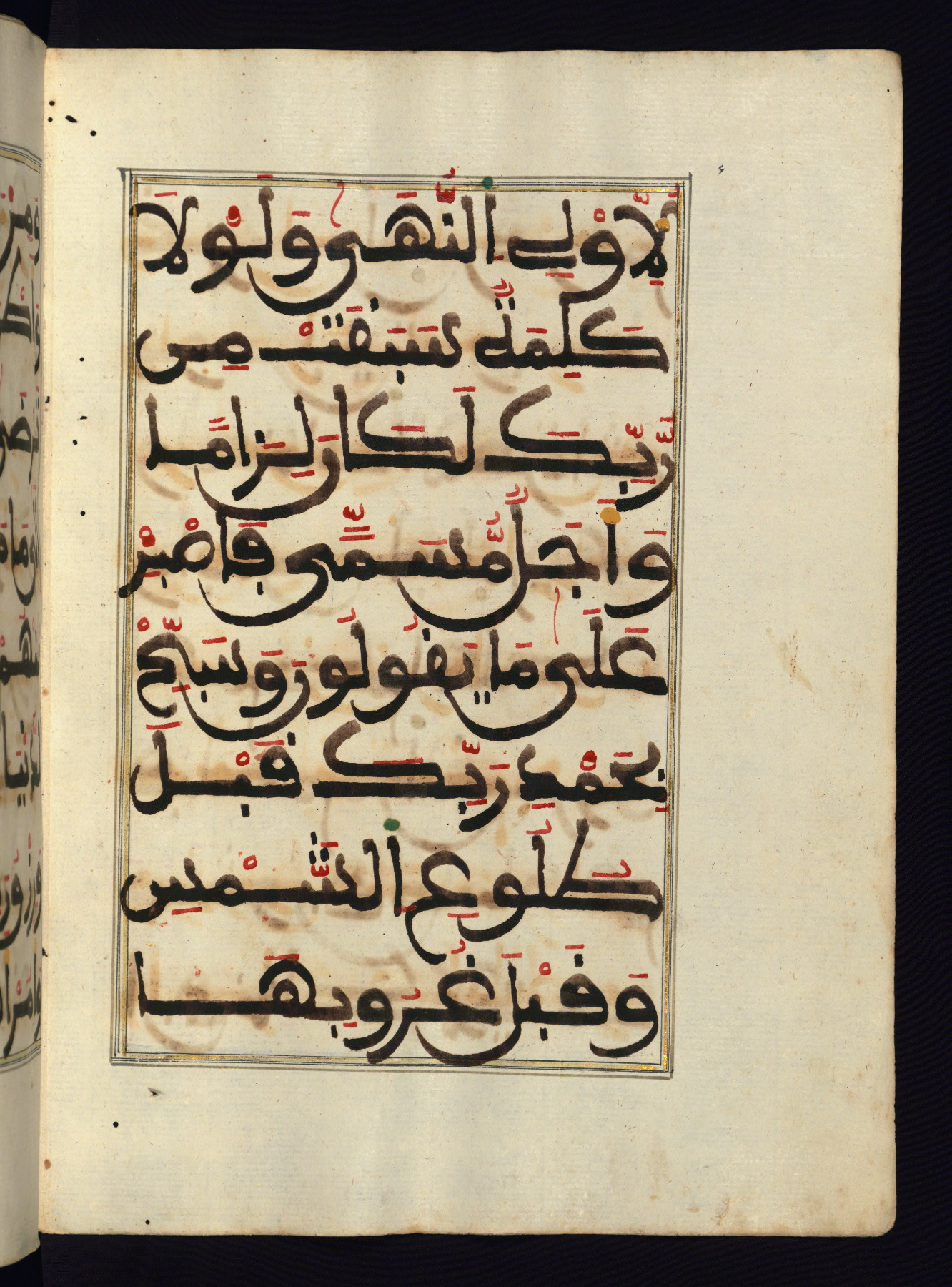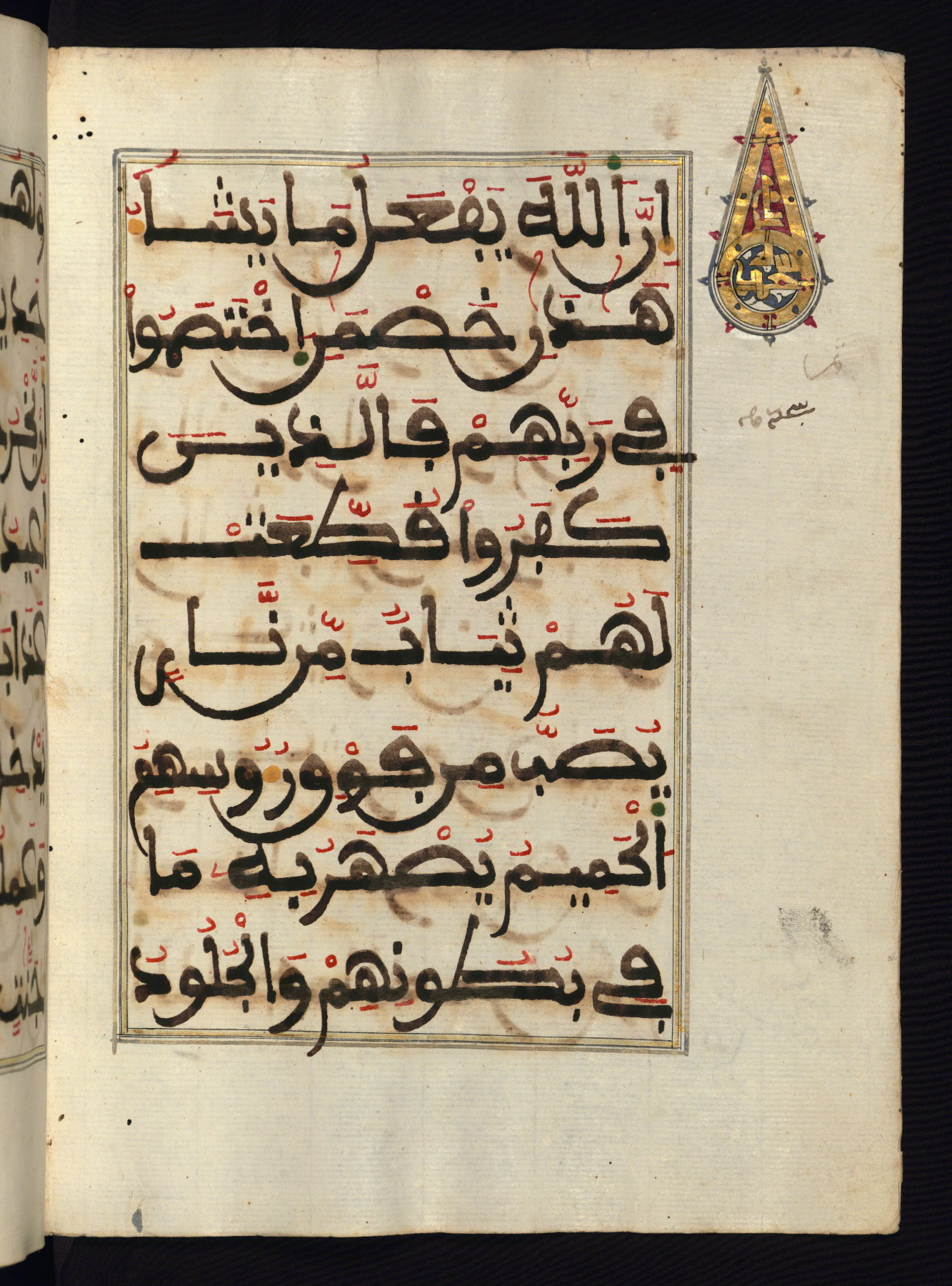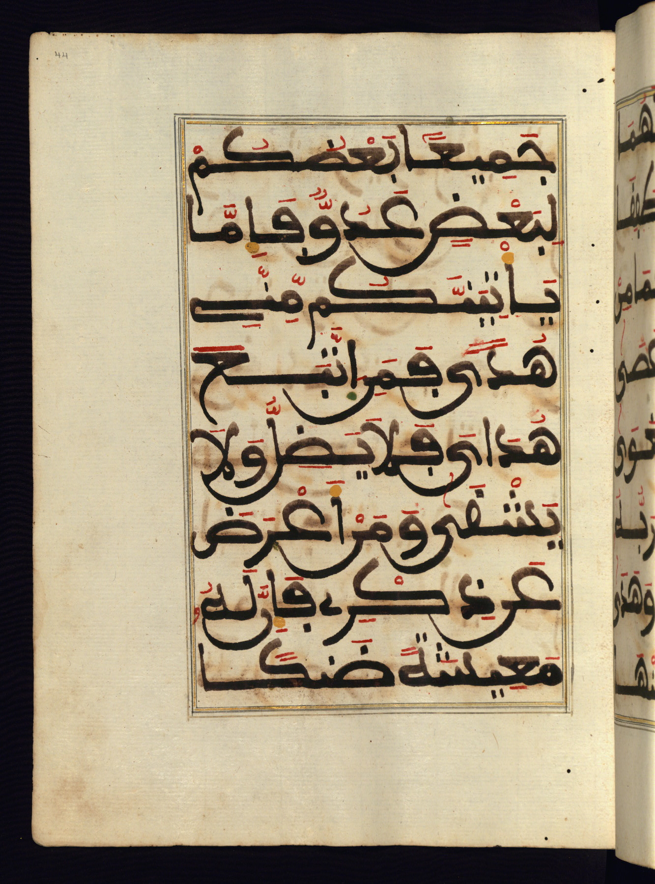 This manuscript is a fragment of the Qur'an, consisting of chapters 19 (Sūrat Maryam) through 23 (Sūrat al-muʾminūn). It was produced in the Maghreb and dates to the twelfth century AH / eighteenth CE. The text is written in a large Maghribī script, with vocalization in red, green, and yellow ink on Italian paper. The codex opens with an illuminated chapter heading for chapter 19 (Sūrat Maryam) written in the New Abbasid (broken cursive) style (fol. 1b) in gold ink within a decorative headpiece. The titles of other chapters are written in the New Abbasid (broken cursive) style in gold ink (fols. 21a, 47b, 70a, and 102a) with a marginal medallion. The blind-tooled goatskin binding is not contemporary with the manuscript and probably dates to the thirteenth century AH / nineteenth CE.