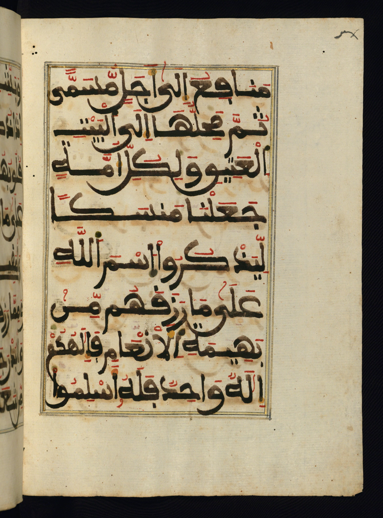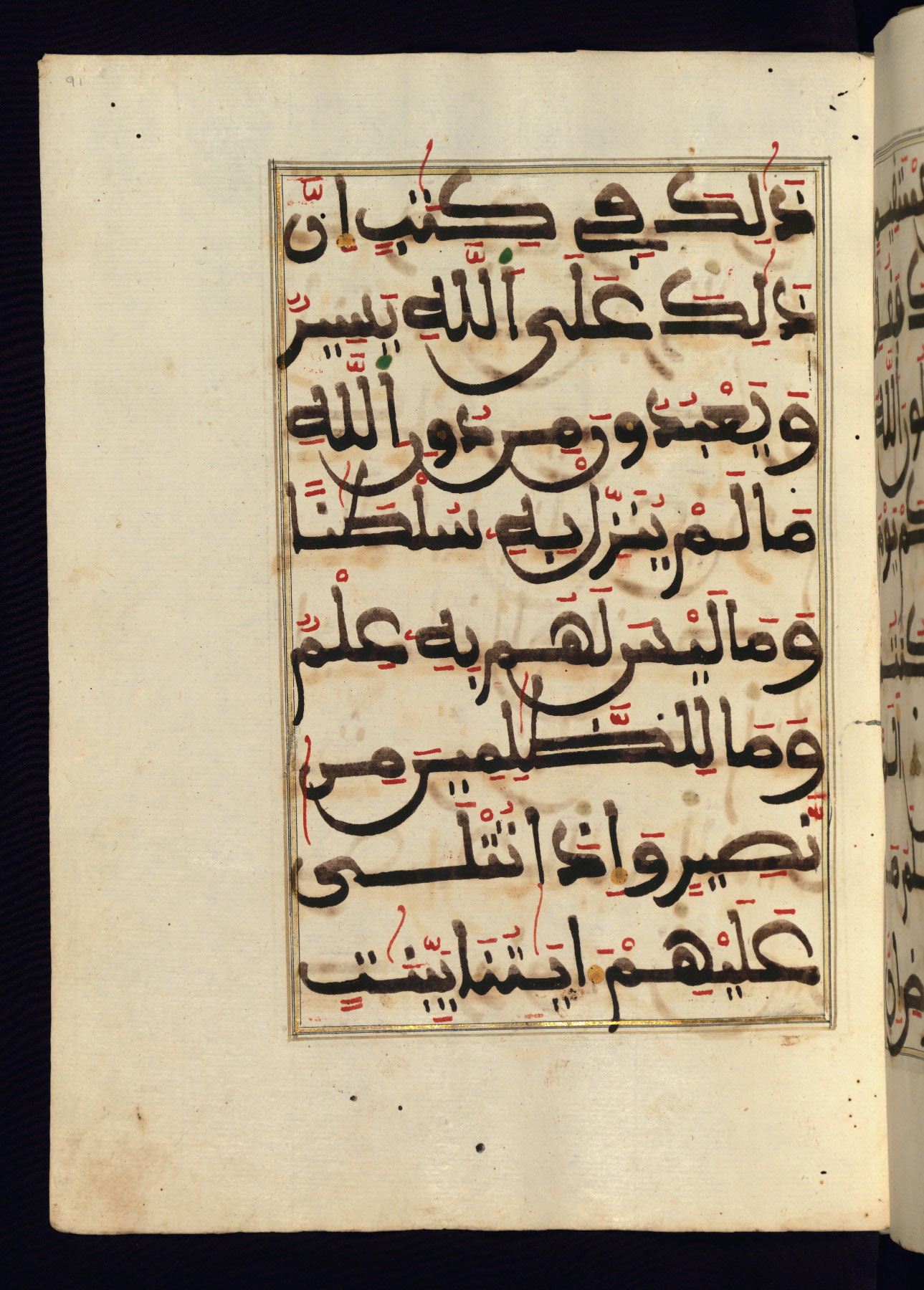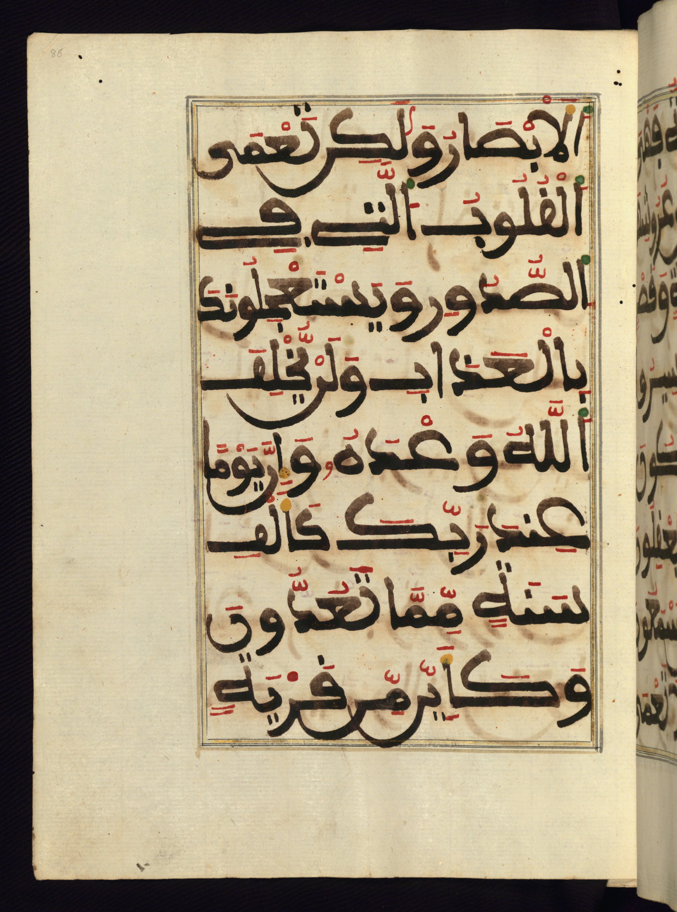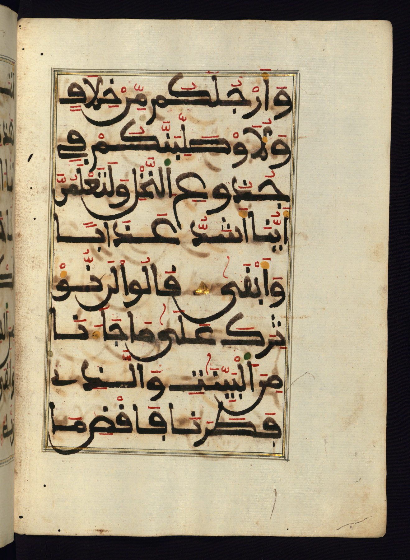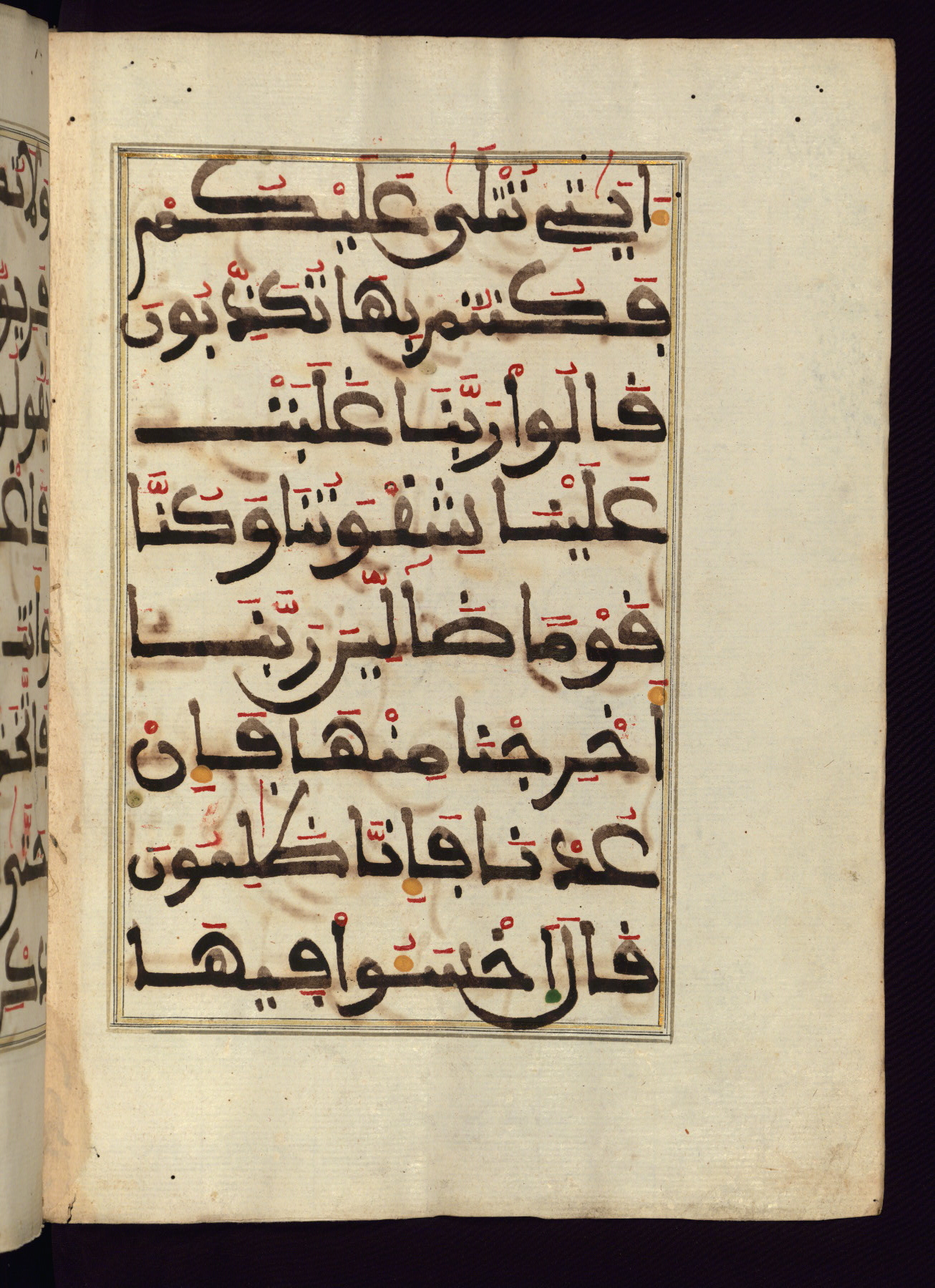 This manuscript is a fragment of the Qur'an, consisting of chapters 19 (Sūrat Maryam) through 23 (Sūrat al-muʾminūn). It was produced in the Maghreb and dates to the twelfth century AH / eighteenth CE. The text is written in a large Maghribī script, with vocalization in red, green, and yellow ink on Italian paper. The codex opens with an illuminated chapter heading for chapter 19 (Sūrat Maryam) written in the New Abbasid (broken cursive) style (fol. 1b) in gold ink within a decorative headpiece. The titles of other chapters are written in the New Abbasid (broken cursive) style in gold ink (fols. 21a, 47b, 70a, and 102a) with a marginal medallion. The blind-tooled goatskin binding is not contemporary with the manuscript and probably dates to the thirteenth century AH / nineteenth CE.