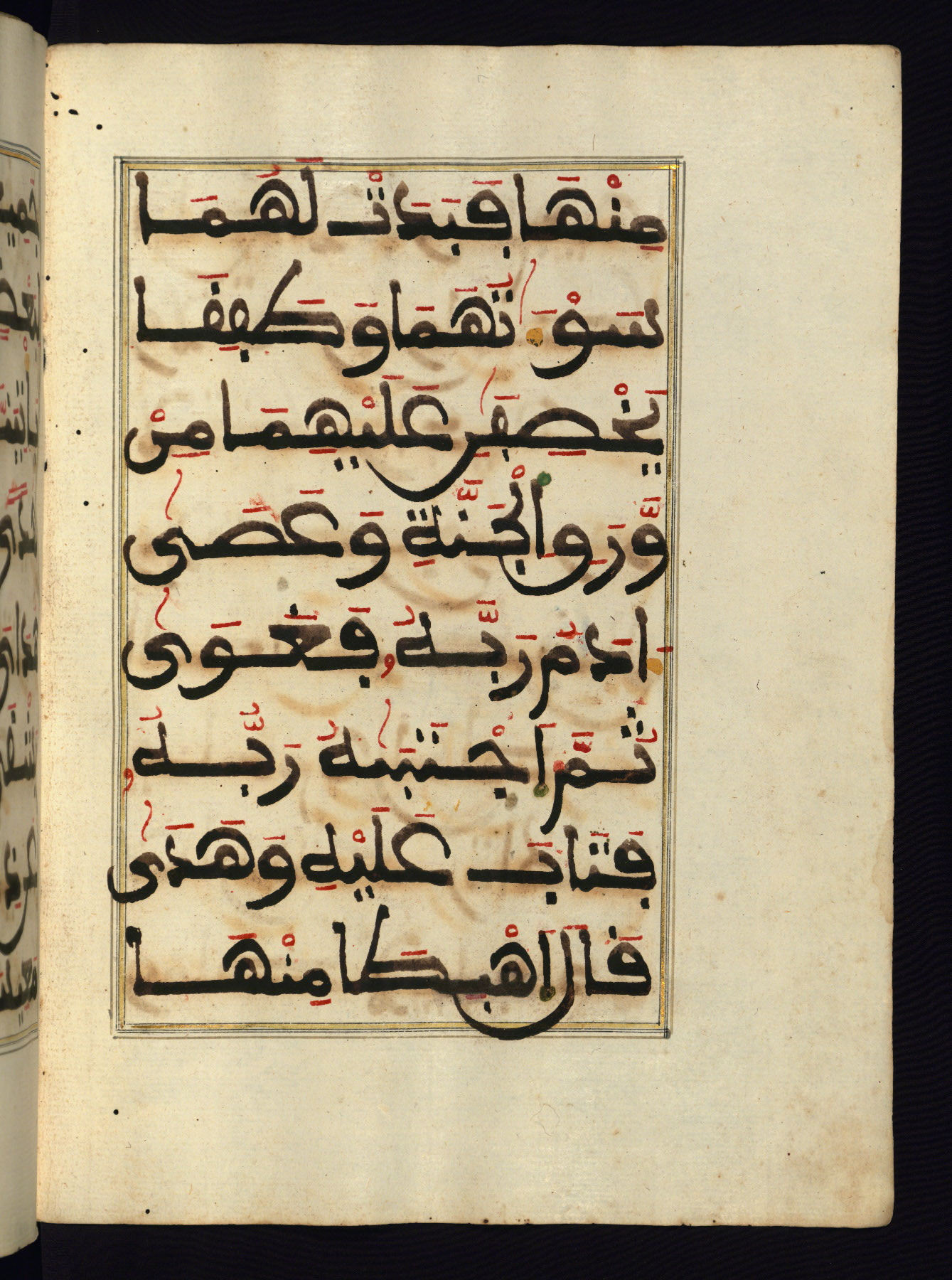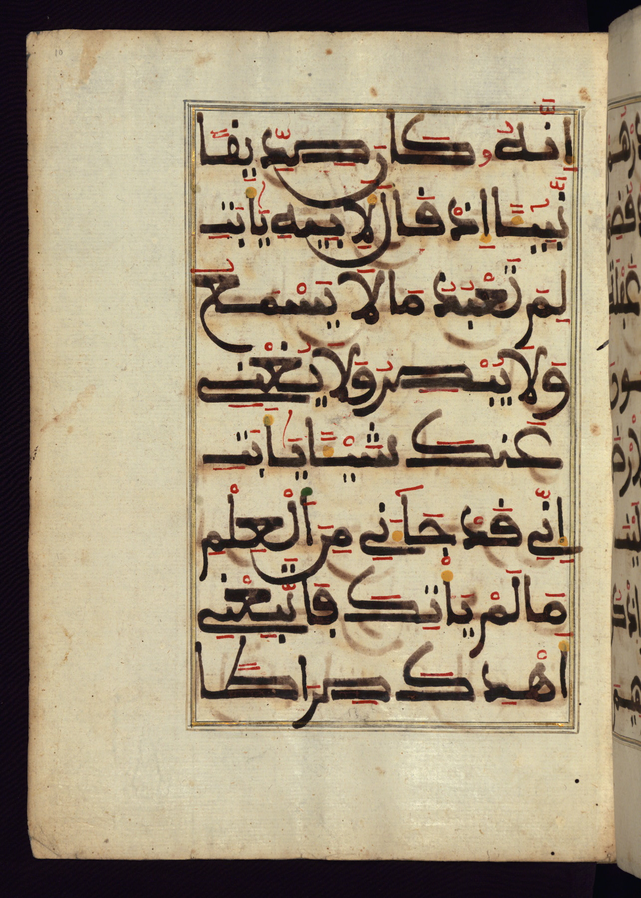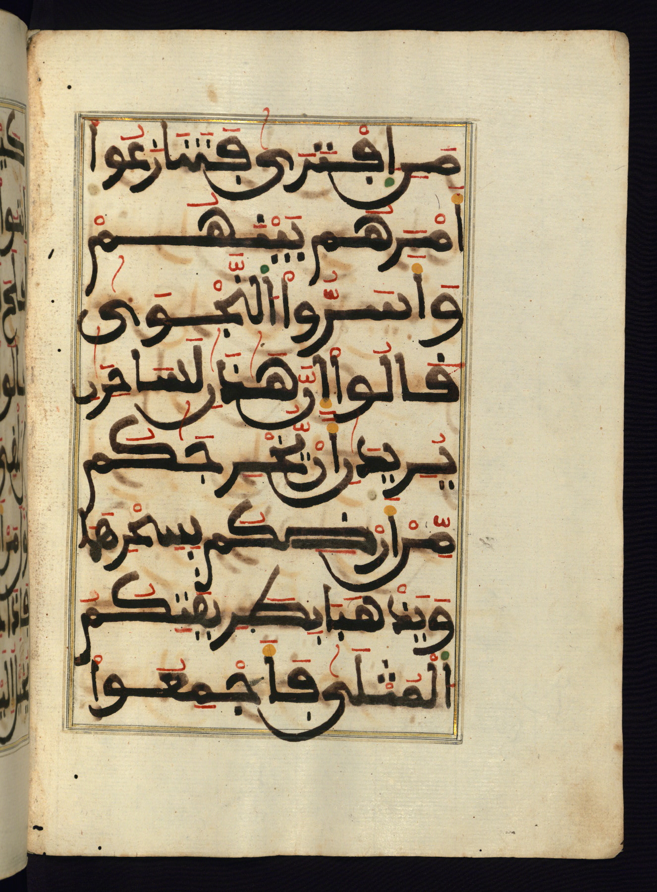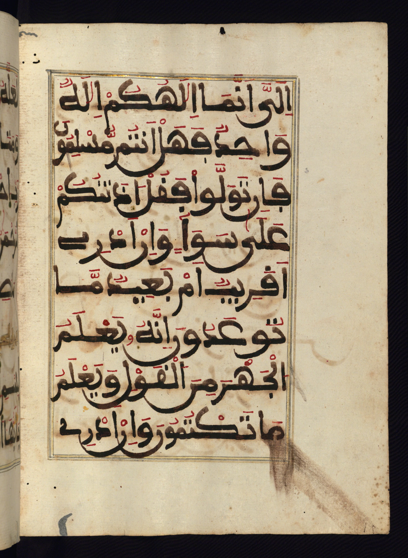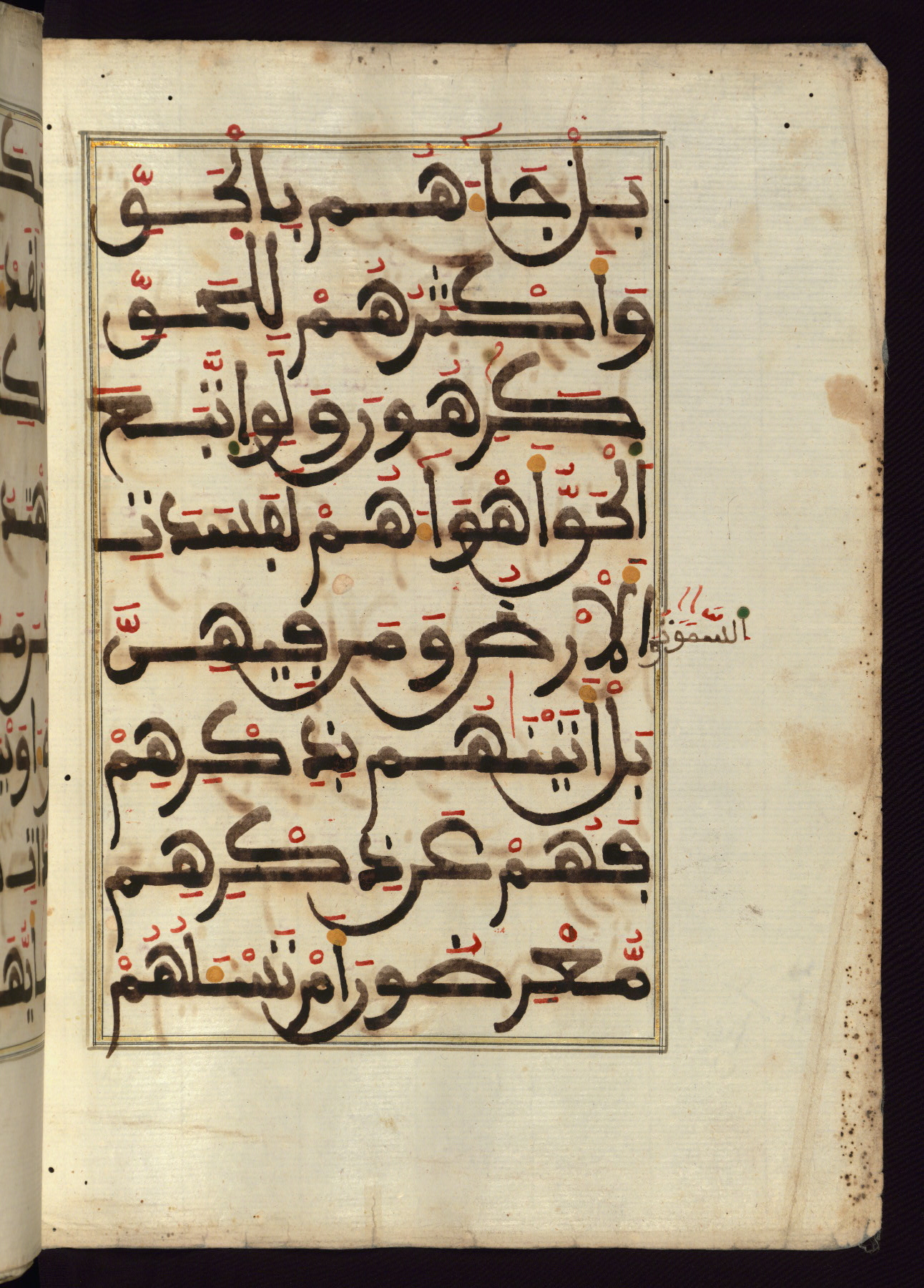 This manuscript is a fragment of the Qur'an, consisting of chapters 19 (Sūrat Maryam) through 23 (Sūrat al-muʾminūn). It was produced in the Maghreb and dates to the twelfth century AH / eighteenth CE. The text is written in a large Maghribī script, with vocalization in red, green, and yellow ink on Italian paper. The codex opens with an illuminated chapter heading for chapter 19 (Sūrat Maryam) written in the New Abbasid (broken cursive) style (fol. 1b) in gold ink within a decorative headpiece. The titles of other chapters are written in the New Abbasid (broken cursive) style in gold ink (fols. 21a, 47b, 70a, and 102a) with a marginal medallion. The blind-tooled goatskin binding is not contemporary with the manuscript and probably dates to the thirteenth century AH / nineteenth CE.