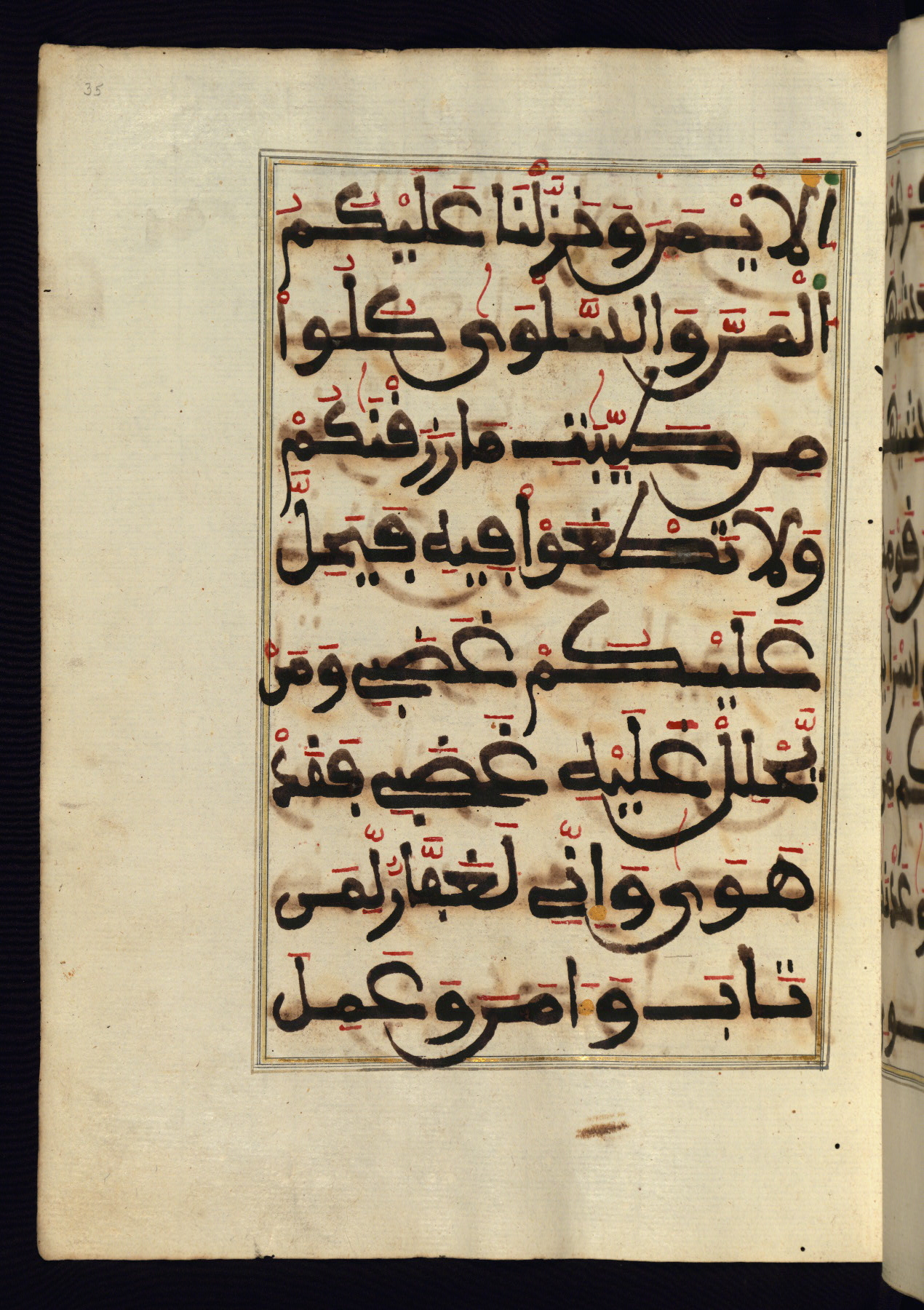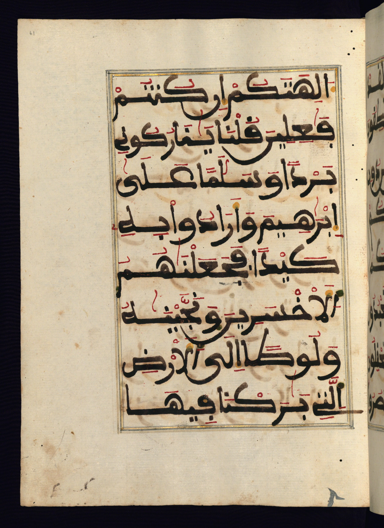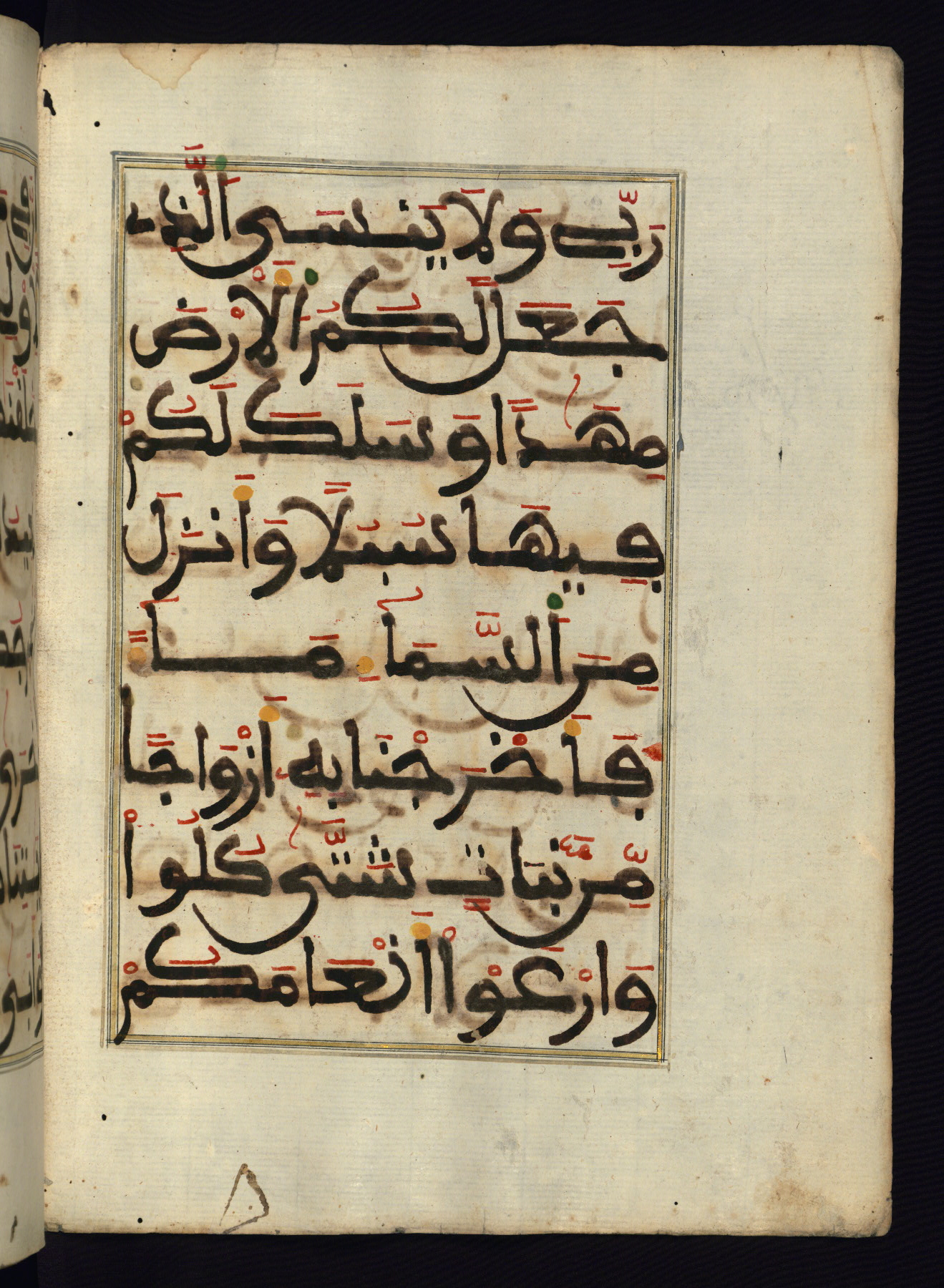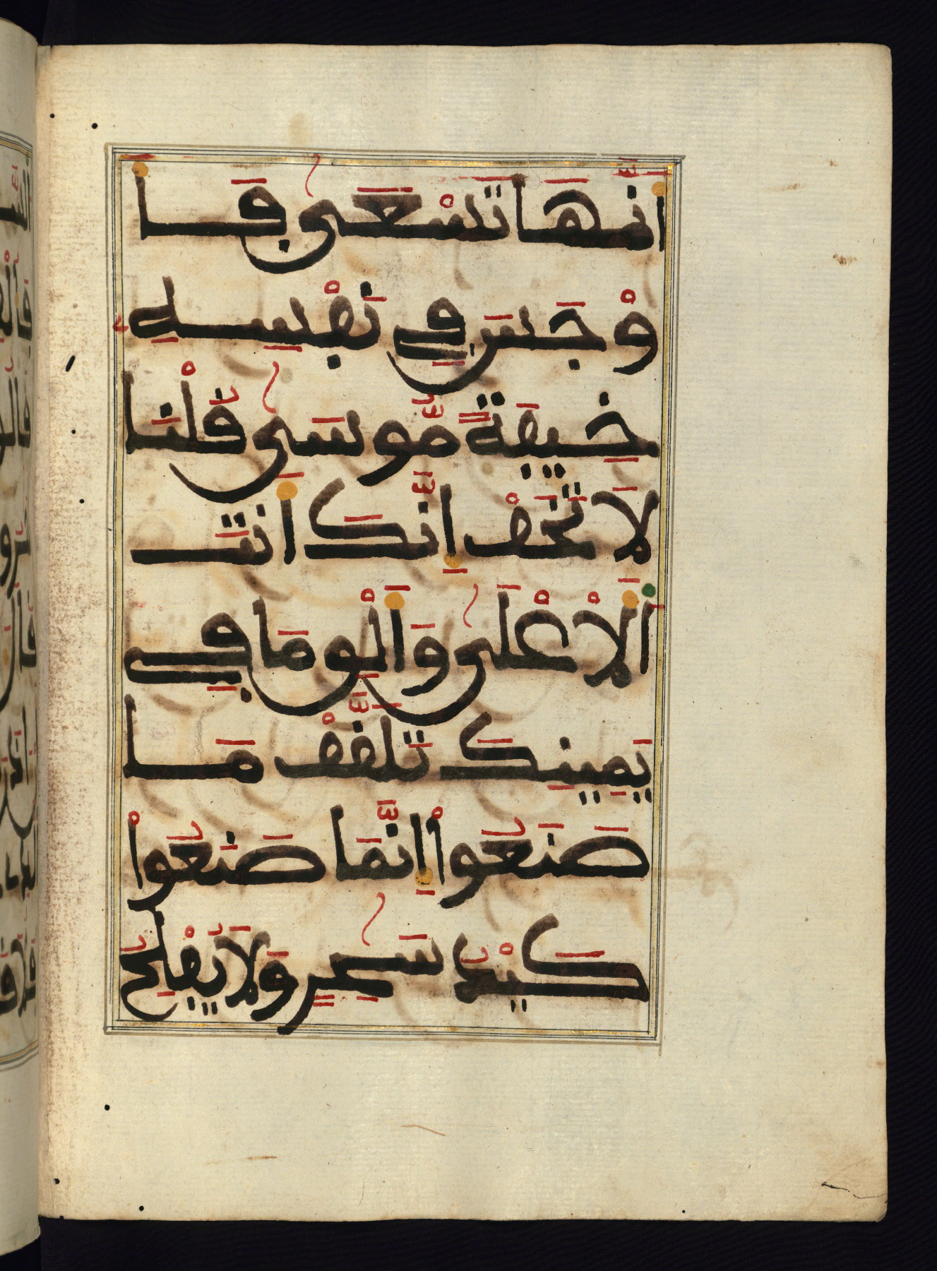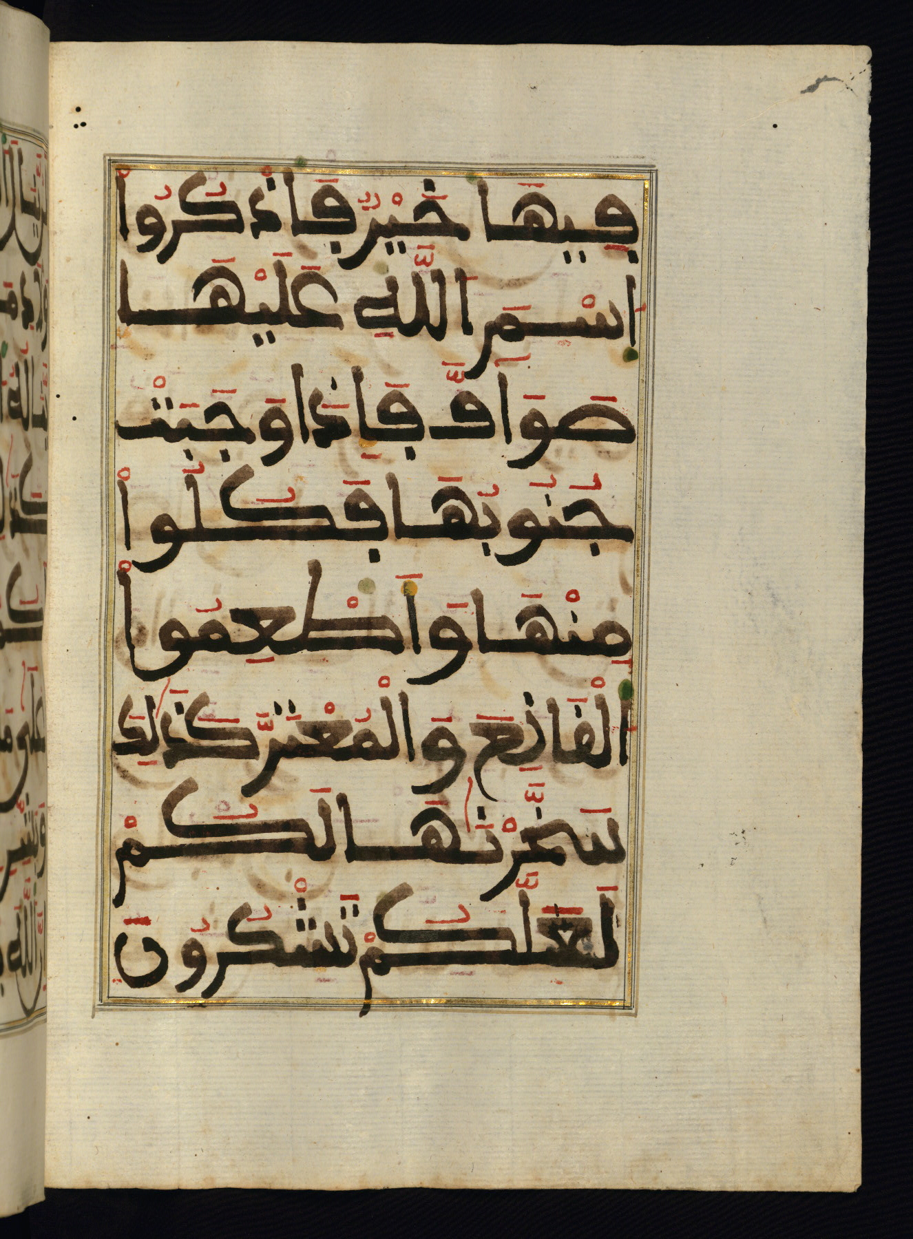 This manuscript is a fragment of the Qur'an, consisting of chapters 19 (Sūrat Maryam) through 23 (Sūrat al-muʾminūn). It was produced in the Maghreb and dates to the twelfth century AH / eighteenth CE. The text is written in a large Maghribī script, with vocalization in red, green, and yellow ink on Italian paper. The codex opens with an illuminated chapter heading for chapter 19 (Sūrat Maryam) written in the New Abbasid (broken cursive) style (fol. 1b) in gold ink within a decorative headpiece. The titles of other chapters are written in the New Abbasid (broken cursive) style in gold ink (fols. 21a, 47b, 70a, and 102a) with a marginal medallion. The blind-tooled goatskin binding is not contemporary with the manuscript and probably dates to the thirteenth century AH / nineteenth CE.