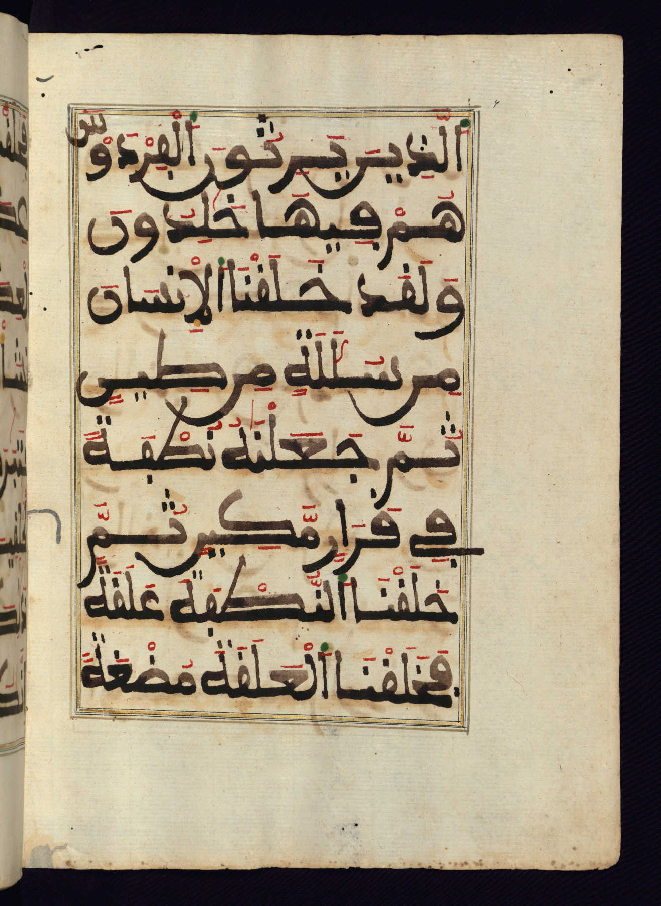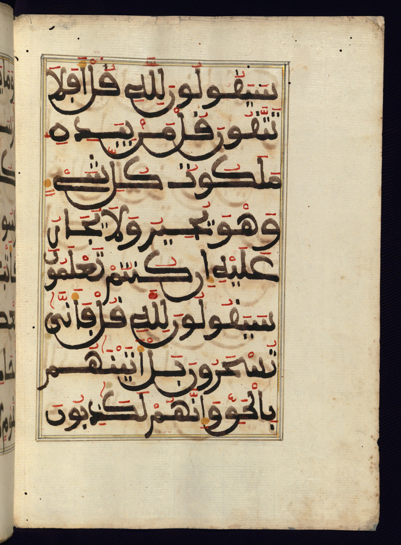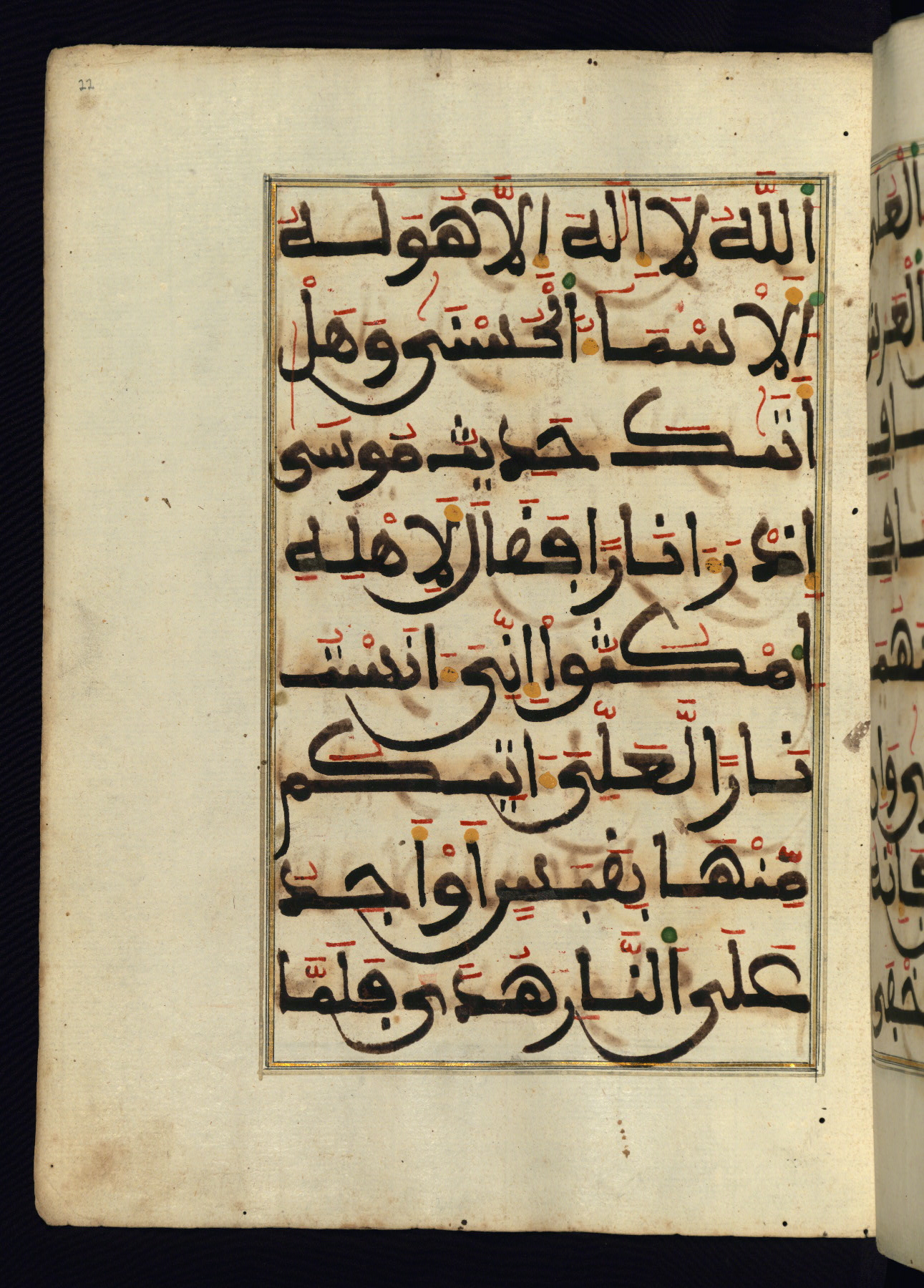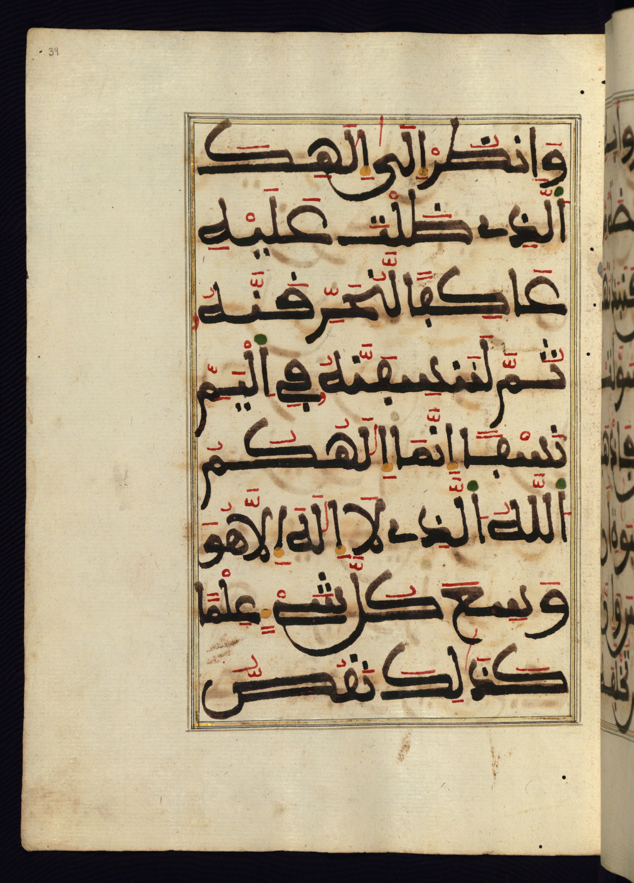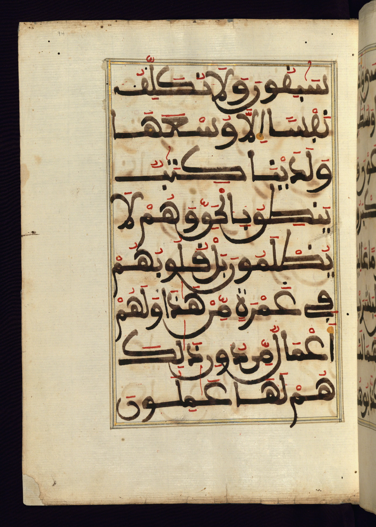 This manuscript is a fragment of the Qur'an, consisting of chapters 19 (Sūrat Maryam) through 23 (Sūrat al-muʾminūn). It was produced in the Maghreb and dates to the twelfth century AH / eighteenth CE. The text is written in a large Maghribī script, with vocalization in red, green, and yellow ink on Italian paper. The codex opens with an illuminated chapter heading for chapter 19 (Sūrat Maryam) written in the New Abbasid (broken cursive) style (fol. 1b) in gold ink within a decorative headpiece. The titles of other chapters are written in the New Abbasid (broken cursive) style in gold ink (fols. 21a, 47b, 70a, and 102a) with a marginal medallion. The blind-tooled goatskin binding is not contemporary with the manuscript and probably dates to the thirteenth century AH / nineteenth CE.