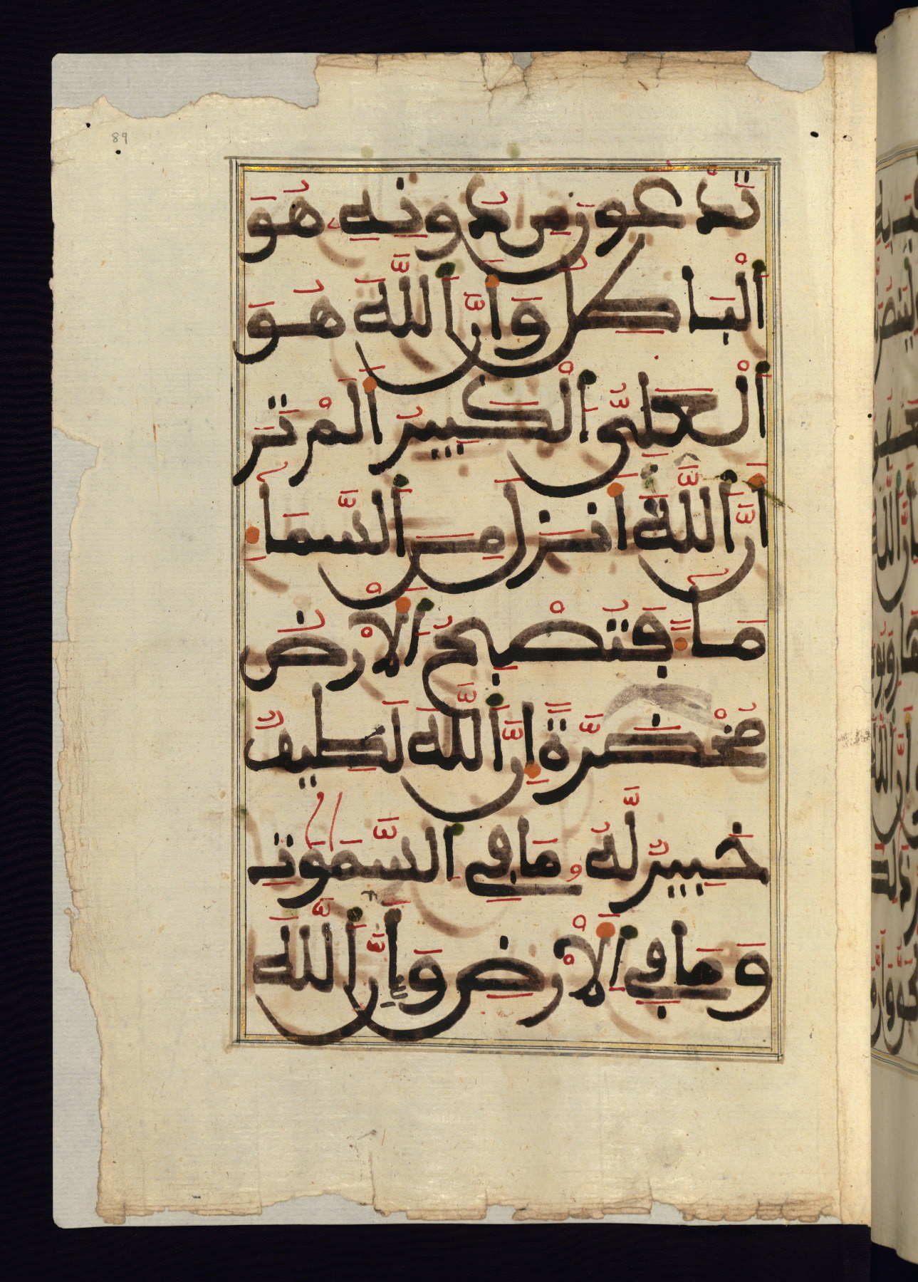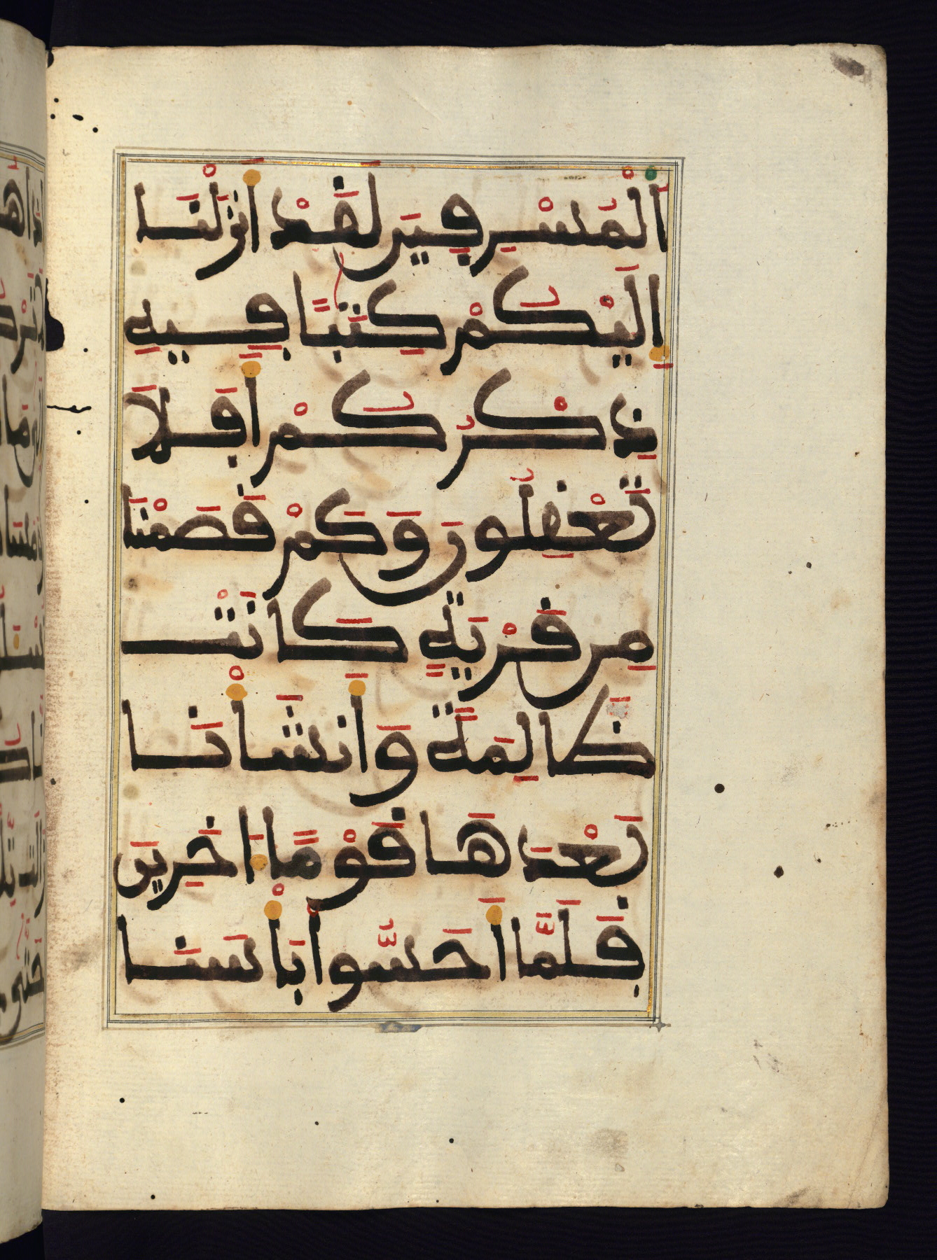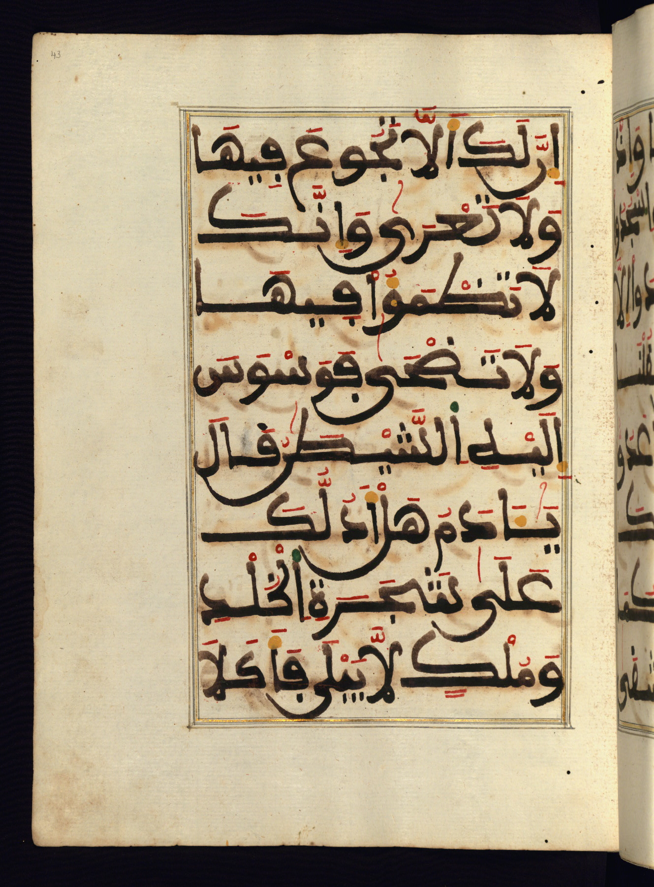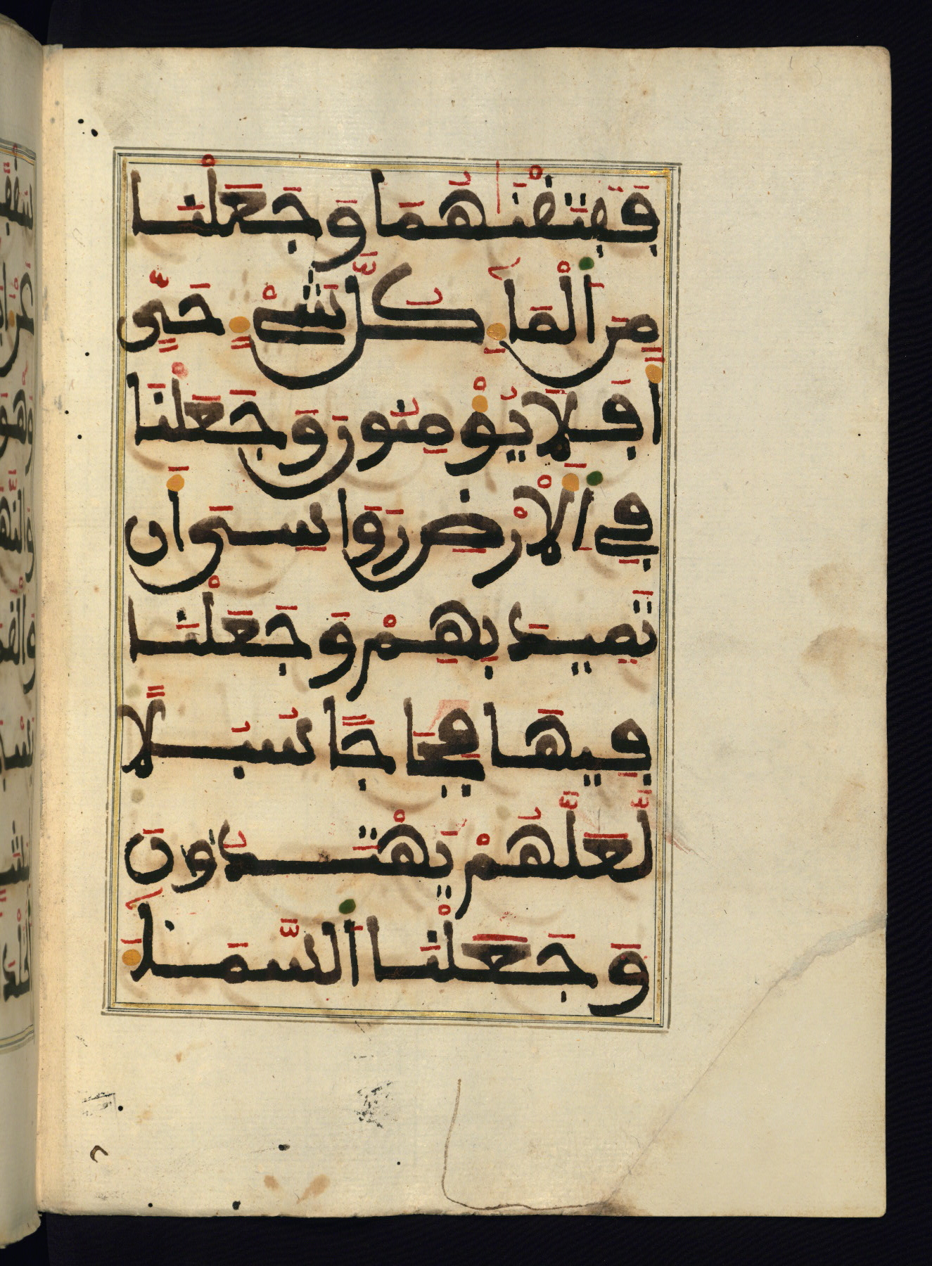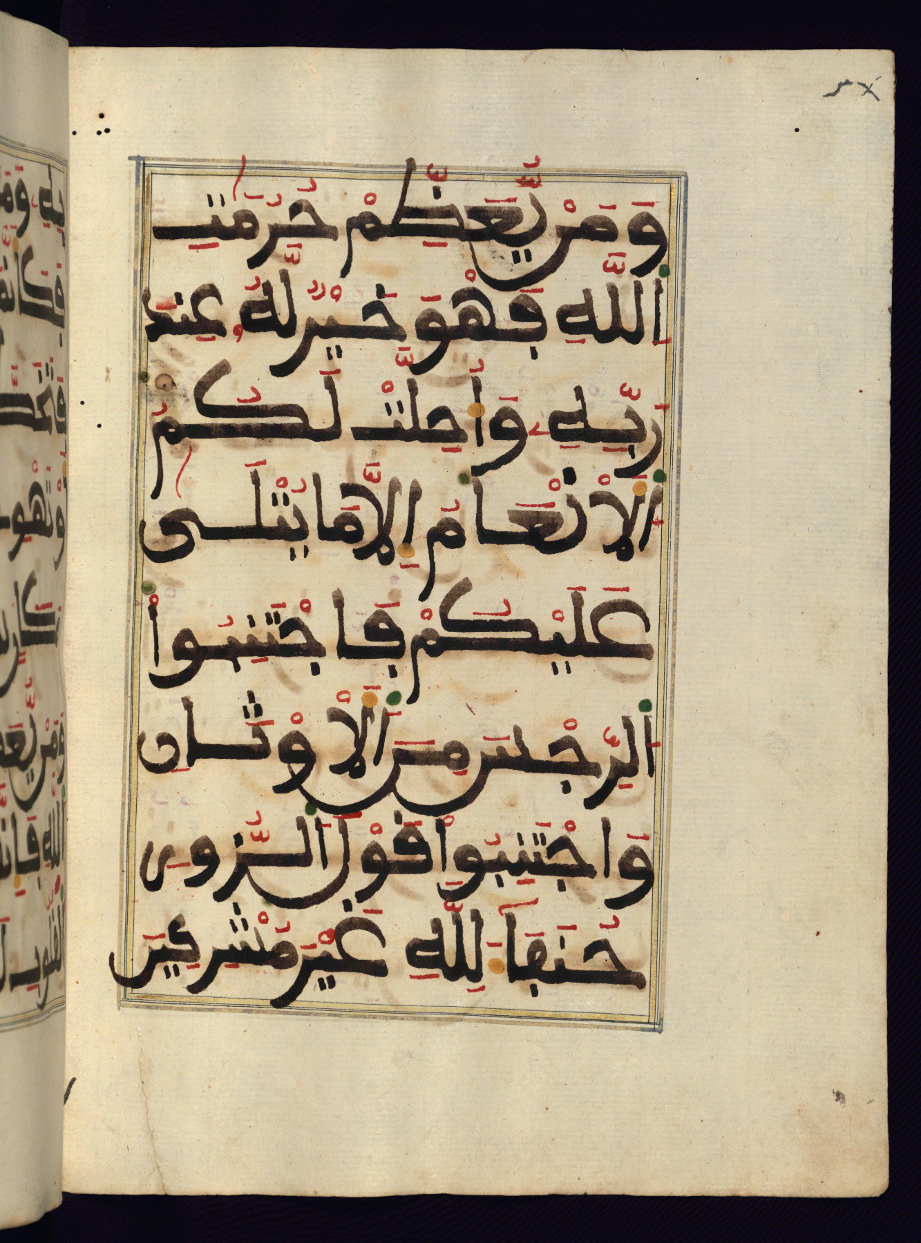 This manuscript is a fragment of the Qur'an, consisting of chapters 19 (Sūrat Maryam) through 23 (Sūrat al-muʾminūn). It was produced in the Maghreb and dates to the twelfth century AH / eighteenth CE. The text is written in a large Maghribī script, with vocalization in red, green, and yellow ink on Italian paper. The codex opens with an illuminated chapter heading for chapter 19 (Sūrat Maryam) written in the New Abbasid (broken cursive) style (fol. 1b) in gold ink within a decorative headpiece. The titles of other chapters are written in the New Abbasid (broken cursive) style in gold ink (fols. 21a, 47b, 70a, and 102a) with a marginal medallion. The blind-tooled goatskin binding is not contemporary with the manuscript and probably dates to the thirteenth century AH / nineteenth CE.