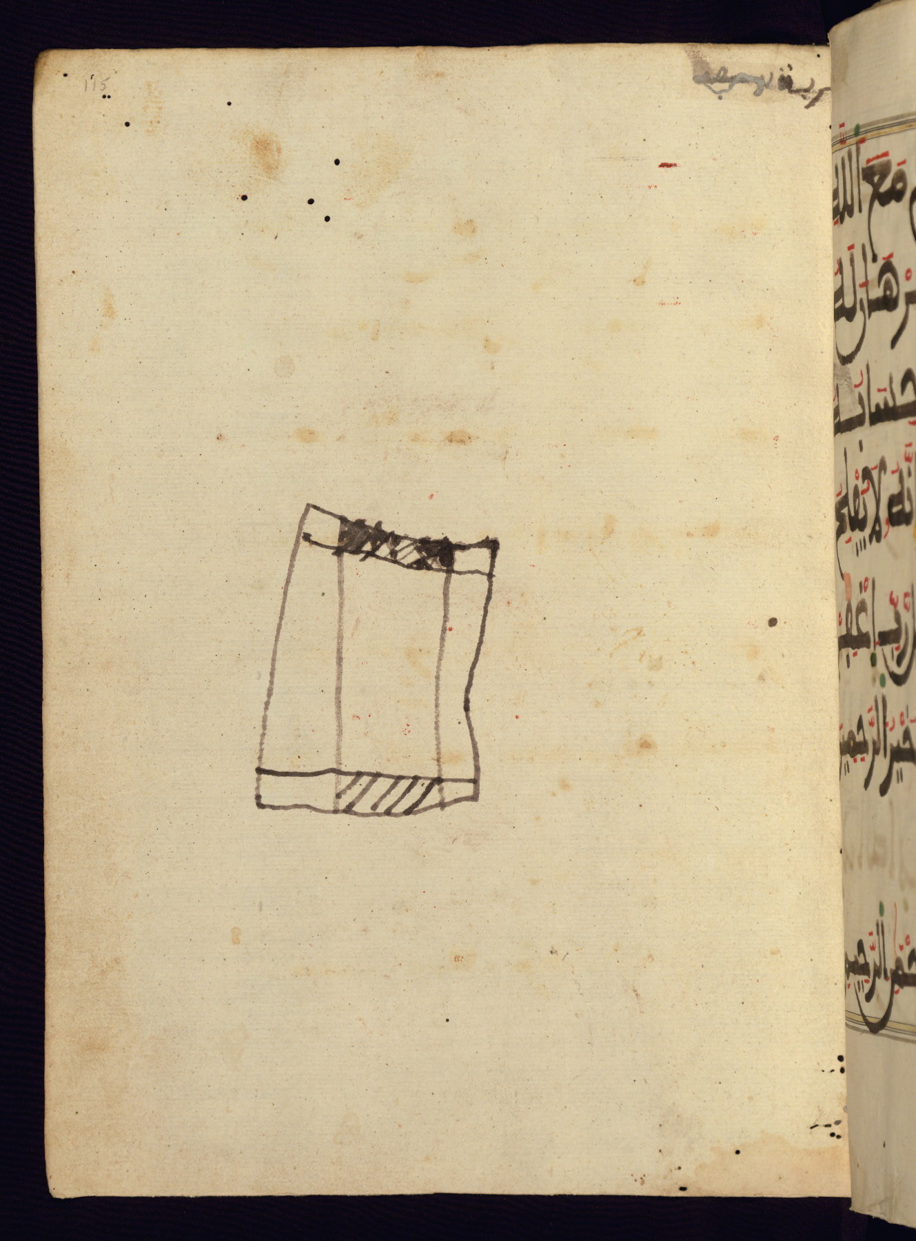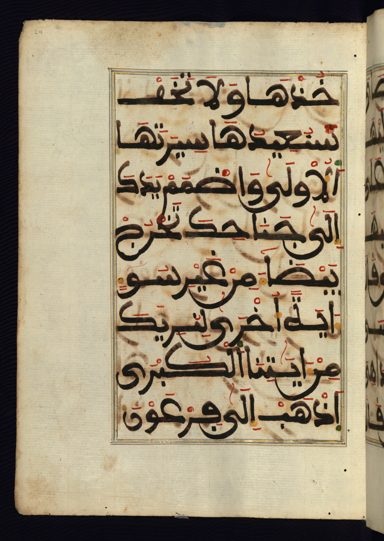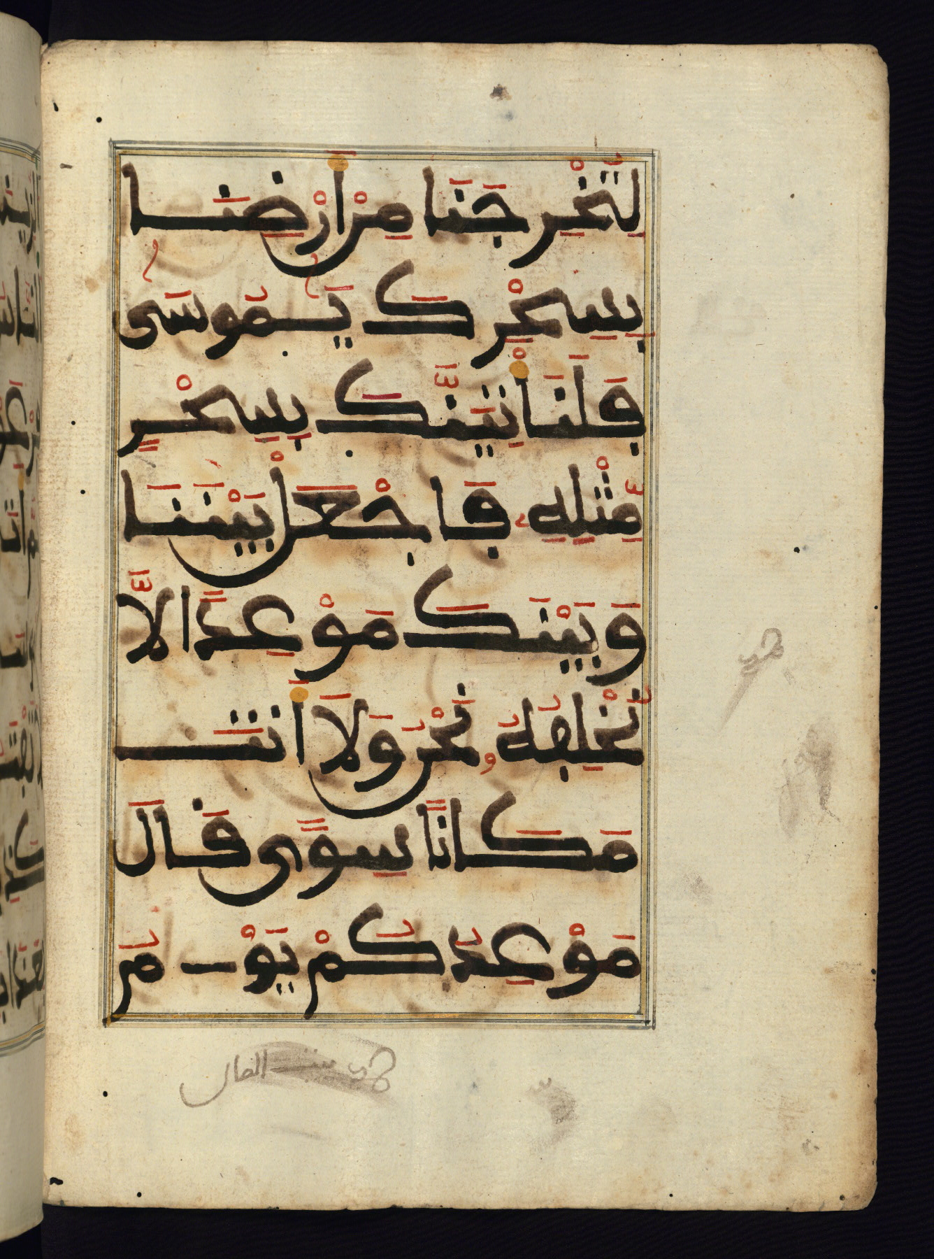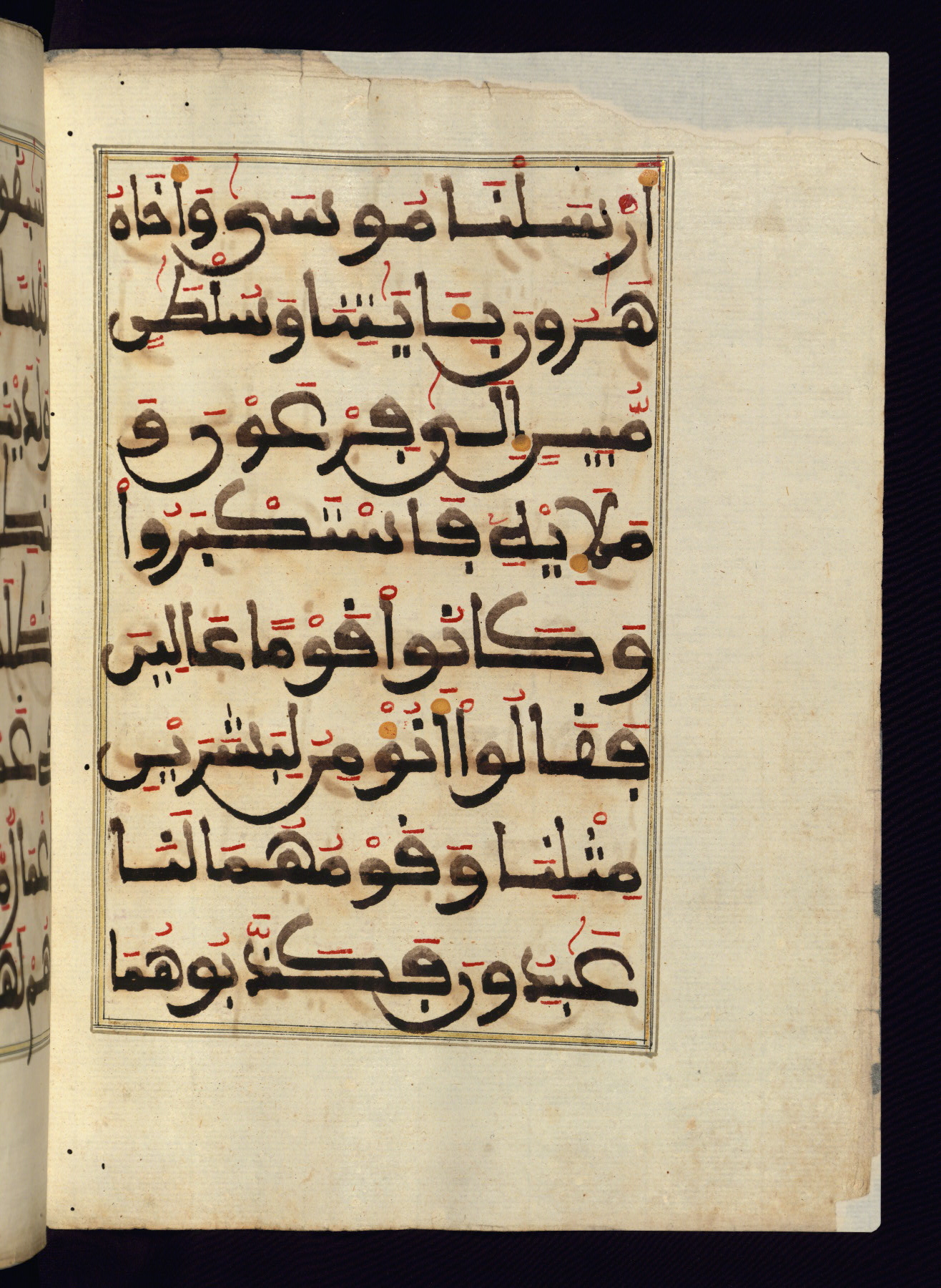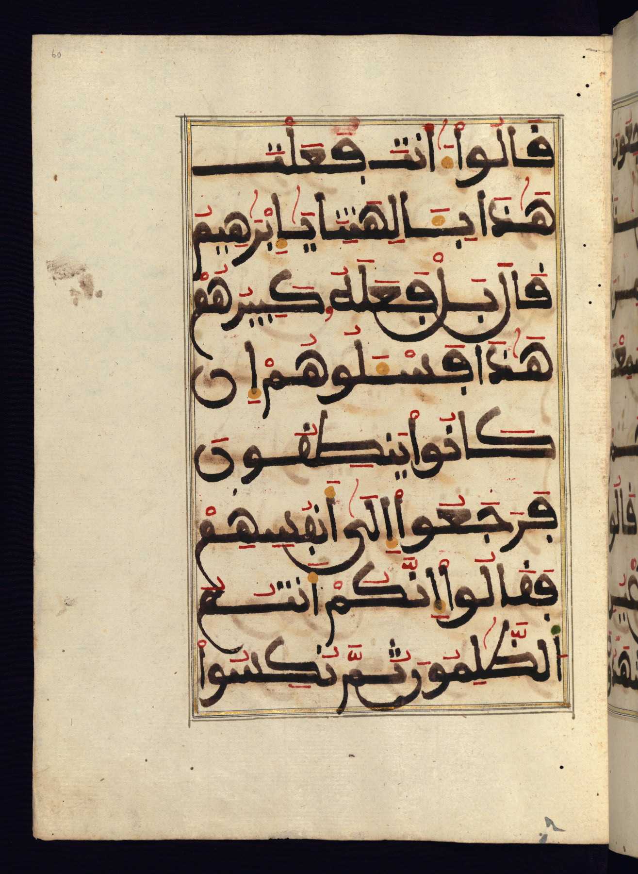 This manuscript is a fragment of the Qur'an, consisting of chapters 19 (Sūrat Maryam) through 23 (Sūrat al-muʾminūn). It was produced in the Maghreb and dates to the twelfth century AH / eighteenth CE. The text is written in a large Maghribī script, with vocalization in red, green, and yellow ink on Italian paper. The codex opens with an illuminated chapter heading for chapter 19 (Sūrat Maryam) written in the New Abbasid (broken cursive) style (fol. 1b) in gold ink within a decorative headpiece. The titles of other chapters are written in the New Abbasid (broken cursive) style in gold ink (fols. 21a, 47b, 70a, and 102a) with a marginal medallion. The blind-tooled goatskin binding is not contemporary with the manuscript and probably dates to the thirteenth century AH / nineteenth CE.