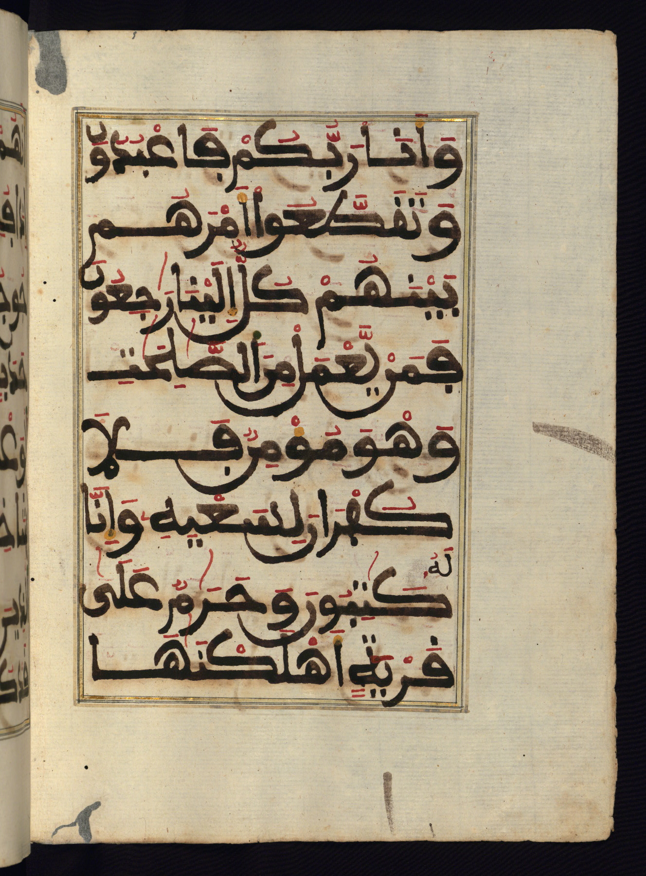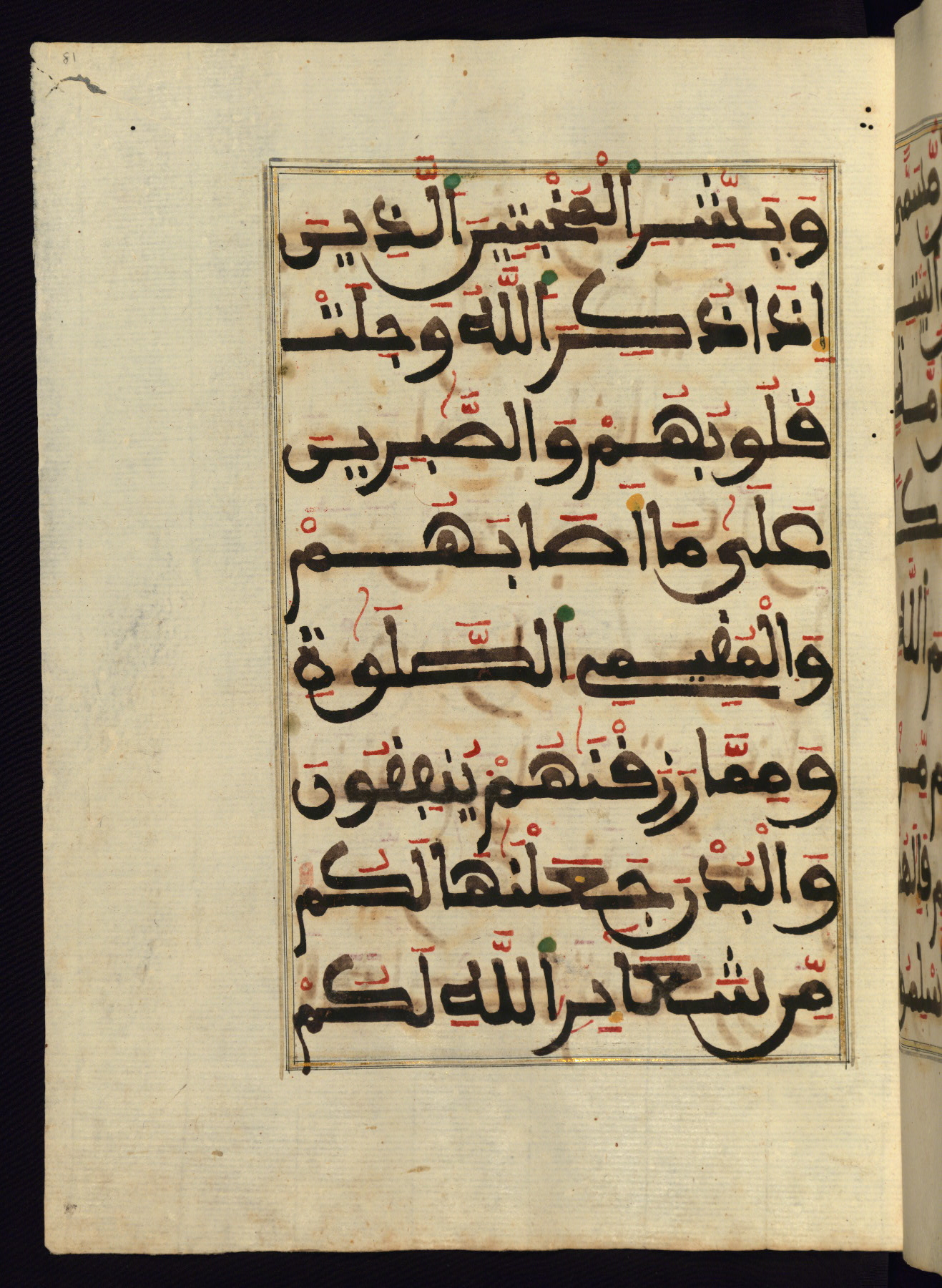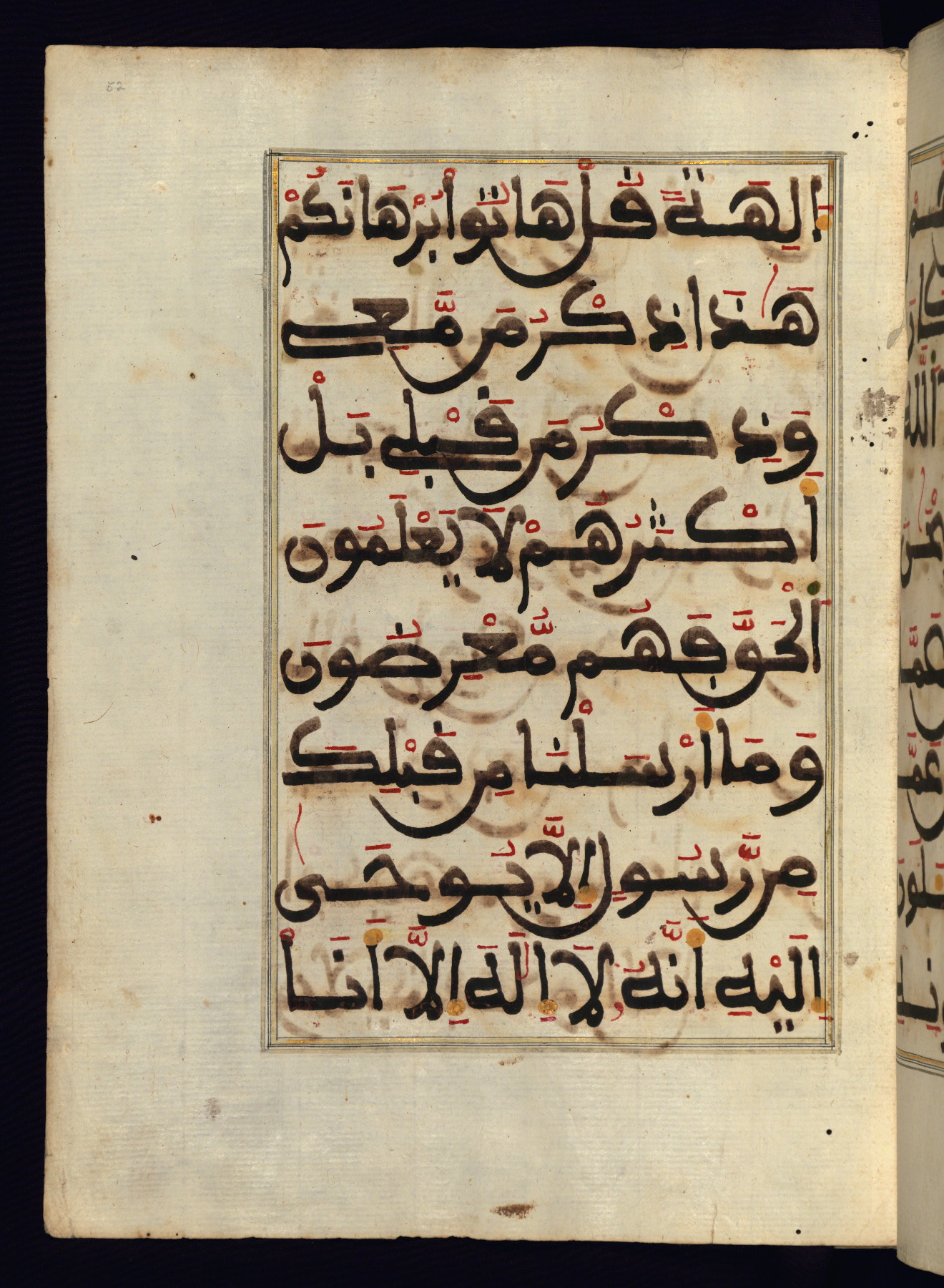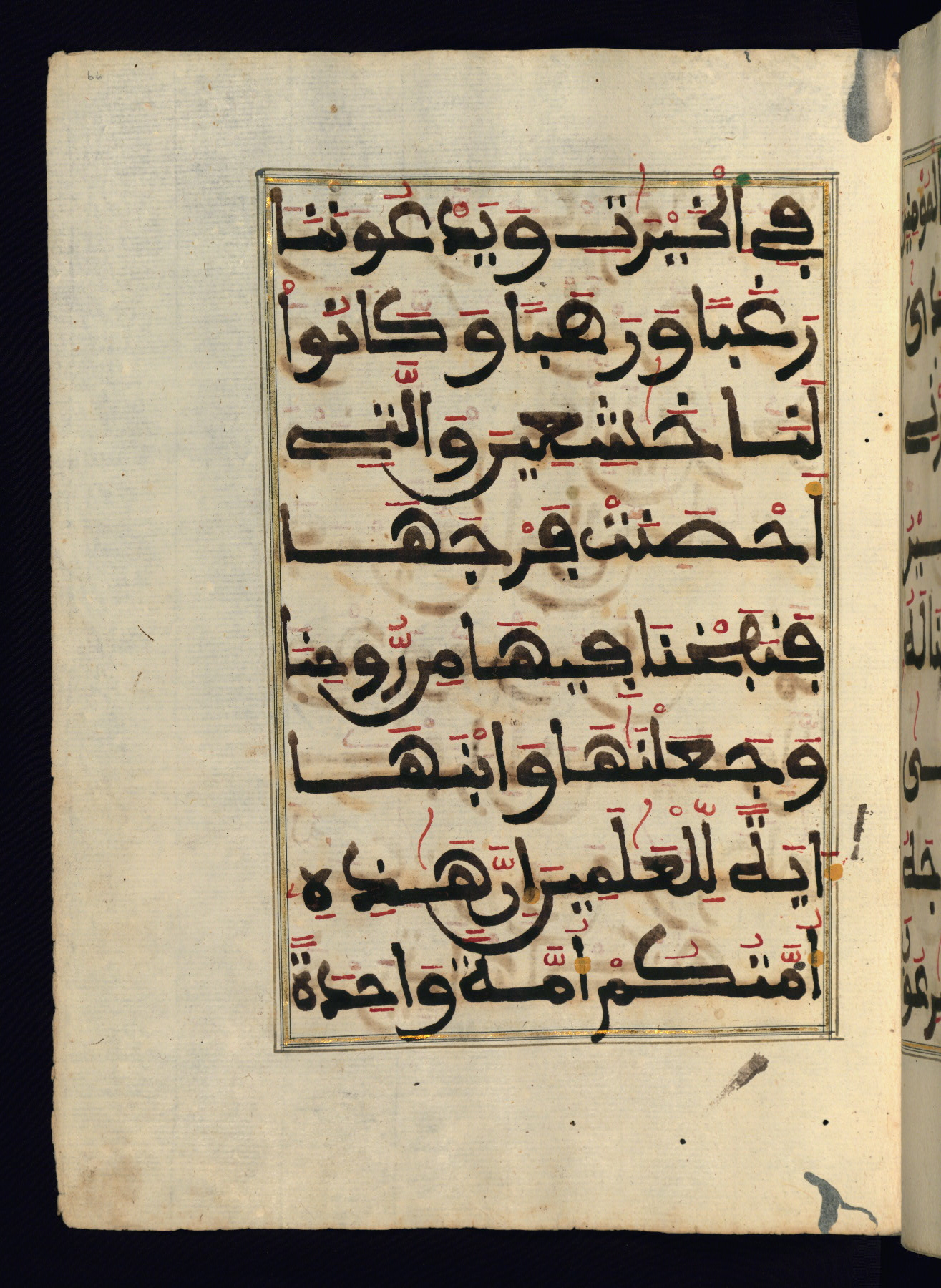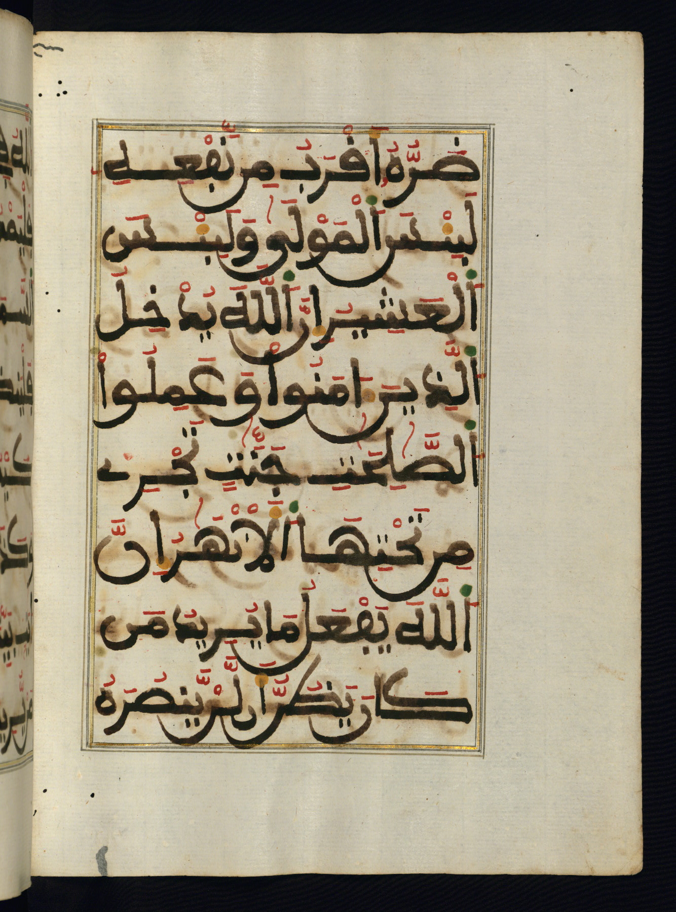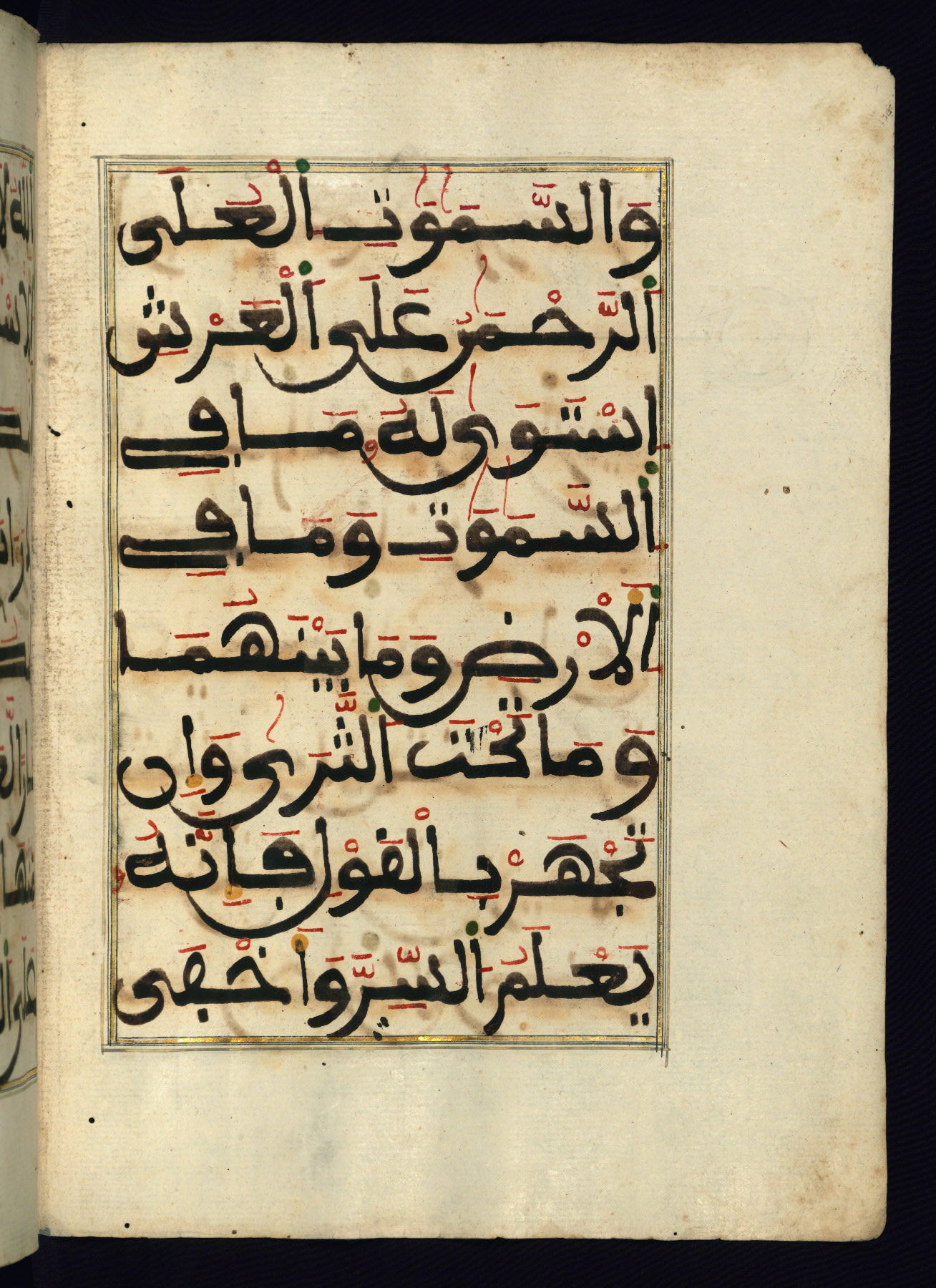 This manuscript is a fragment of the Qur'an, consisting of chapters 19 (Sūrat Maryam) through 23 (Sūrat al-muʾminūn). It was produced in the Maghreb and dates to the twelfth century AH / eighteenth CE. The text is written in a large Maghribī script, with vocalization in red, green, and yellow ink on Italian paper. The codex opens with an illuminated chapter heading for chapter 19 (Sūrat Maryam) written in the New Abbasid (broken cursive) style (fol. 1b) in gold ink within a decorative headpiece. The titles of other chapters are written in the New Abbasid (broken cursive) style in gold ink (fols. 21a, 47b, 70a, and 102a) with a marginal medallion. The blind-tooled goatskin binding is not contemporary with the manuscript and probably dates to the thirteenth century AH / nineteenth CE.