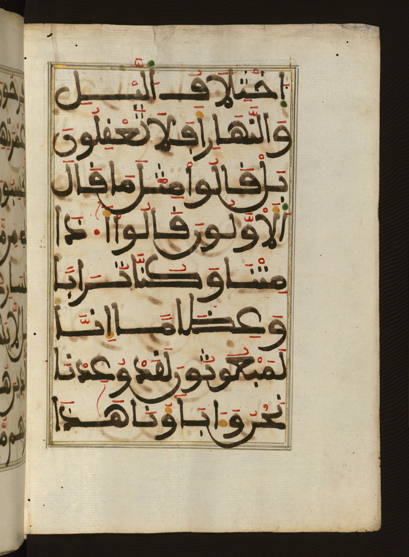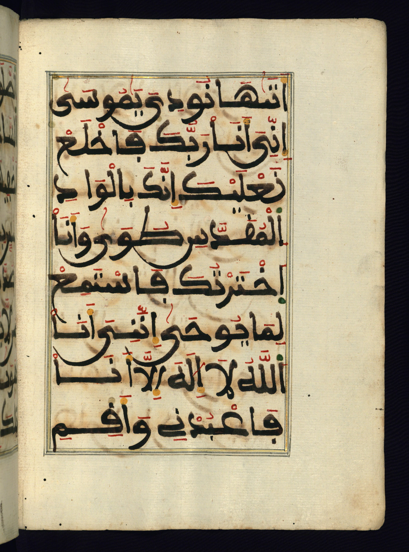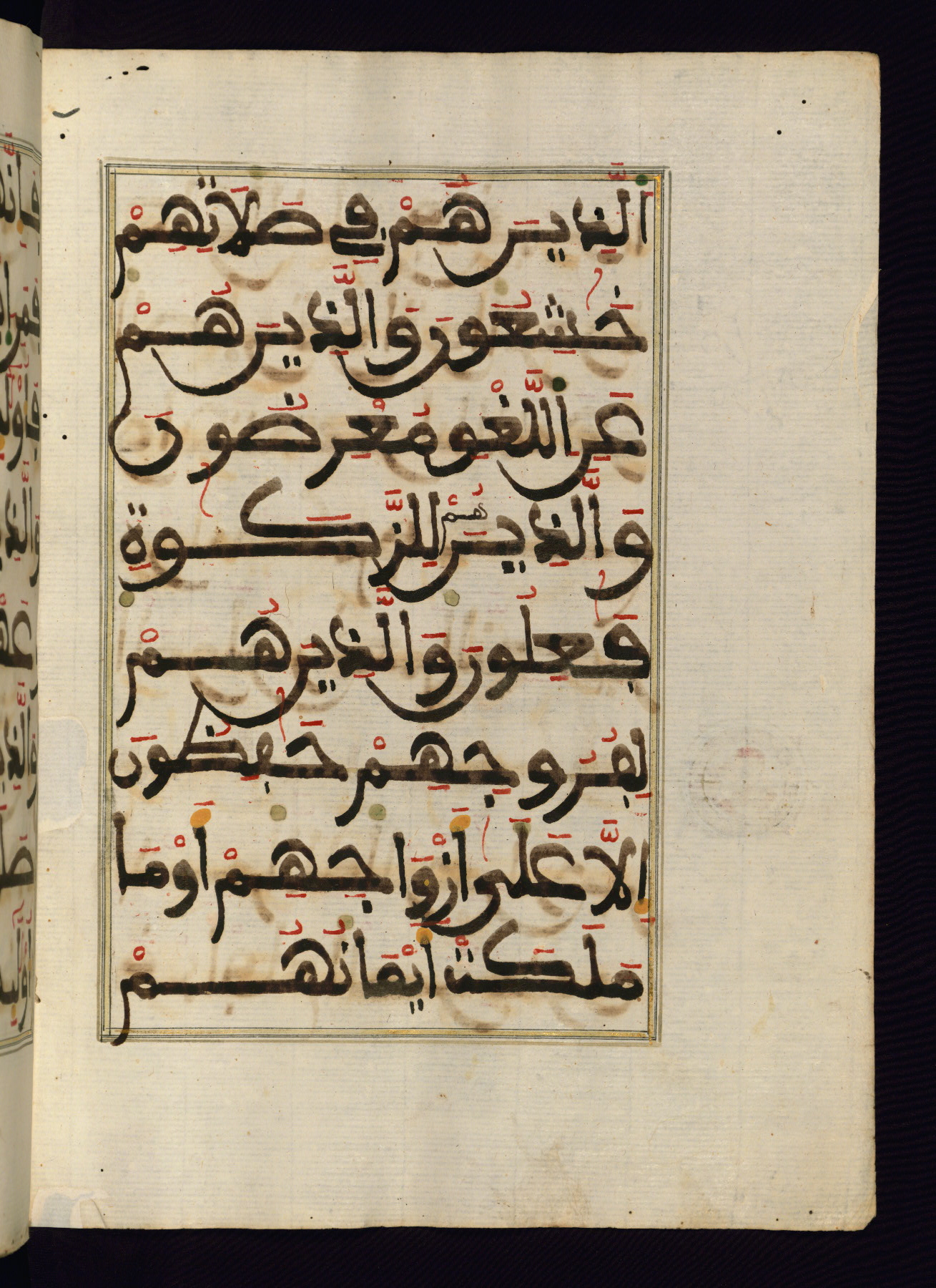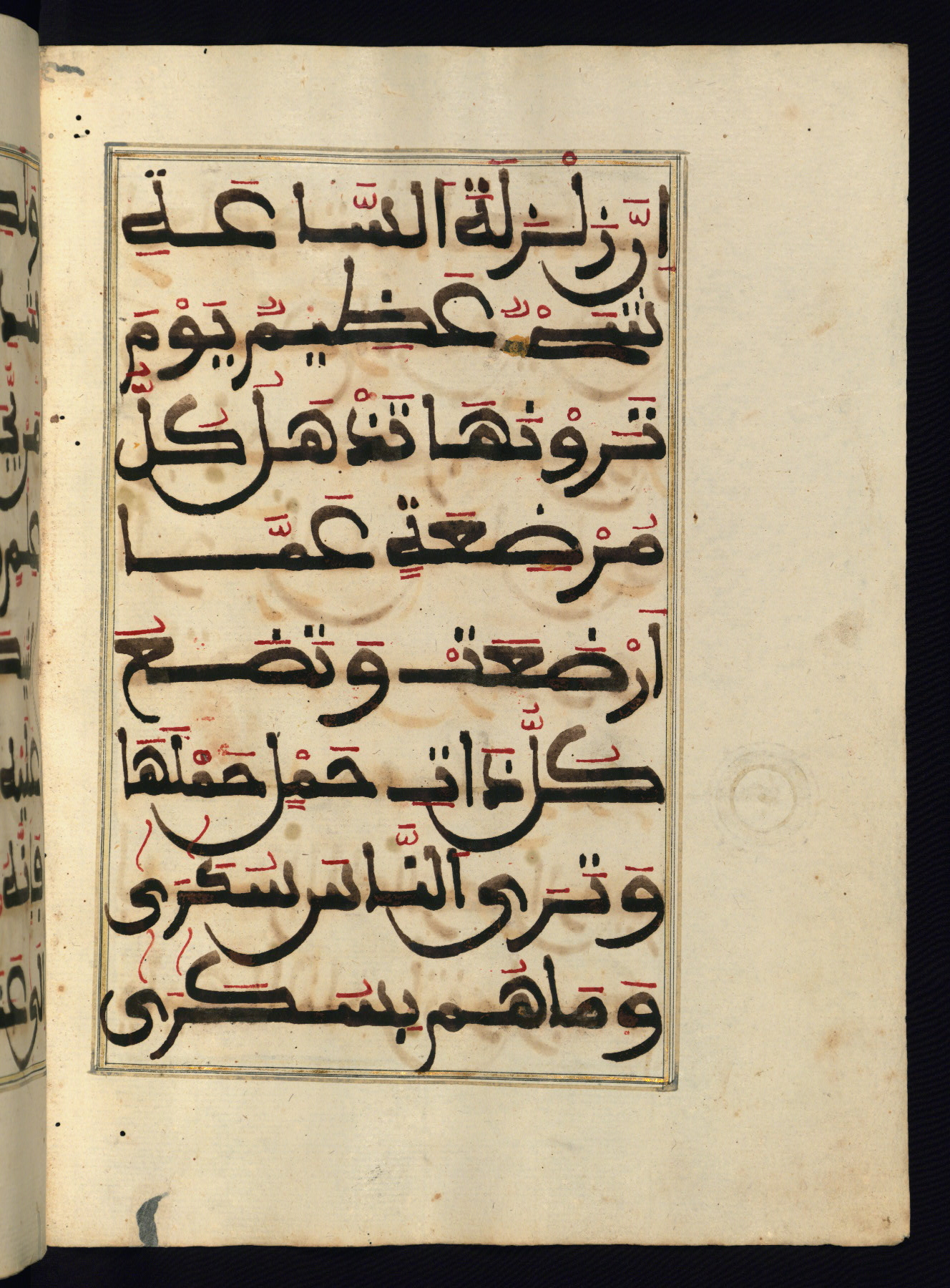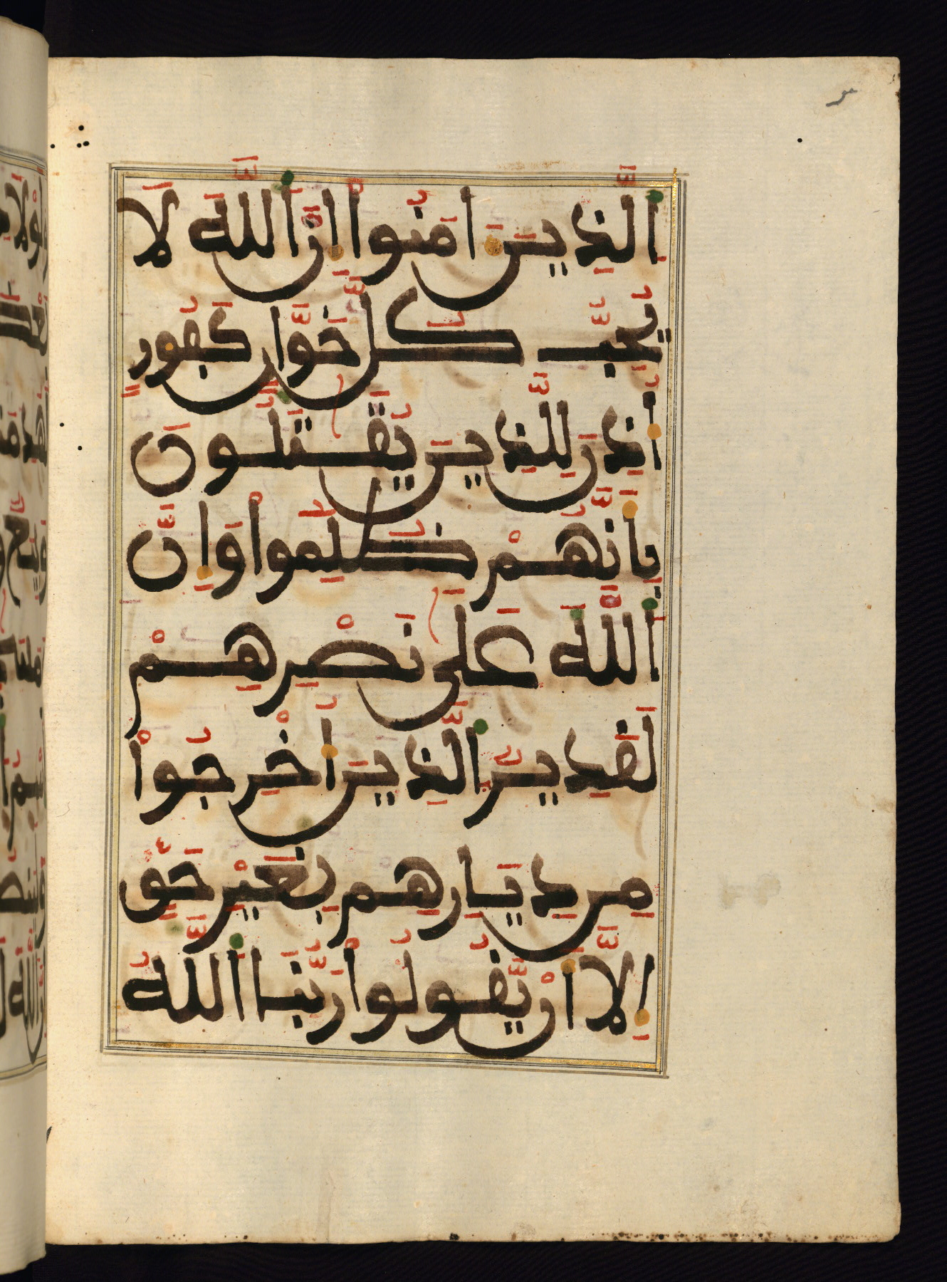 This manuscript is a fragment of the Qur'an, consisting of chapters 19 (Sūrat Maryam) through 23 (Sūrat al-muʾminūn). It was produced in the Maghreb and dates to the twelfth century AH / eighteenth CE. The text is written in a large Maghribī script, with vocalization in red, green, and yellow ink on Italian paper. The codex opens with an illuminated chapter heading for chapter 19 (Sūrat Maryam) written in the New Abbasid (broken cursive) style (fol. 1b) in gold ink within a decorative headpiece. The titles of other chapters are written in the New Abbasid (broken cursive) style in gold ink (fols. 21a, 47b, 70a, and 102a) with a marginal medallion. The blind-tooled goatskin binding is not contemporary with the manuscript and probably dates to the thirteenth century AH / nineteenth CE.
