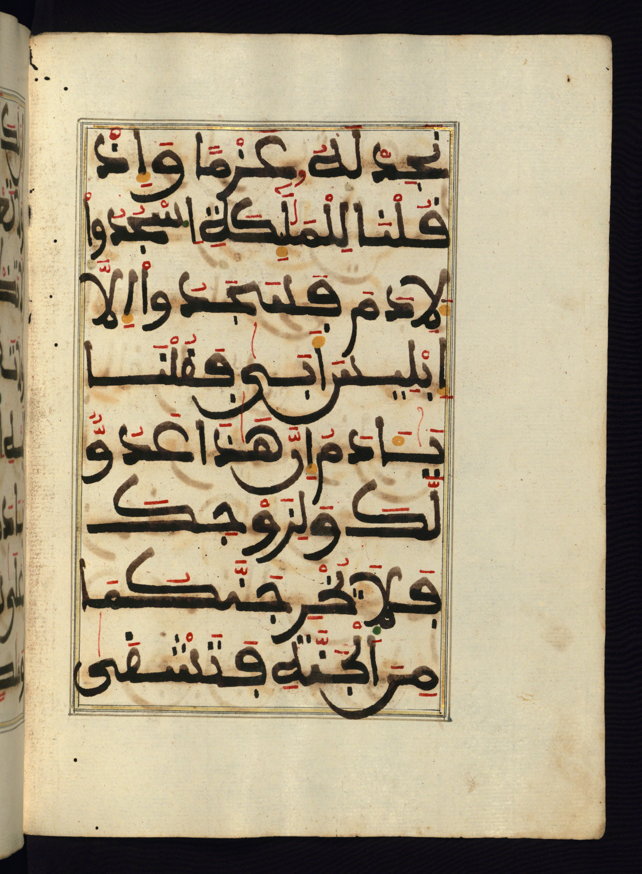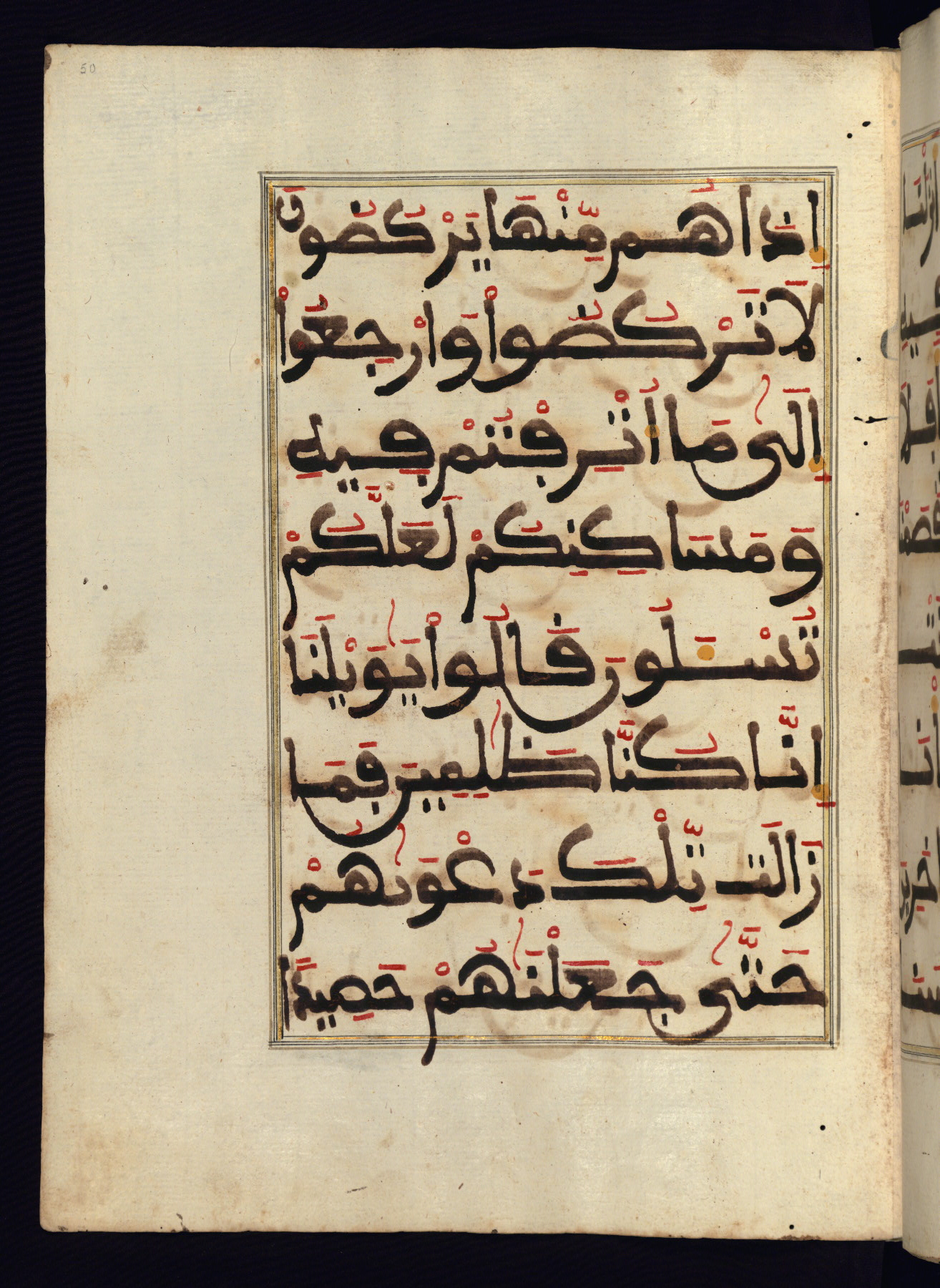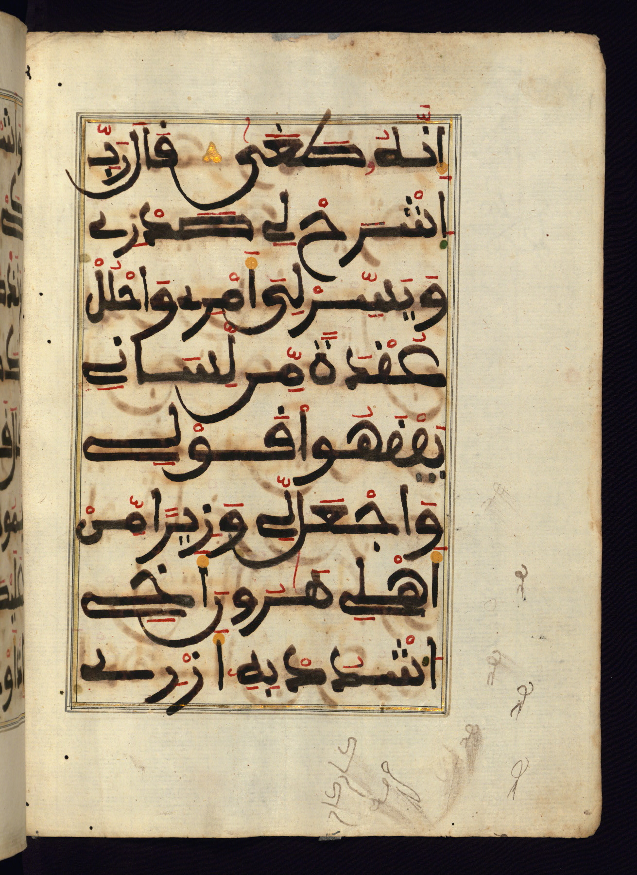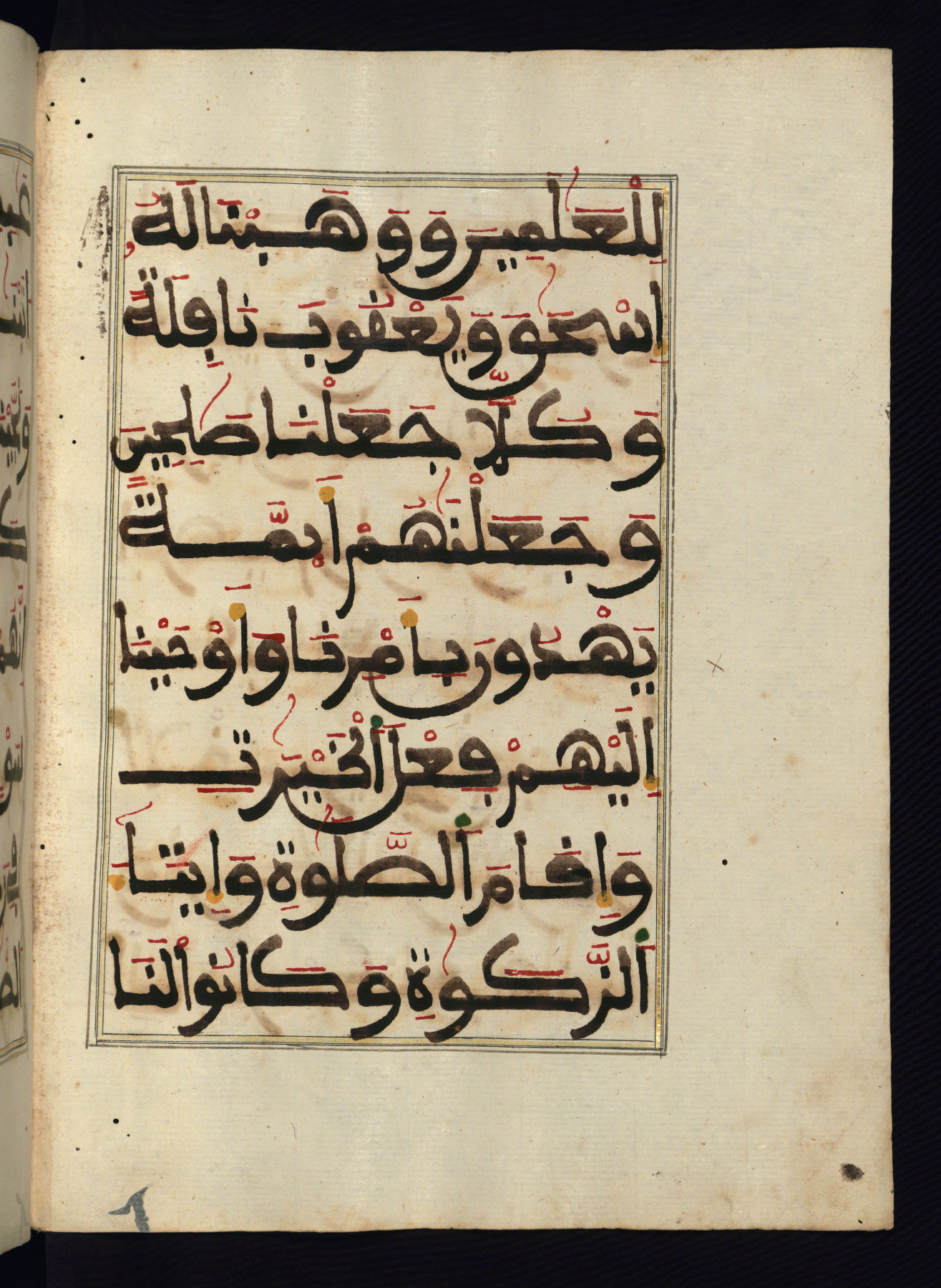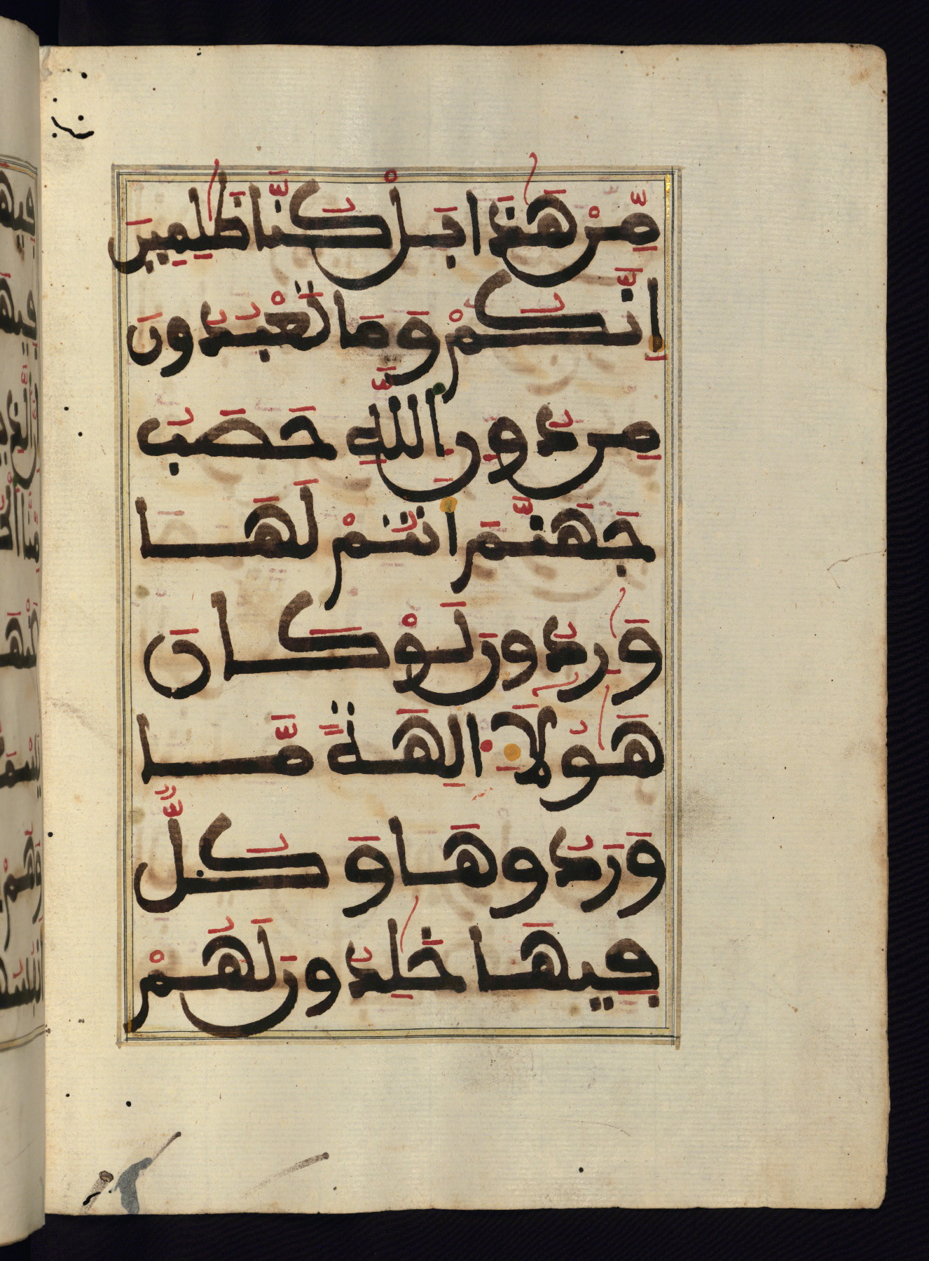 This manuscript is a fragment of the Qur'an, consisting of chapters 19 (Sūrat Maryam) through 23 (Sūrat al-muʾminūn). It was produced in the Maghreb and dates to the twelfth century AH / eighteenth CE. The text is written in a large Maghribī script, with vocalization in red, green, and yellow ink on Italian paper. The codex opens with an illuminated chapter heading for chapter 19 (Sūrat Maryam) written in the New Abbasid (broken cursive) style (fol. 1b) in gold ink within a decorative headpiece. The titles of other chapters are written in the New Abbasid (broken cursive) style in gold ink (fols. 21a, 47b, 70a, and 102a) with a marginal medallion. The blind-tooled goatskin binding is not contemporary with the manuscript and probably dates to the thirteenth century AH / nineteenth CE.