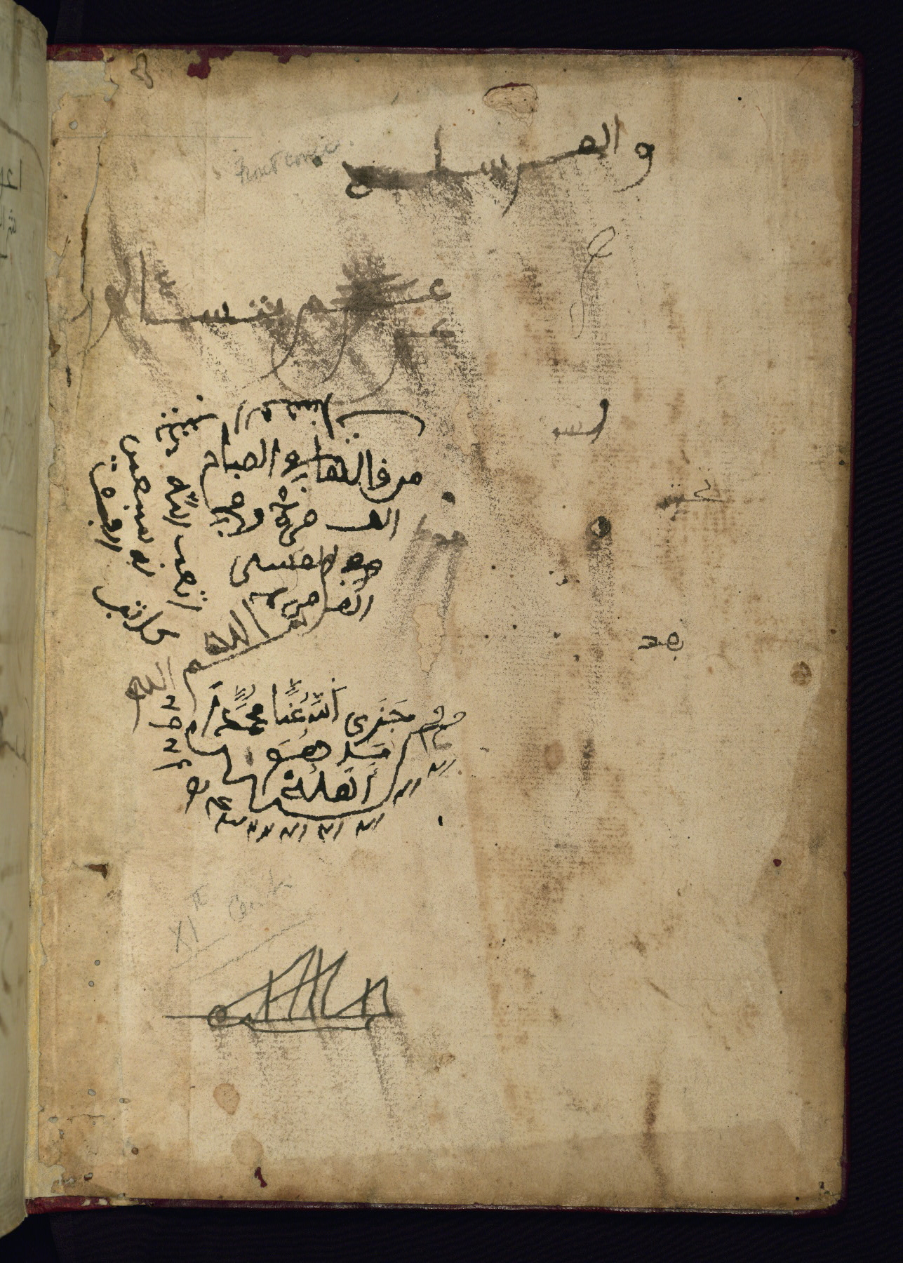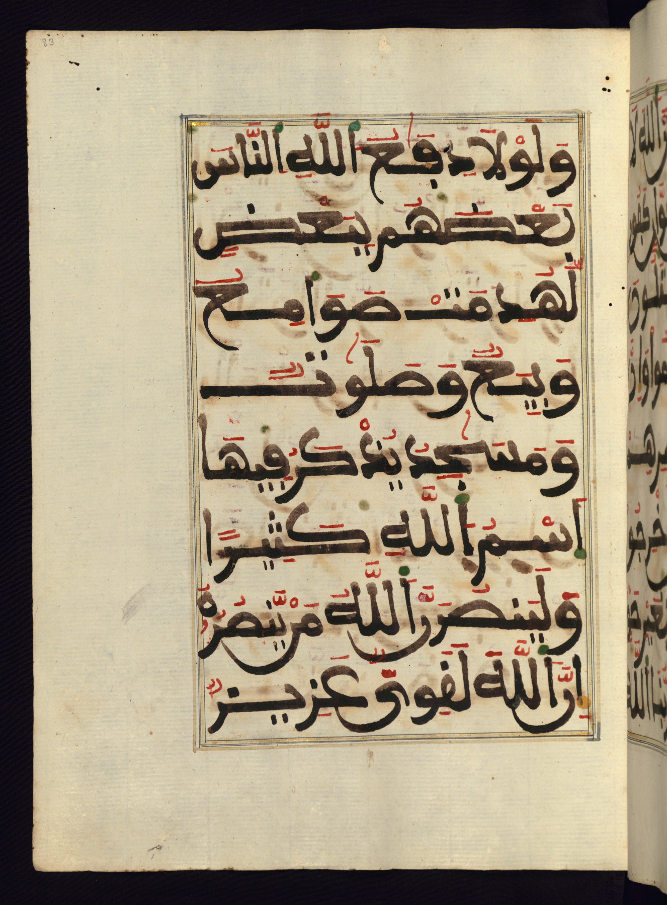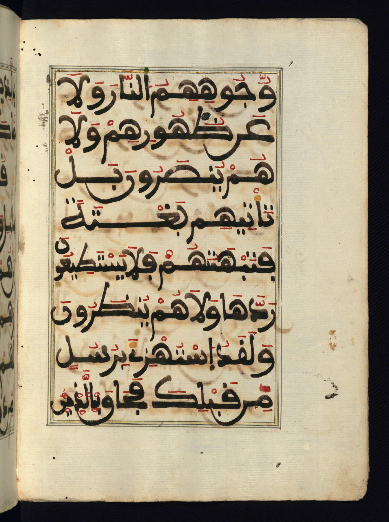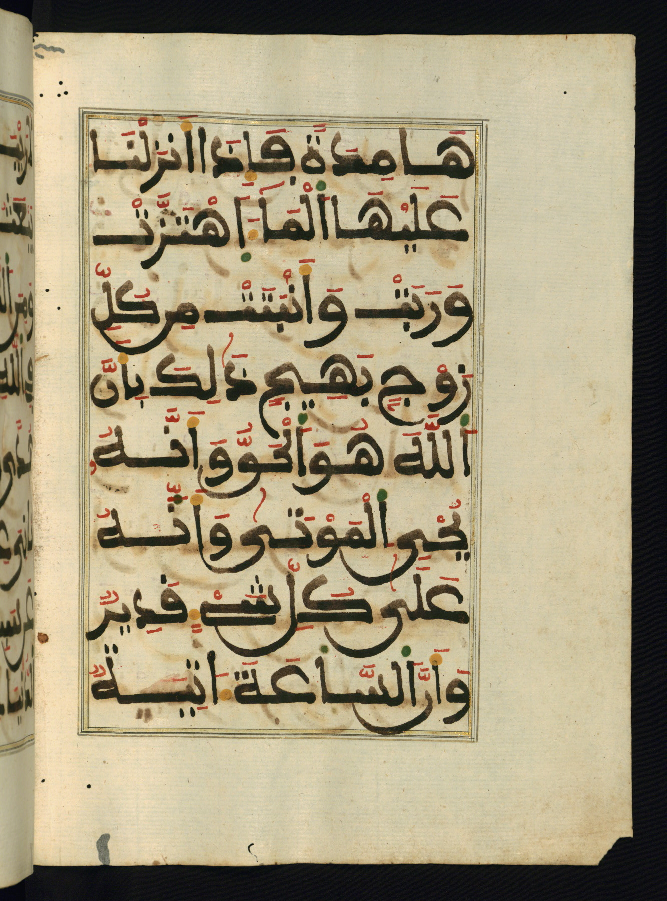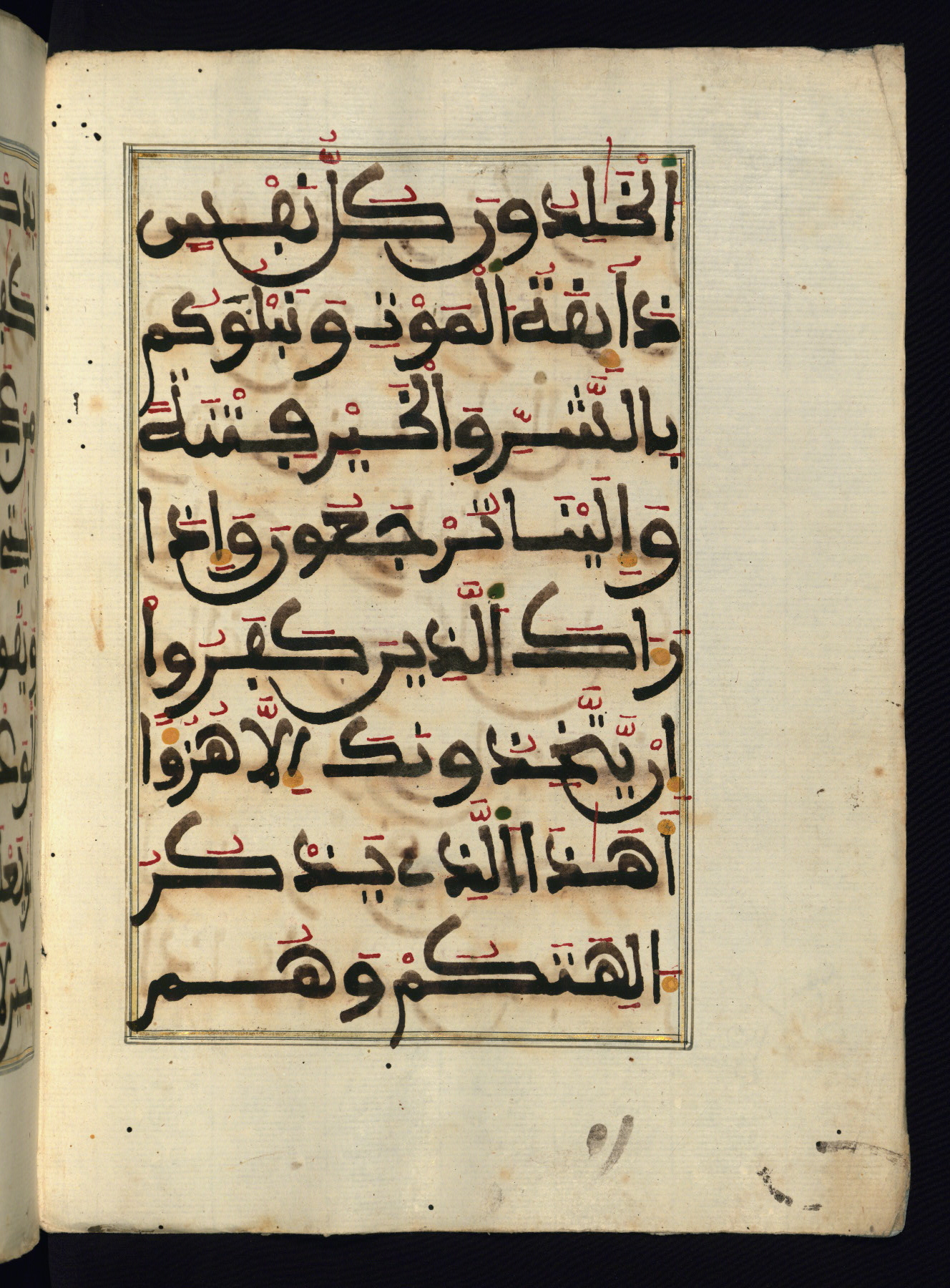 This manuscript is a fragment of the Qur'an, consisting of chapters 19 (Sūrat Maryam) through 23 (Sūrat al-muʾminūn). It was produced in the Maghreb and dates to the twelfth century AH / eighteenth CE. The text is written in a large Maghribī script, with vocalization in red, green, and yellow ink on Italian paper. The codex opens with an illuminated chapter heading for chapter 19 (Sūrat Maryam) written in the New Abbasid (broken cursive) style (fol. 1b) in gold ink within a decorative headpiece. The titles of other chapters are written in the New Abbasid (broken cursive) style in gold ink (fols. 21a, 47b, 70a, and 102a) with a marginal medallion. The blind-tooled goatskin binding is not contemporary with the manuscript and probably dates to the thirteenth century AH / nineteenth CE.