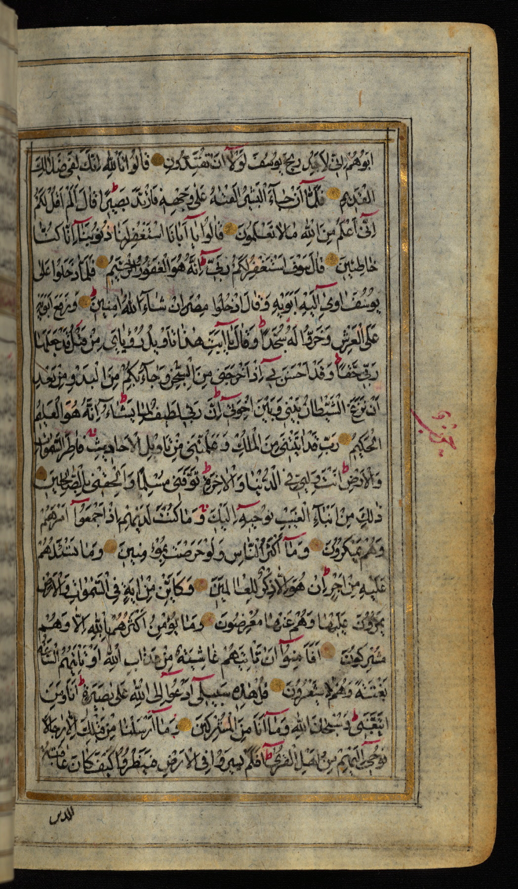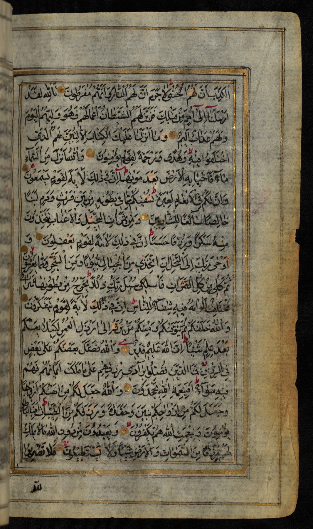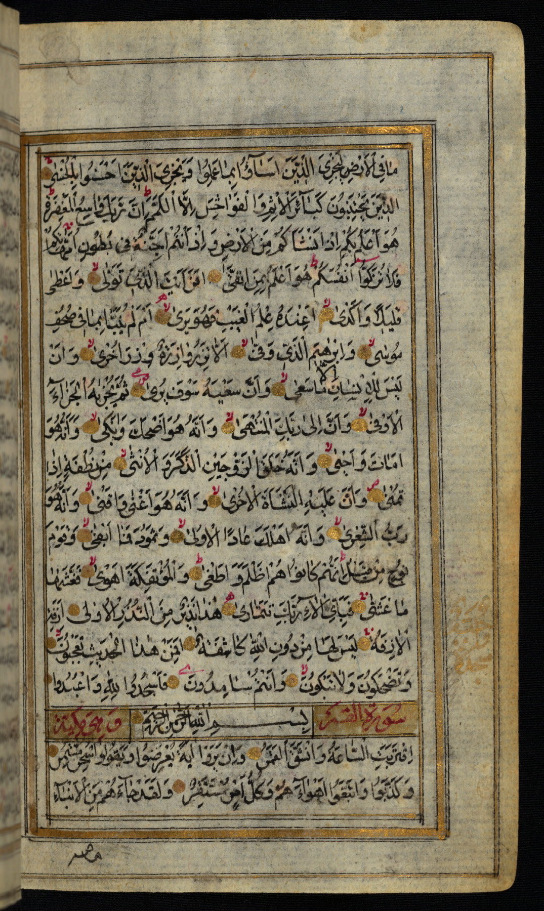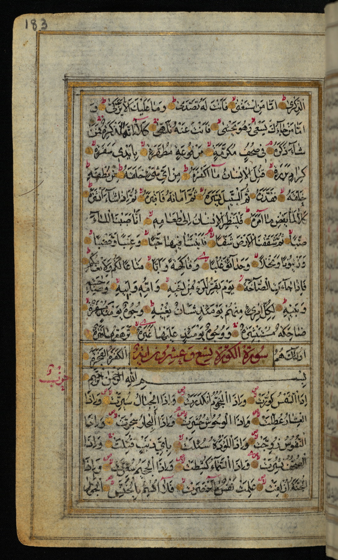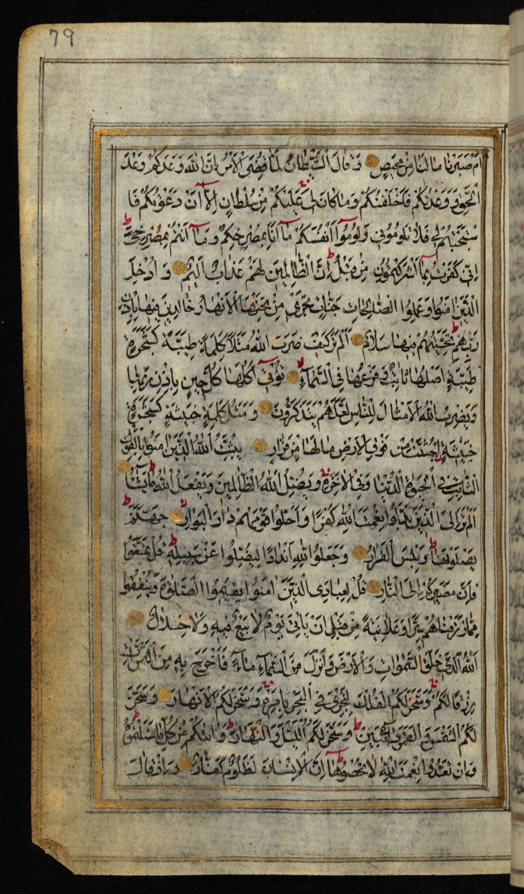 This small copy of the Qur'an was penned by an anonymous scribe in Iran in the thirteenth century AH / nineteenth century CE.