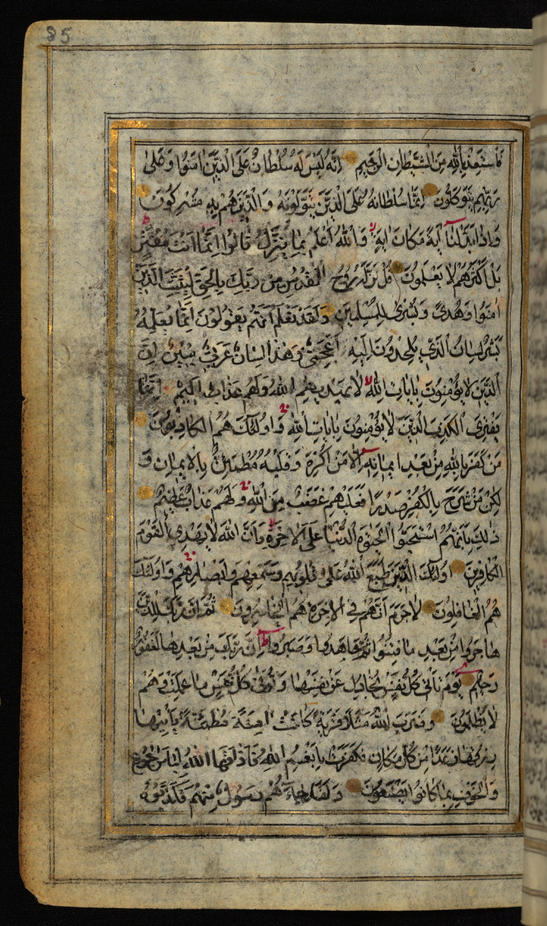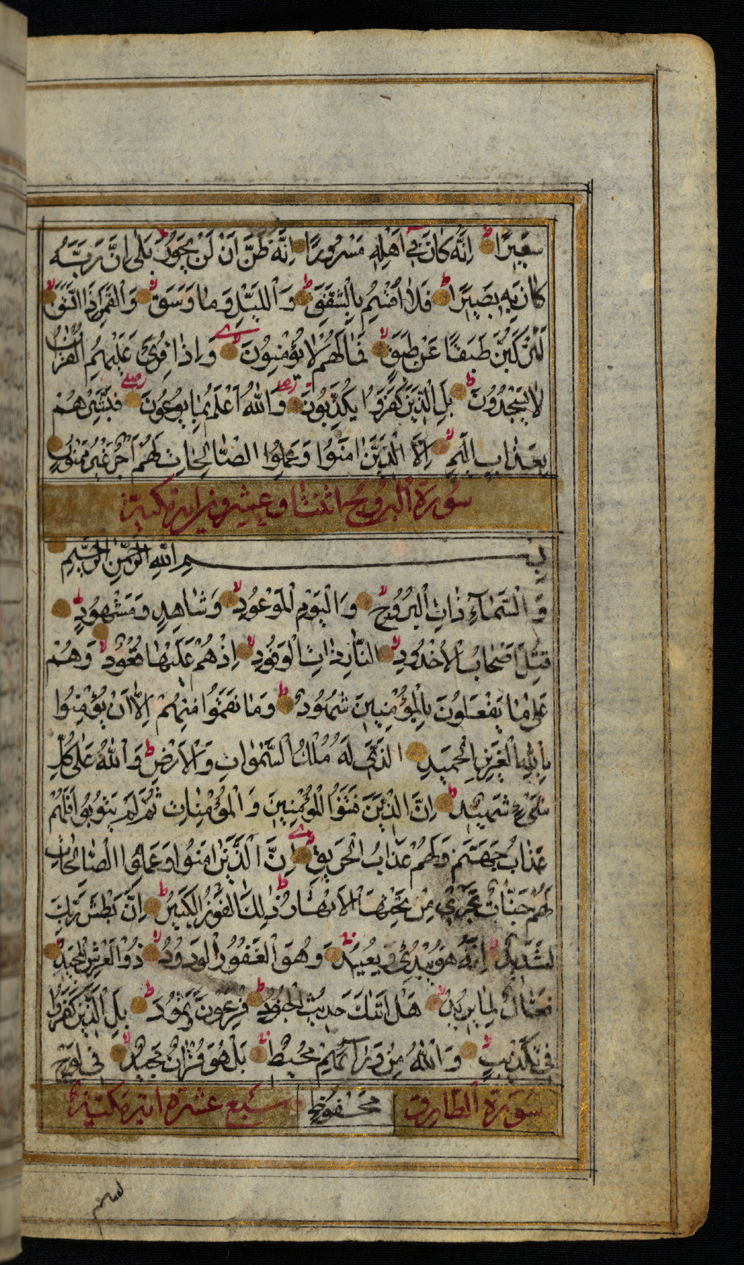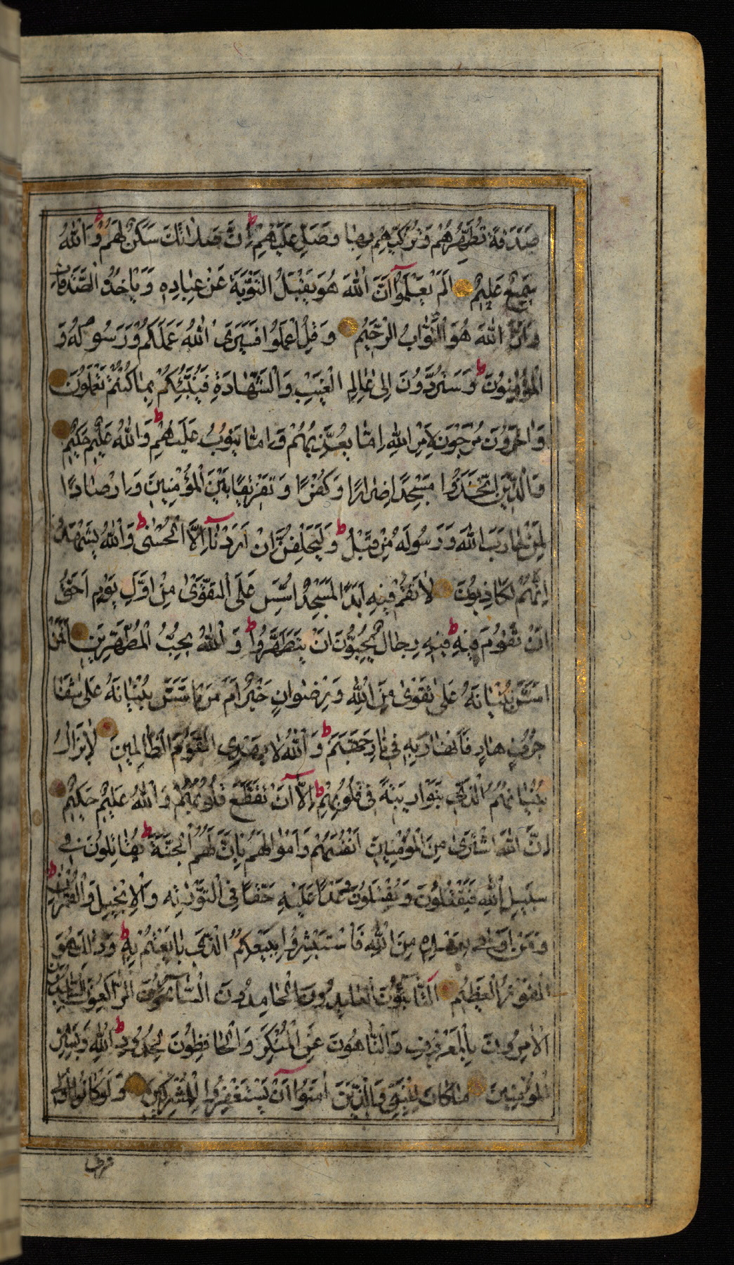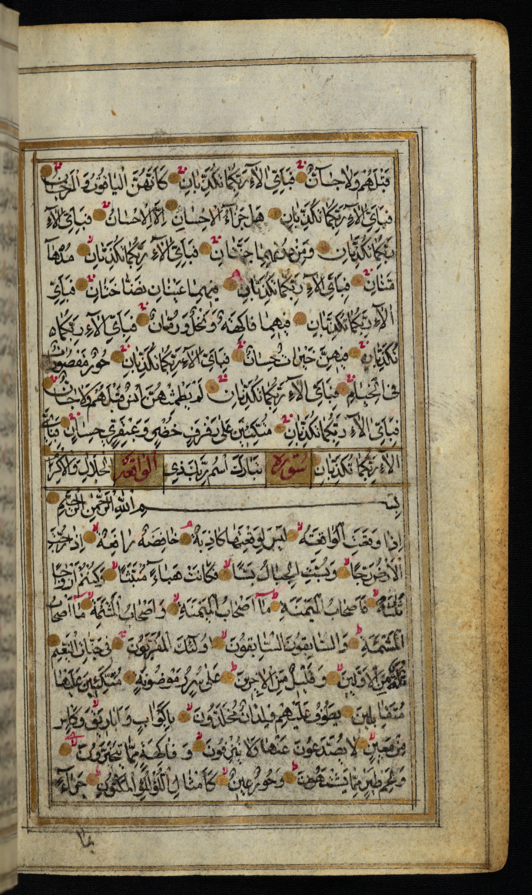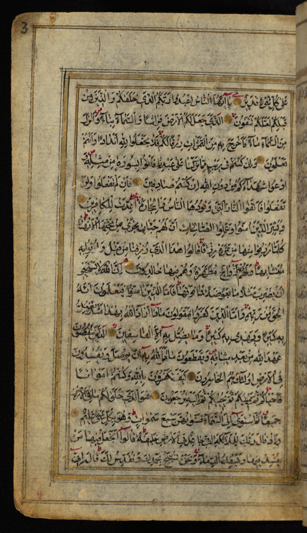 This small copy of the Qur'an was penned by an anonymous scribe in Iran in the thirteenth century AH / nineteenth century CE.