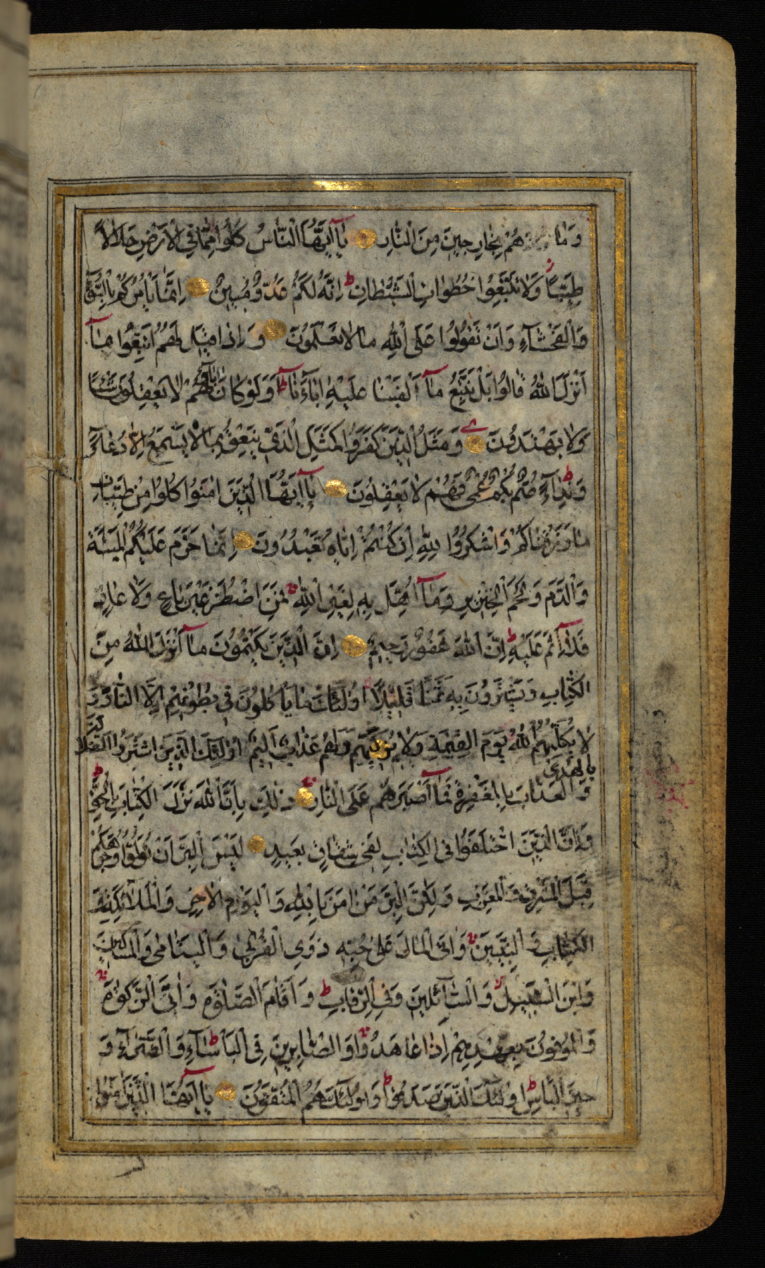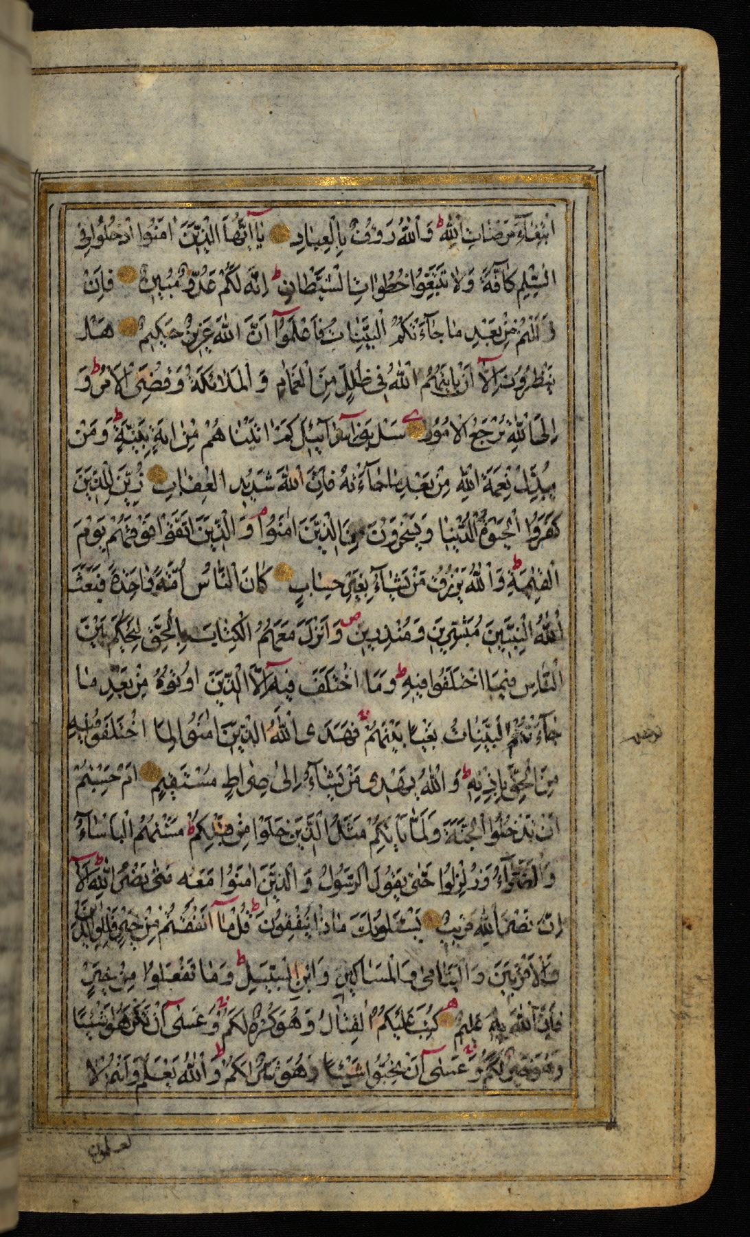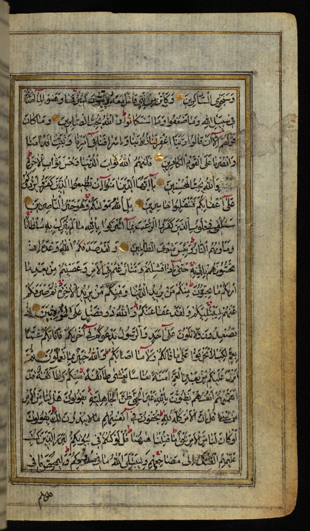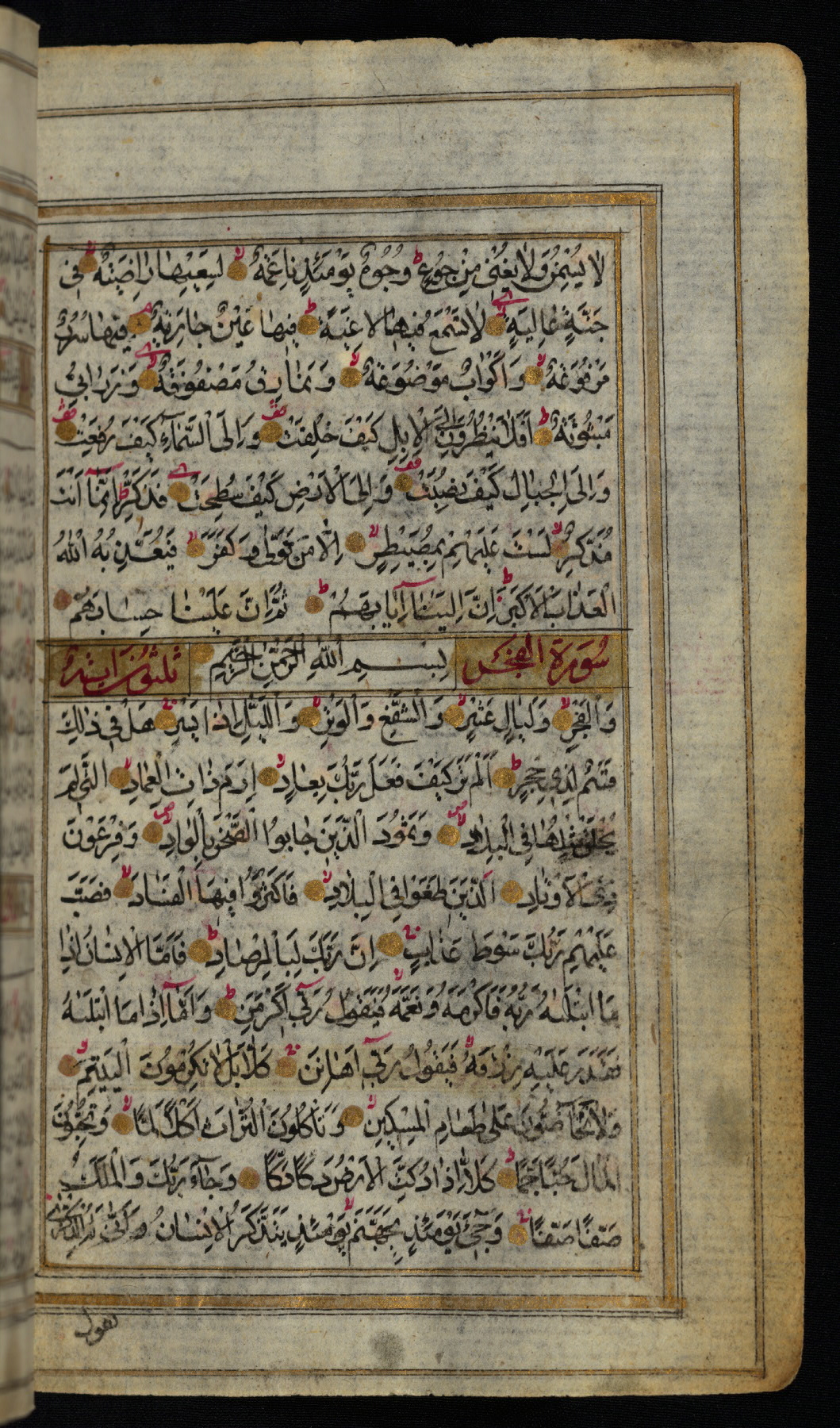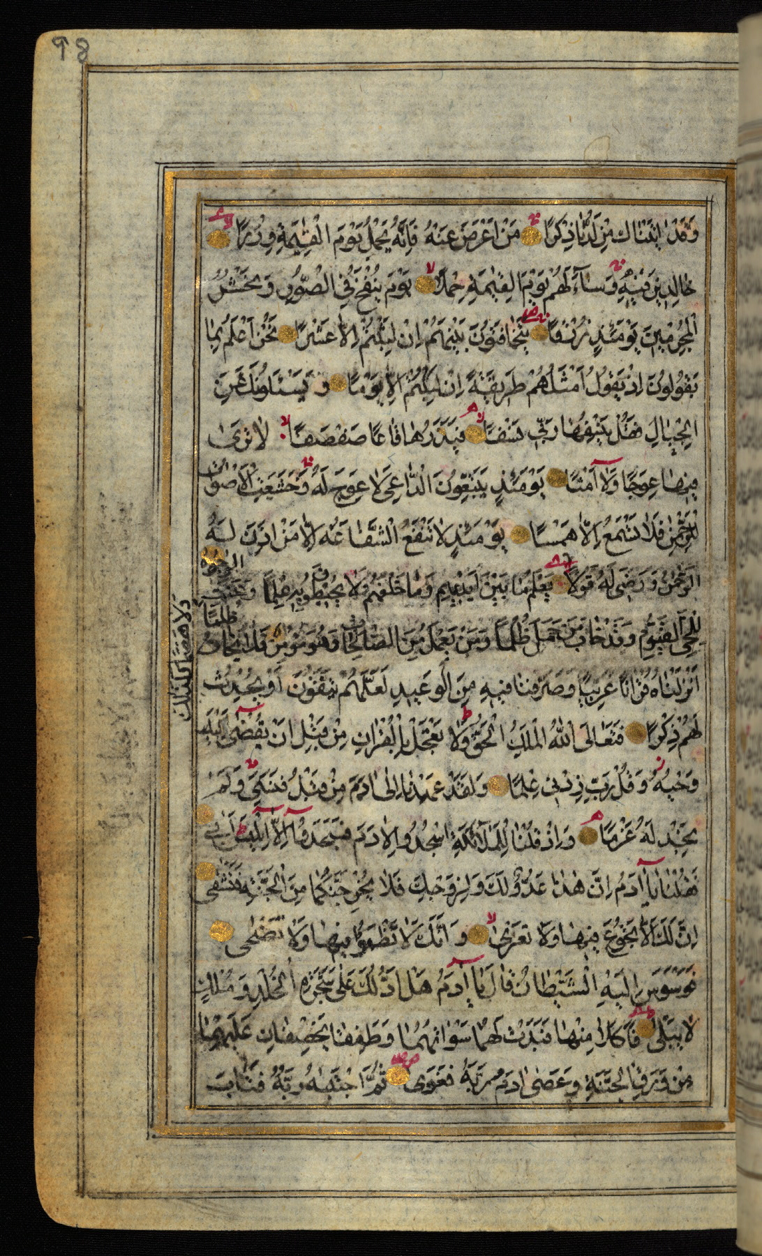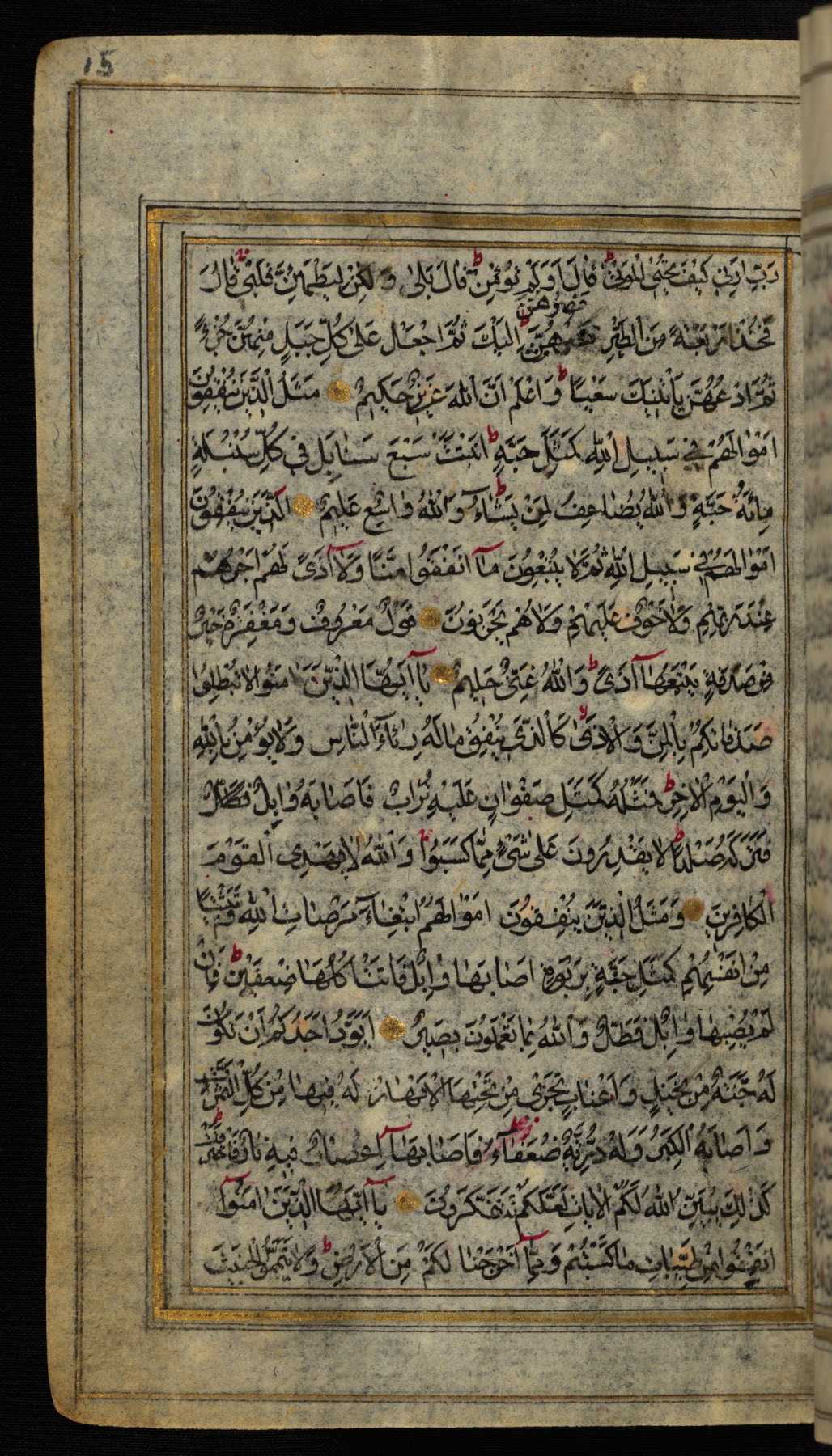 This small copy of the Qur'an was penned by an anonymous scribe in Iran in the thirteenth century AH / nineteenth century CE.