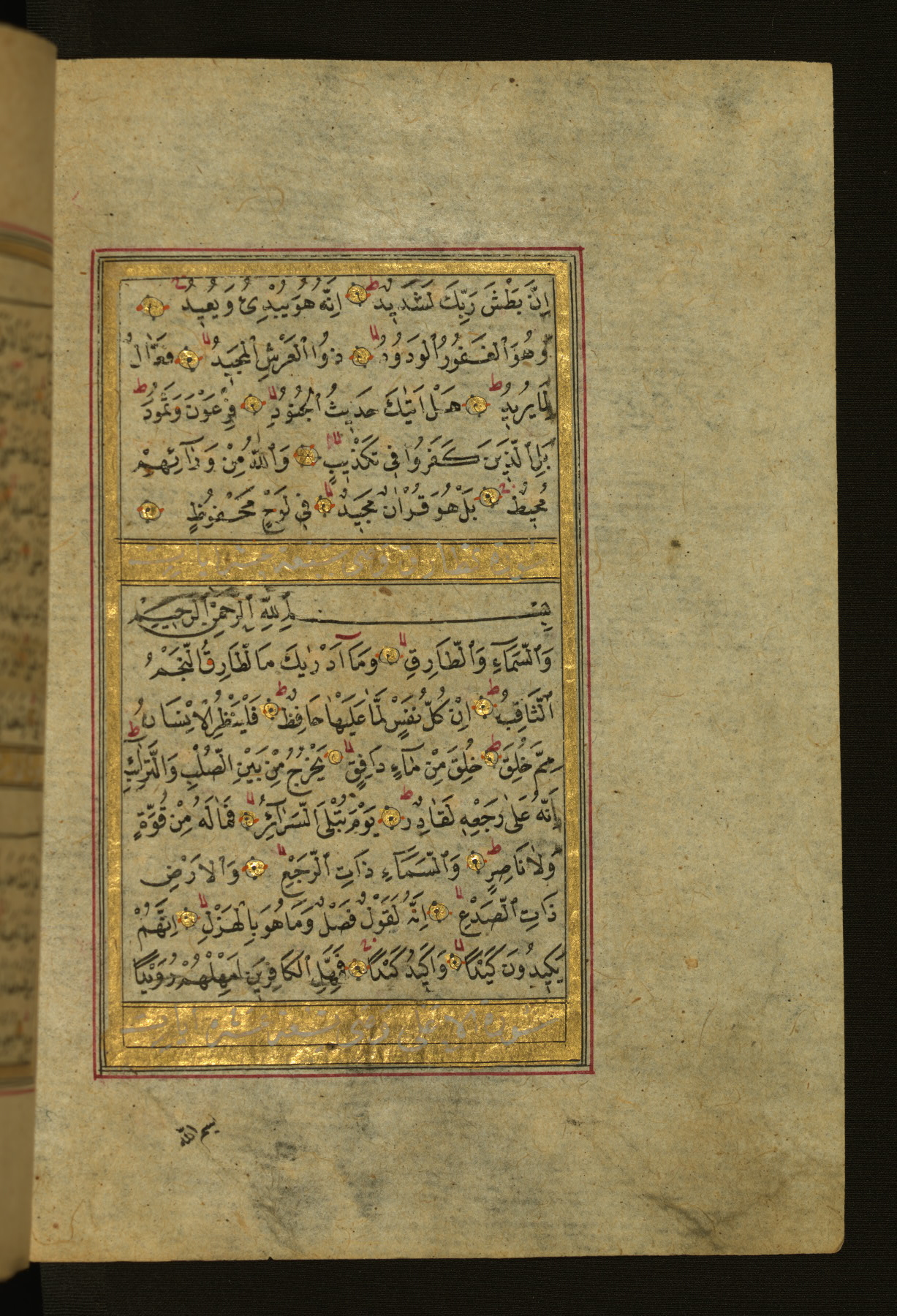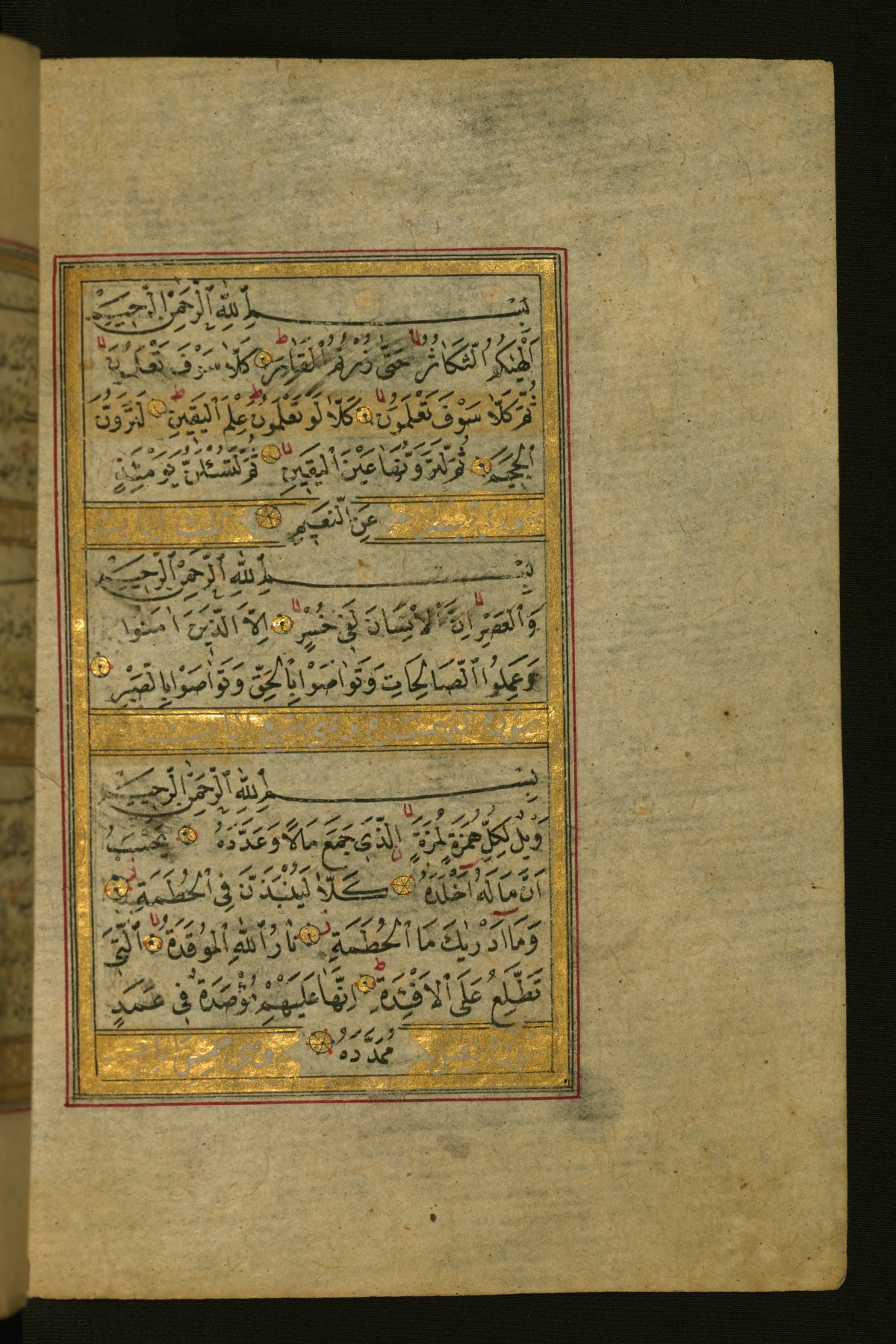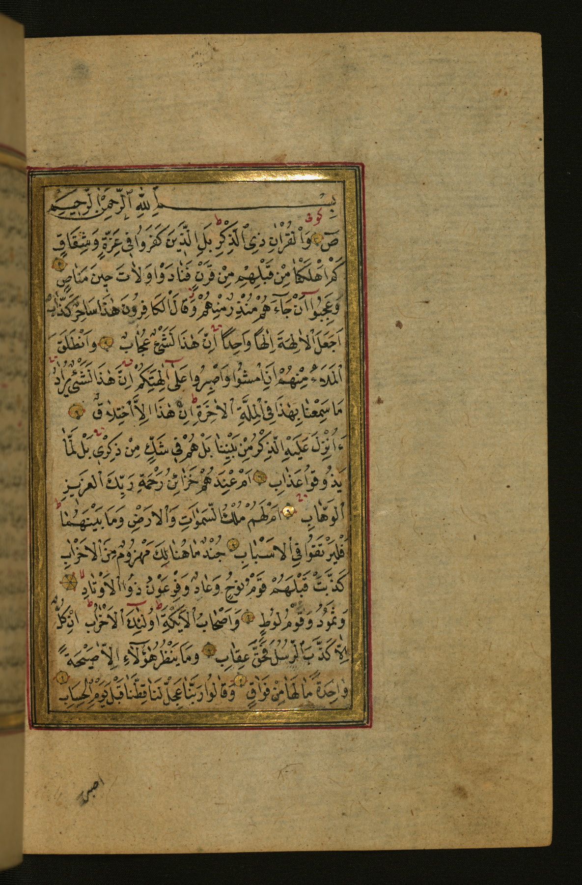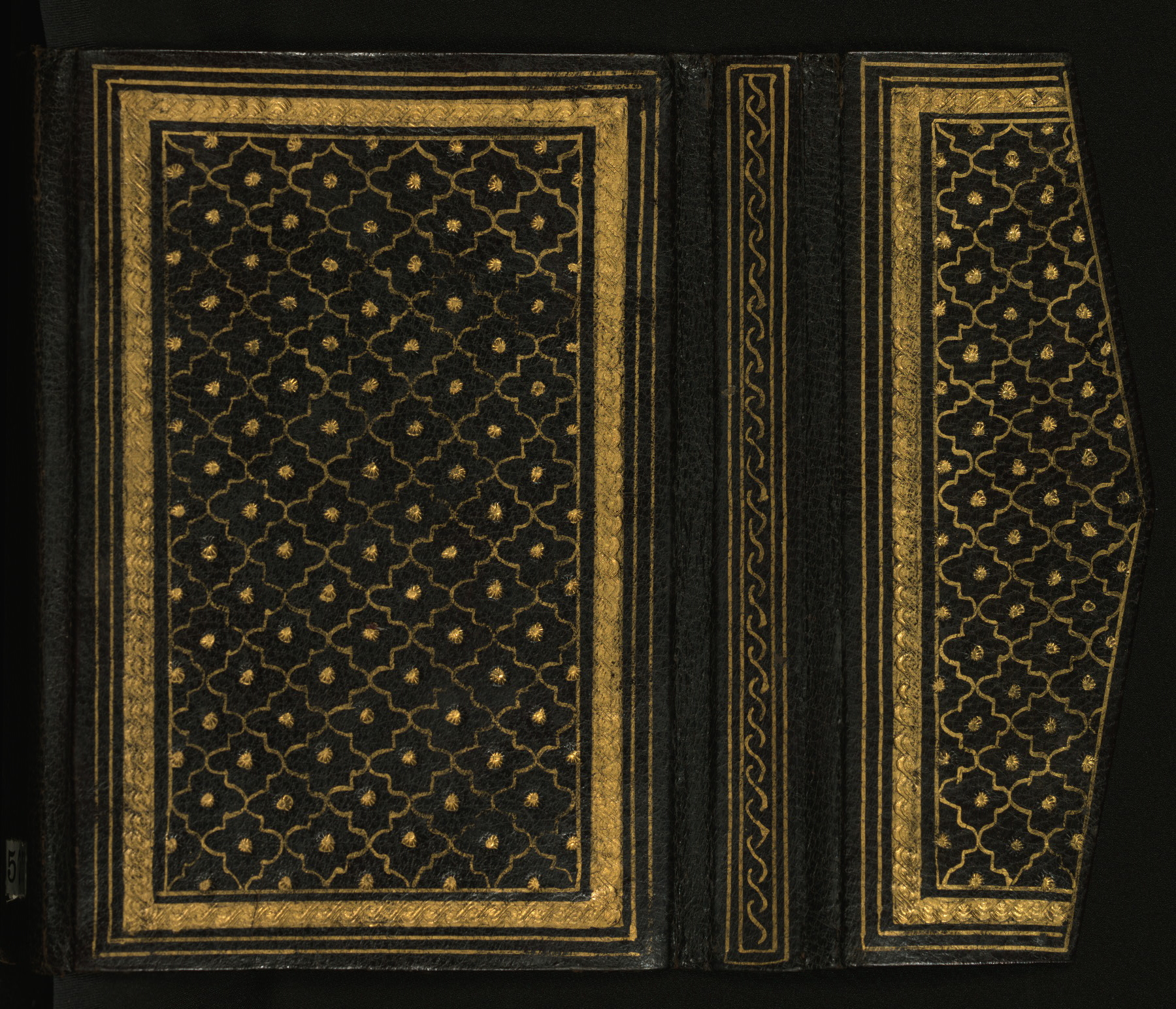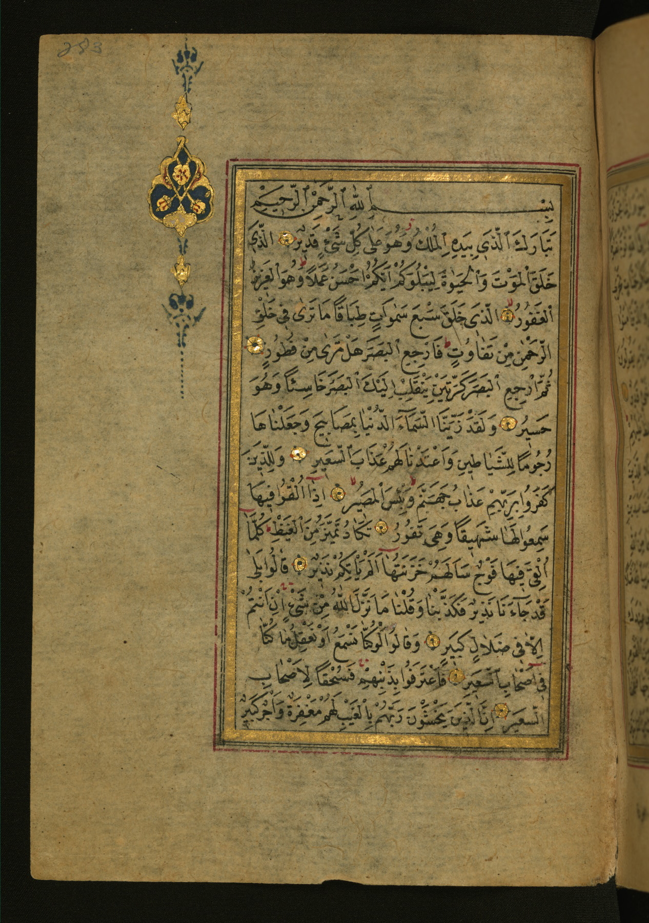 This small, illuminated single-volume copy of the Qurʾan was produced in Ottoman Turkey in 1282 AH / 1865-6 CE by Muḥammad ibn Muṣṭafá Izmīrī, a pupil of al-Rudūsī. The colophon in ijāzah script indicates that the present codex is the twenty-first copy executed by him (fol. 304b). The manuscript opens with an illuminated double-page incipit with the verses of chapters 1 (Sūrat al-fātiḥah) and 2 (Sūrat al-baqarah) (fols. 1b-2a). The text is written in naskh script in black ink with reading marks in red. Verses are separated by illuminated discs with colored dots and chapter headings are in riqāʿ script in white ink. Polychrome medallions in the margins indicate textual divisions and prostration. The binding of black leather is contemporary with the manuscript and decorated with a tooled and gold-painted geometric design enclosed by gold frames on the upper and lower boards.