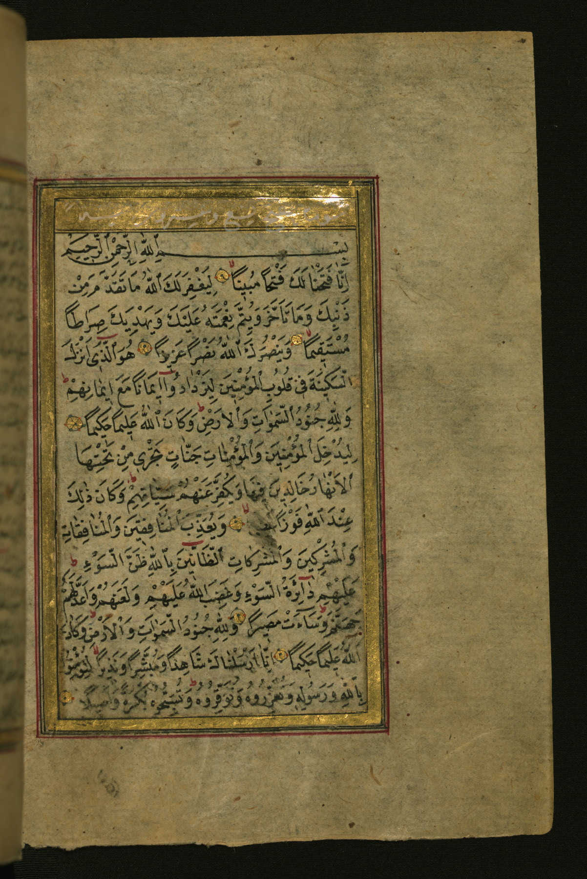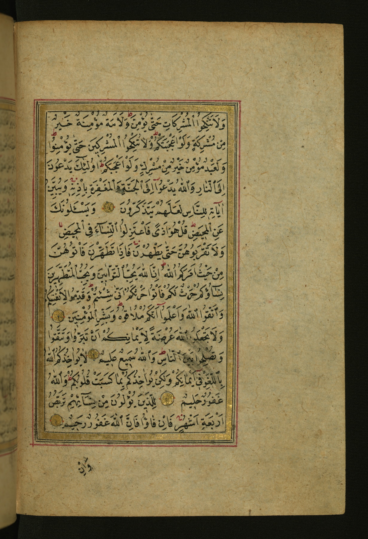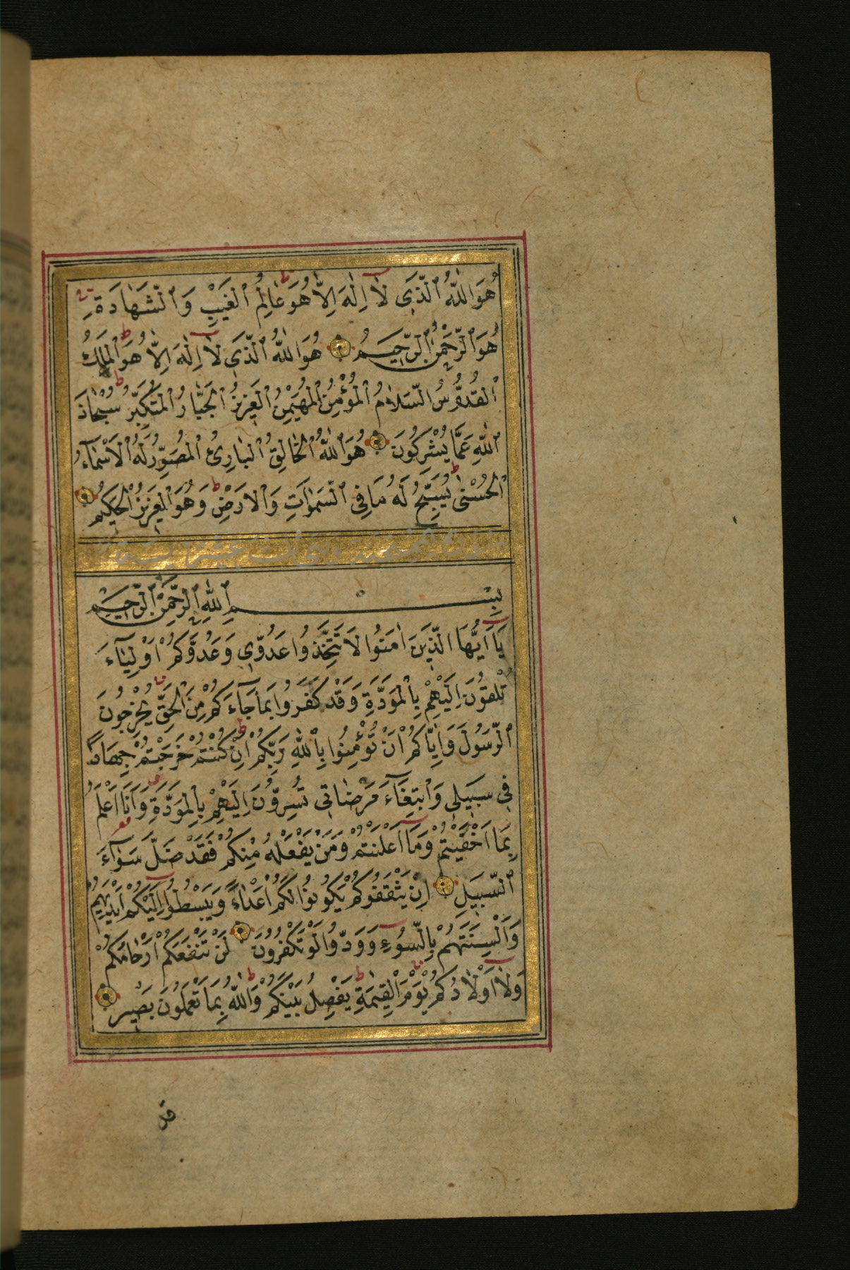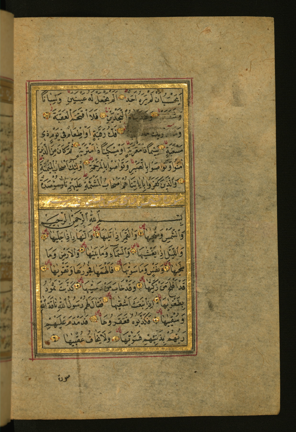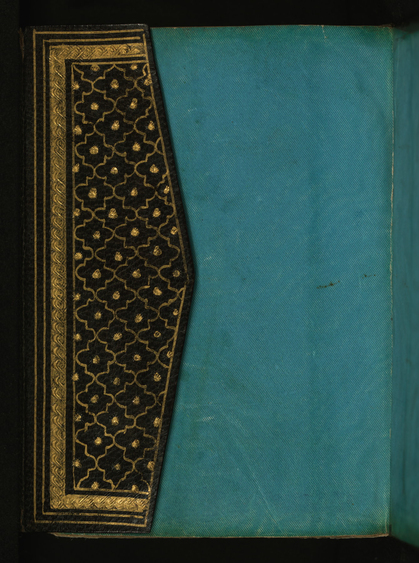 This small, illuminated single-volume copy of the Qurʾan was produced in Ottoman Turkey in 1282 AH / 1865-6 CE by Muḥammad ibn Muṣṭafá Izmīrī, a pupil of al-Rudūsī. The colophon in ijāzah script indicates that the present codex is the twenty-first copy executed by him (fol. 304b). The manuscript opens with an illuminated double-page incipit with the verses of chapters 1 (Sūrat al-fātiḥah) and 2 (Sūrat al-baqarah) (fols. 1b-2a). The text is written in naskh script in black ink with reading marks in red. Verses are separated by illuminated discs with colored dots and chapter headings are in riqāʿ script in white ink. Polychrome medallions in the margins indicate textual divisions and prostration. The binding of black leather is contemporary with the manuscript and decorated with a tooled and gold-painted geometric design enclosed by gold frames on the upper and lower boards.