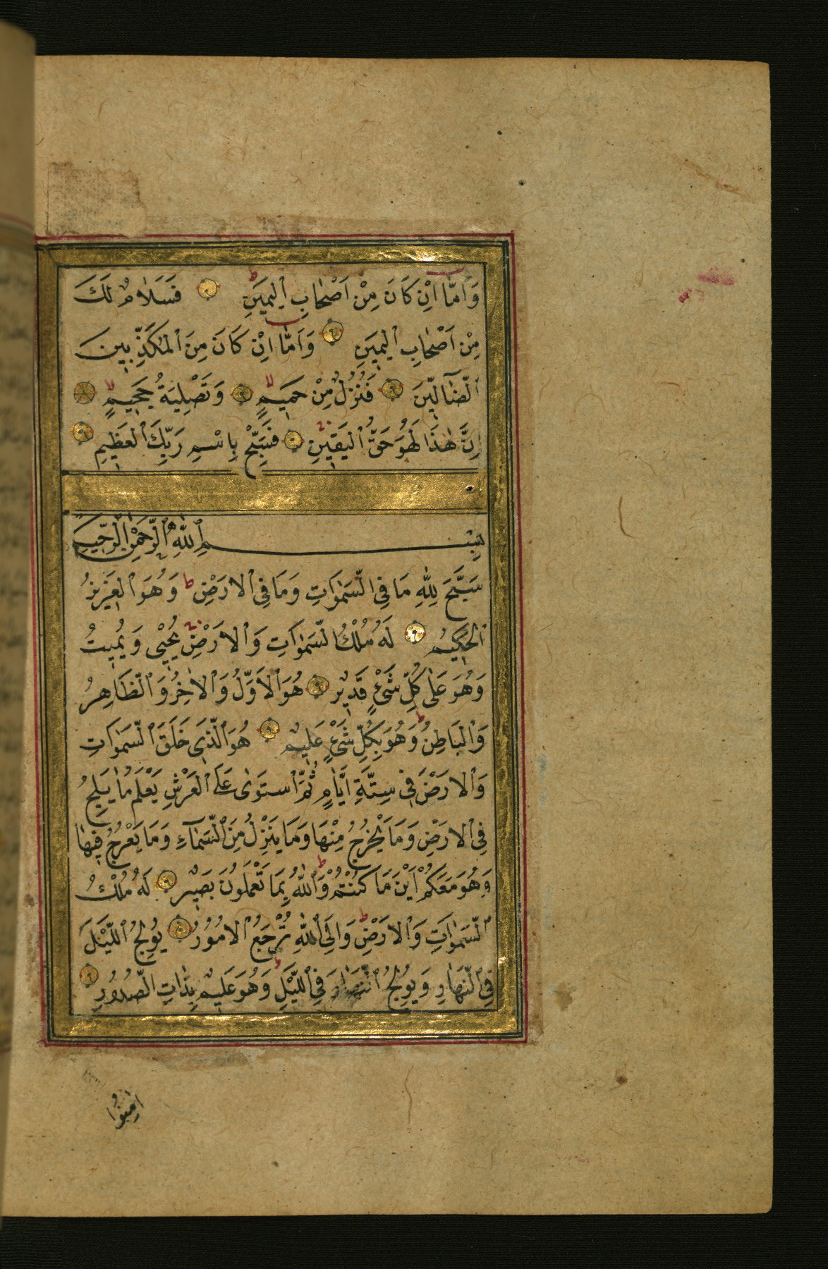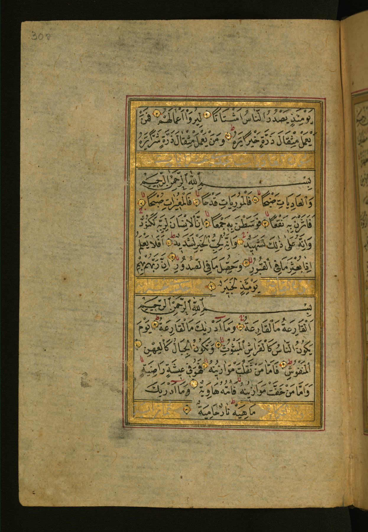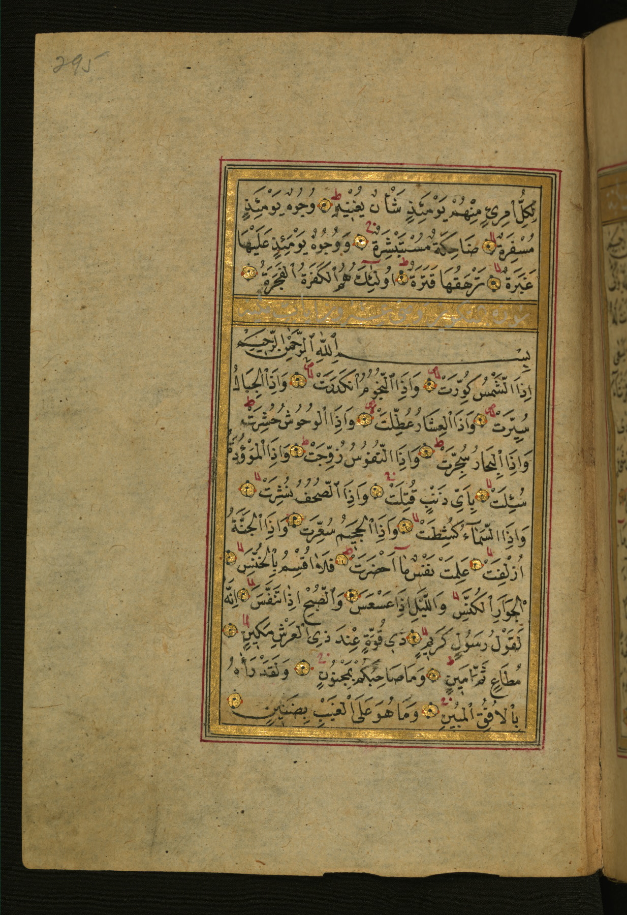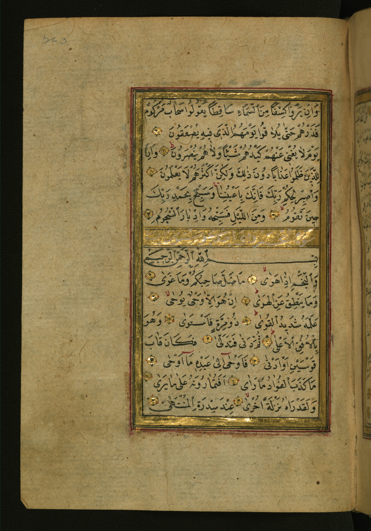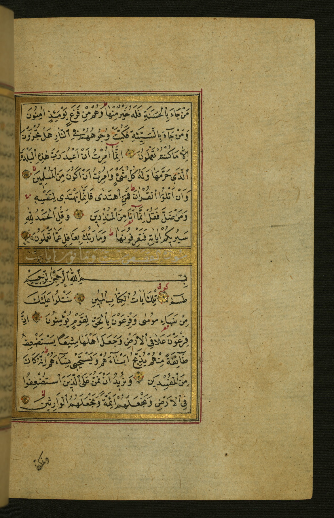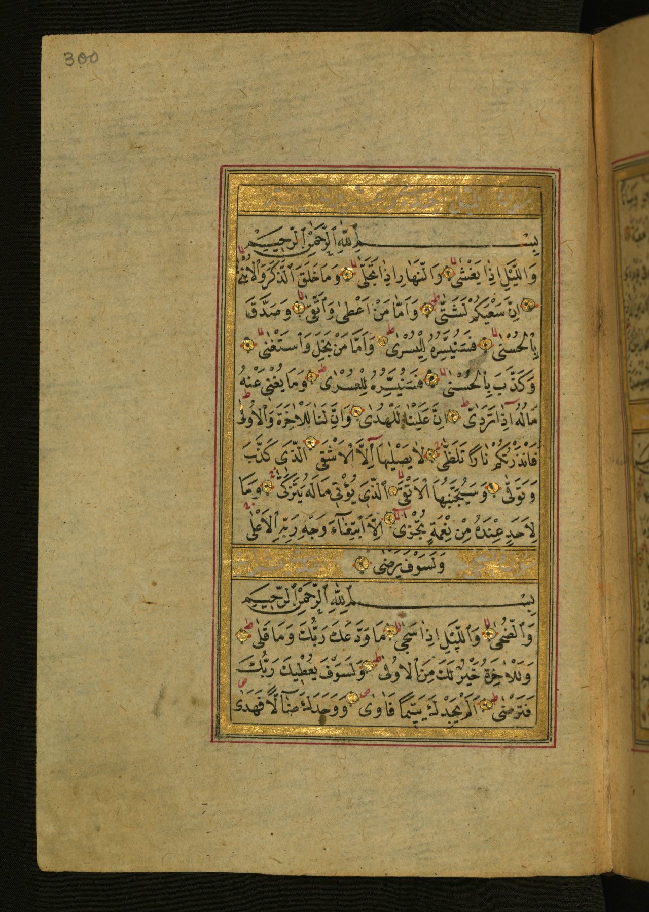 This small, illuminated single-volume copy of the Qurʾan was produced in Ottoman Turkey in 1282 AH / 1865-6 CE by Muḥammad ibn Muṣṭafá Izmīrī, a pupil of al-Rudūsī. The colophon in ijāzah script indicates that the present codex is the twenty-first copy executed by him (fol. 304b). The manuscript opens with an illuminated double-page incipit with the verses of chapters 1 (Sūrat al-fātiḥah) and 2 (Sūrat al-baqarah) (fols. 1b-2a). The text is written in naskh script in black ink with reading marks in red. Verses are separated by illuminated discs with colored dots and chapter headings are in riqāʿ script in white ink. Polychrome medallions in the margins indicate textual divisions and prostration. The binding of black leather is contemporary with the manuscript and decorated with a tooled and gold-painted geometric design enclosed by gold frames on the upper and lower boards.