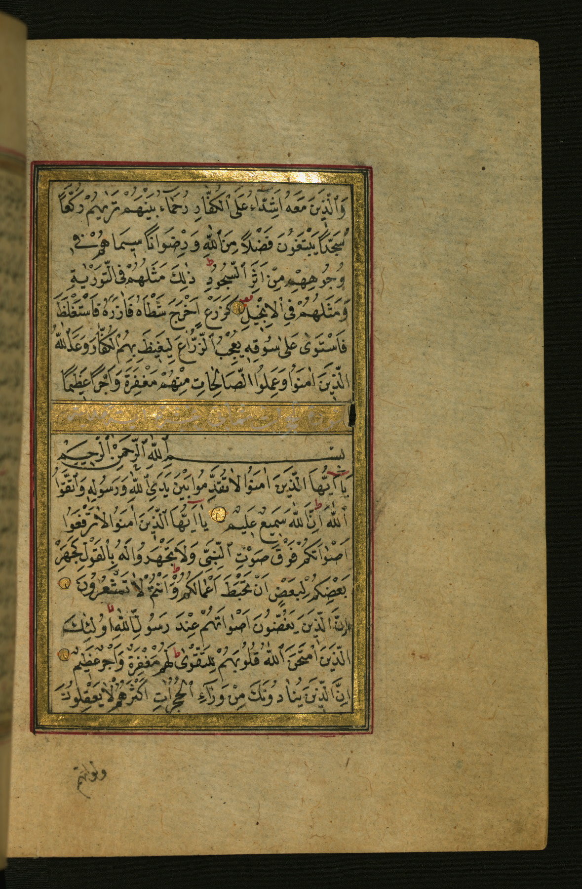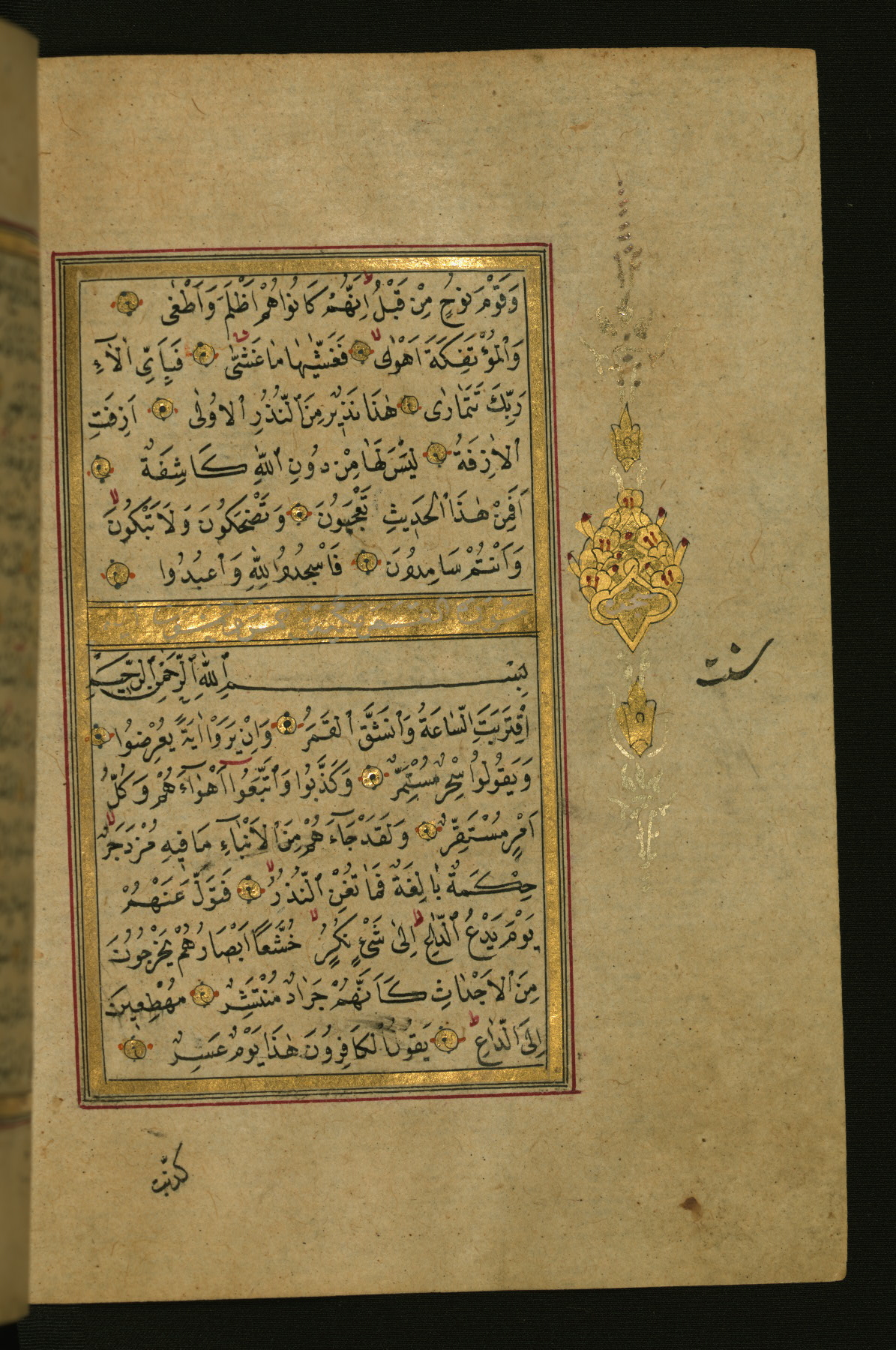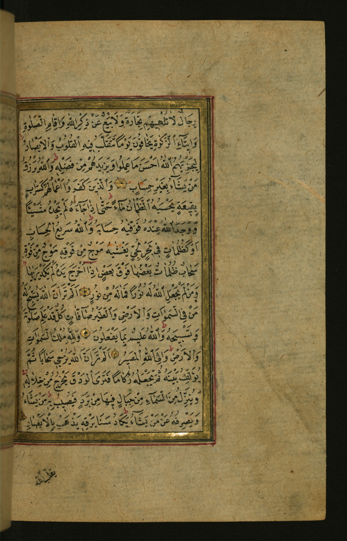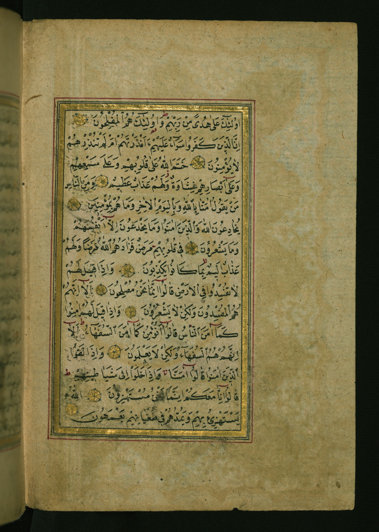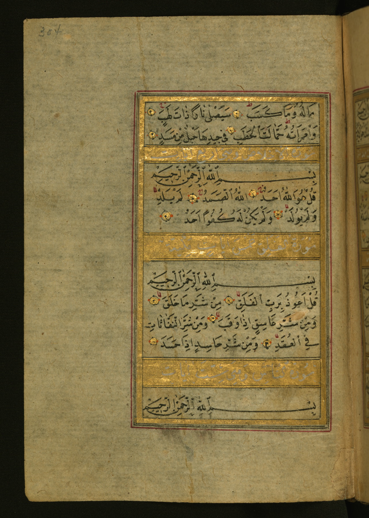 This small, illuminated single-volume copy of the Qurʾan was produced in Ottoman Turkey in 1282 AH / 1865-6 CE by Muḥammad ibn Muṣṭafá Izmīrī, a pupil of al-Rudūsī. The colophon in ijāzah script indicates that the present codex is the twenty-first copy executed by him (fol. 304b). The manuscript opens with an illuminated double-page incipit with the verses of chapters 1 (Sūrat al-fātiḥah) and 2 (Sūrat al-baqarah) (fols. 1b-2a). The text is written in naskh script in black ink with reading marks in red. Verses are separated by illuminated discs with colored dots and chapter headings are in riqāʿ script in white ink. Polychrome medallions in the margins indicate textual divisions and prostration. The binding of black leather is contemporary with the manuscript and decorated with a tooled and gold-painted geometric design enclosed by gold frames on the upper and lower boards.