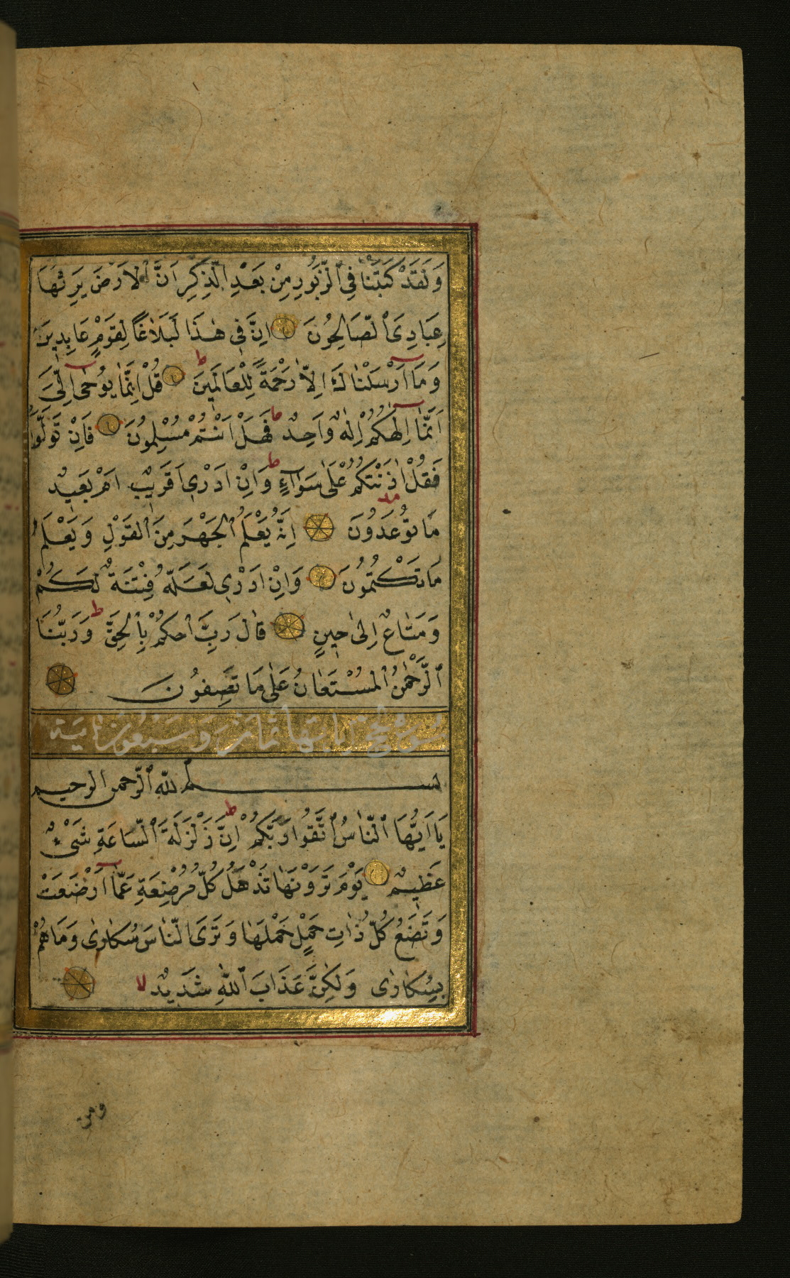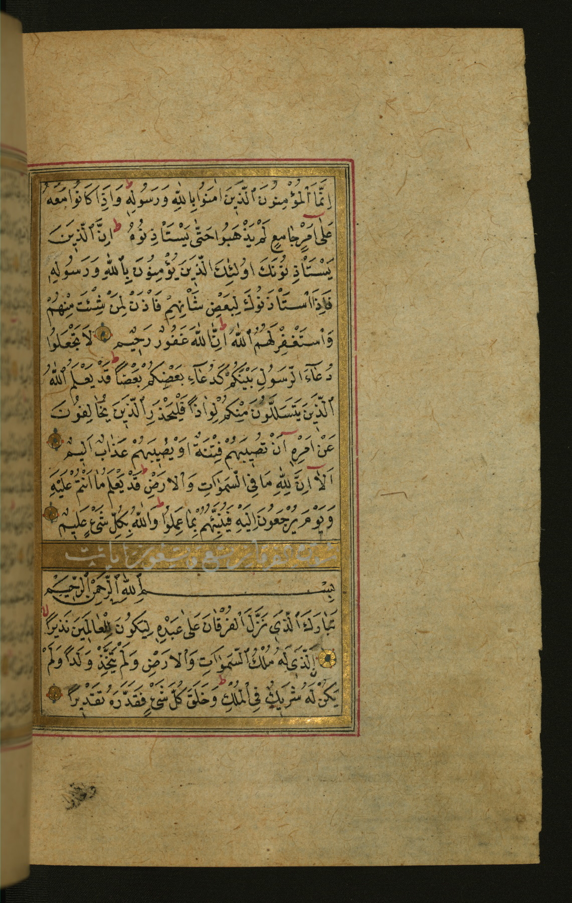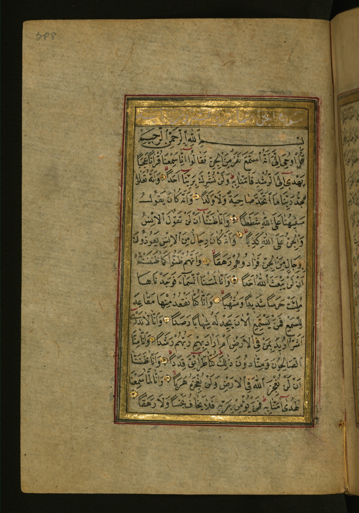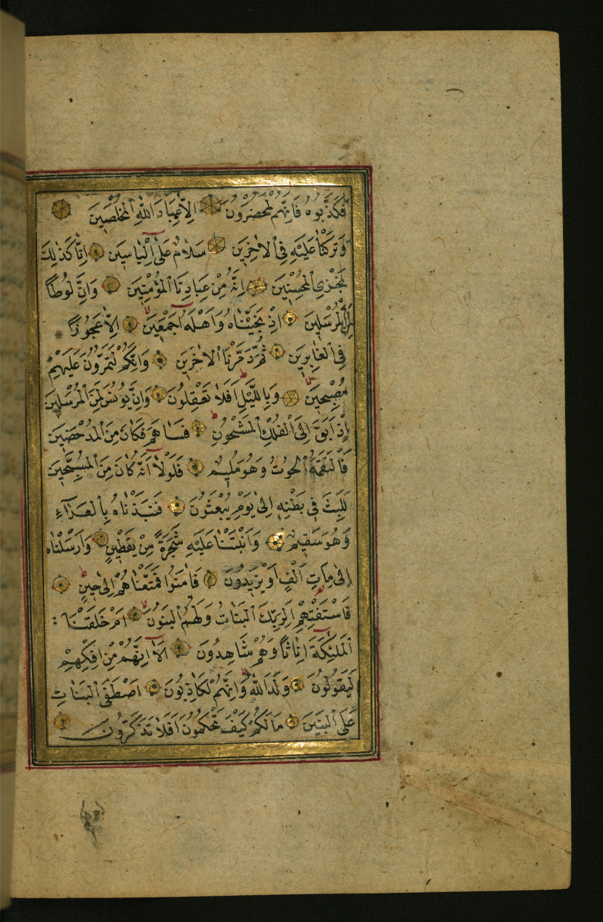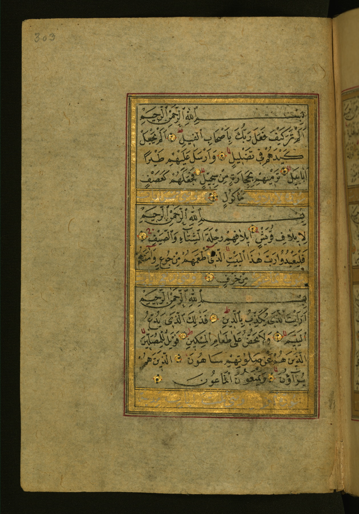 This small, illuminated single-volume copy of the Qurʾan was produced in Ottoman Turkey in 1282 AH / 1865-6 CE by Muḥammad ibn Muṣṭafá Izmīrī, a pupil of al-Rudūsī. The colophon in ijāzah script indicates that the present codex is the twenty-first copy executed by him (fol. 304b). The manuscript opens with an illuminated double-page incipit with the verses of chapters 1 (Sūrat al-fātiḥah) and 2 (Sūrat al-baqarah) (fols. 1b-2a). The text is written in naskh script in black ink with reading marks in red. Verses are separated by illuminated discs with colored dots and chapter headings are in riqāʿ script in white ink. Polychrome medallions in the margins indicate textual divisions and prostration. The binding of black leather is contemporary with the manuscript and decorated with a tooled and gold-painted geometric design enclosed by gold frames on the upper and lower boards.