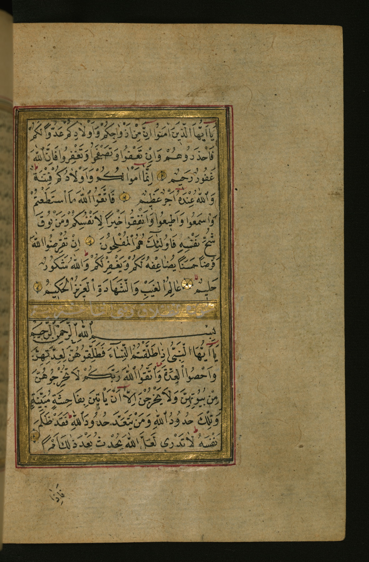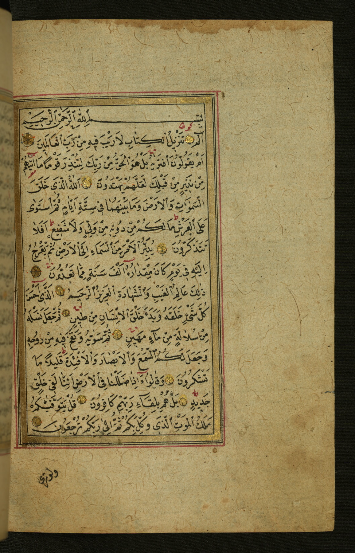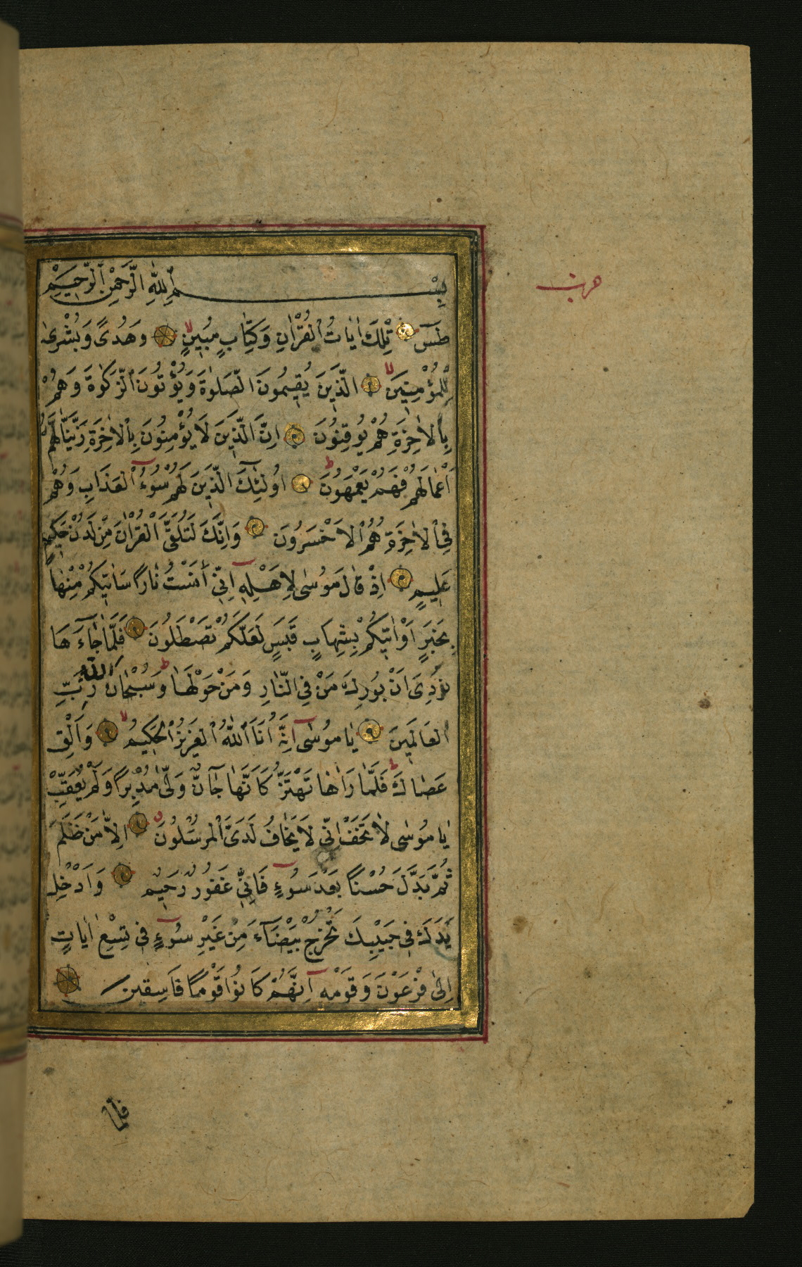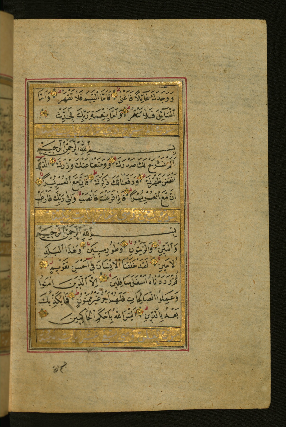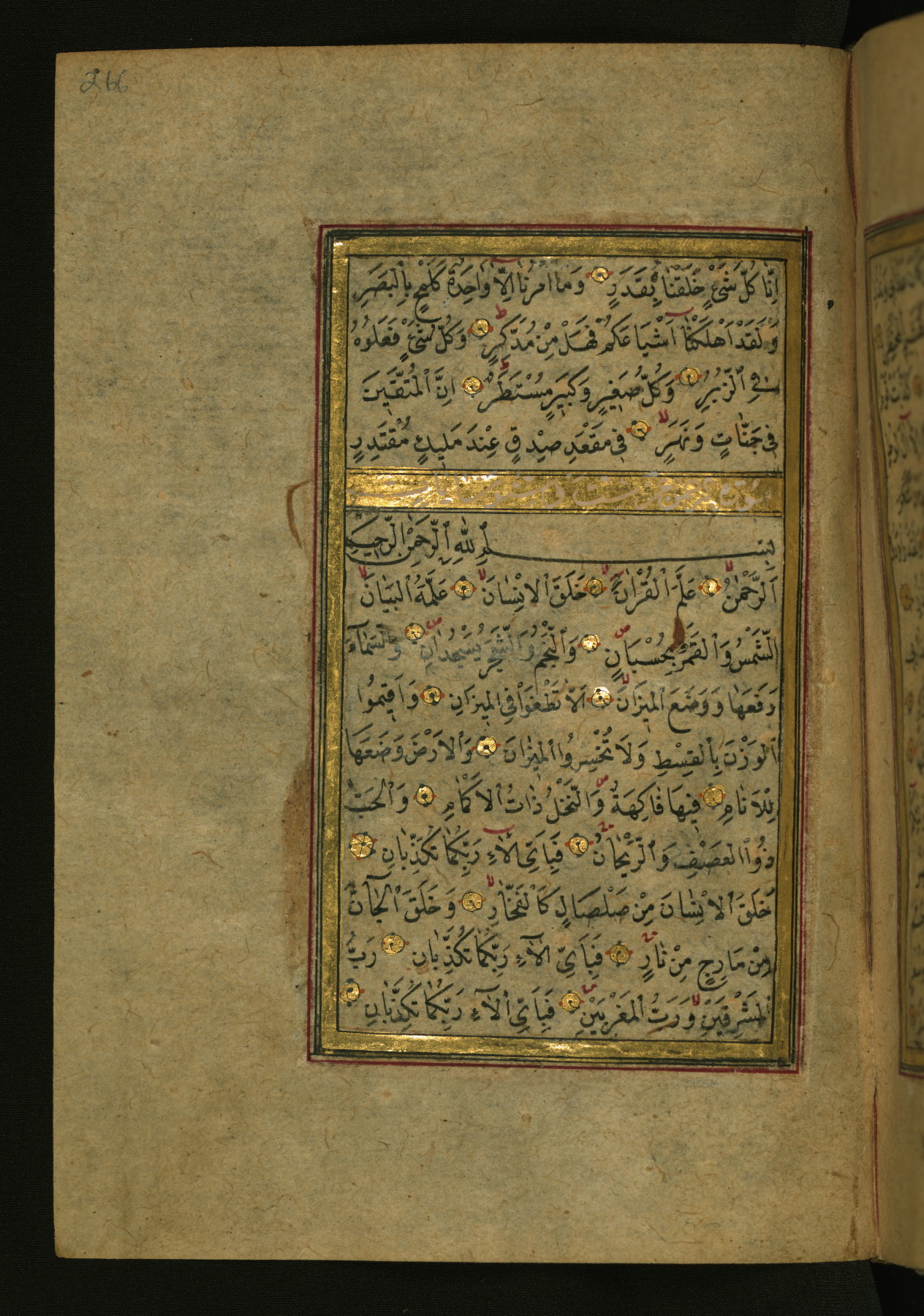 This small, illuminated single-volume copy of the Qurʾan was produced in Ottoman Turkey in 1282 AH / 1865-6 CE by Muḥammad ibn Muṣṭafá Izmīrī, a pupil of al-Rudūsī. The colophon in ijāzah script indicates that the present codex is the twenty-first copy executed by him (fol. 304b). The manuscript opens with an illuminated double-page incipit with the verses of chapters 1 (Sūrat al-fātiḥah) and 2 (Sūrat al-baqarah) (fols. 1b-2a). The text is written in naskh script in black ink with reading marks in red. Verses are separated by illuminated discs with colored dots and chapter headings are in riqāʿ script in white ink. Polychrome medallions in the margins indicate textual divisions and prostration. The binding of black leather is contemporary with the manuscript and decorated with a tooled and gold-painted geometric design enclosed by gold frames on the upper and lower boards.