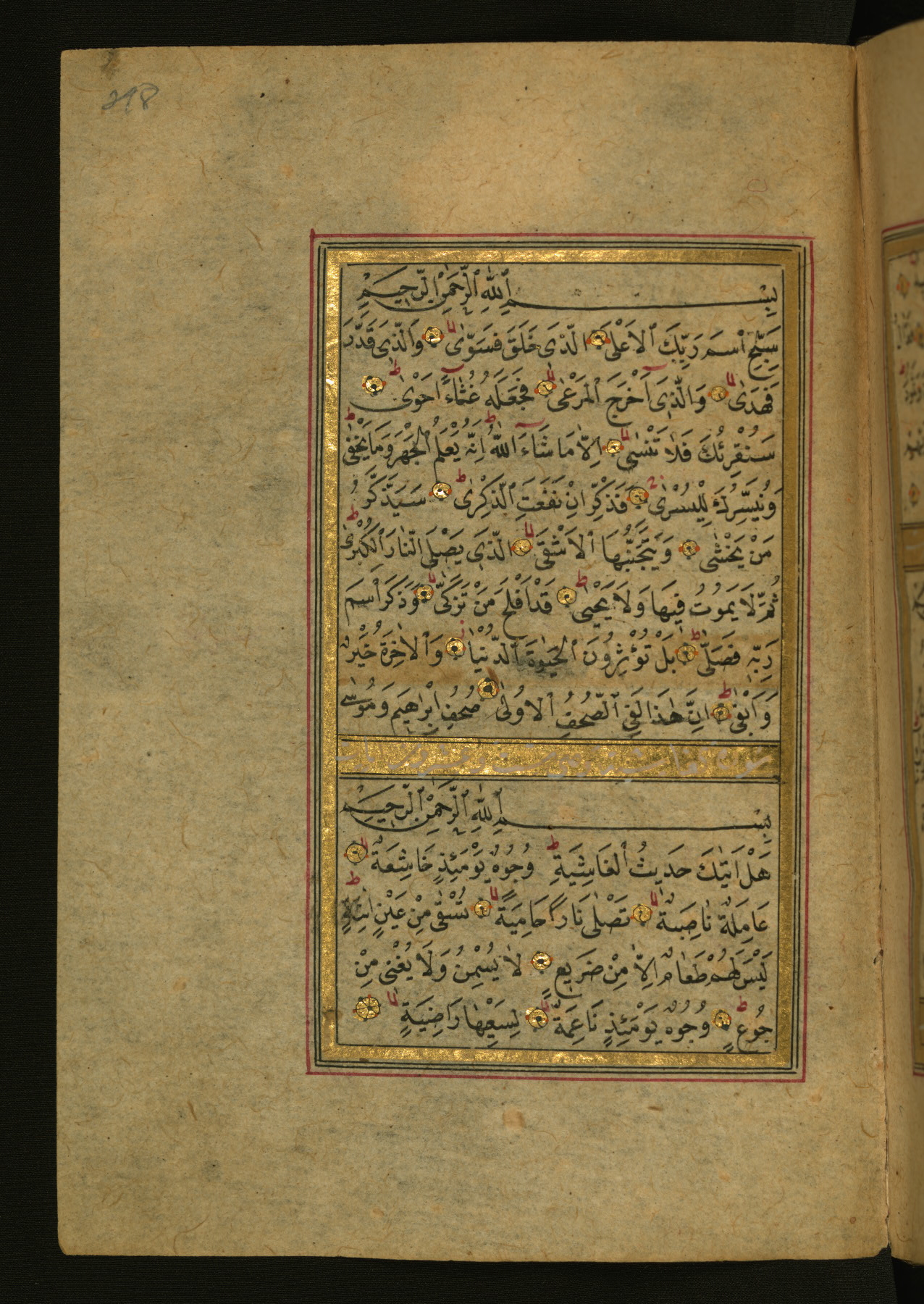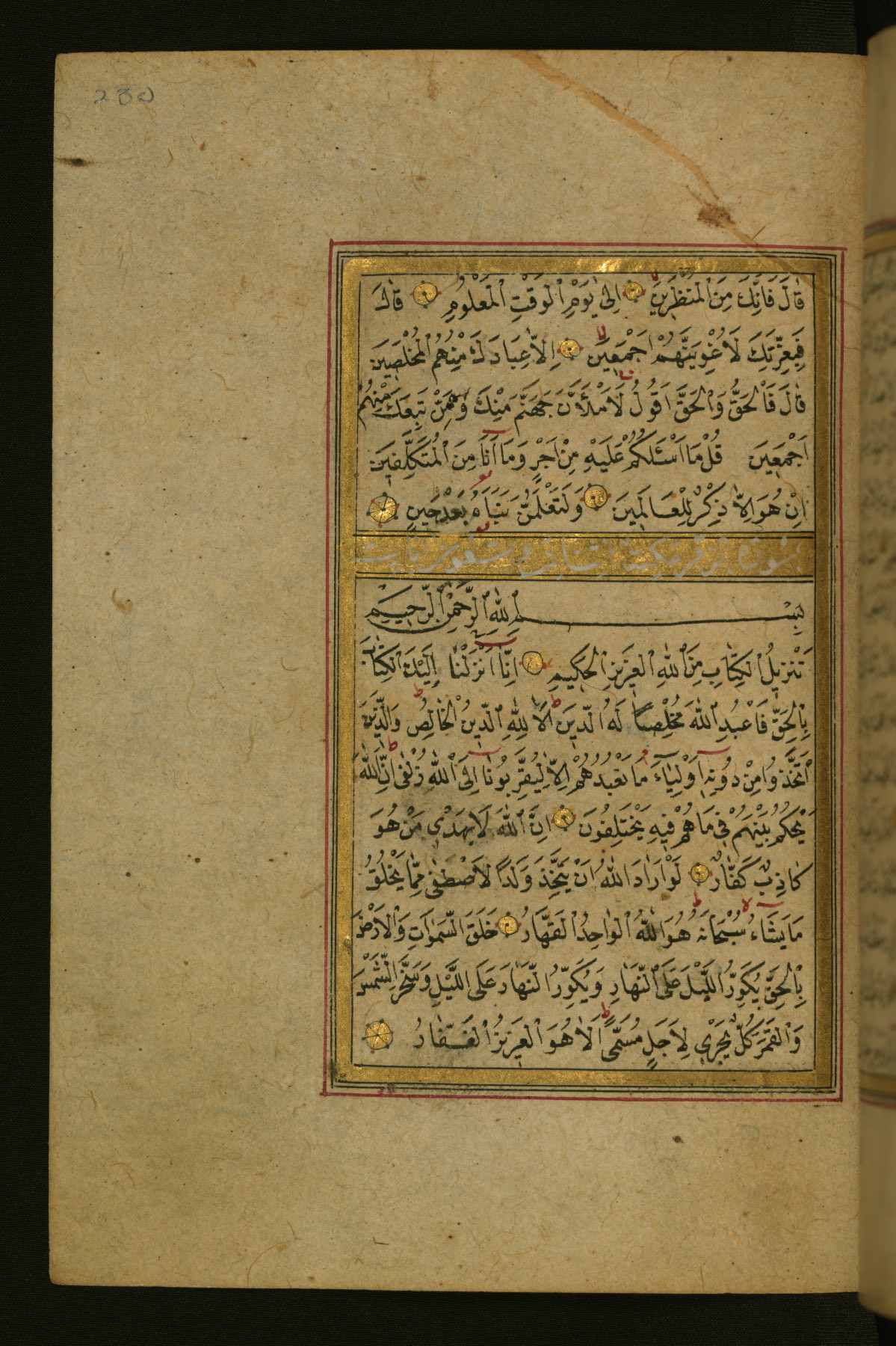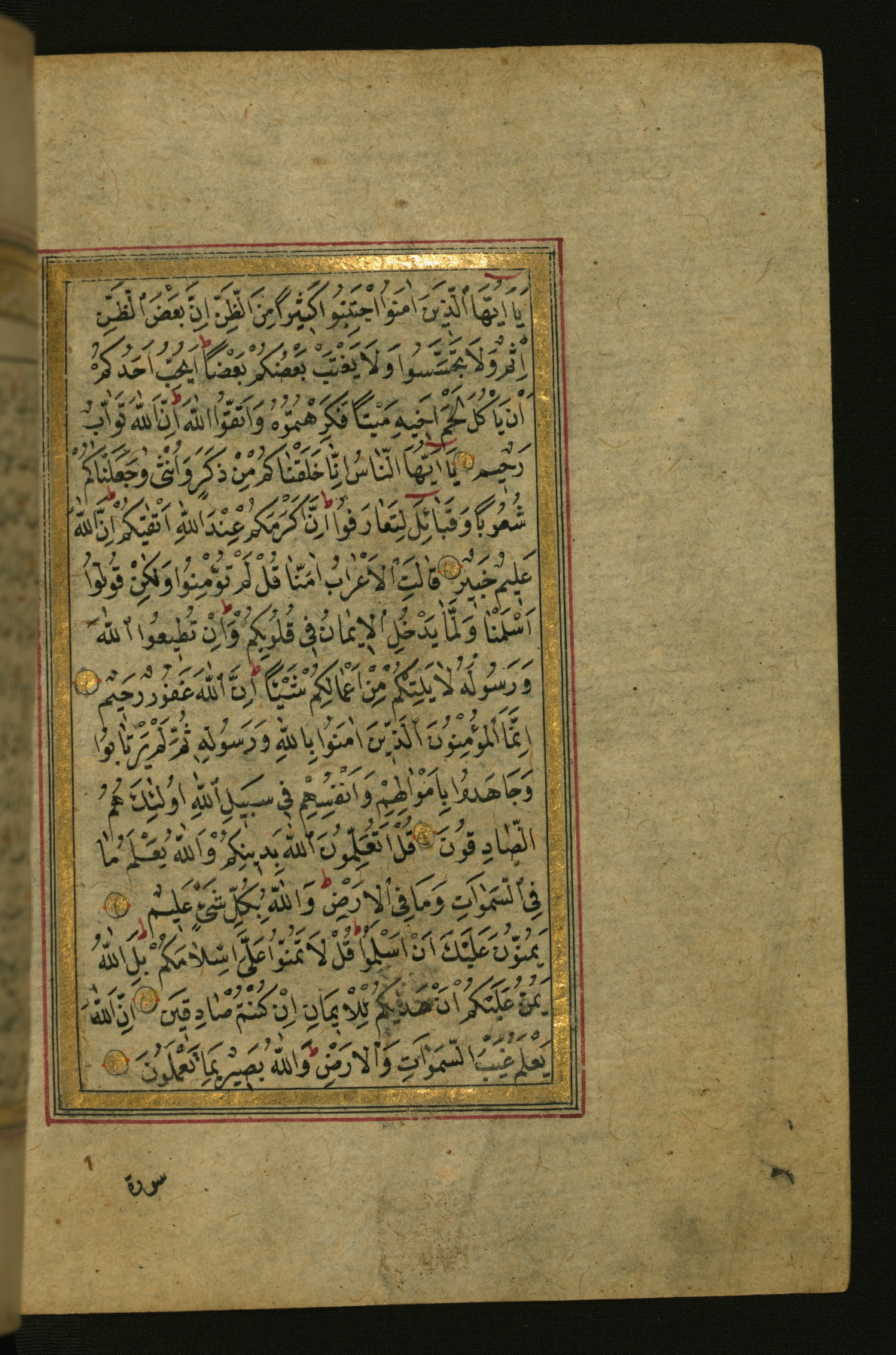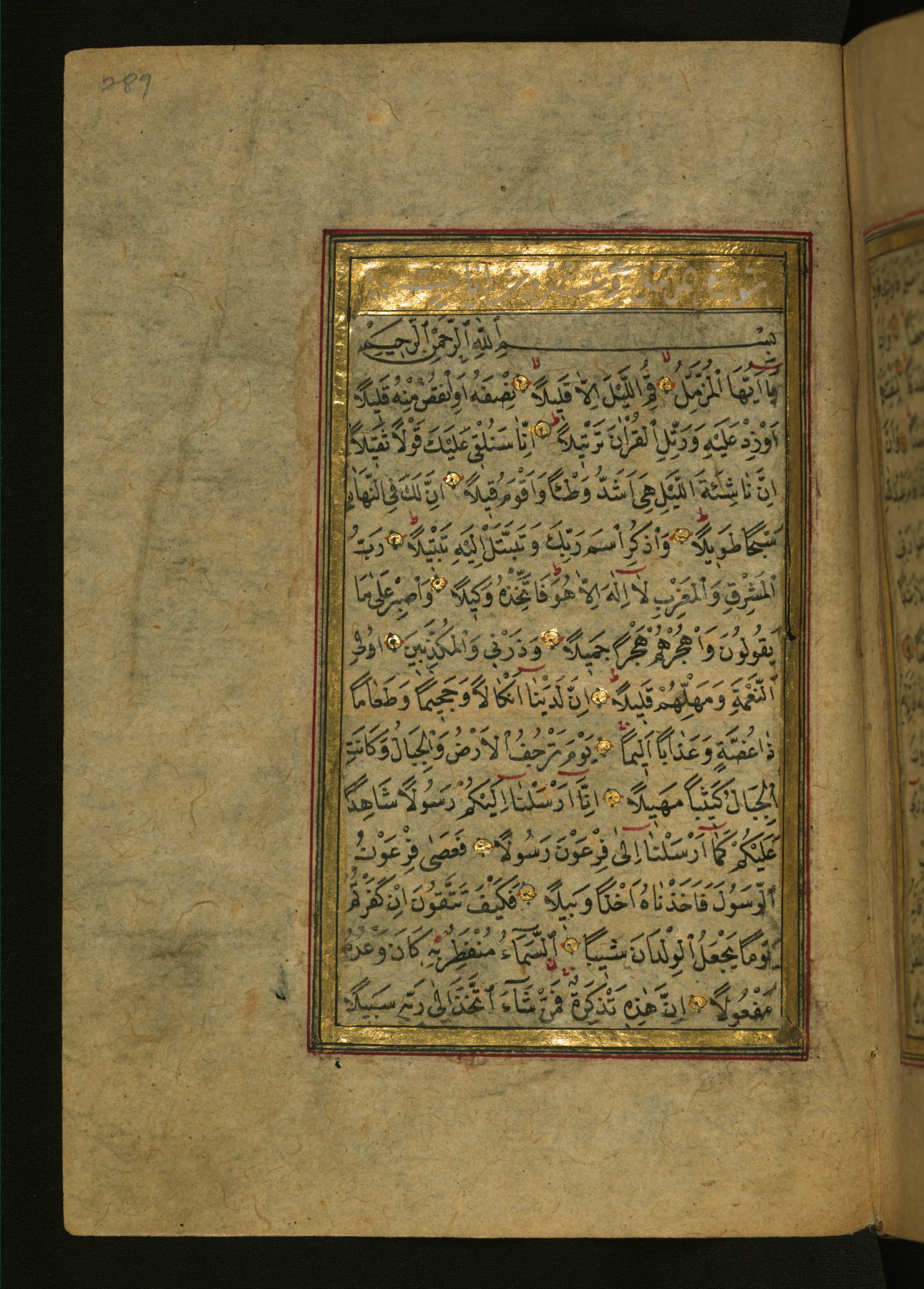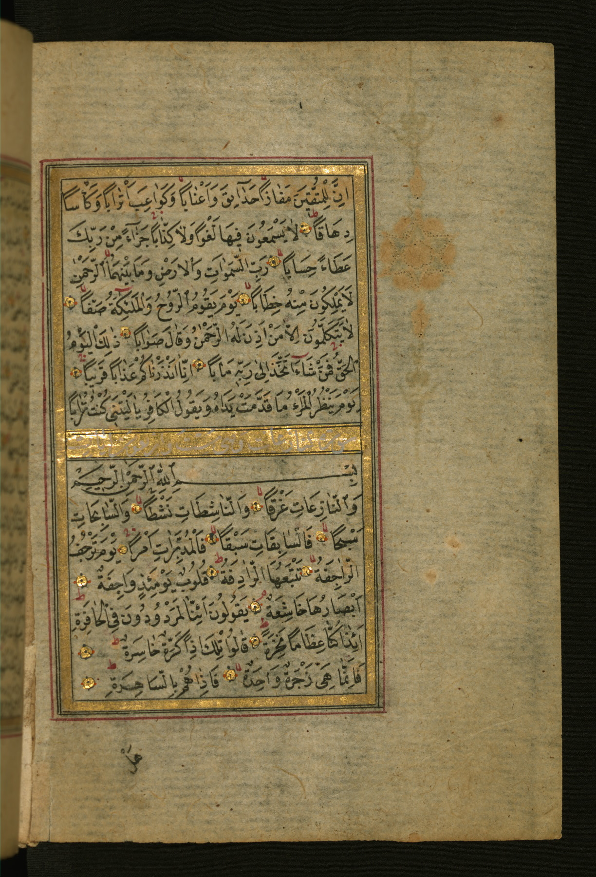 This small, illuminated single-volume copy of the Qurʾan was produced in Ottoman Turkey in 1282 AH / 1865-6 CE by Muḥammad ibn Muṣṭafá Izmīrī, a pupil of al-Rudūsī. The colophon in ijāzah script indicates that the present codex is the twenty-first copy executed by him (fol. 304b). The manuscript opens with an illuminated double-page incipit with the verses of chapters 1 (Sūrat al-fātiḥah) and 2 (Sūrat al-baqarah) (fols. 1b-2a). The text is written in naskh script in black ink with reading marks in red. Verses are separated by illuminated discs with colored dots and chapter headings are in riqāʿ script in white ink. Polychrome medallions in the margins indicate textual divisions and prostration. The binding of black leather is contemporary with the manuscript and decorated with a tooled and gold-painted geometric design enclosed by gold frames on the upper and lower boards.