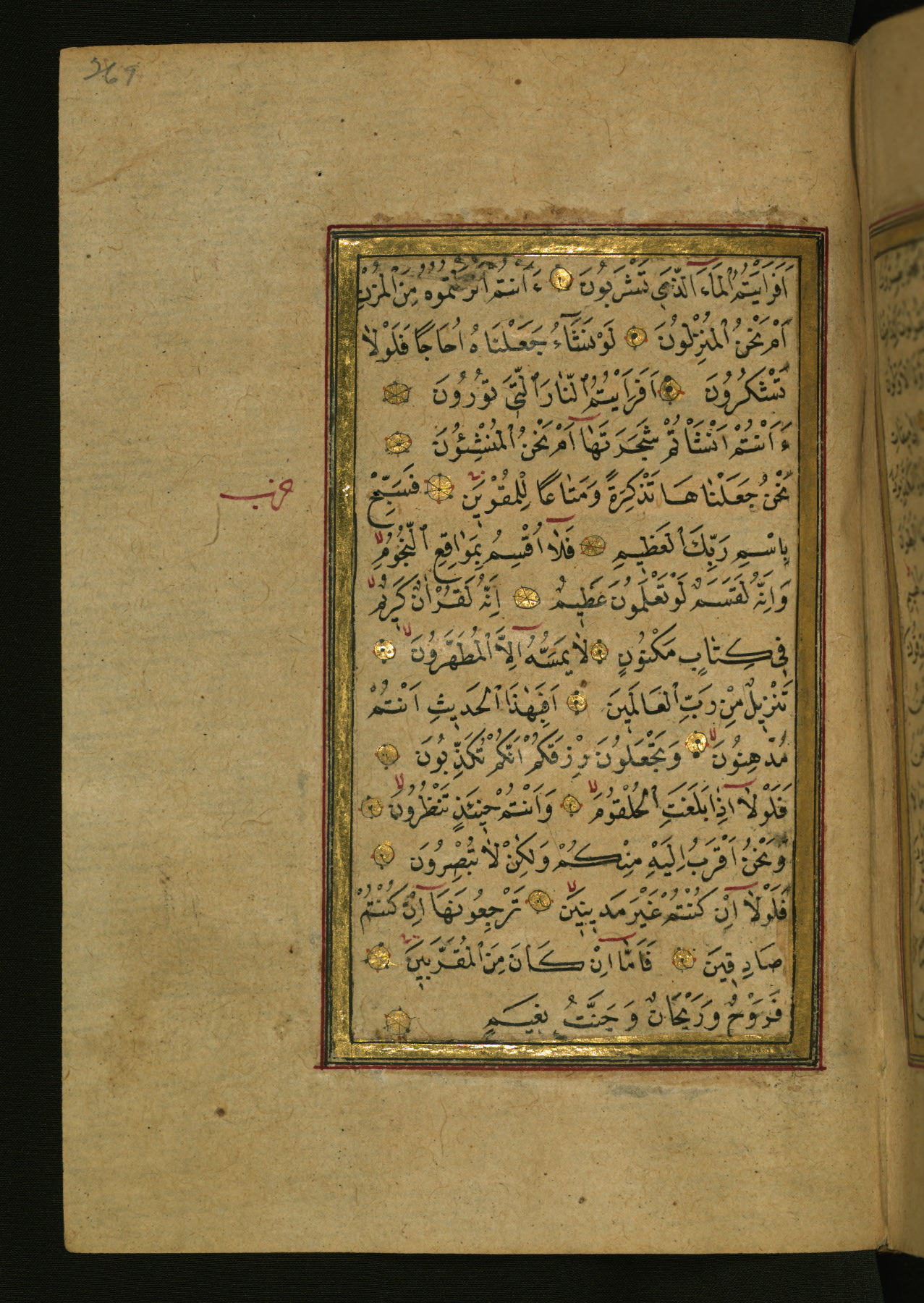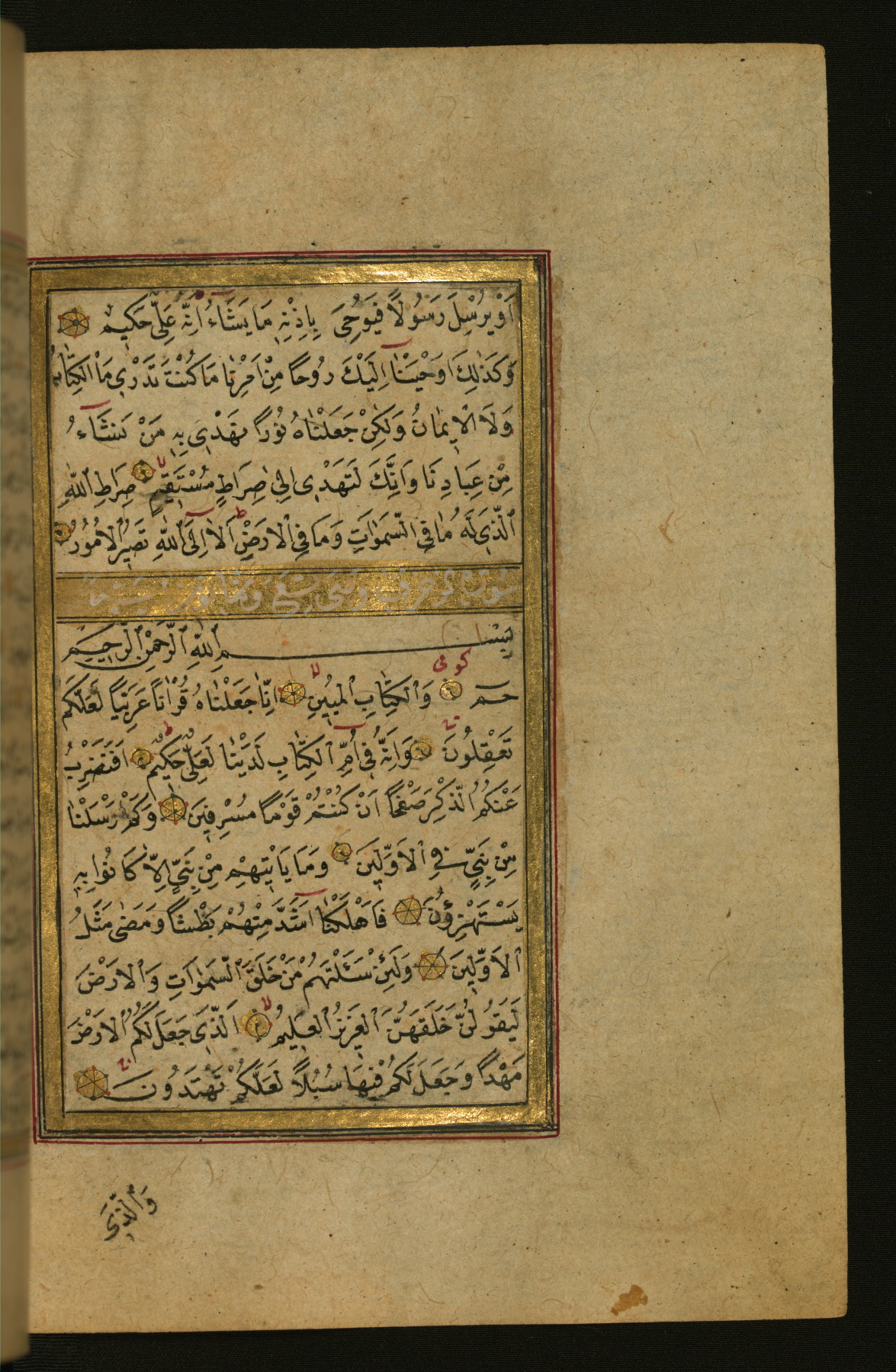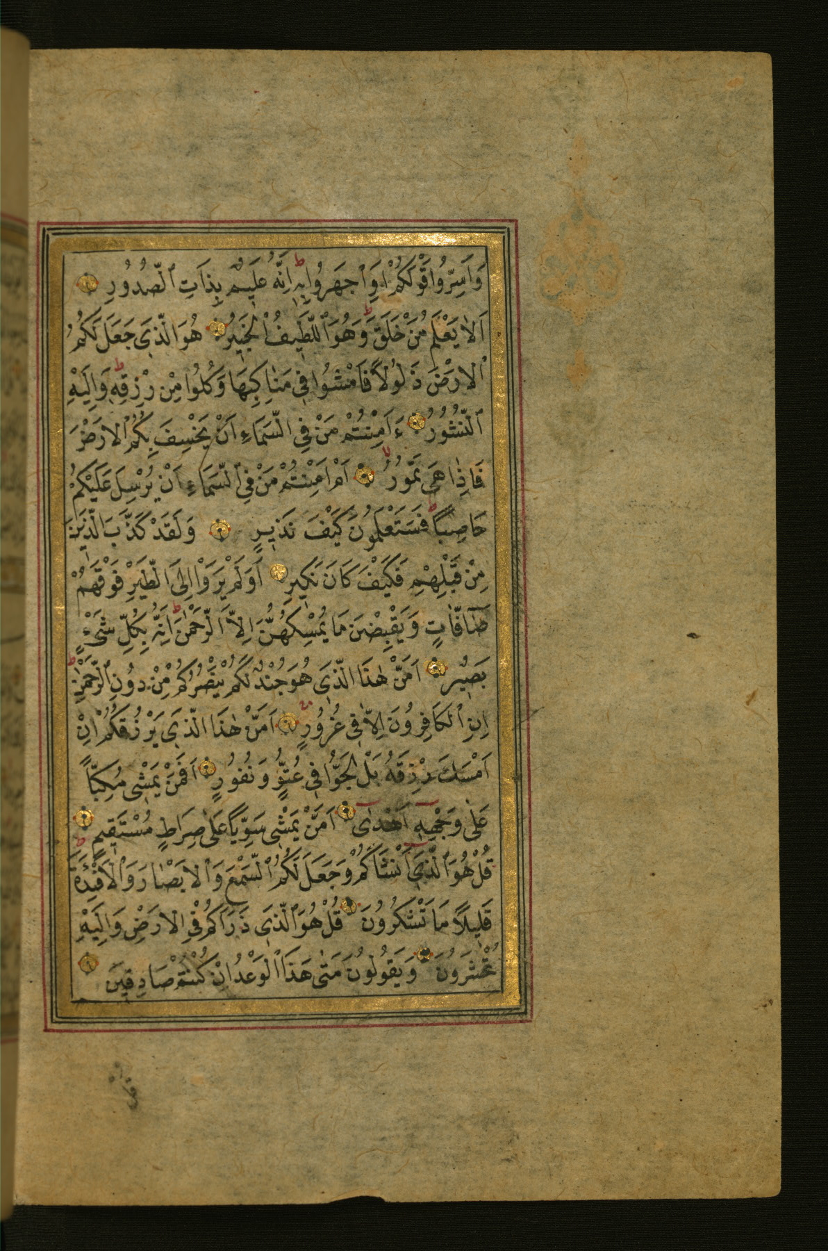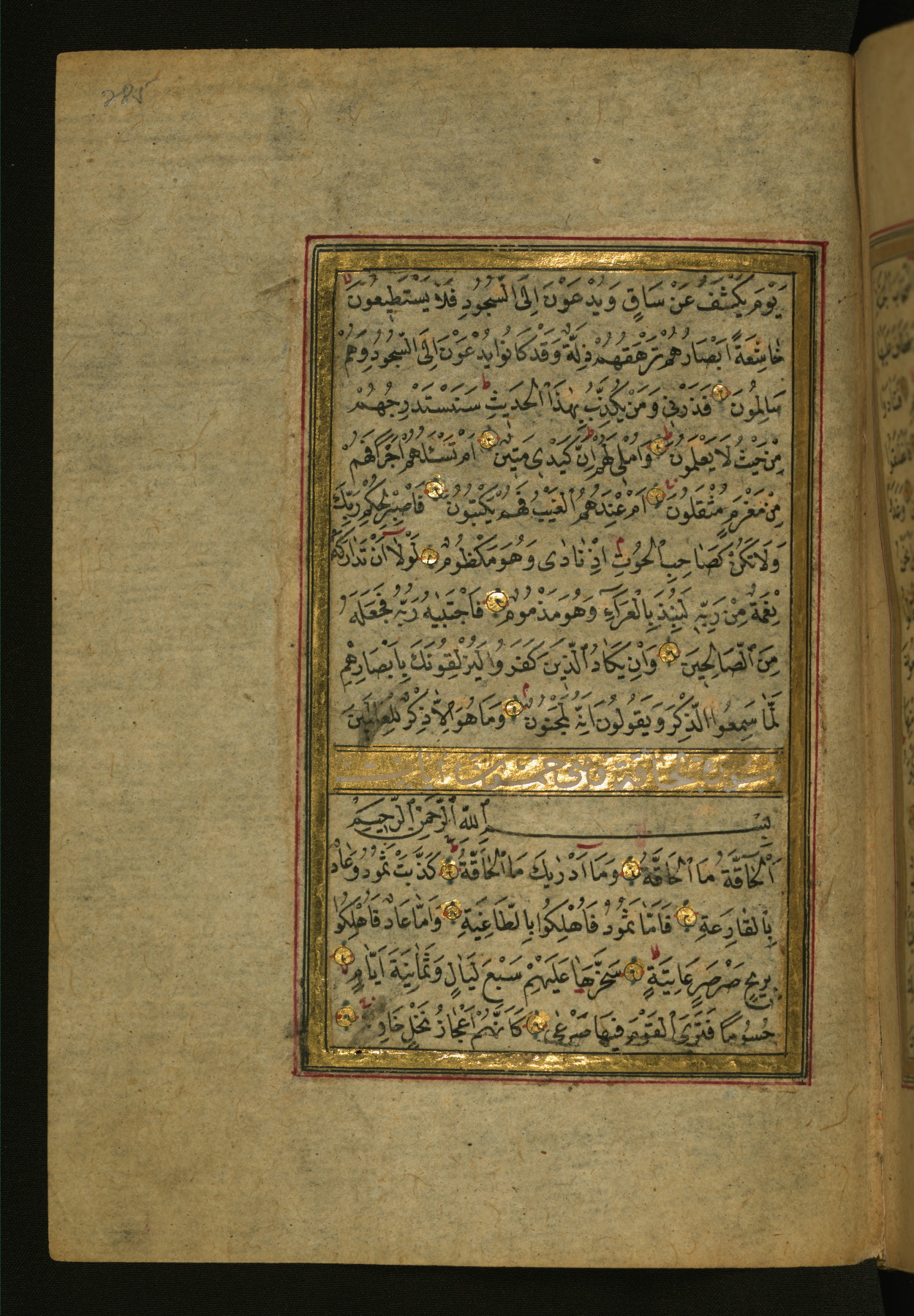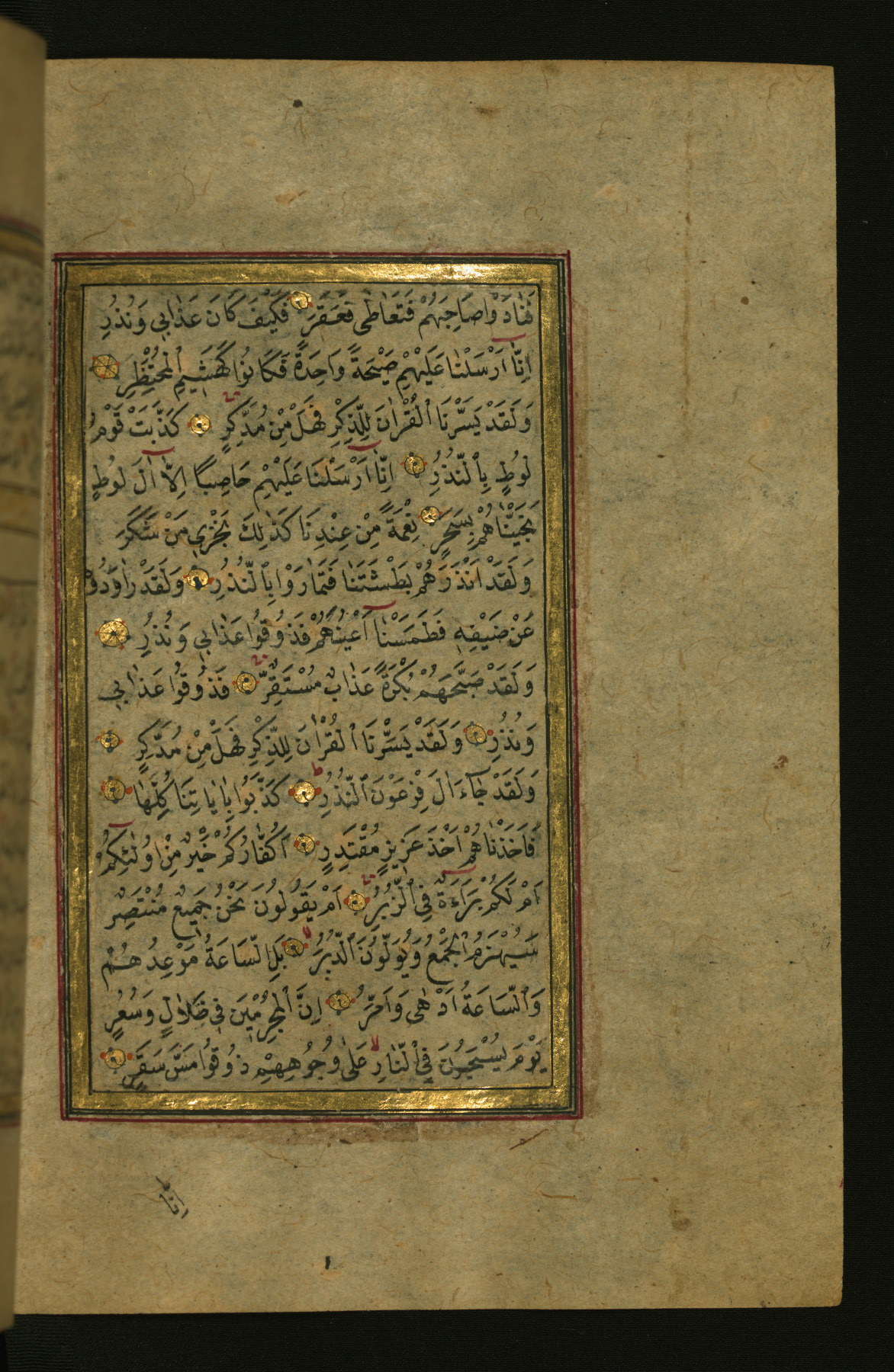 This small, illuminated single-volume copy of the Qurʾan was produced in Ottoman Turkey in 1282 AH / 1865-6 CE by Muḥammad ibn Muṣṭafá Izmīrī, a pupil of al-Rudūsī. The colophon in ijāzah script indicates that the present codex is the twenty-first copy executed by him (fol. 304b). The manuscript opens with an illuminated double-page incipit with the verses of chapters 1 (Sūrat al-fātiḥah) and 2 (Sūrat al-baqarah) (fols. 1b-2a). The text is written in naskh script in black ink with reading marks in red. Verses are separated by illuminated discs with colored dots and chapter headings are in riqāʿ script in white ink. Polychrome medallions in the margins indicate textual divisions and prostration. The binding of black leather is contemporary with the manuscript and decorated with a tooled and gold-painted geometric design enclosed by gold frames on the upper and lower boards.