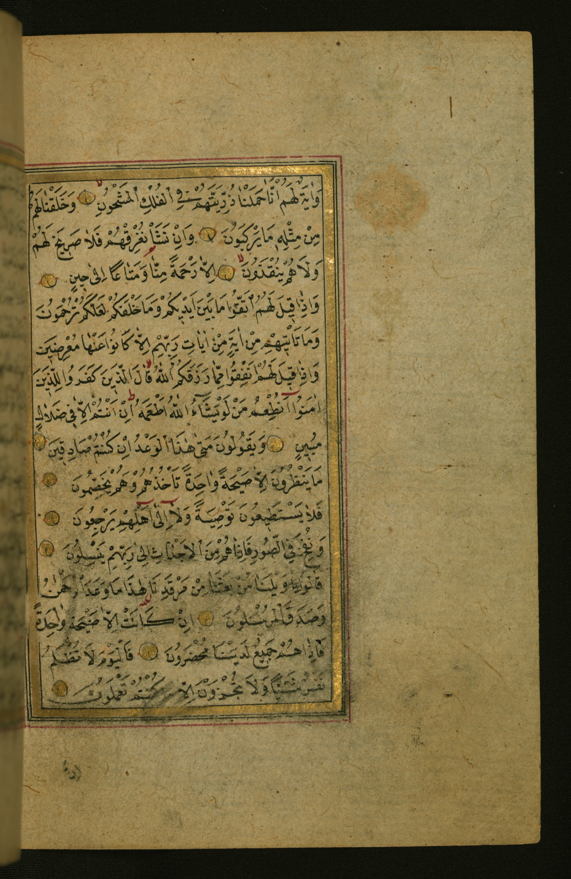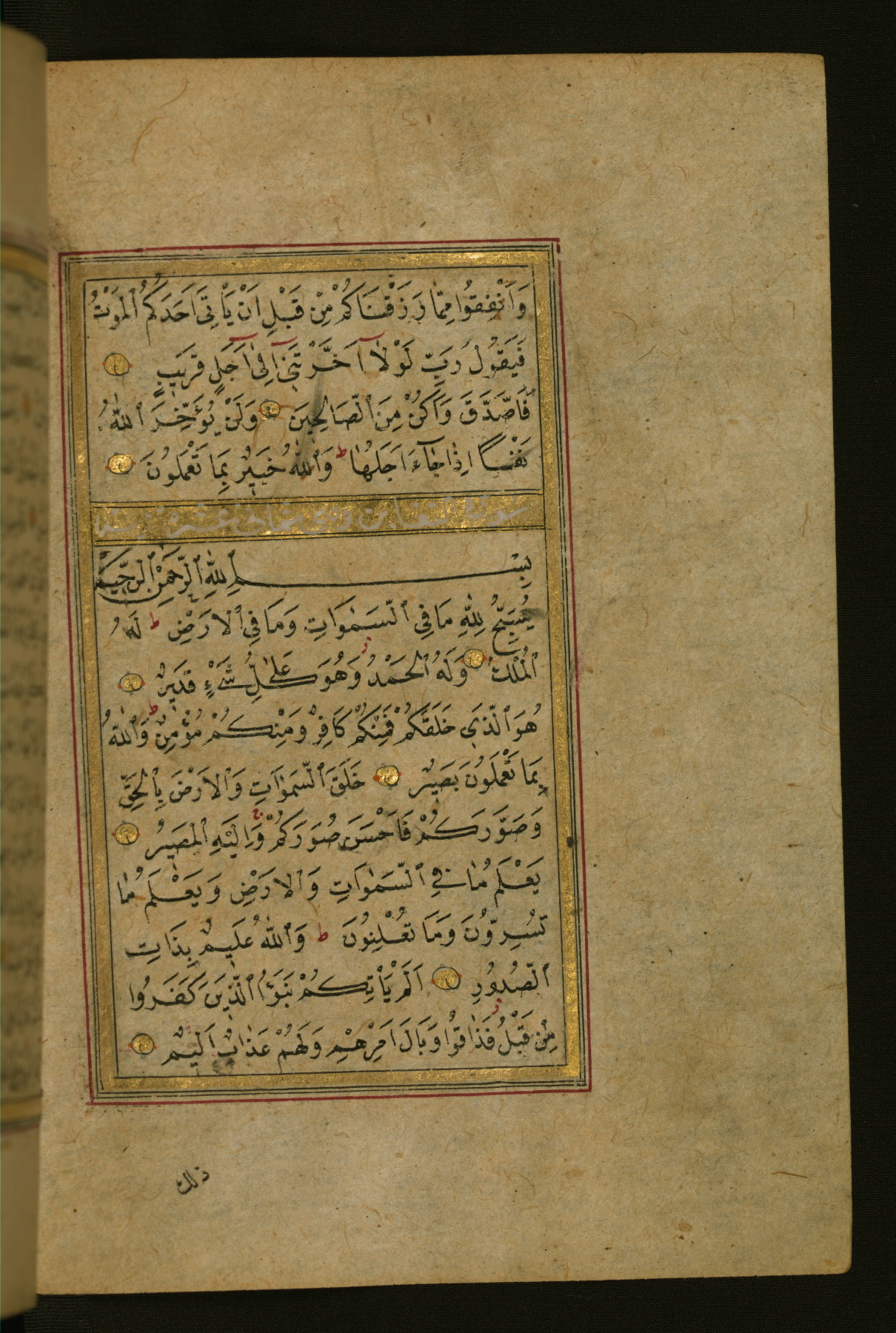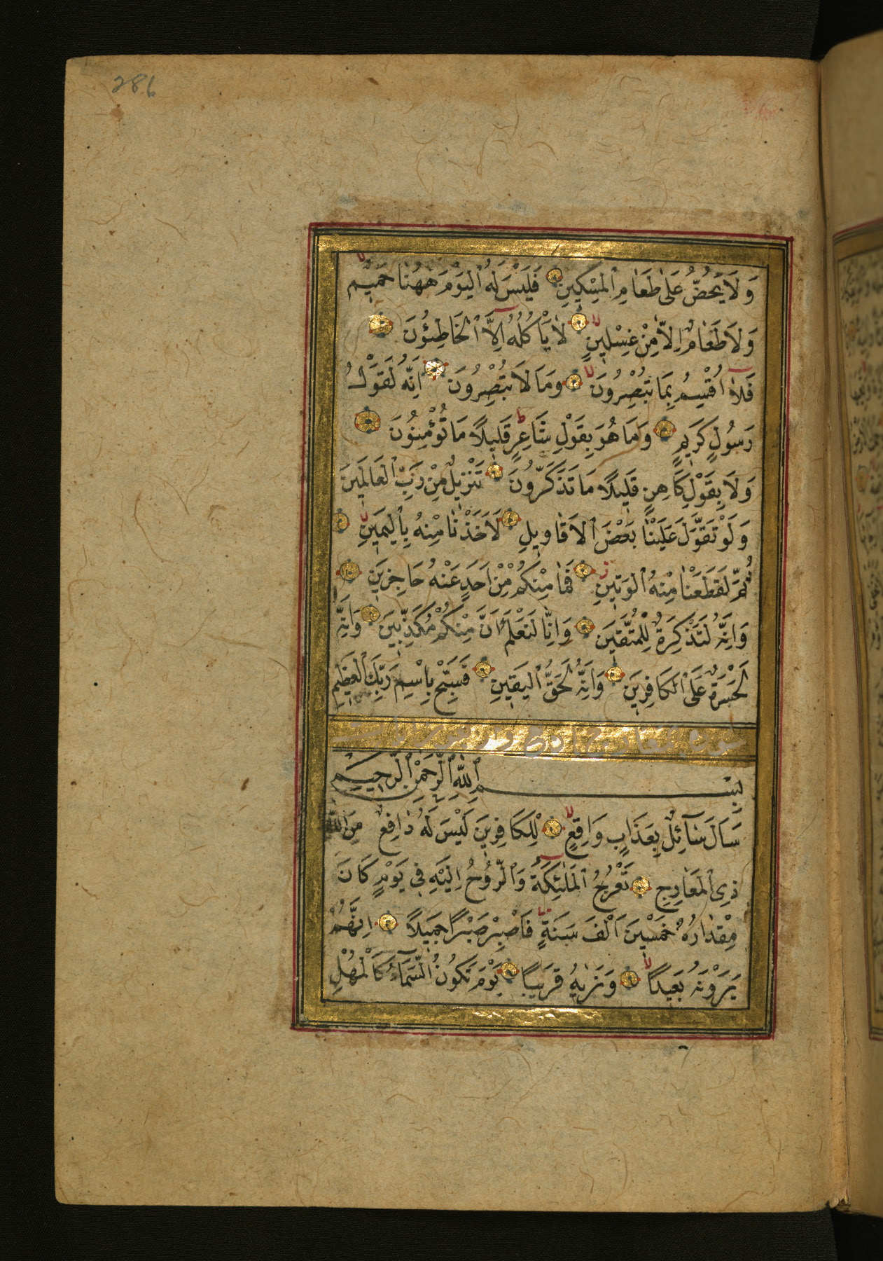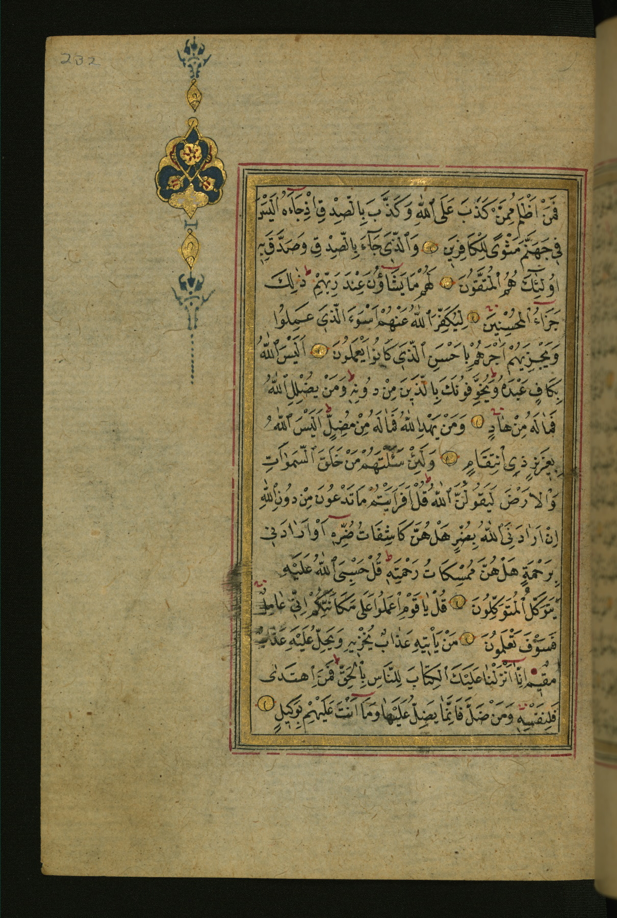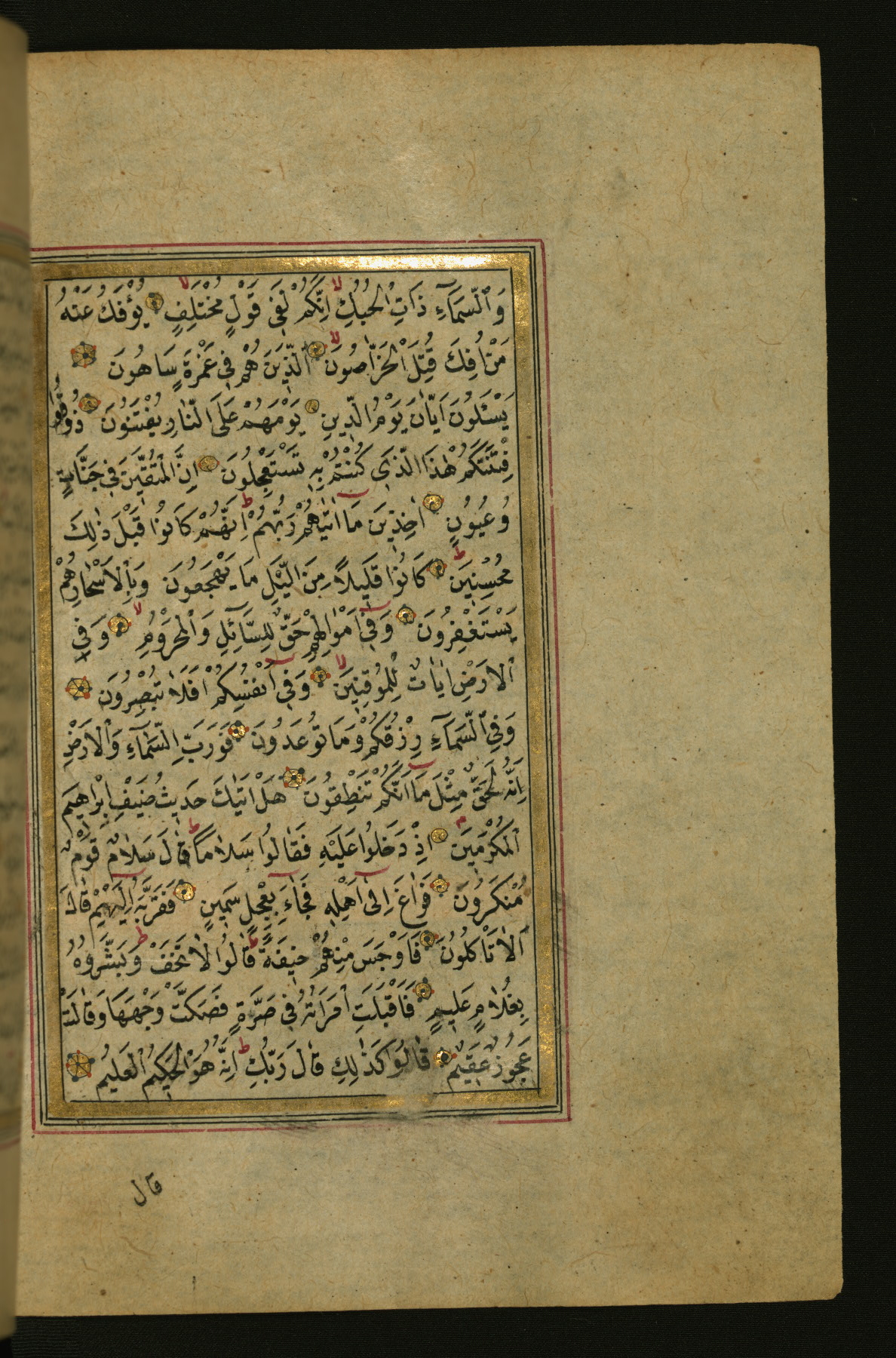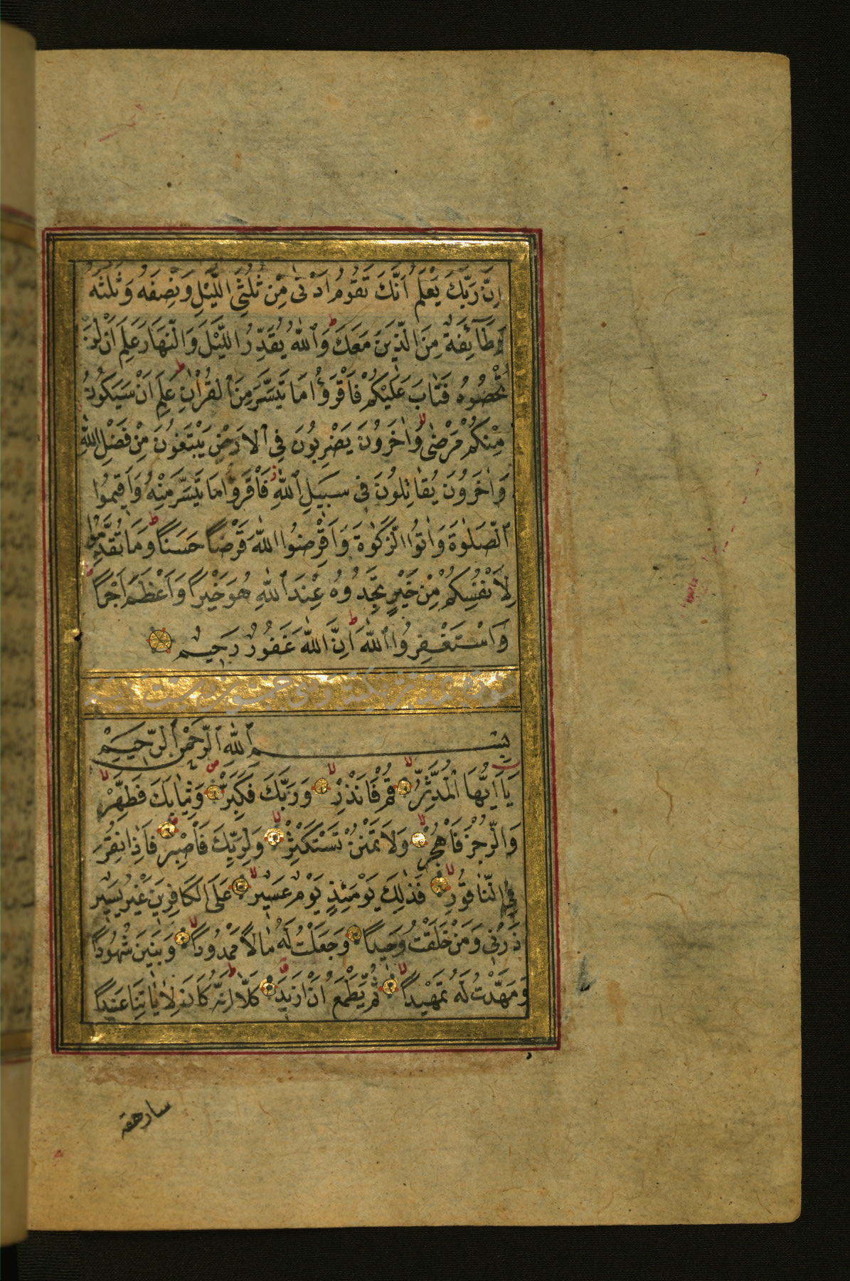 This small, illuminated single-volume copy of the Qurʾan was produced in Ottoman Turkey in 1282 AH / 1865-6 CE by Muḥammad ibn Muṣṭafá Izmīrī, a pupil of al-Rudūsī. The colophon in ijāzah script indicates that the present codex is the twenty-first copy executed by him (fol. 304b). The manuscript opens with an illuminated double-page incipit with the verses of chapters 1 (Sūrat al-fātiḥah) and 2 (Sūrat al-baqarah) (fols. 1b-2a). The text is written in naskh script in black ink with reading marks in red. Verses are separated by illuminated discs with colored dots and chapter headings are in riqāʿ script in white ink. Polychrome medallions in the margins indicate textual divisions and prostration. The binding of black leather is contemporary with the manuscript and decorated with a tooled and gold-painted geometric design enclosed by gold frames on the upper and lower boards.
