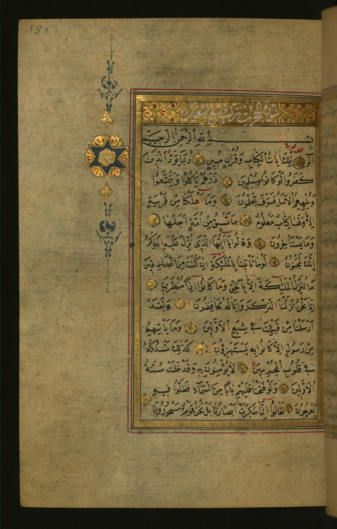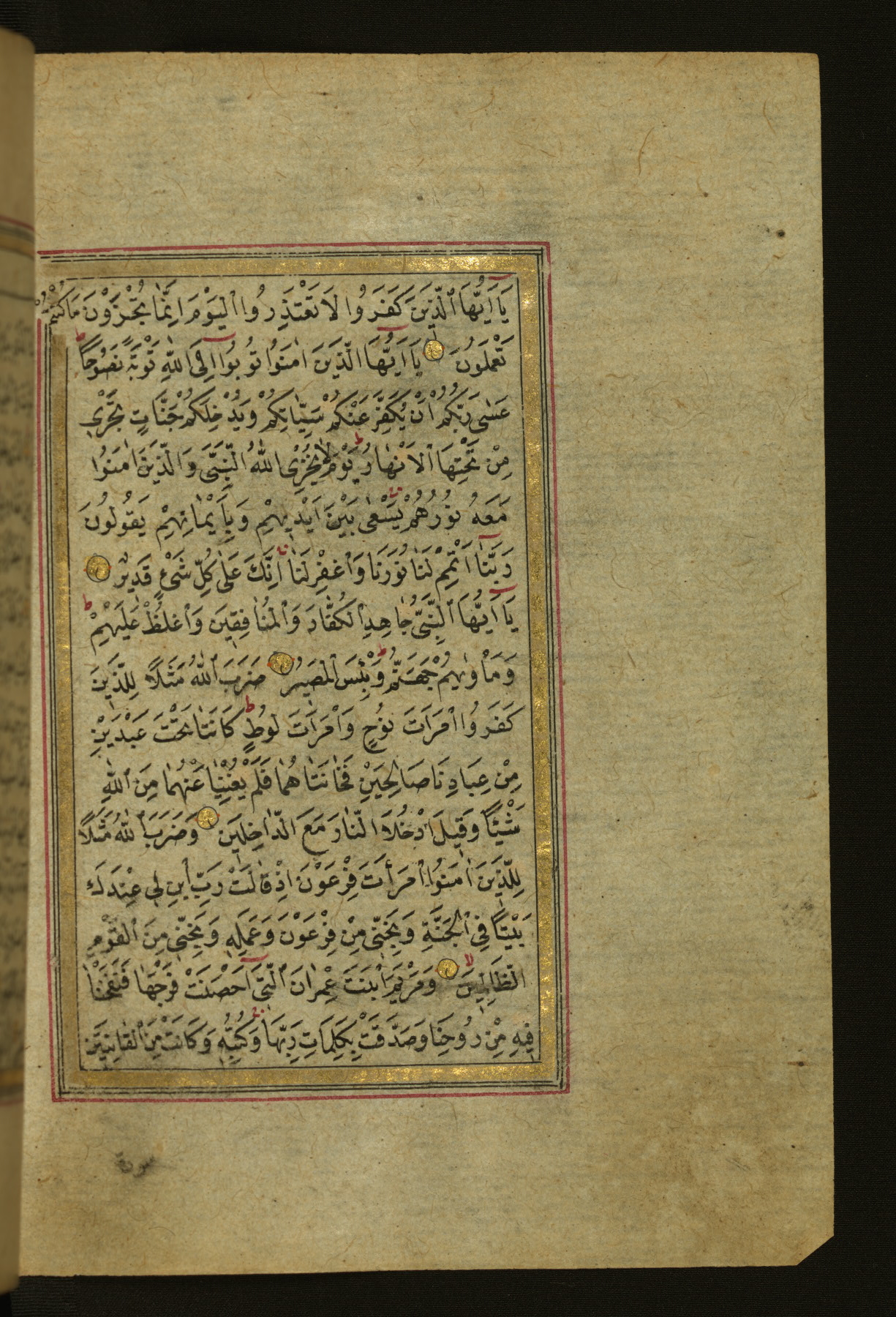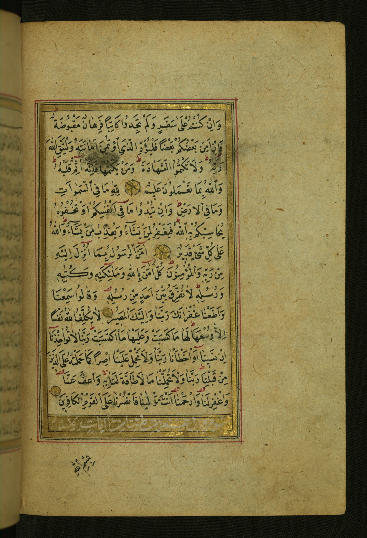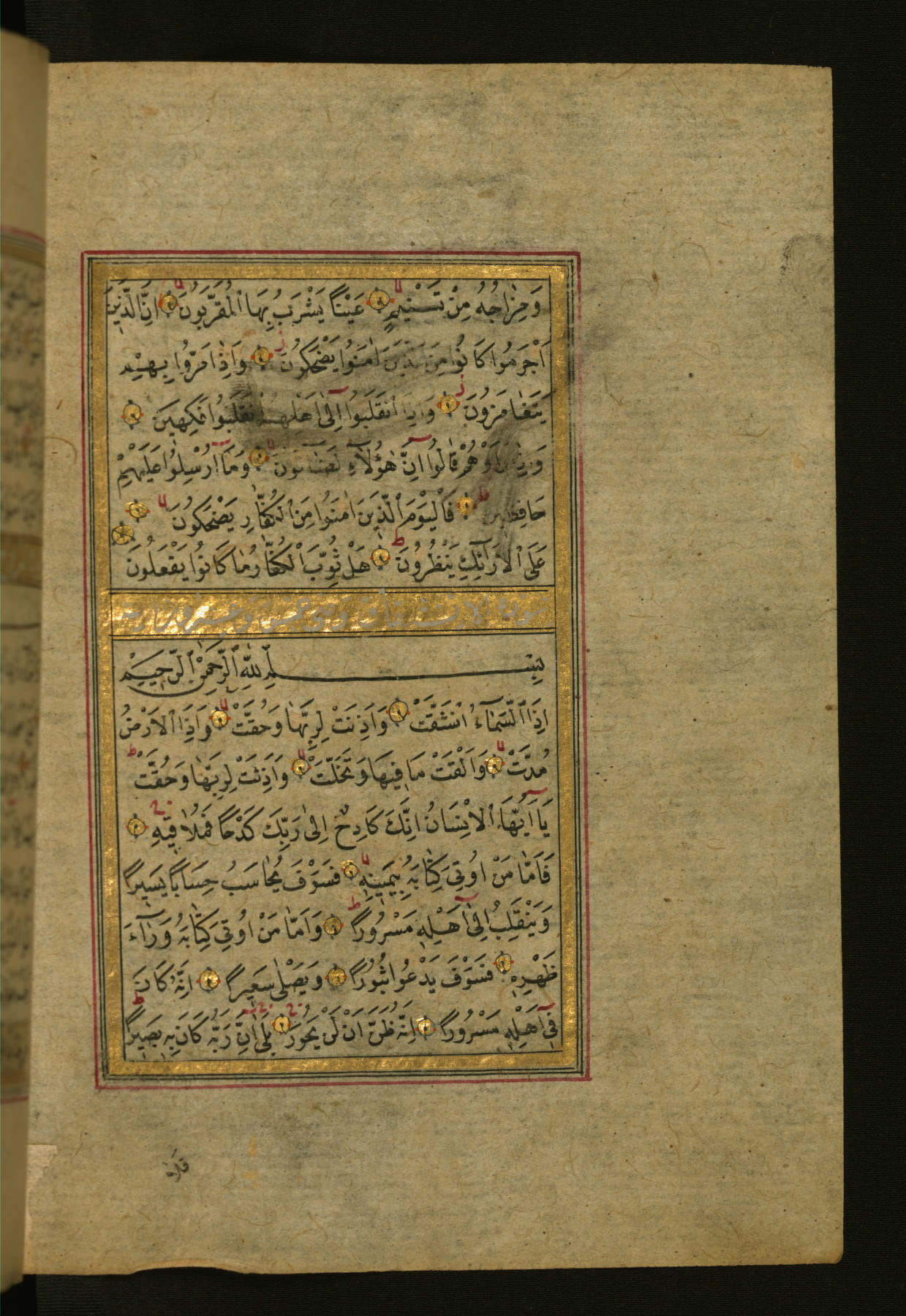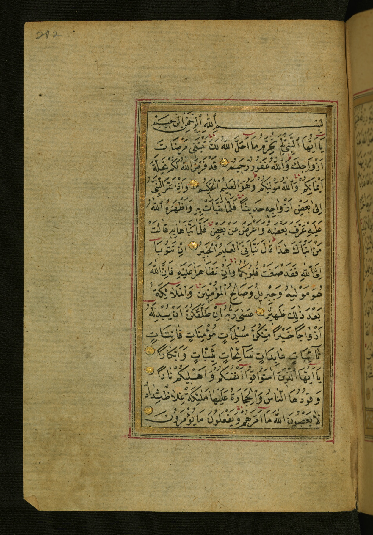This small, illuminated single-volume copy of the Qurʾan was produced in Ottoman Turkey in 1282 AH / 1865-6 CE by Muḥammad ibn Muṣṭafá Izmīrī, a pupil of al-Rudūsī. The colophon in ijāzah script indicates that the present codex is the twenty-first copy executed by him (fol. 304b). The manuscript opens with an illuminated double-page incipit with the verses of chapters 1 (Sūrat al-fātiḥah) and 2 (Sūrat al-baqarah) (fols. 1b-2a). The text is written in naskh script in black ink with reading marks in red. Verses are separated by illuminated discs with colored dots and chapter headings are in riqāʿ script in white ink. Polychrome medallions in the margins indicate textual divisions and prostration. The binding of black leather is contemporary with the manuscript and decorated with a tooled and gold-painted geometric design enclosed by gold frames on the upper and lower boards.