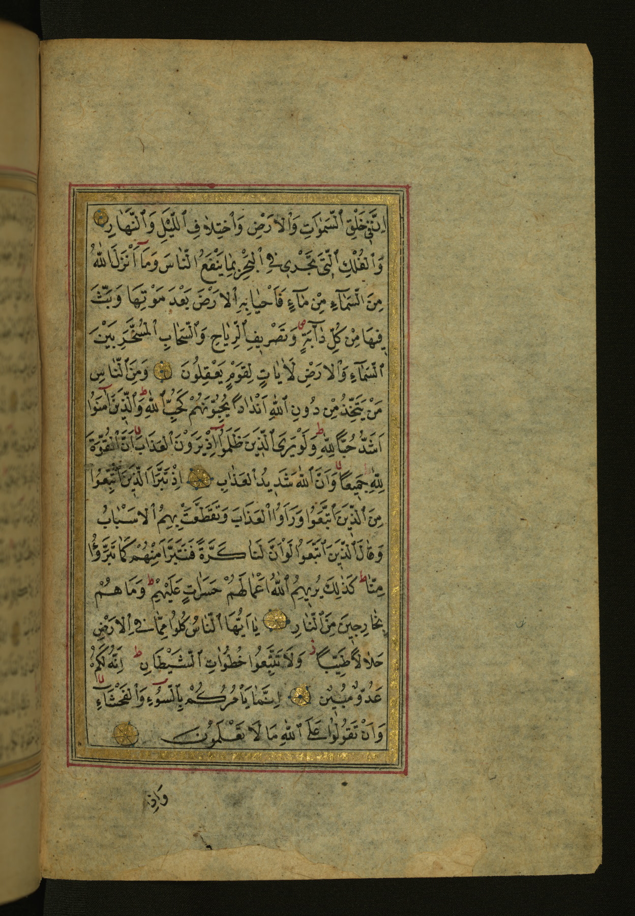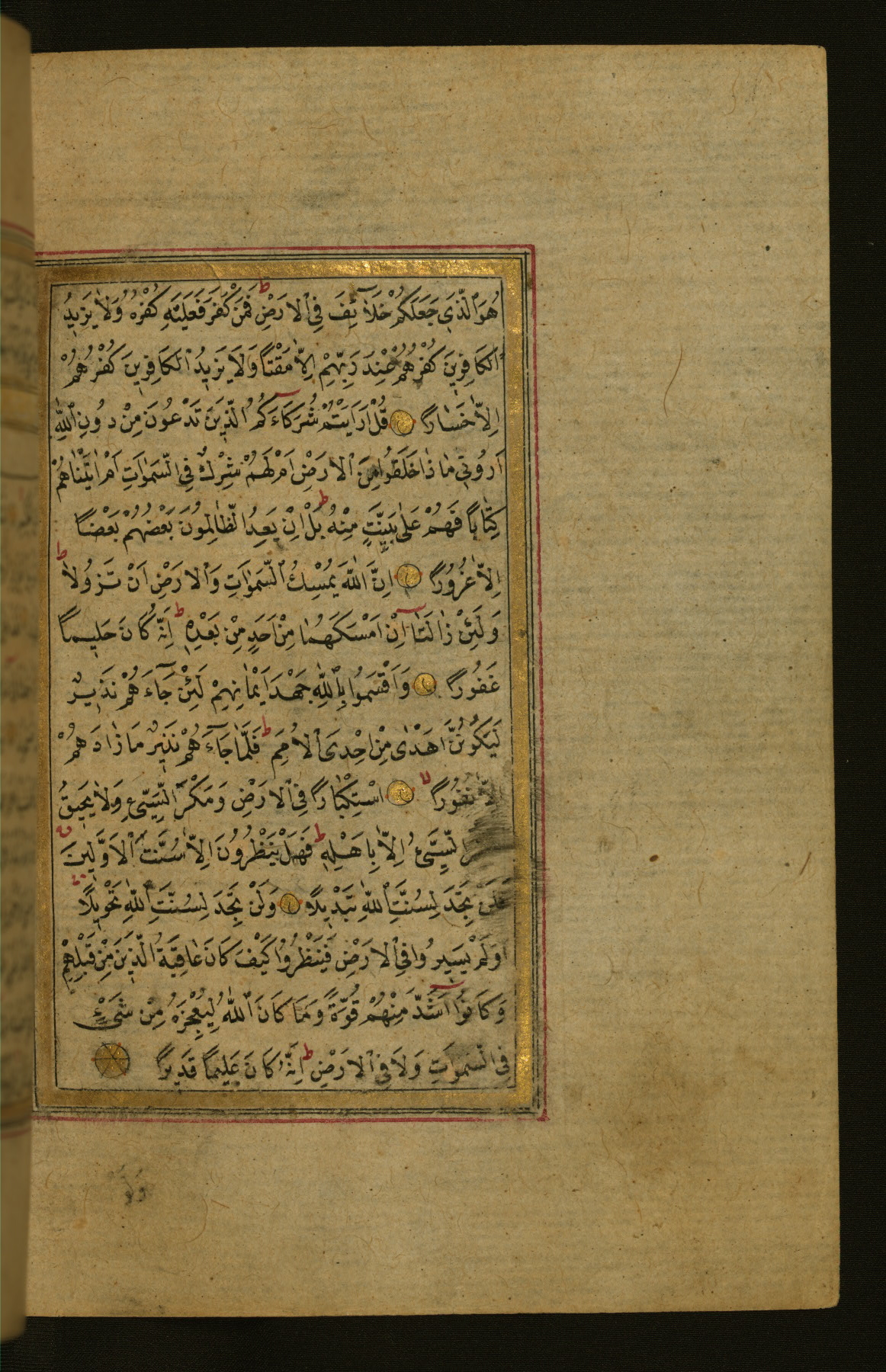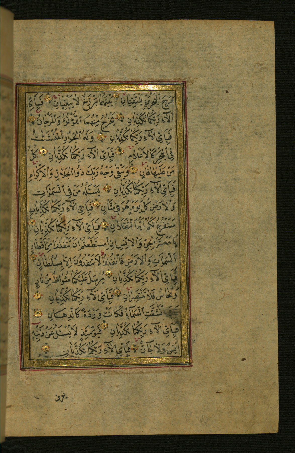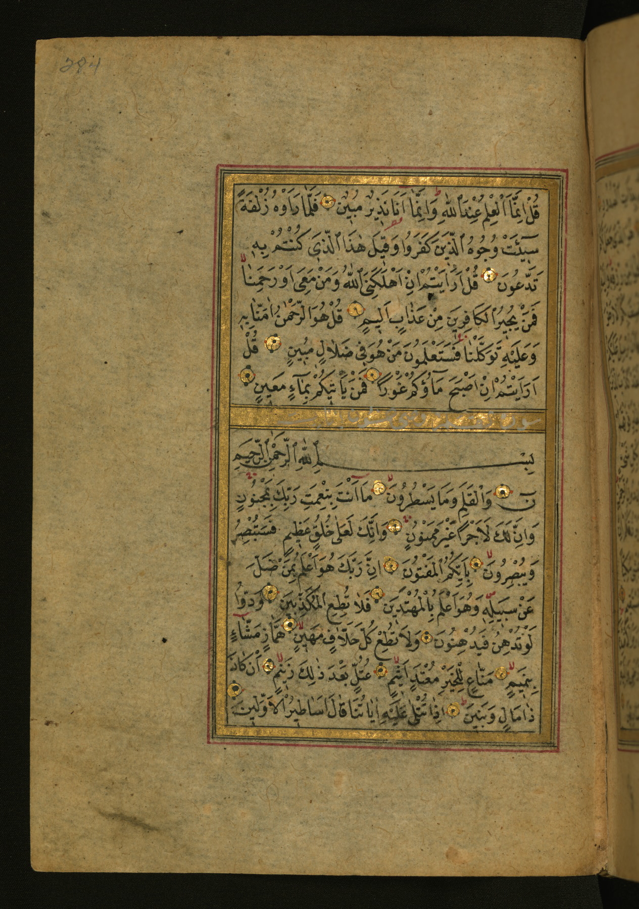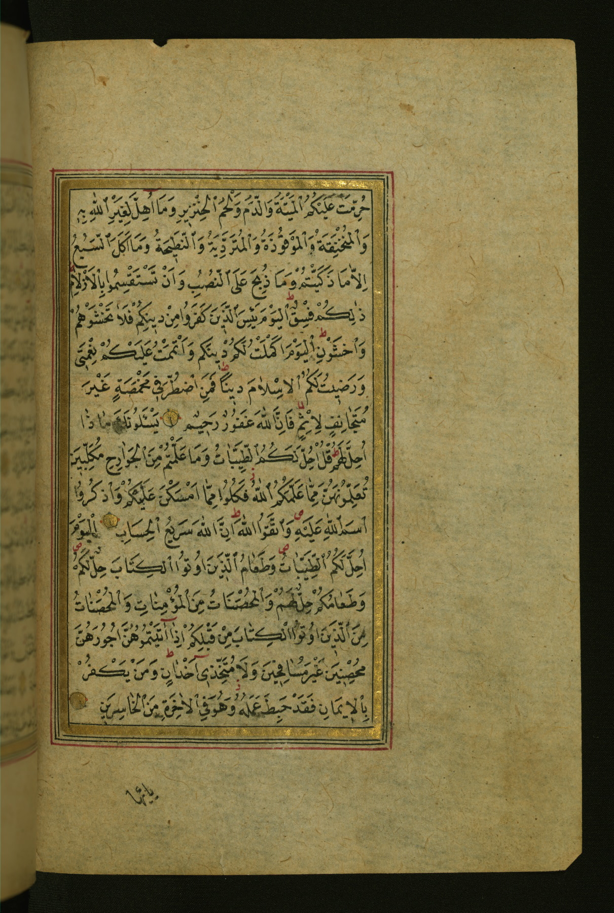 This small, illuminated single-volume copy of the Qurʾan was produced in Ottoman Turkey in 1282 AH / 1865-6 CE by Muḥammad ibn Muṣṭafá Izmīrī, a pupil of al-Rudūsī. The colophon in ijāzah script indicates that the present codex is the twenty-first copy executed by him (fol. 304b). The manuscript opens with an illuminated double-page incipit with the verses of chapters 1 (Sūrat al-fātiḥah) and 2 (Sūrat al-baqarah) (fols. 1b-2a). The text is written in naskh script in black ink with reading marks in red. Verses are separated by illuminated discs with colored dots and chapter headings are in riqāʿ script in white ink. Polychrome medallions in the margins indicate textual divisions and prostration. The binding of black leather is contemporary with the manuscript and decorated with a tooled and gold-painted geometric design enclosed by gold frames on the upper and lower boards.