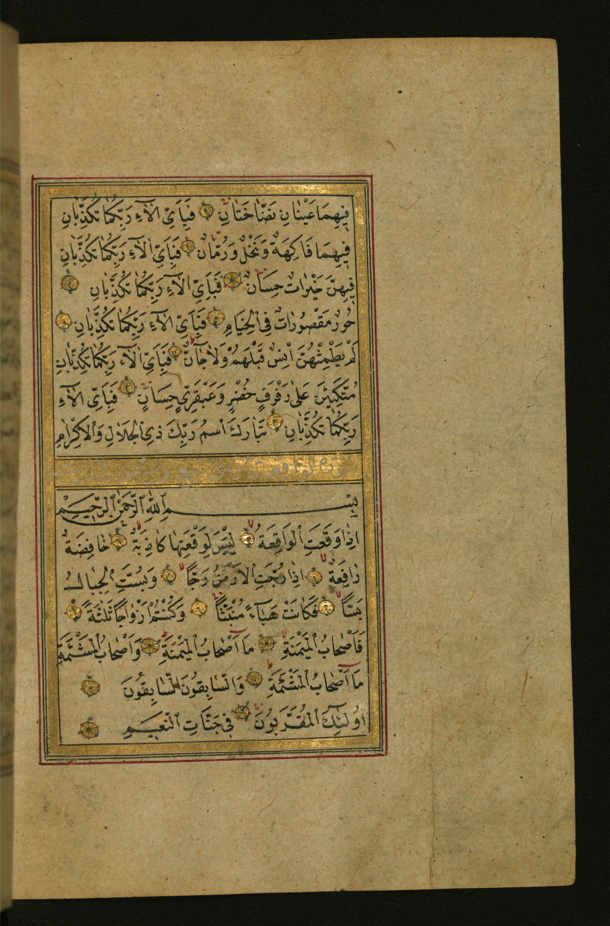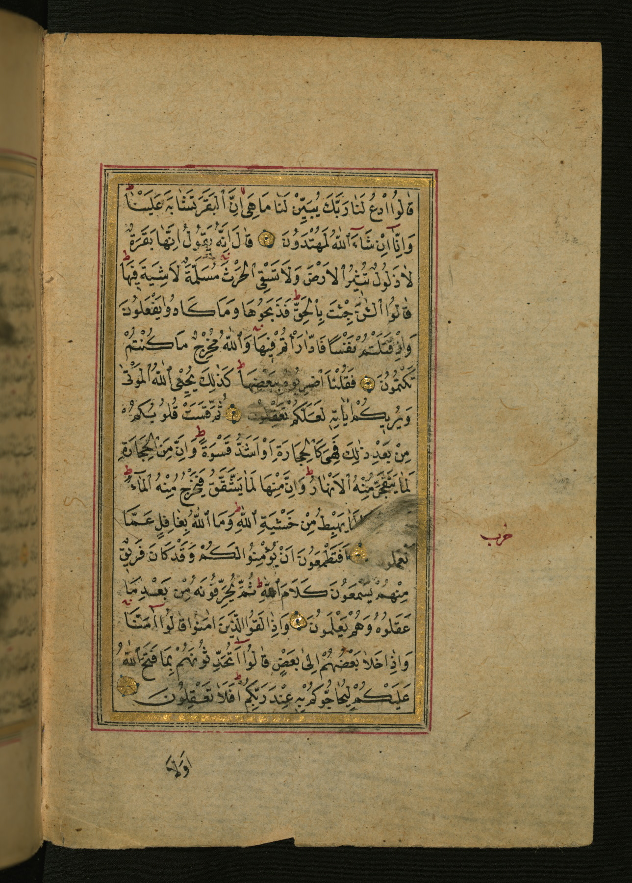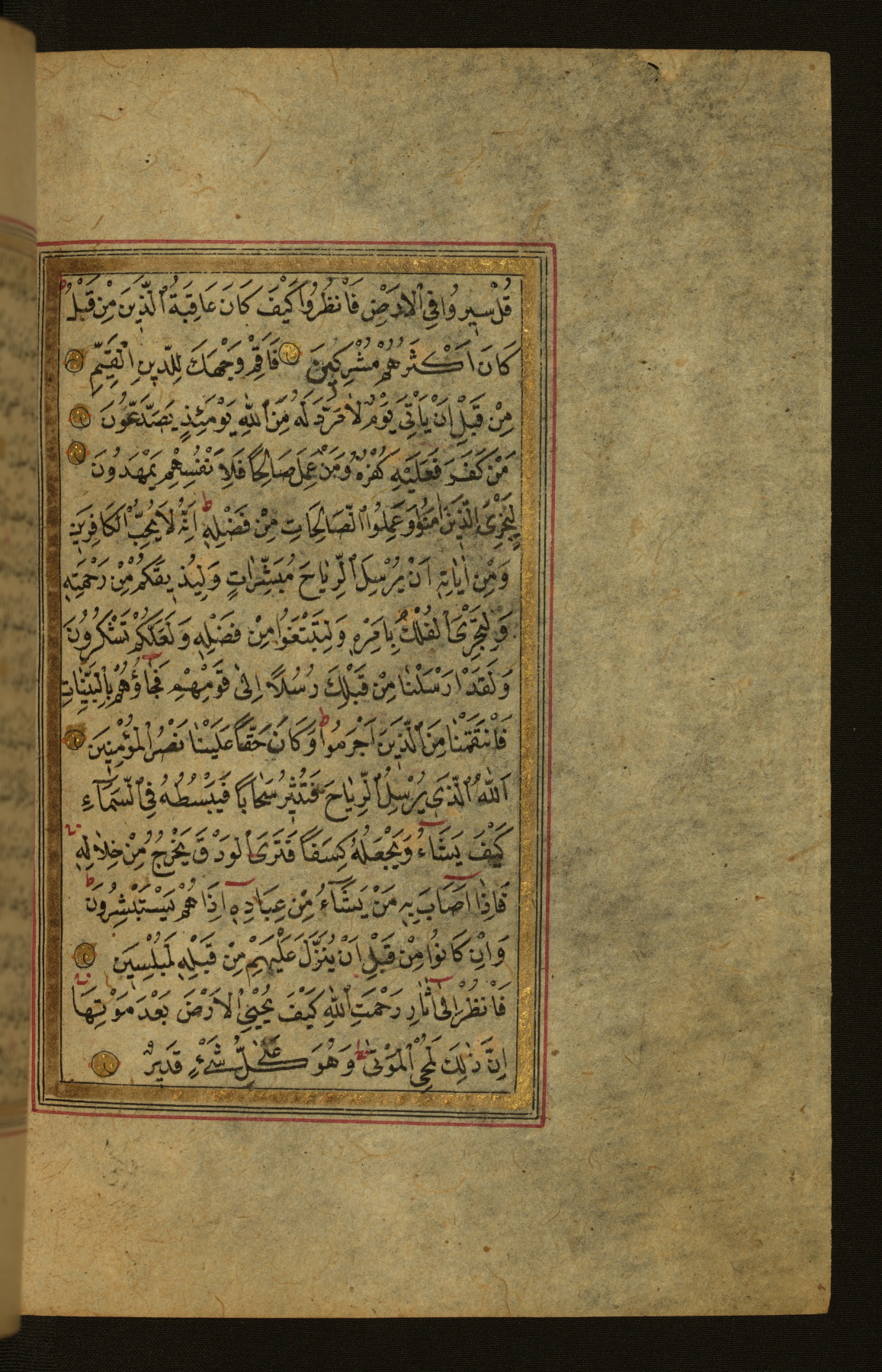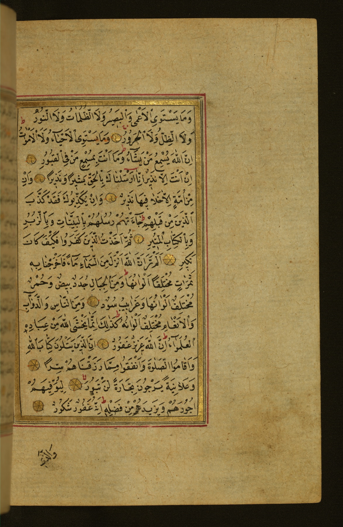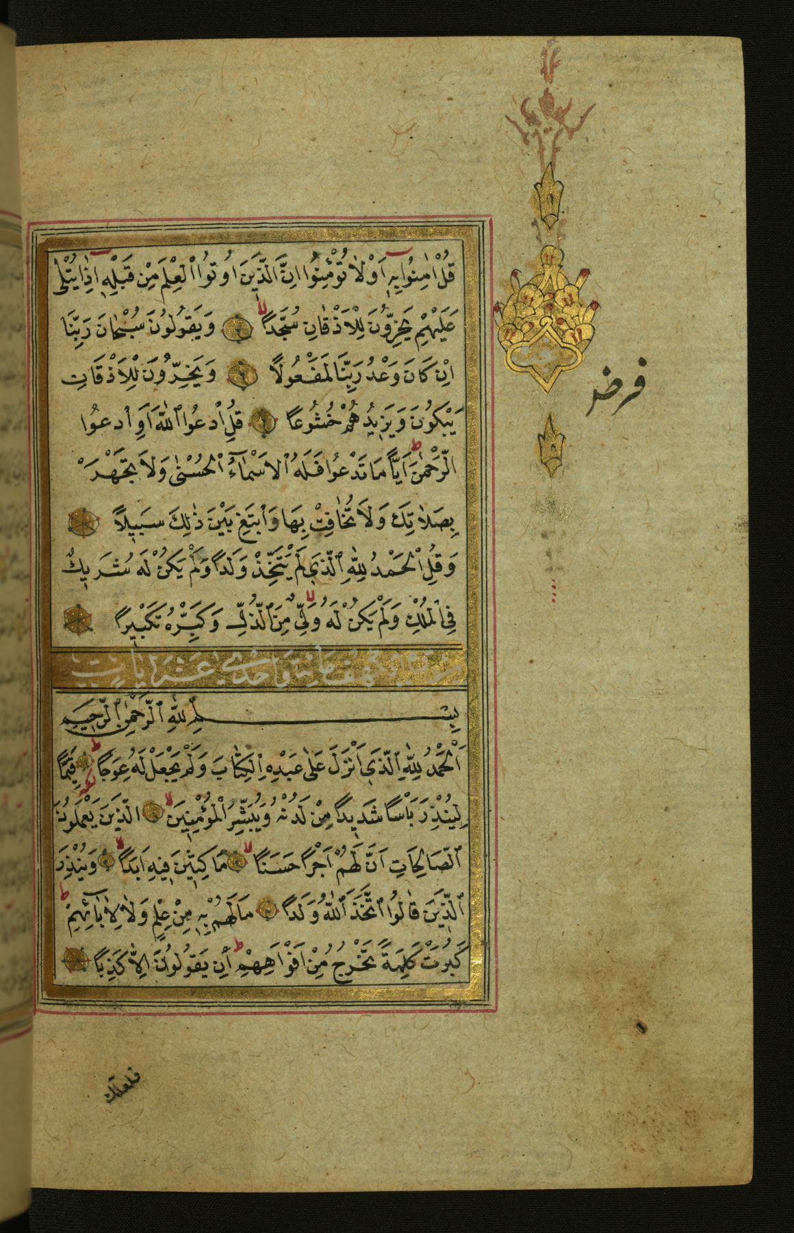 This small, illuminated single-volume copy of the Qurʾan was produced in Ottoman Turkey in 1282 AH / 1865-6 CE by Muḥammad ibn Muṣṭafá Izmīrī, a pupil of al-Rudūsī. The colophon in ijāzah script indicates that the present codex is the twenty-first copy executed by him (fol. 304b). The manuscript opens with an illuminated double-page incipit with the verses of chapters 1 (Sūrat al-fātiḥah) and 2 (Sūrat al-baqarah) (fols. 1b-2a). The text is written in naskh script in black ink with reading marks in red. Verses are separated by illuminated discs with colored dots and chapter headings are in riqāʿ script in white ink. Polychrome medallions in the margins indicate textual divisions and prostration. The binding of black leather is contemporary with the manuscript and decorated with a tooled and gold-painted geometric design enclosed by gold frames on the upper and lower boards.