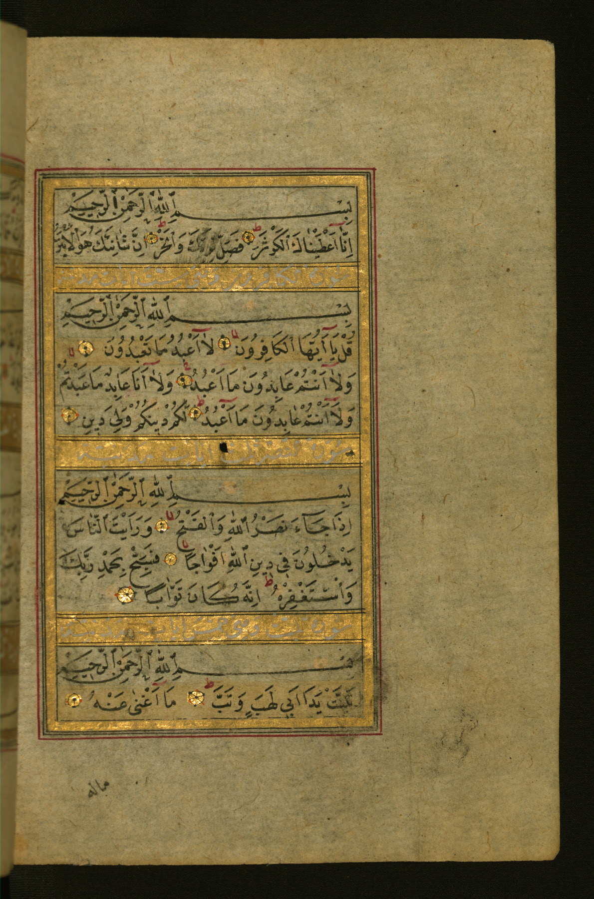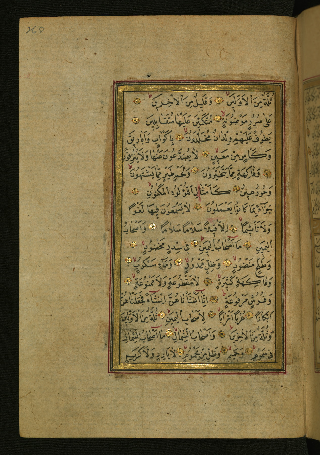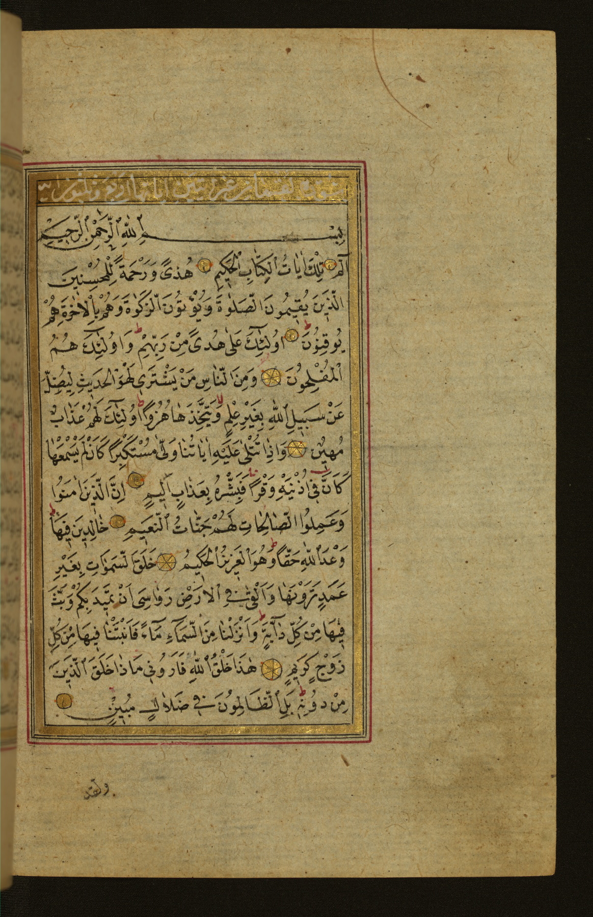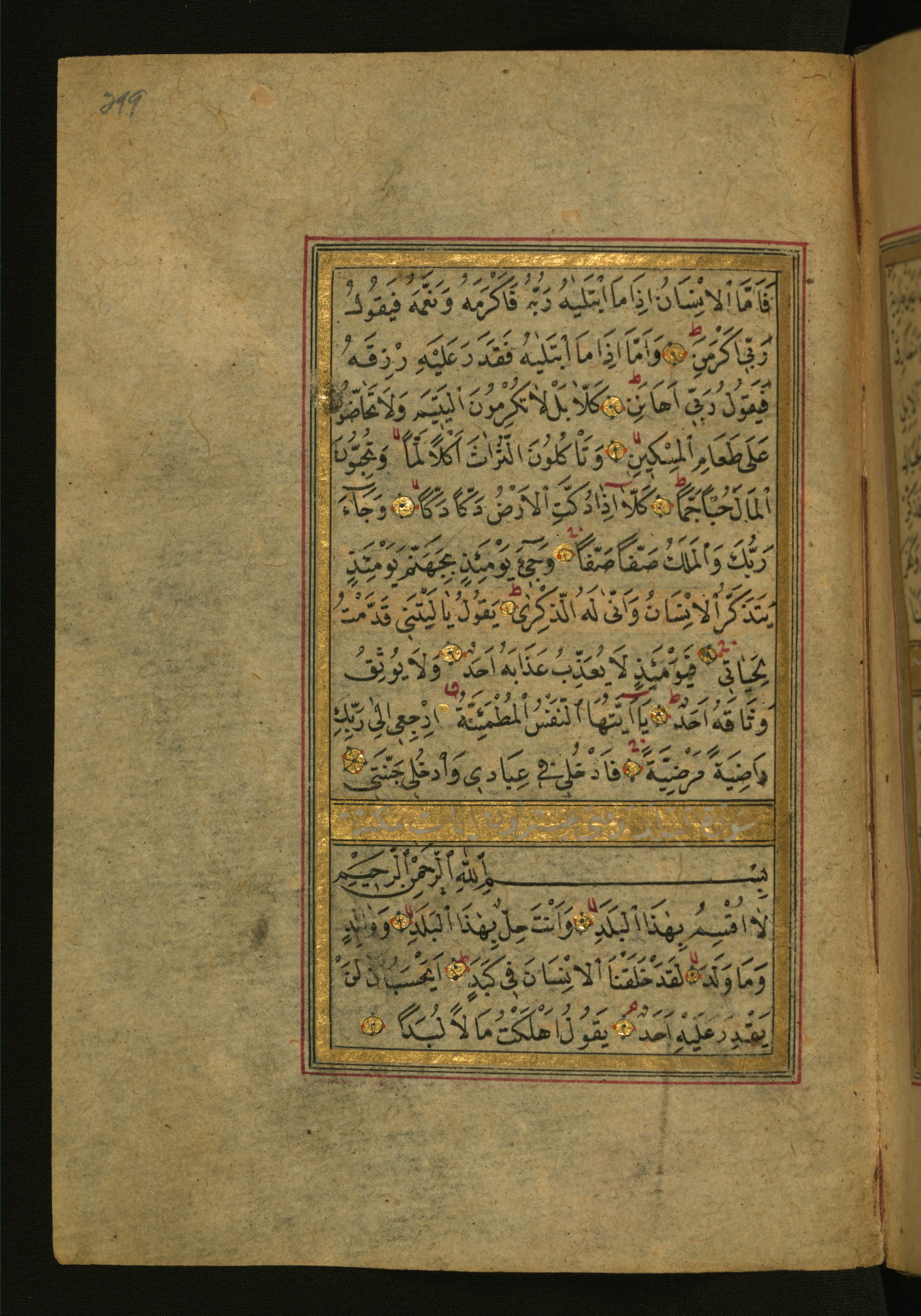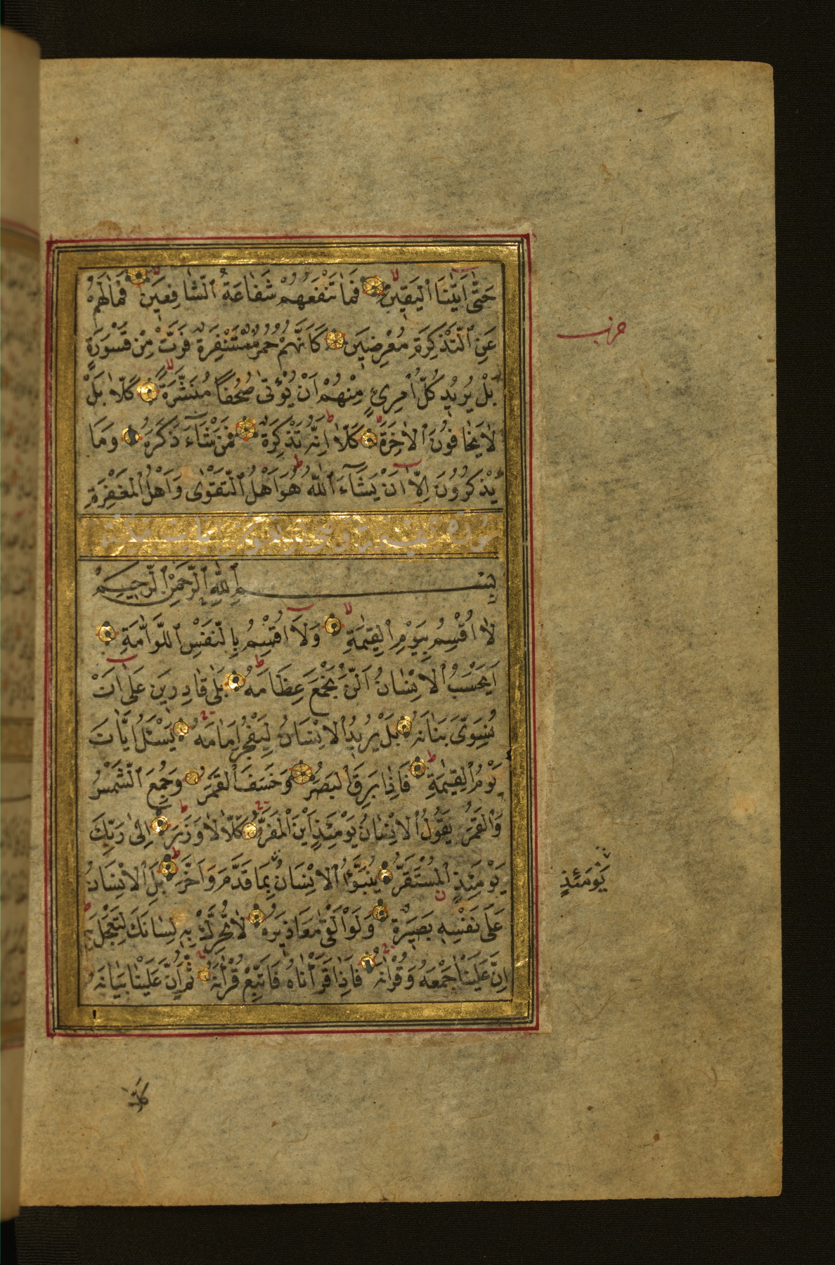 This small, illuminated single-volume copy of the Qurʾan was produced in Ottoman Turkey in 1282 AH / 1865-6 CE by Muḥammad ibn Muṣṭafá Izmīrī, a pupil of al-Rudūsī. The colophon in ijāzah script indicates that the present codex is the twenty-first copy executed by him (fol. 304b). The manuscript opens with an illuminated double-page incipit with the verses of chapters 1 (Sūrat al-fātiḥah) and 2 (Sūrat al-baqarah) (fols. 1b-2a). The text is written in naskh script in black ink with reading marks in red. Verses are separated by illuminated discs with colored dots and chapter headings are in riqāʿ script in white ink. Polychrome medallions in the margins indicate textual divisions and prostration. The binding of black leather is contemporary with the manuscript and decorated with a tooled and gold-painted geometric design enclosed by gold frames on the upper and lower boards.