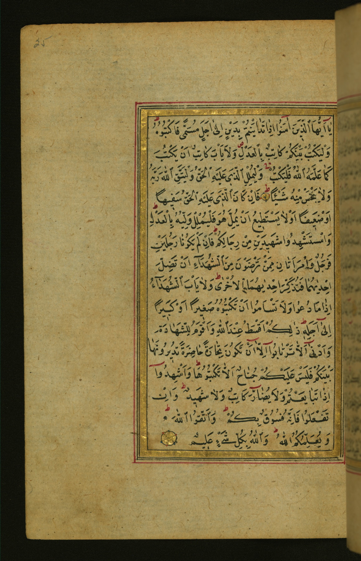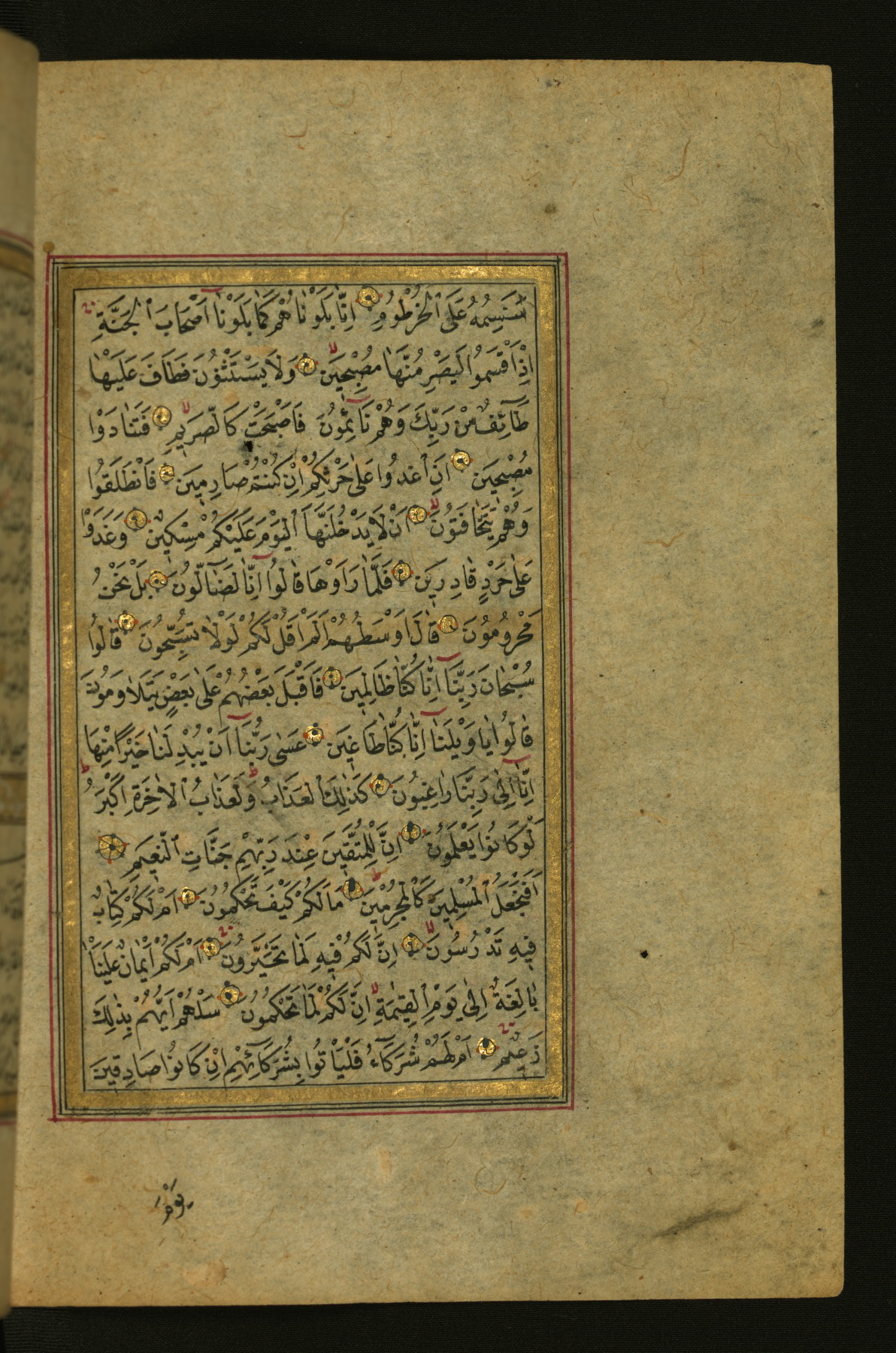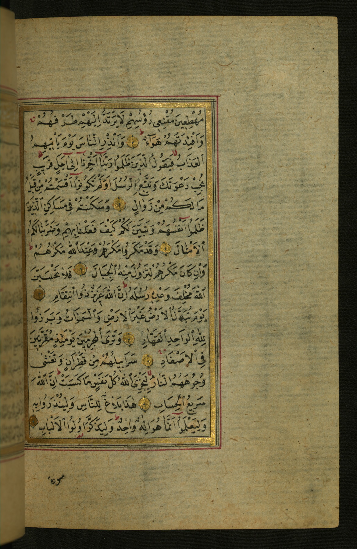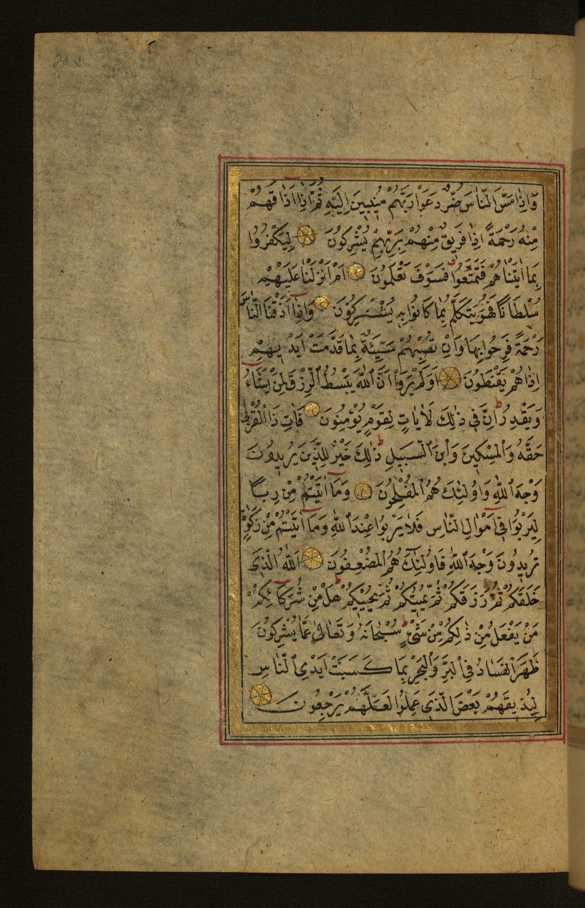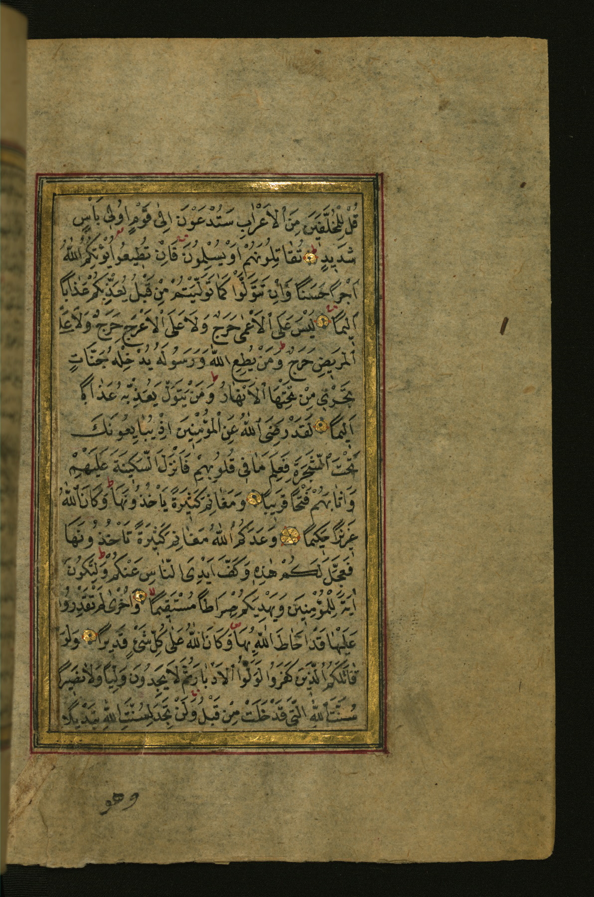 This small, illuminated single-volume copy of the Qurʾan was produced in Ottoman Turkey in 1282 AH / 1865-6 CE by Muḥammad ibn Muṣṭafá Izmīrī, a pupil of al-Rudūsī. The colophon in ijāzah script indicates that the present codex is the twenty-first copy executed by him (fol. 304b). The manuscript opens with an illuminated double-page incipit with the verses of chapters 1 (Sūrat al-fātiḥah) and 2 (Sūrat al-baqarah) (fols. 1b-2a). The text is written in naskh script in black ink with reading marks in red. Verses are separated by illuminated discs with colored dots and chapter headings are in riqāʿ script in white ink. Polychrome medallions in the margins indicate textual divisions and prostration. The binding of black leather is contemporary with the manuscript and decorated with a tooled and gold-painted geometric design enclosed by gold frames on the upper and lower boards.
