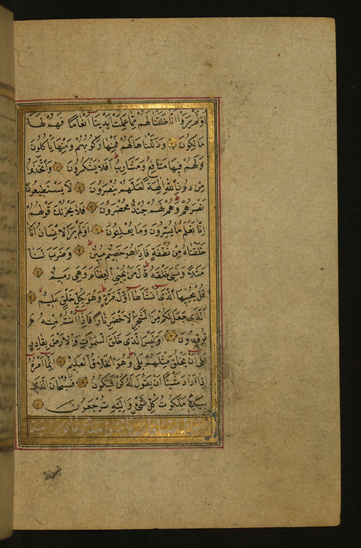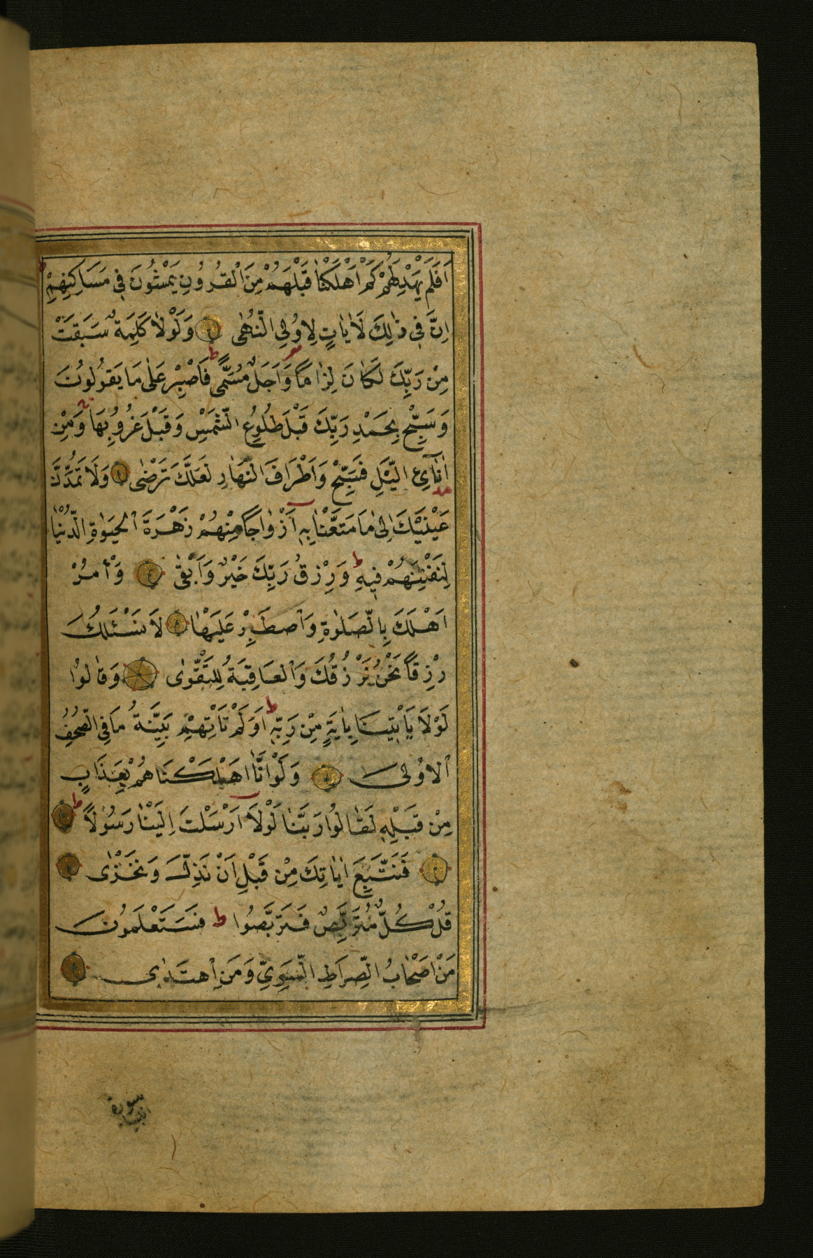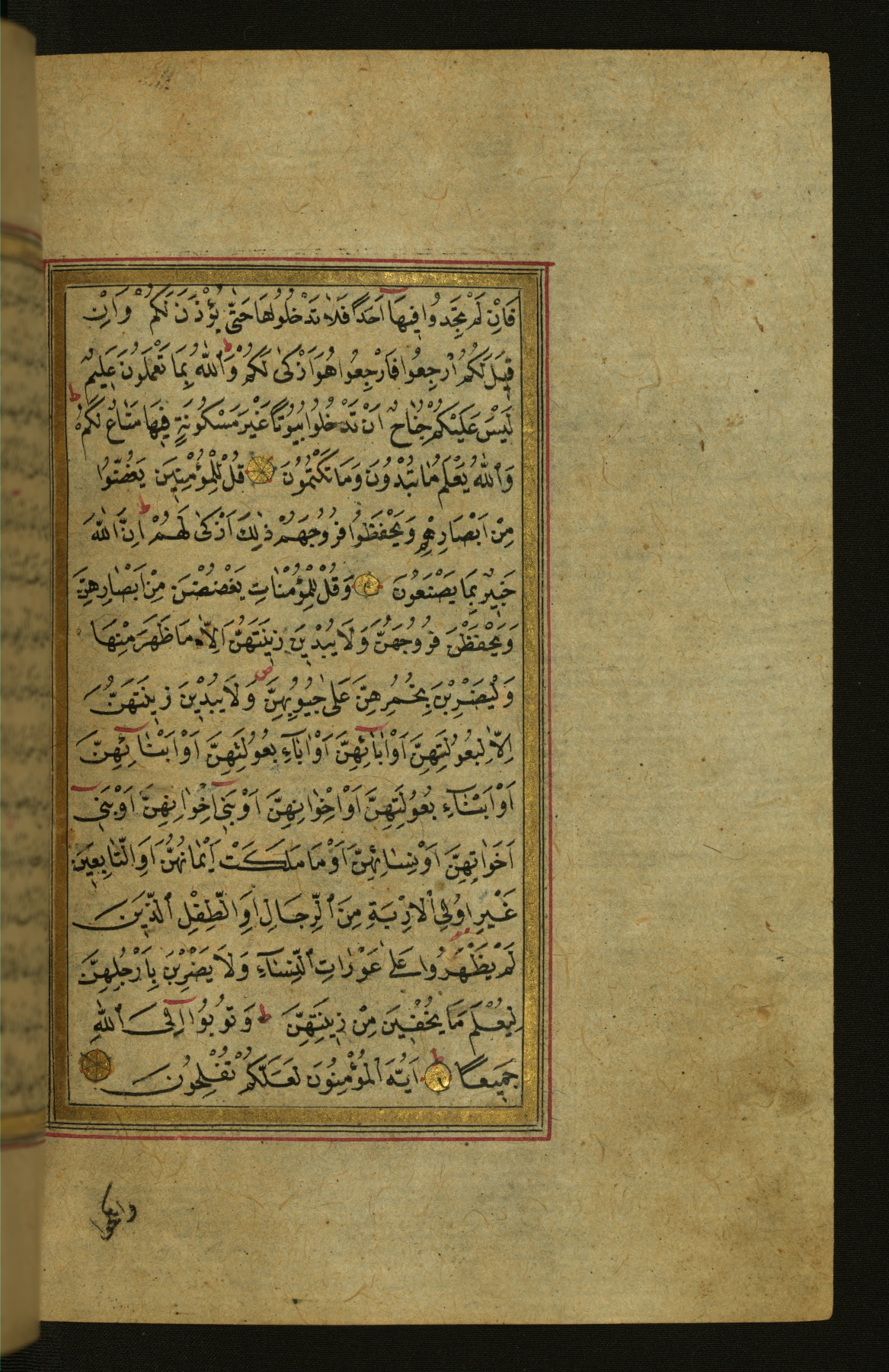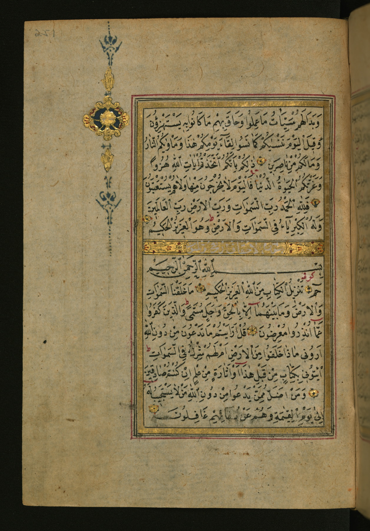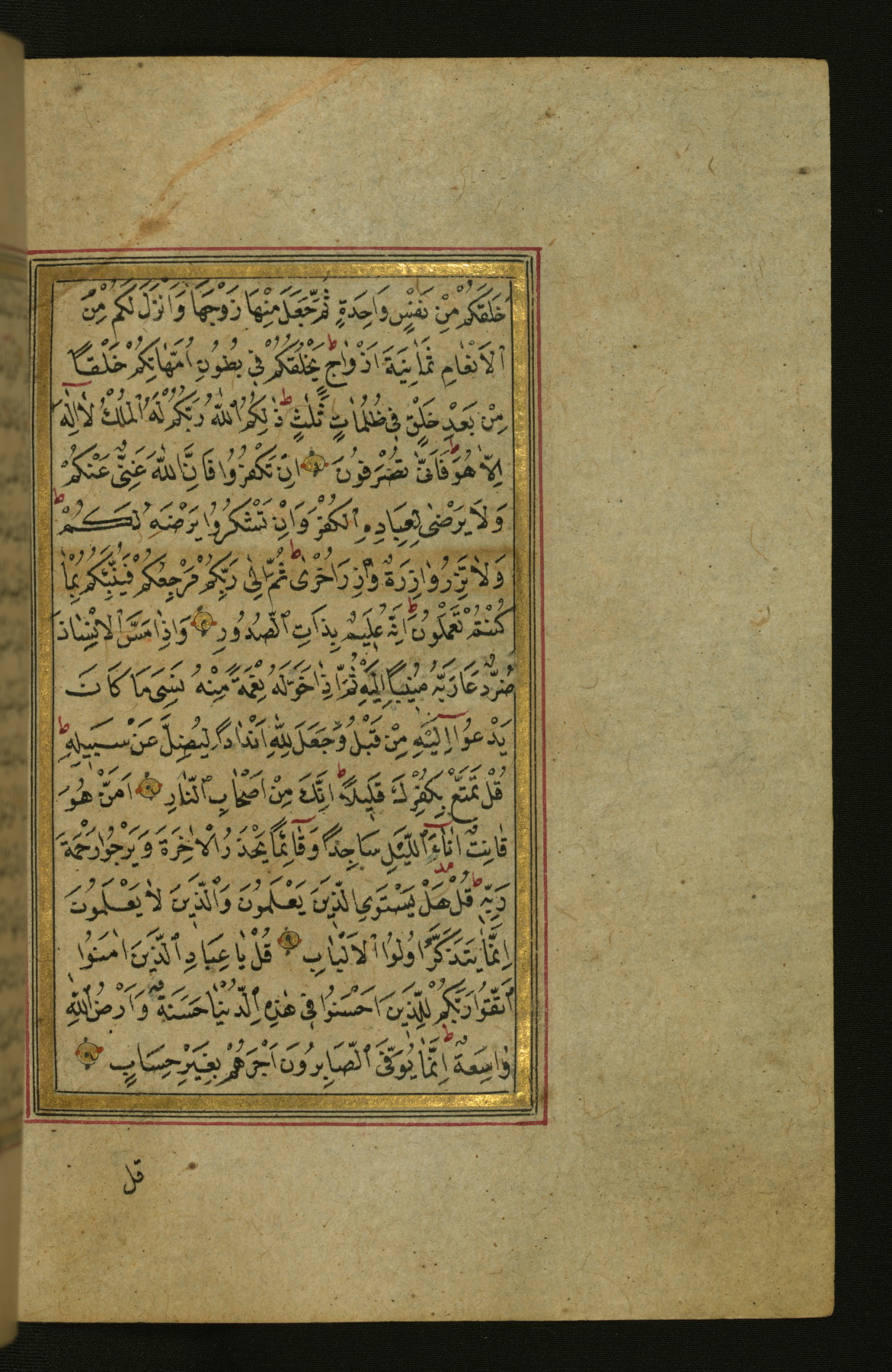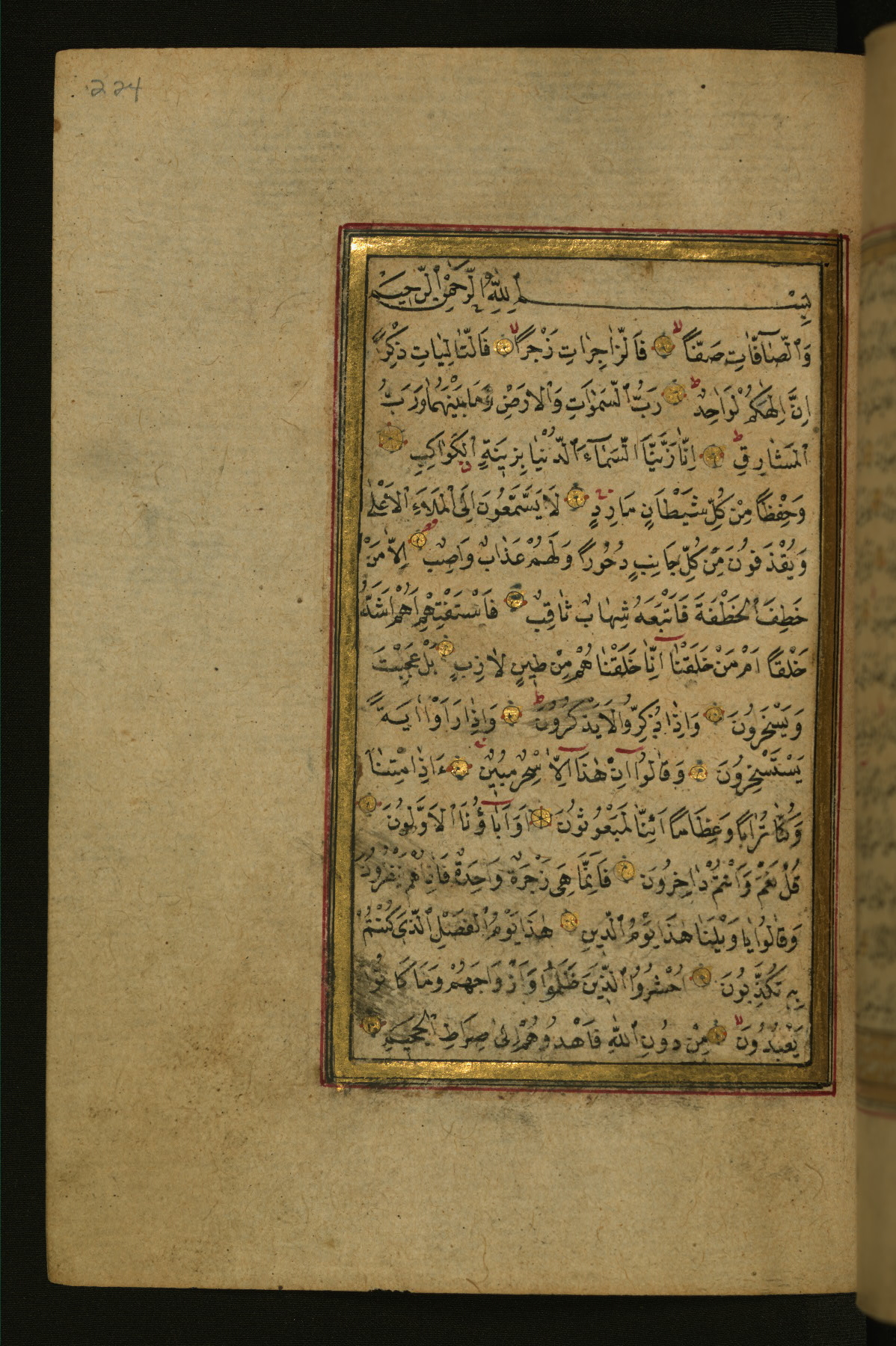 This small, illuminated single-volume copy of the Qurʾan was produced in Ottoman Turkey in 1282 AH / 1865-6 CE by Muḥammad ibn Muṣṭafá Izmīrī, a pupil of al-Rudūsī. The colophon in ijāzah script indicates that the present codex is the twenty-first copy executed by him (fol. 304b). The manuscript opens with an illuminated double-page incipit with the verses of chapters 1 (Sūrat al-fātiḥah) and 2 (Sūrat al-baqarah) (fols. 1b-2a). The text is written in naskh script in black ink with reading marks in red. Verses are separated by illuminated discs with colored dots and chapter headings are in riqāʿ script in white ink. Polychrome medallions in the margins indicate textual divisions and prostration. The binding of black leather is contemporary with the manuscript and decorated with a tooled and gold-painted geometric design enclosed by gold frames on the upper and lower boards.