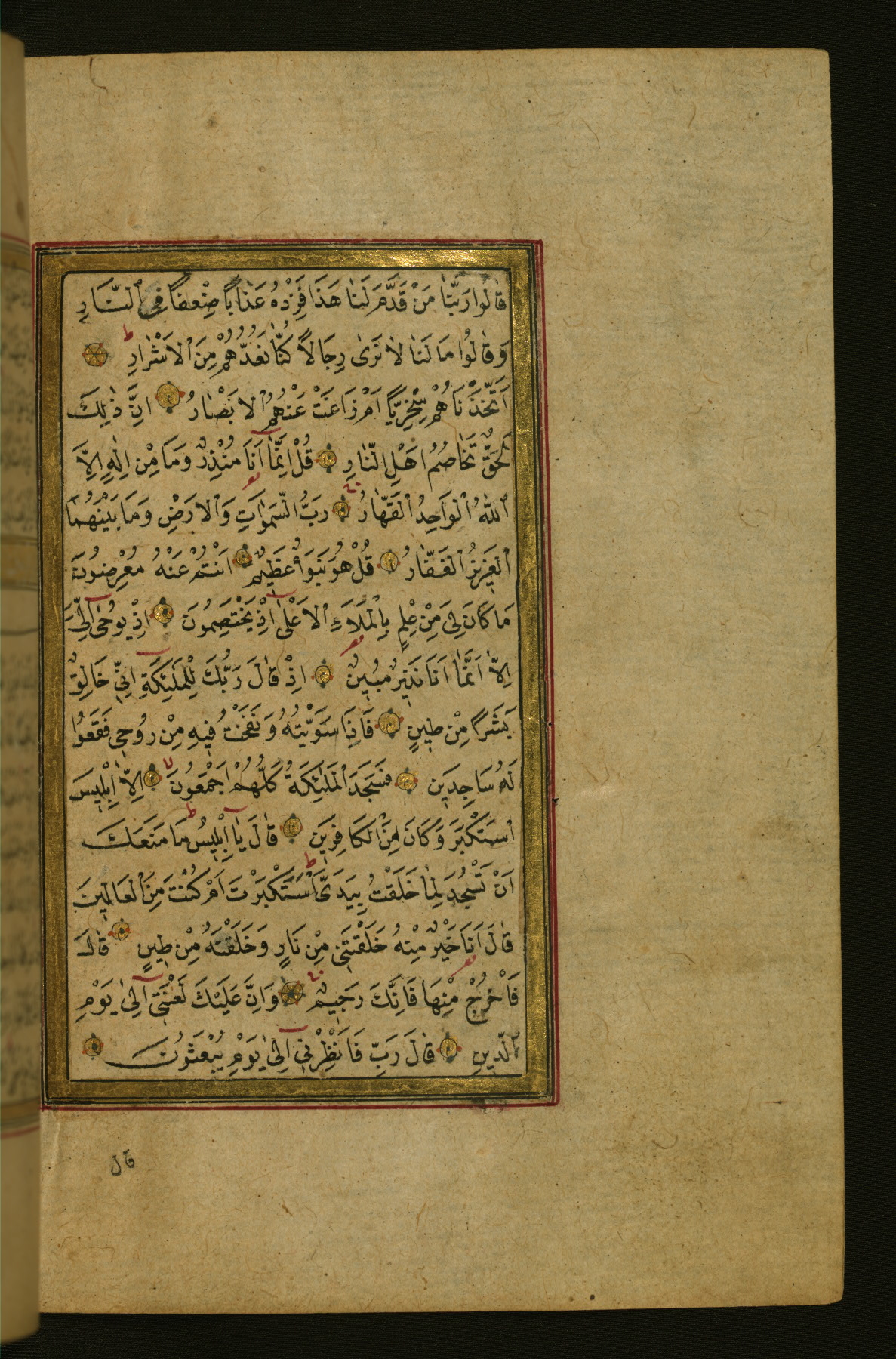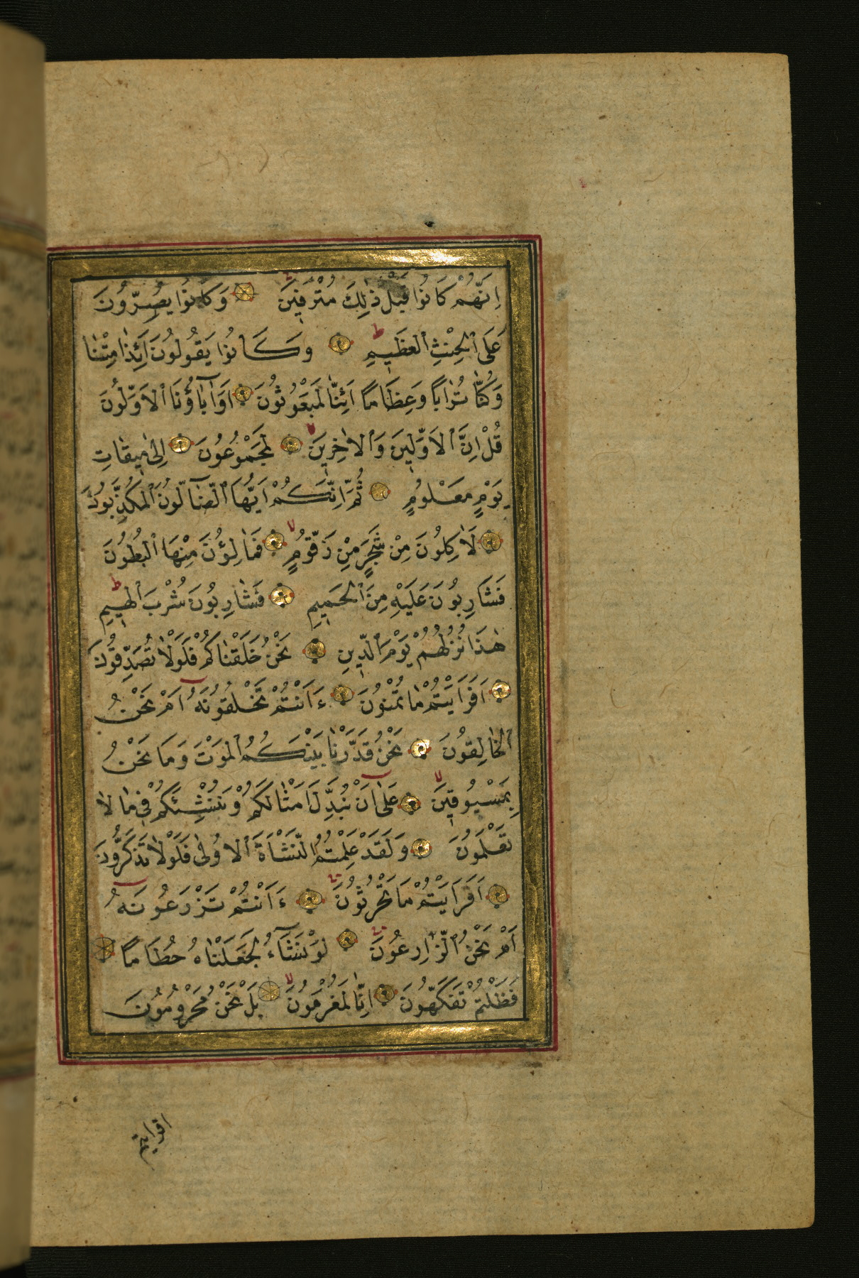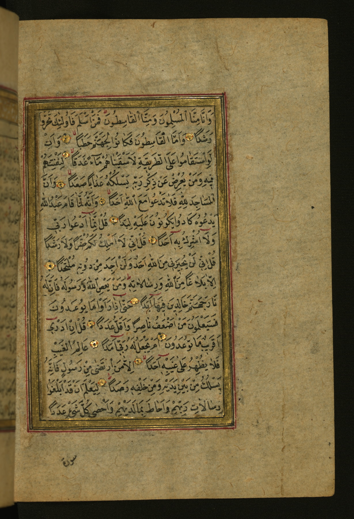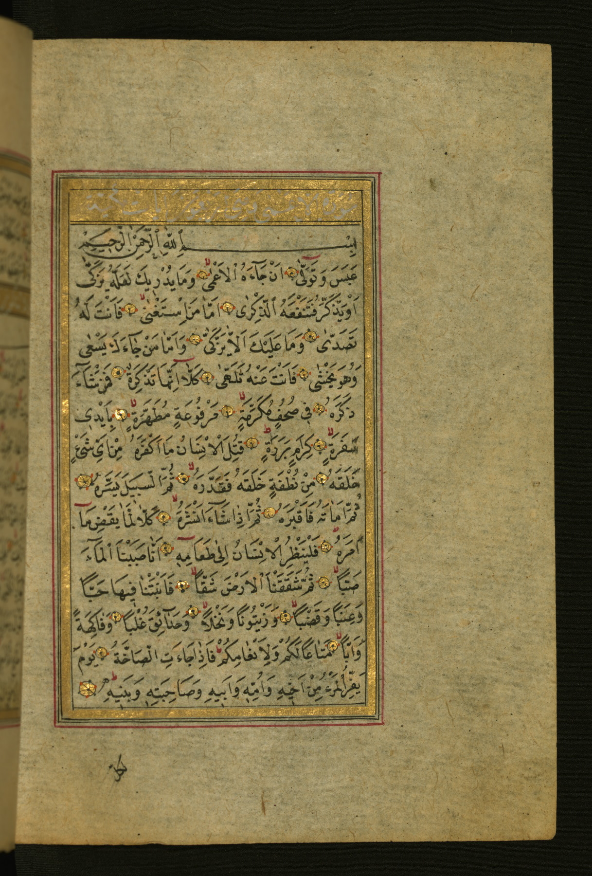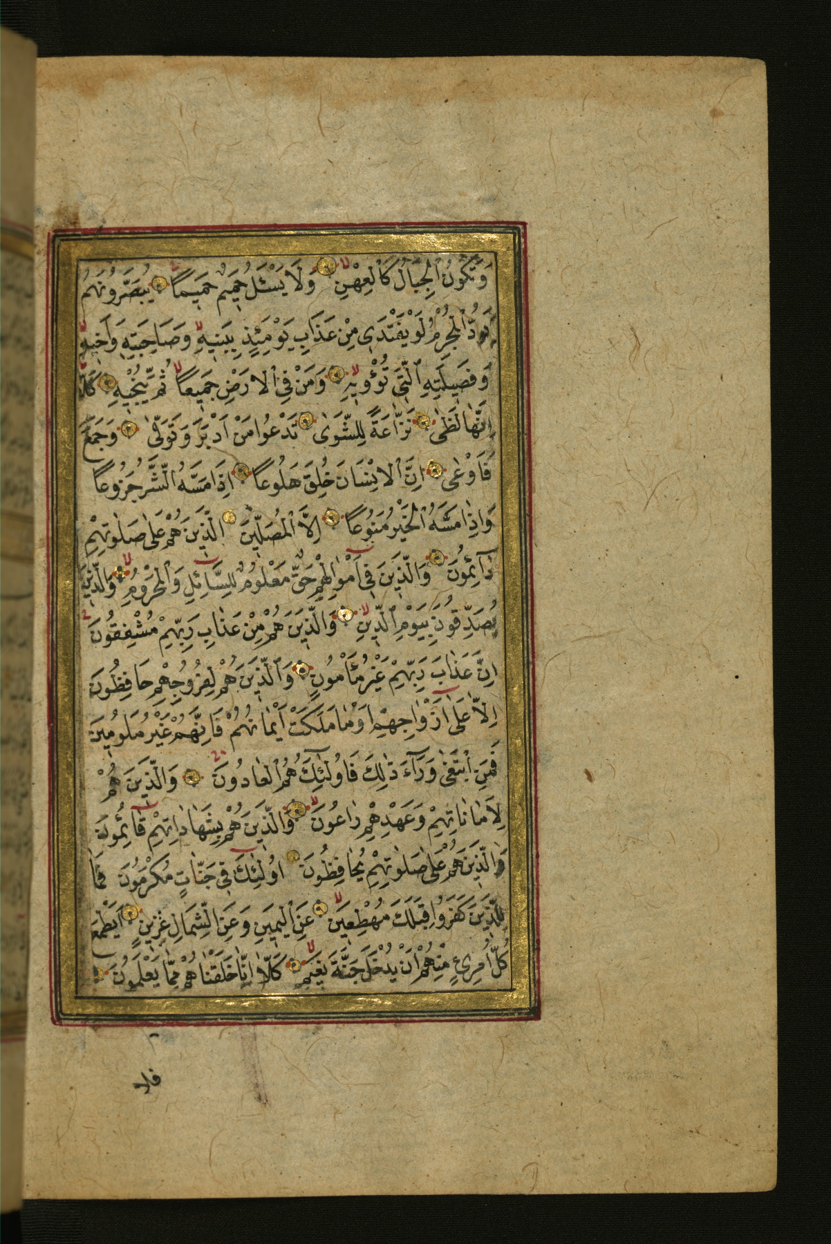 This small, illuminated single-volume copy of the Qurʾan was produced in Ottoman Turkey in 1282 AH / 1865-6 CE by Muḥammad ibn Muṣṭafá Izmīrī, a pupil of al-Rudūsī. The colophon in ijāzah script indicates that the present codex is the twenty-first copy executed by him (fol. 304b). The manuscript opens with an illuminated double-page incipit with the verses of chapters 1 (Sūrat al-fātiḥah) and 2 (Sūrat al-baqarah) (fols. 1b-2a). The text is written in naskh script in black ink with reading marks in red. Verses are separated by illuminated discs with colored dots and chapter headings are in riqāʿ script in white ink. Polychrome medallions in the margins indicate textual divisions and prostration. The binding of black leather is contemporary with the manuscript and decorated with a tooled and gold-painted geometric design enclosed by gold frames on the upper and lower boards.