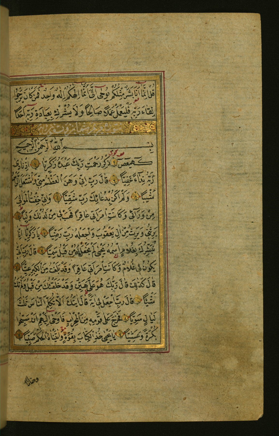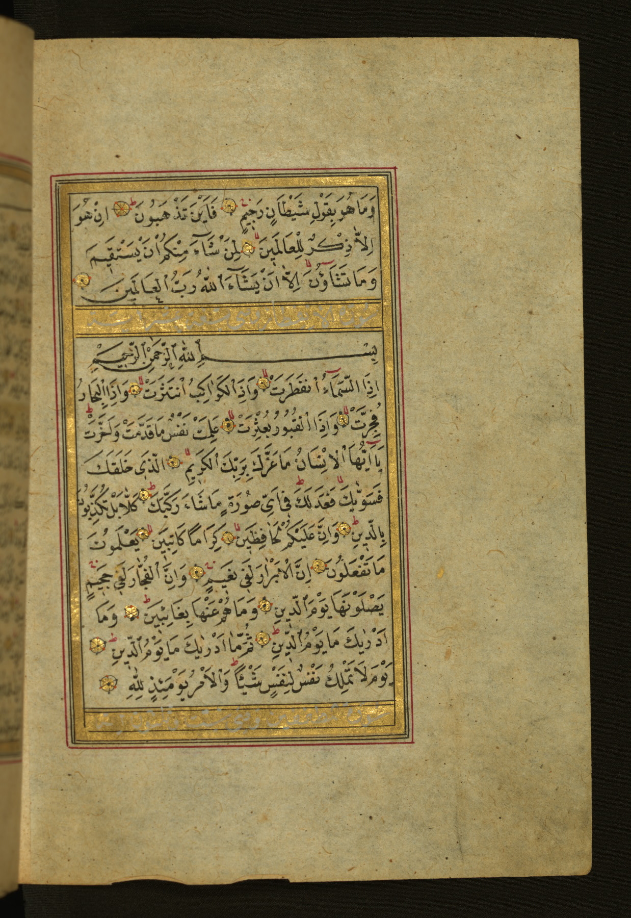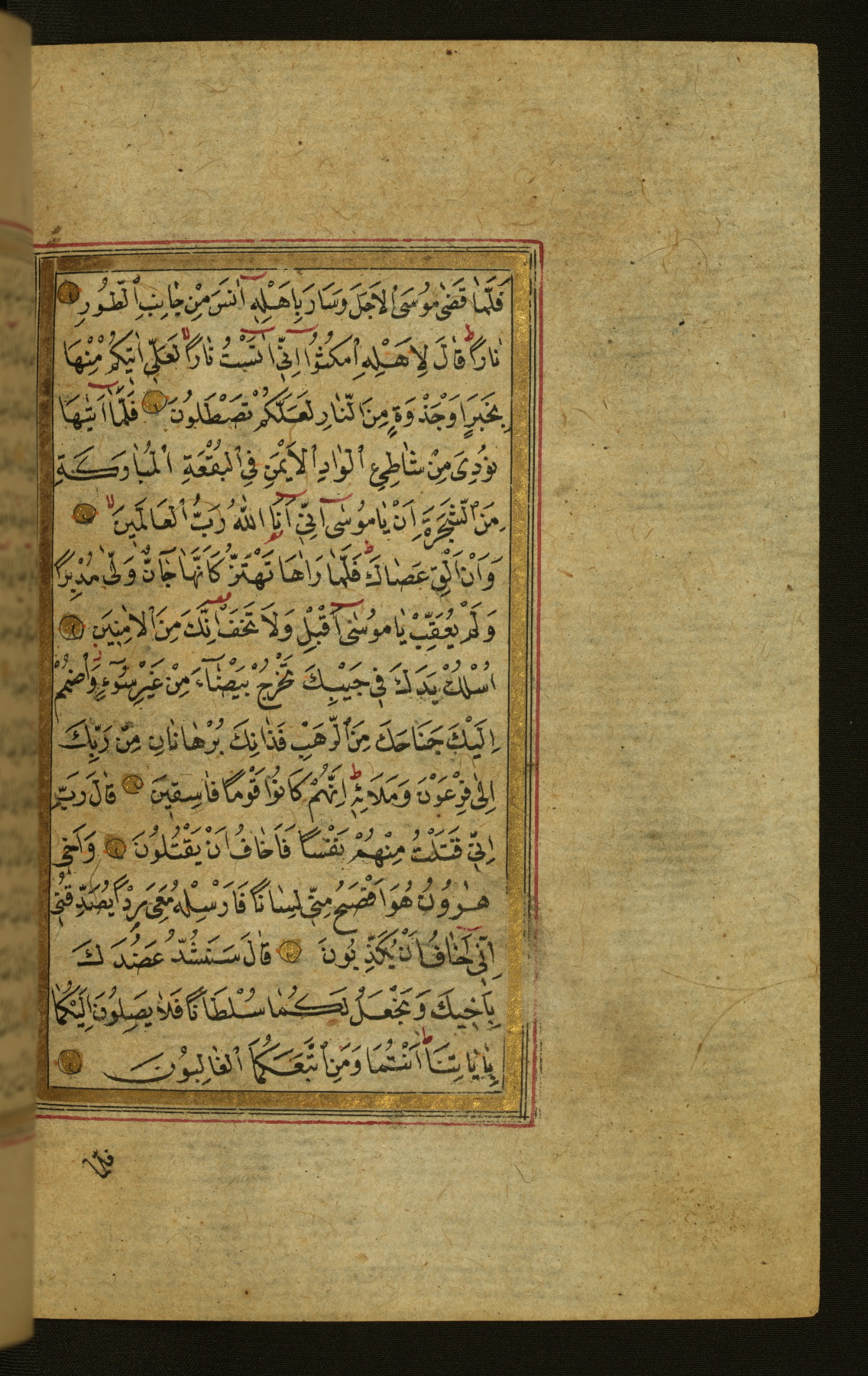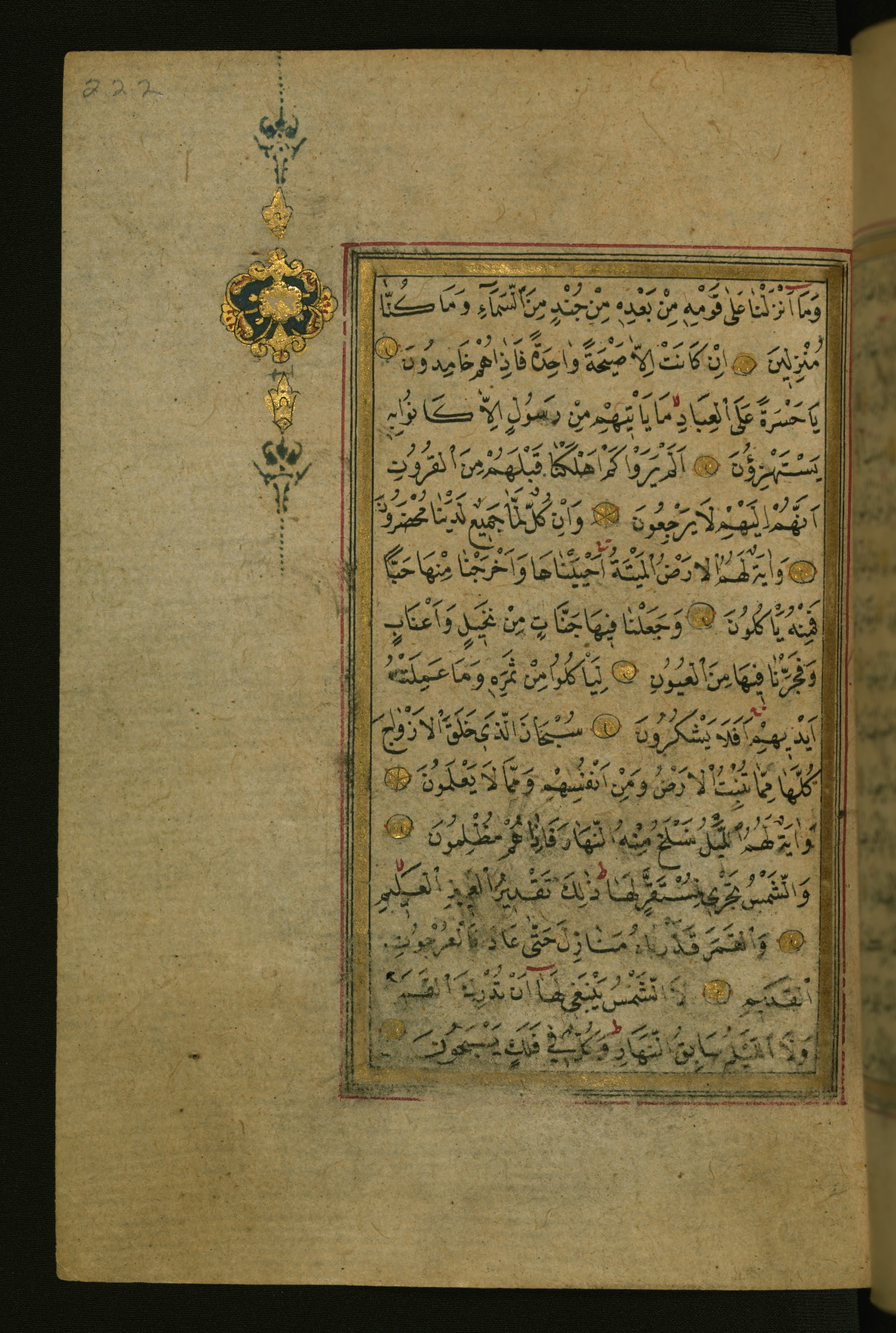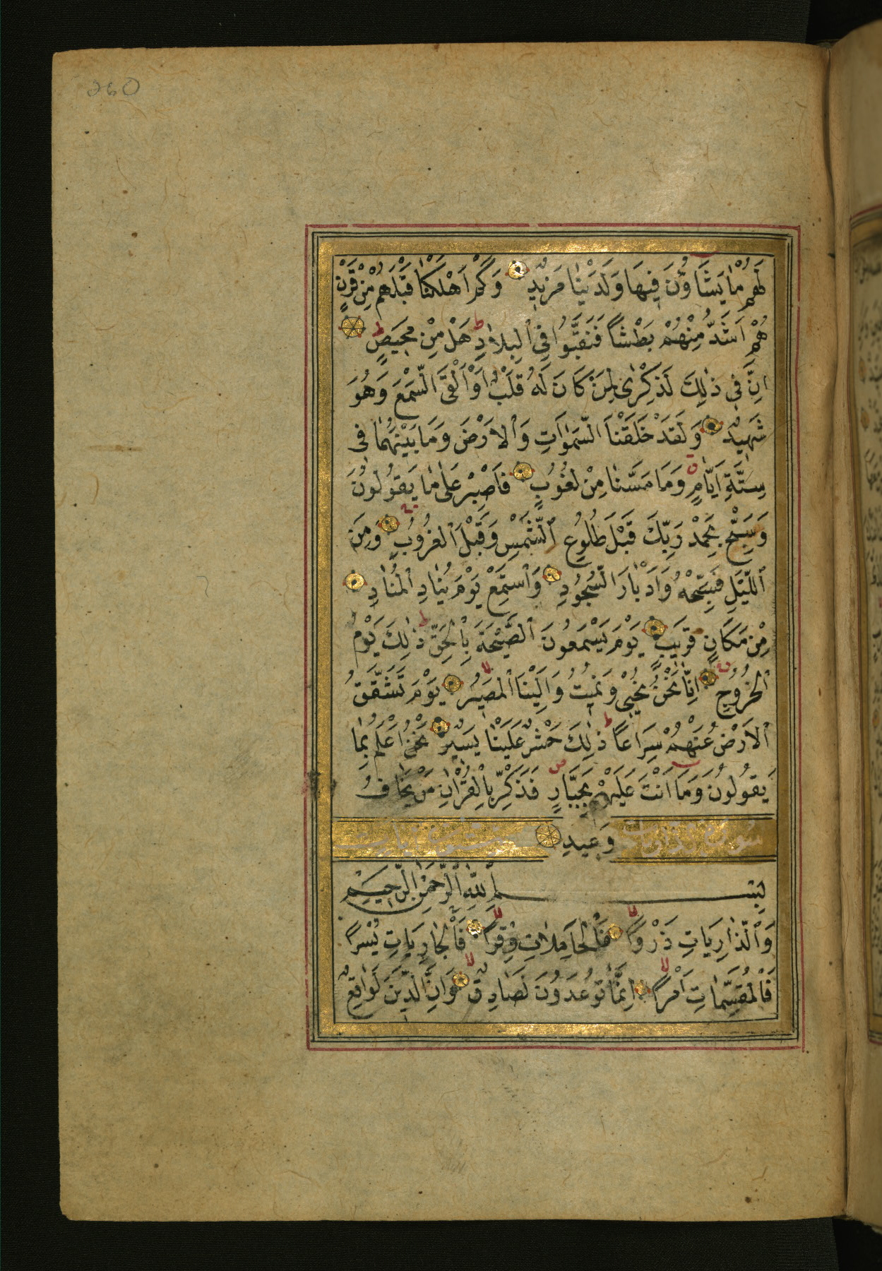 This small, illuminated single-volume copy of the Qurʾan was produced in Ottoman Turkey in 1282 AH / 1865-6 CE by Muḥammad ibn Muṣṭafá Izmīrī, a pupil of al-Rudūsī. The colophon in ijāzah script indicates that the present codex is the twenty-first copy executed by him (fol. 304b). The manuscript opens with an illuminated double-page incipit with the verses of chapters 1 (Sūrat al-fātiḥah) and 2 (Sūrat al-baqarah) (fols. 1b-2a). The text is written in naskh script in black ink with reading marks in red. Verses are separated by illuminated discs with colored dots and chapter headings are in riqāʿ script in white ink. Polychrome medallions in the margins indicate textual divisions and prostration. The binding of black leather is contemporary with the manuscript and decorated with a tooled and gold-painted geometric design enclosed by gold frames on the upper and lower boards.