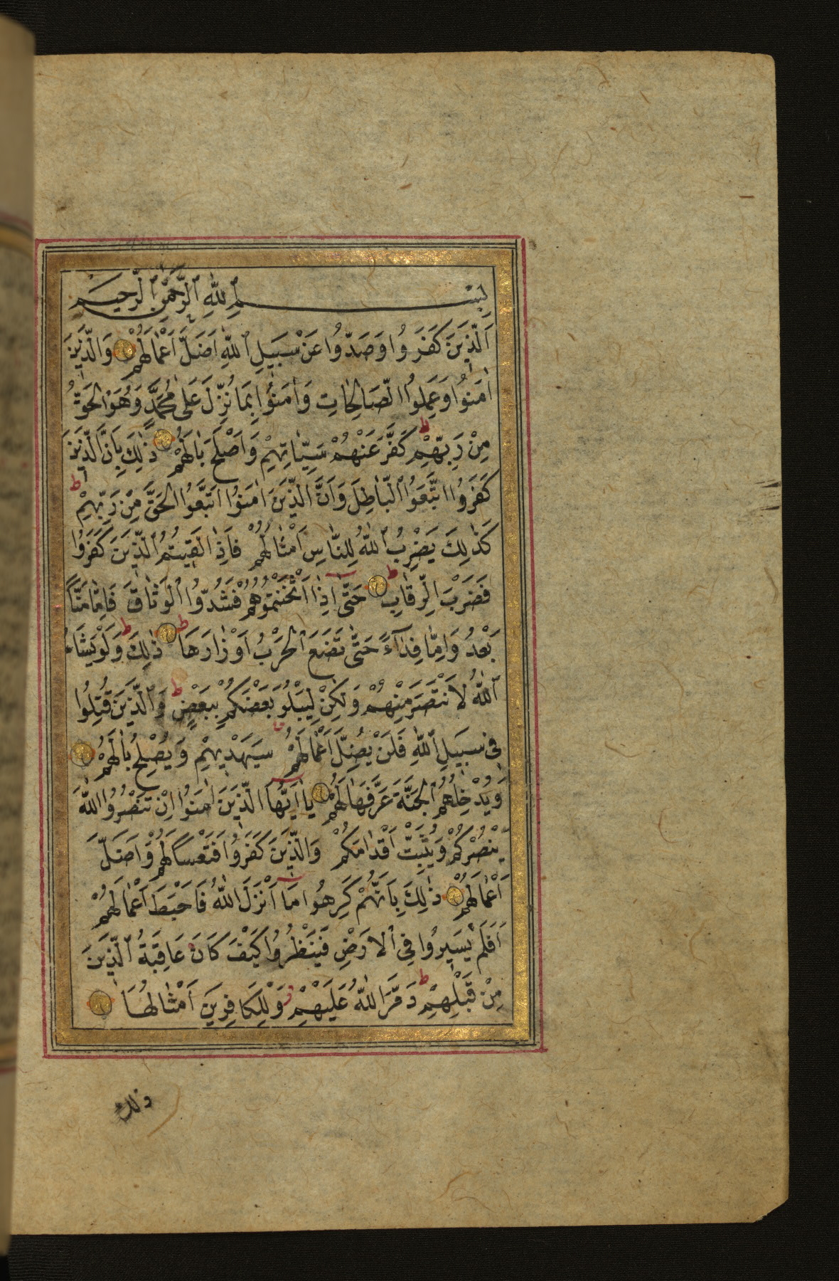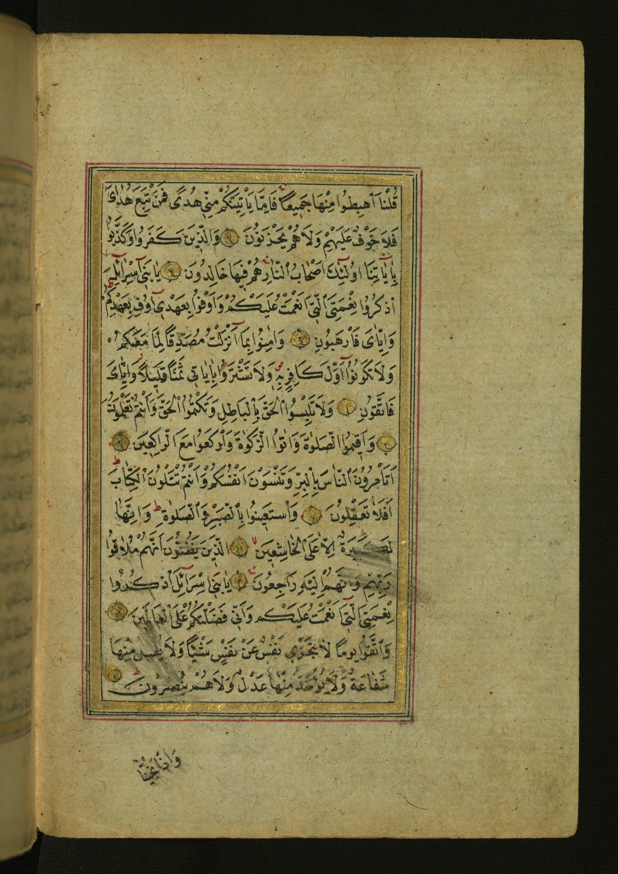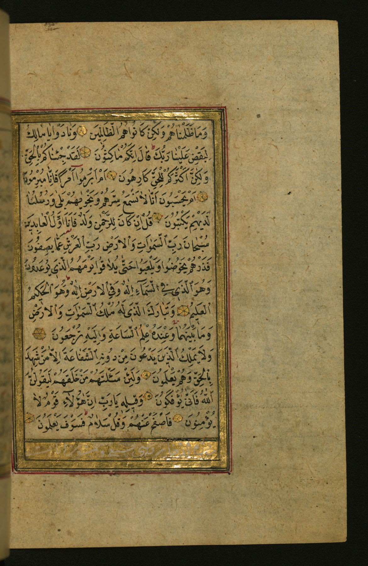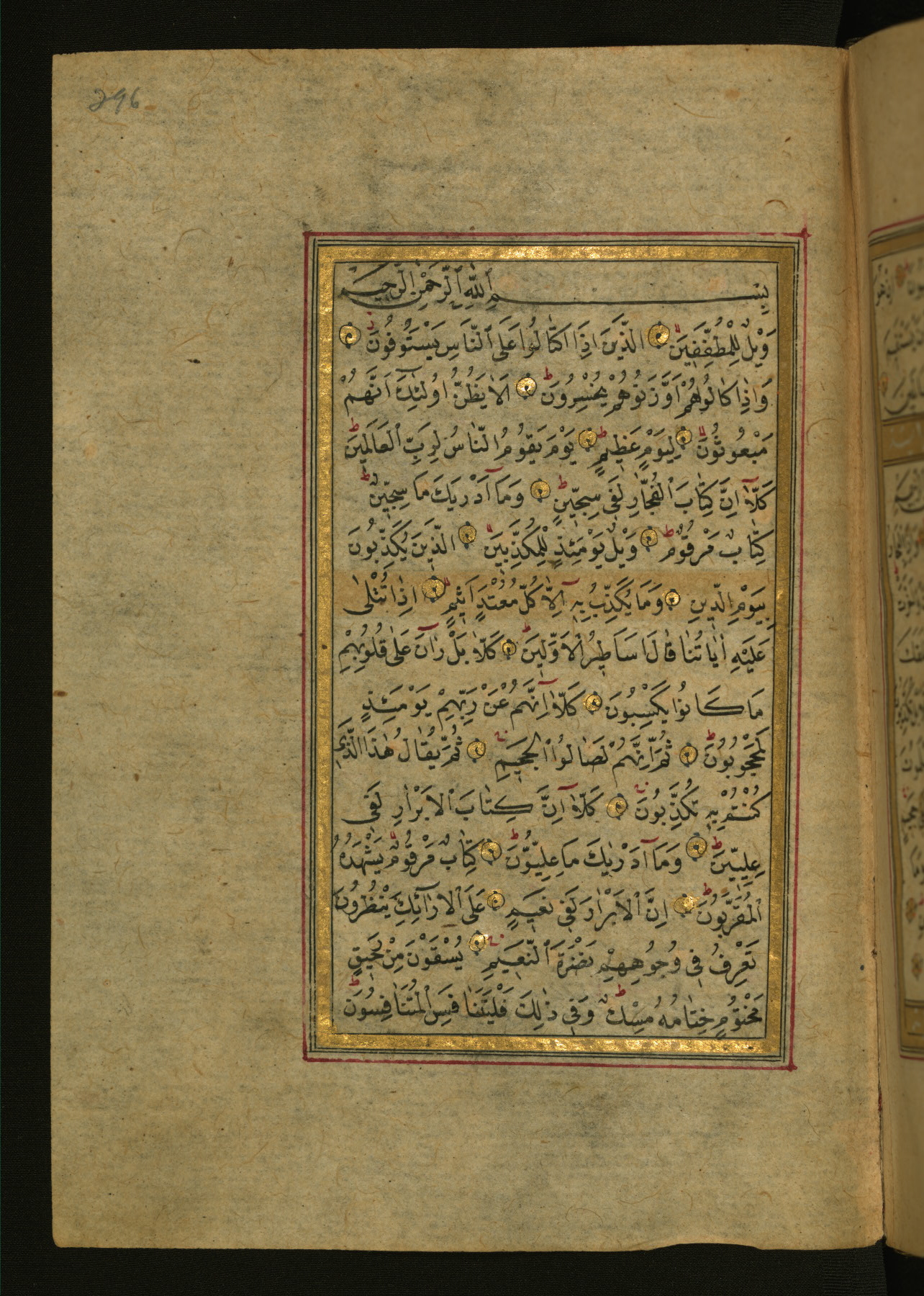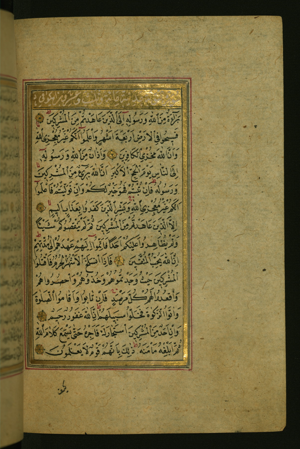 This small, illuminated single-volume copy of the Qurʾan was produced in Ottoman Turkey in 1282 AH / 1865-6 CE by Muḥammad ibn Muṣṭafá Izmīrī, a pupil of al-Rudūsī. The colophon in ijāzah script indicates that the present codex is the twenty-first copy executed by him (fol. 304b). The manuscript opens with an illuminated double-page incipit with the verses of chapters 1 (Sūrat al-fātiḥah) and 2 (Sūrat al-baqarah) (fols. 1b-2a). The text is written in naskh script in black ink with reading marks in red. Verses are separated by illuminated discs with colored dots and chapter headings are in riqāʿ script in white ink. Polychrome medallions in the margins indicate textual divisions and prostration. The binding of black leather is contemporary with the manuscript and decorated with a tooled and gold-painted geometric design enclosed by gold frames on the upper and lower boards.