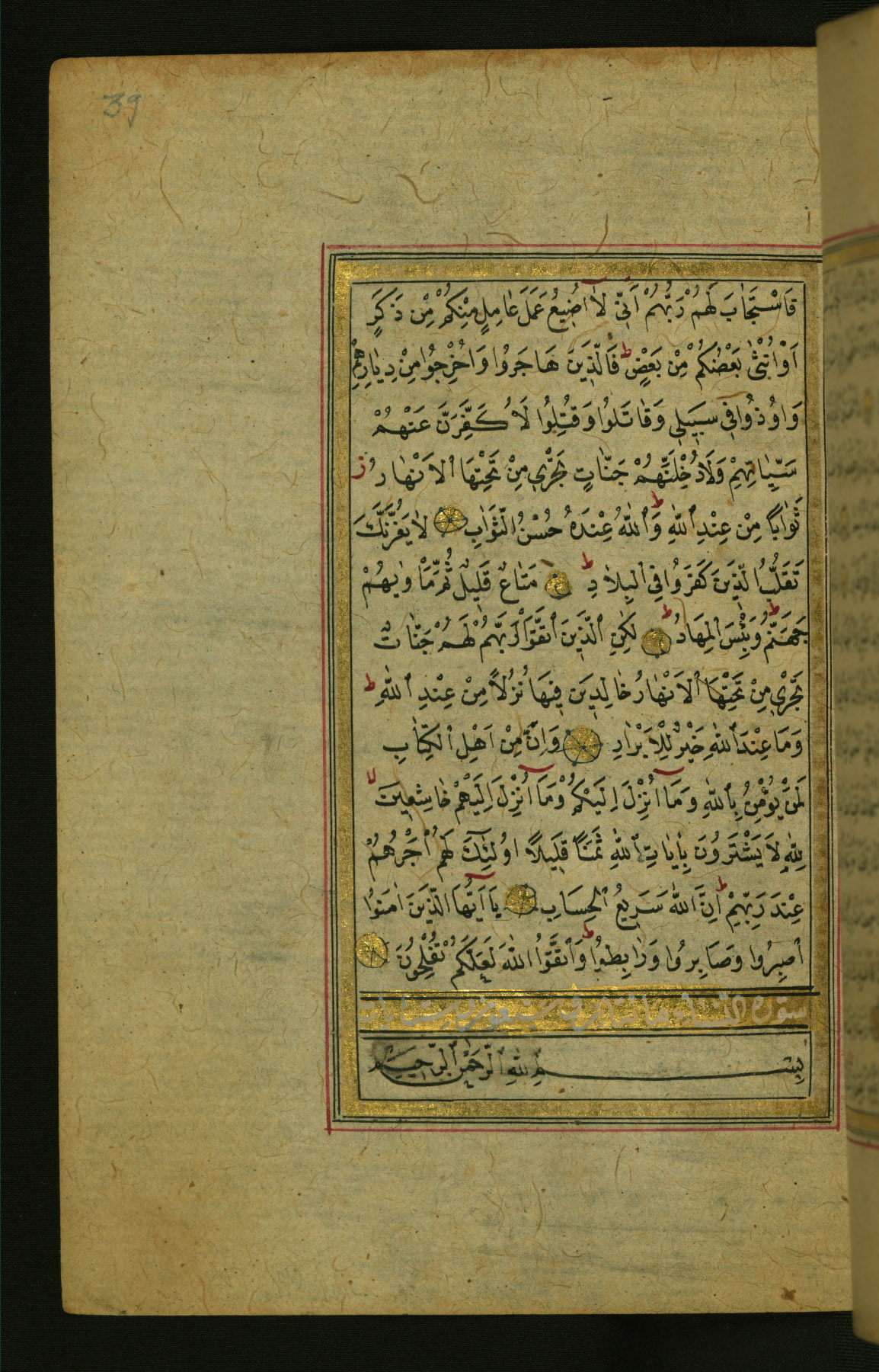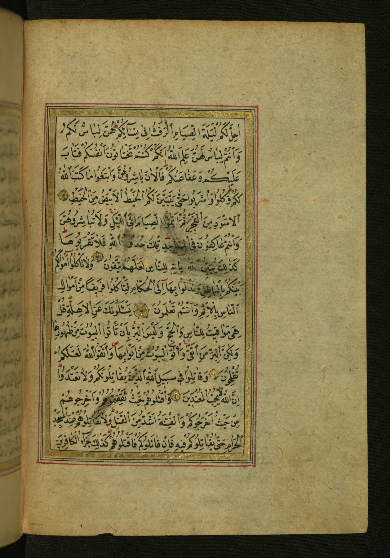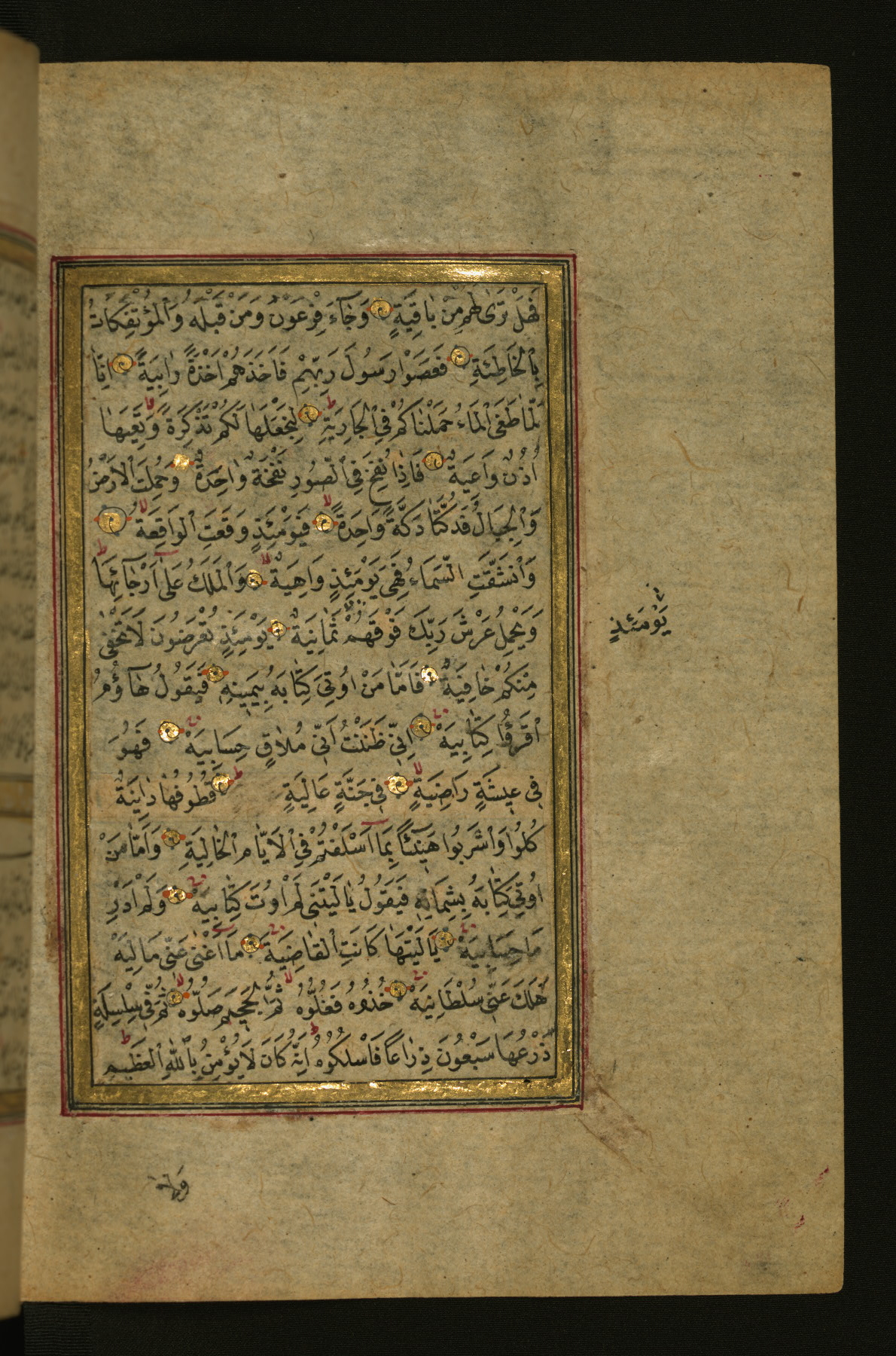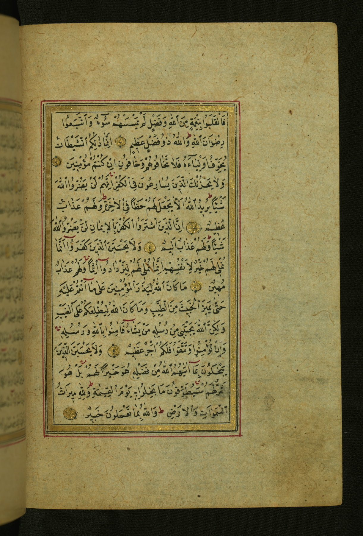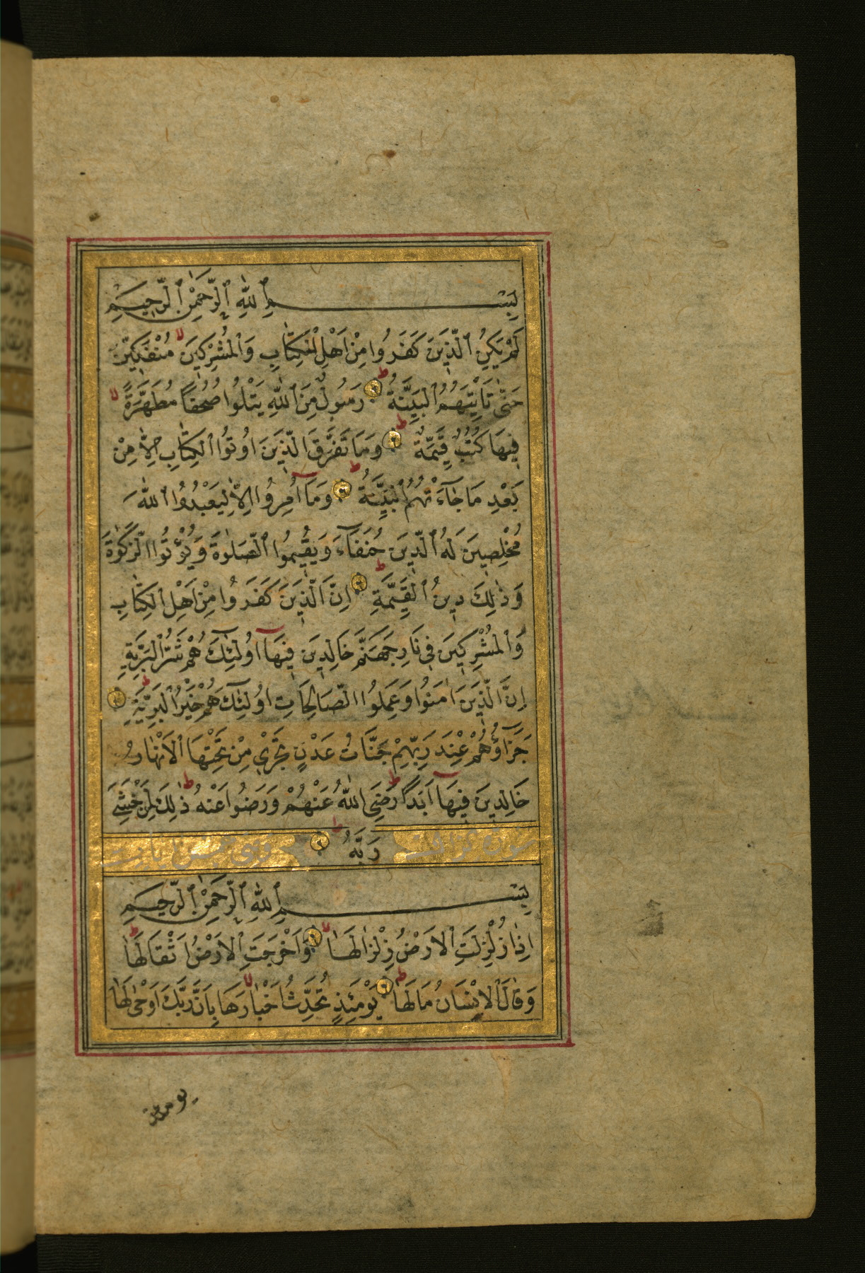 This small, illuminated single-volume copy of the Qurʾan was produced in Ottoman Turkey in 1282 AH / 1865-6 CE by Muḥammad ibn Muṣṭafá Izmīrī, a pupil of al-Rudūsī. The colophon in ijāzah script indicates that the present codex is the twenty-first copy executed by him (fol. 304b). The manuscript opens with an illuminated double-page incipit with the verses of chapters 1 (Sūrat al-fātiḥah) and 2 (Sūrat al-baqarah) (fols. 1b-2a). The text is written in naskh script in black ink with reading marks in red. Verses are separated by illuminated discs with colored dots and chapter headings are in riqāʿ script in white ink. Polychrome medallions in the margins indicate textual divisions and prostration. The binding of black leather is contemporary with the manuscript and decorated with a tooled and gold-painted geometric design enclosed by gold frames on the upper and lower boards.