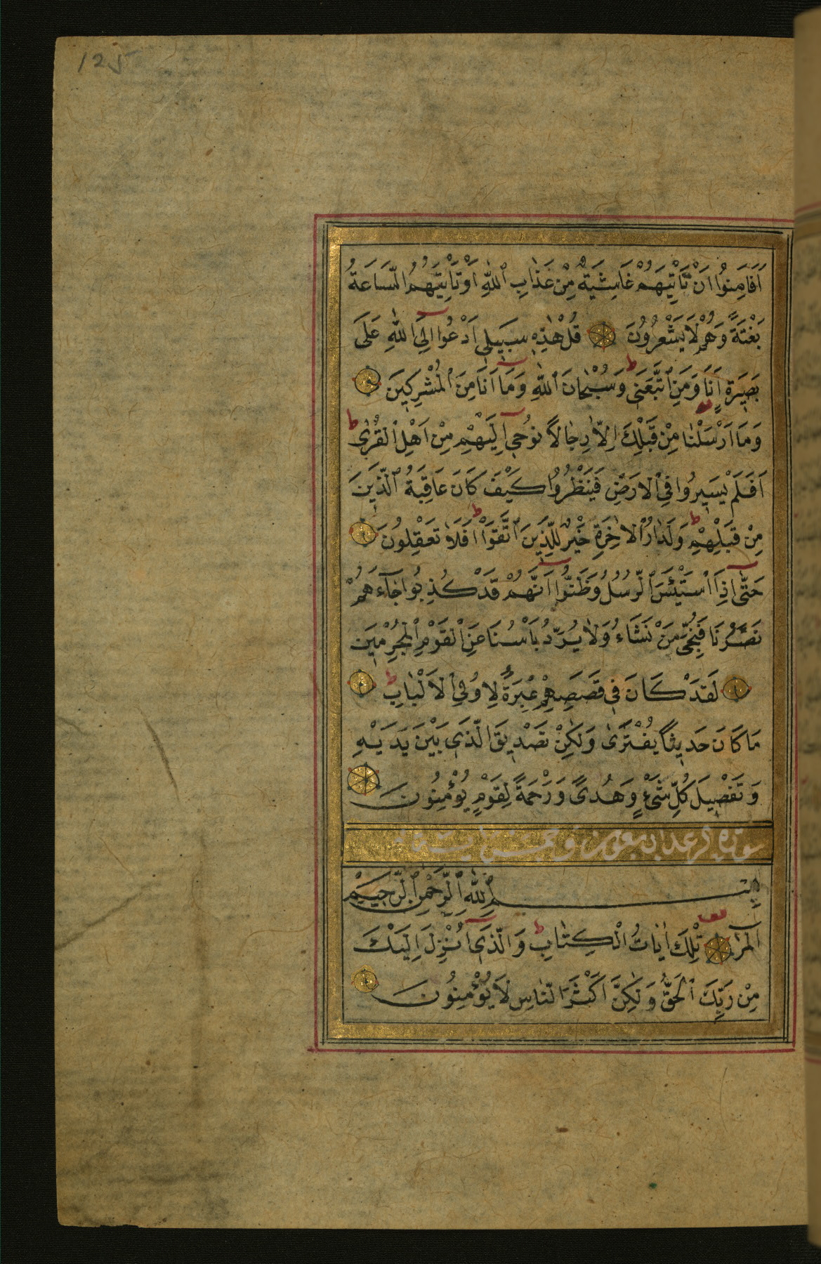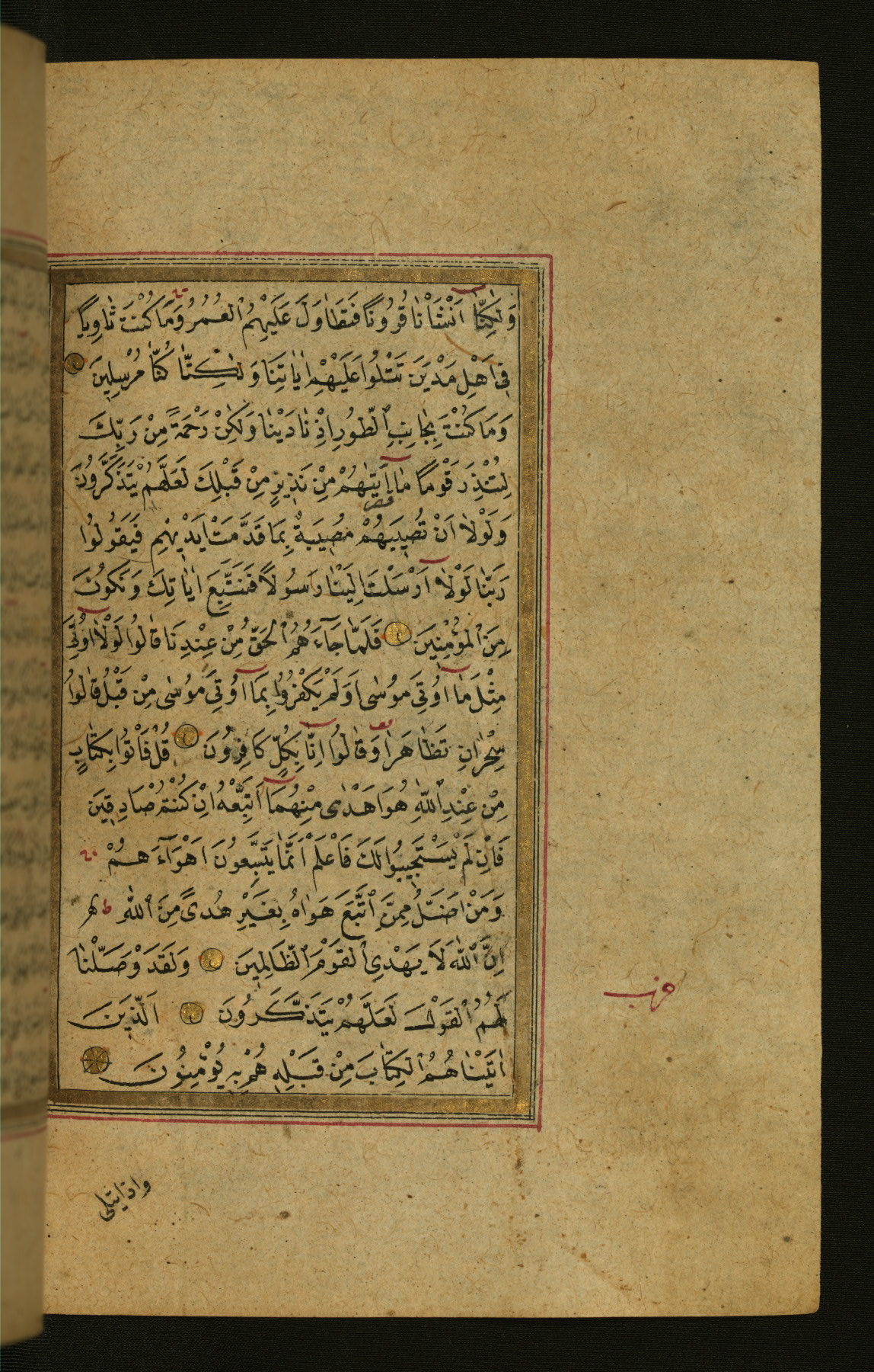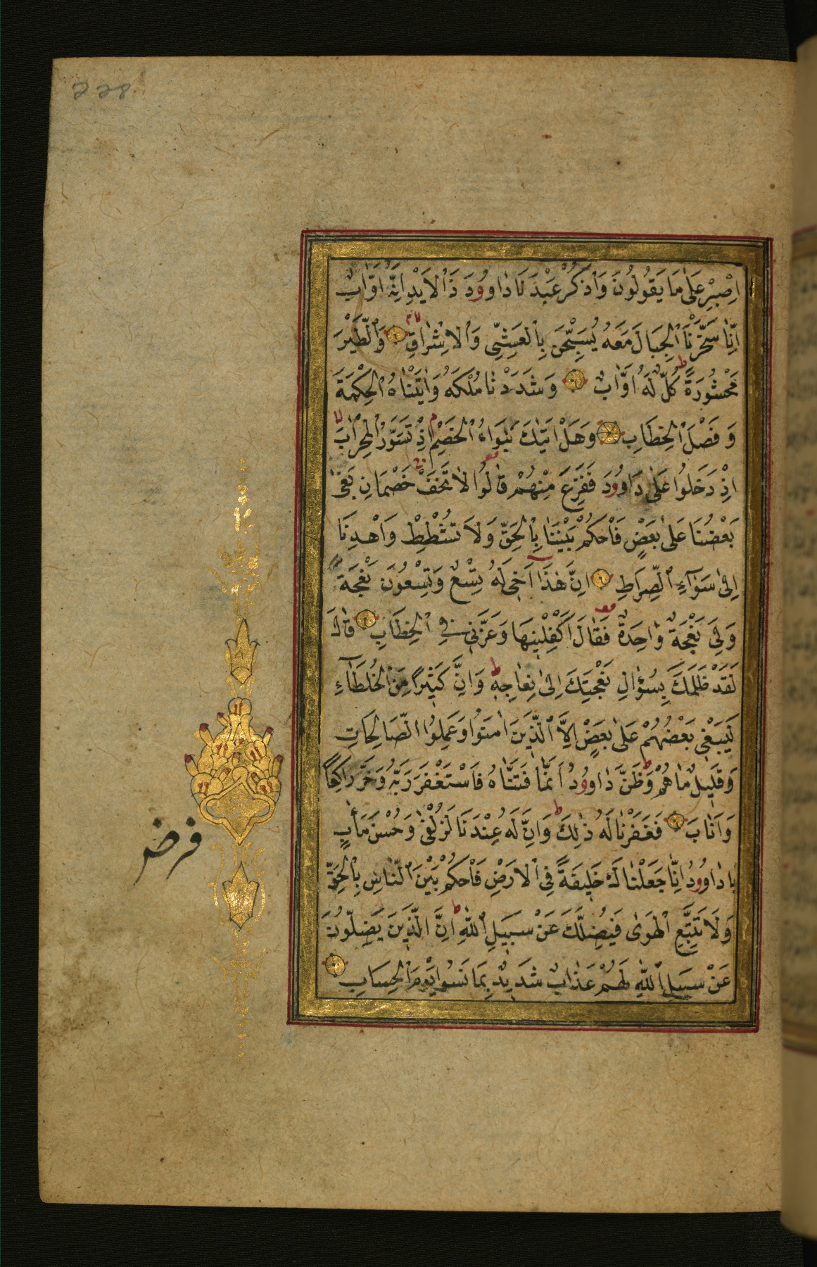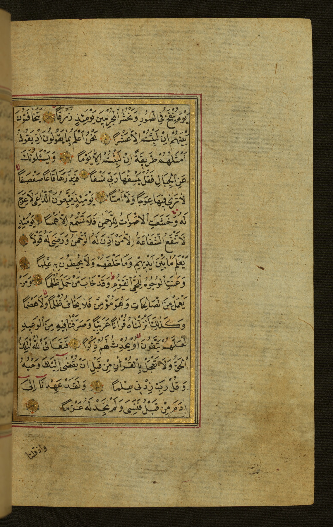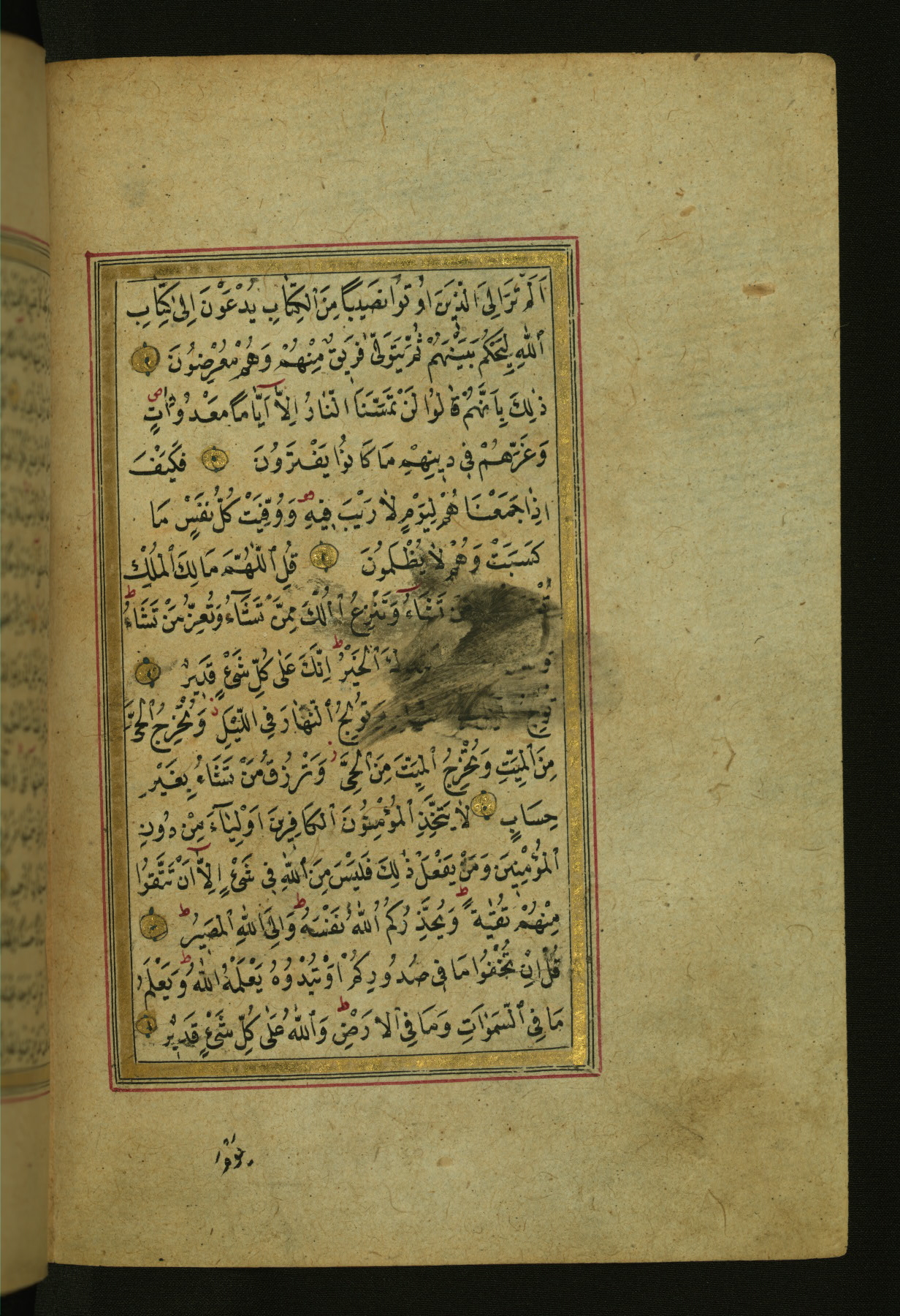 This small, illuminated single-volume copy of the Qurʾan was produced in Ottoman Turkey in 1282 AH / 1865-6 CE by Muḥammad ibn Muṣṭafá Izmīrī, a pupil of al-Rudūsī. The colophon in ijāzah script indicates that the present codex is the twenty-first copy executed by him (fol. 304b). The manuscript opens with an illuminated double-page incipit with the verses of chapters 1 (Sūrat al-fātiḥah) and 2 (Sūrat al-baqarah) (fols. 1b-2a). The text is written in naskh script in black ink with reading marks in red. Verses are separated by illuminated discs with colored dots and chapter headings are in riqāʿ script in white ink. Polychrome medallions in the margins indicate textual divisions and prostration. The binding of black leather is contemporary with the manuscript and decorated with a tooled and gold-painted geometric design enclosed by gold frames on the upper and lower boards.
