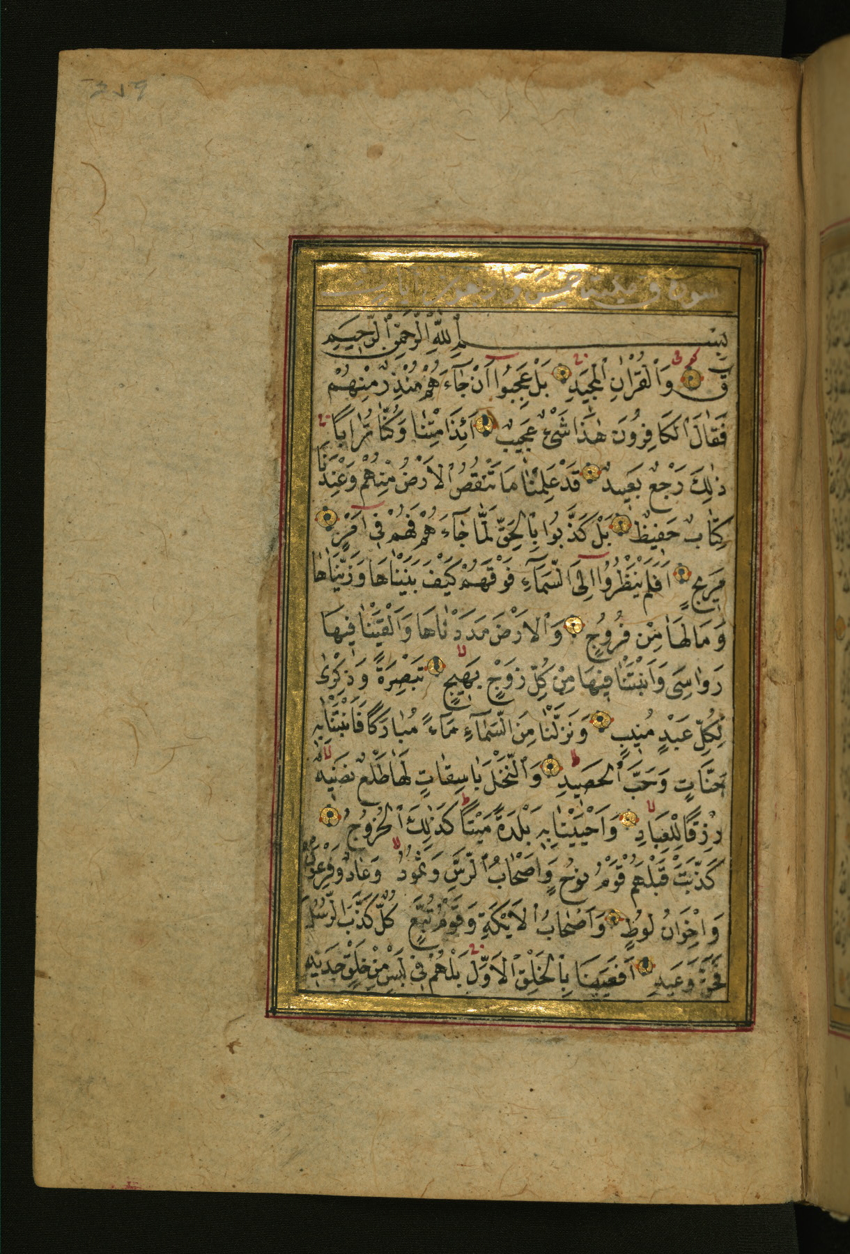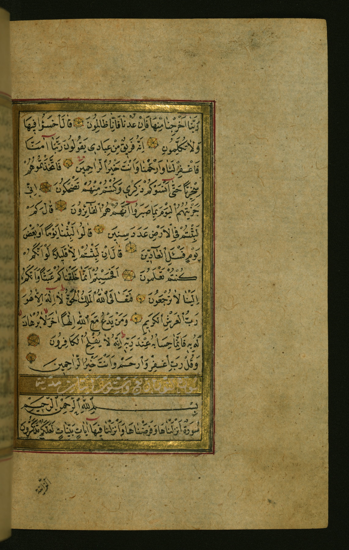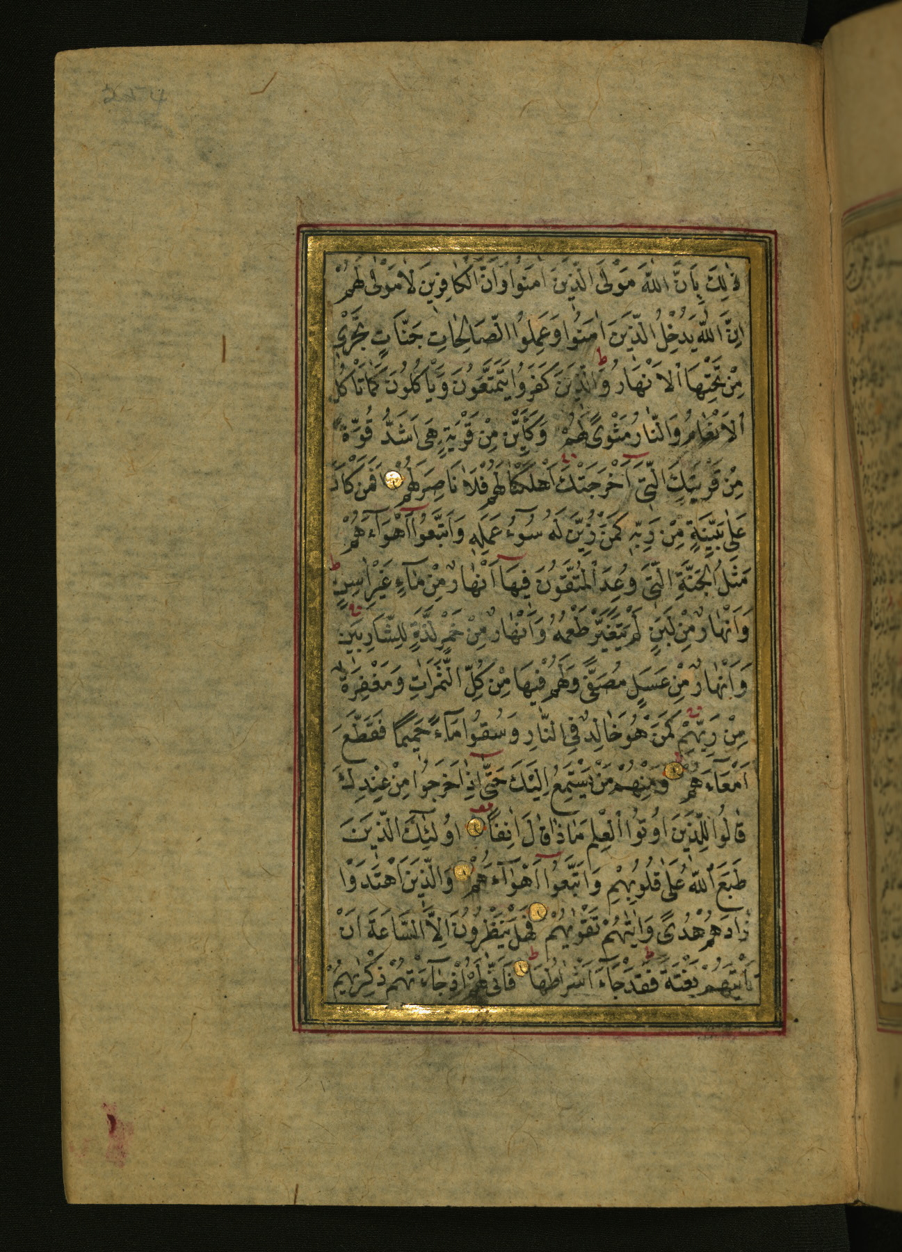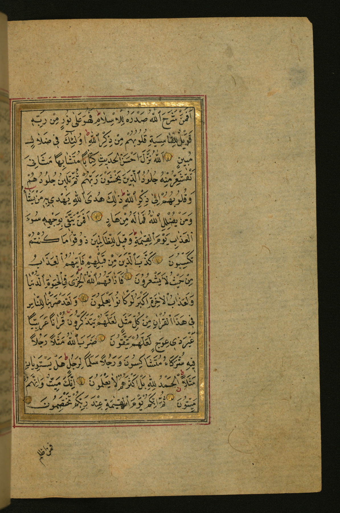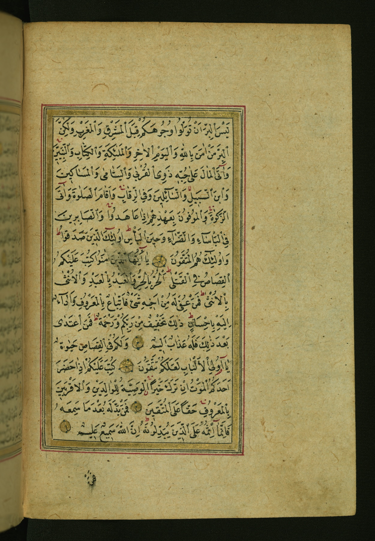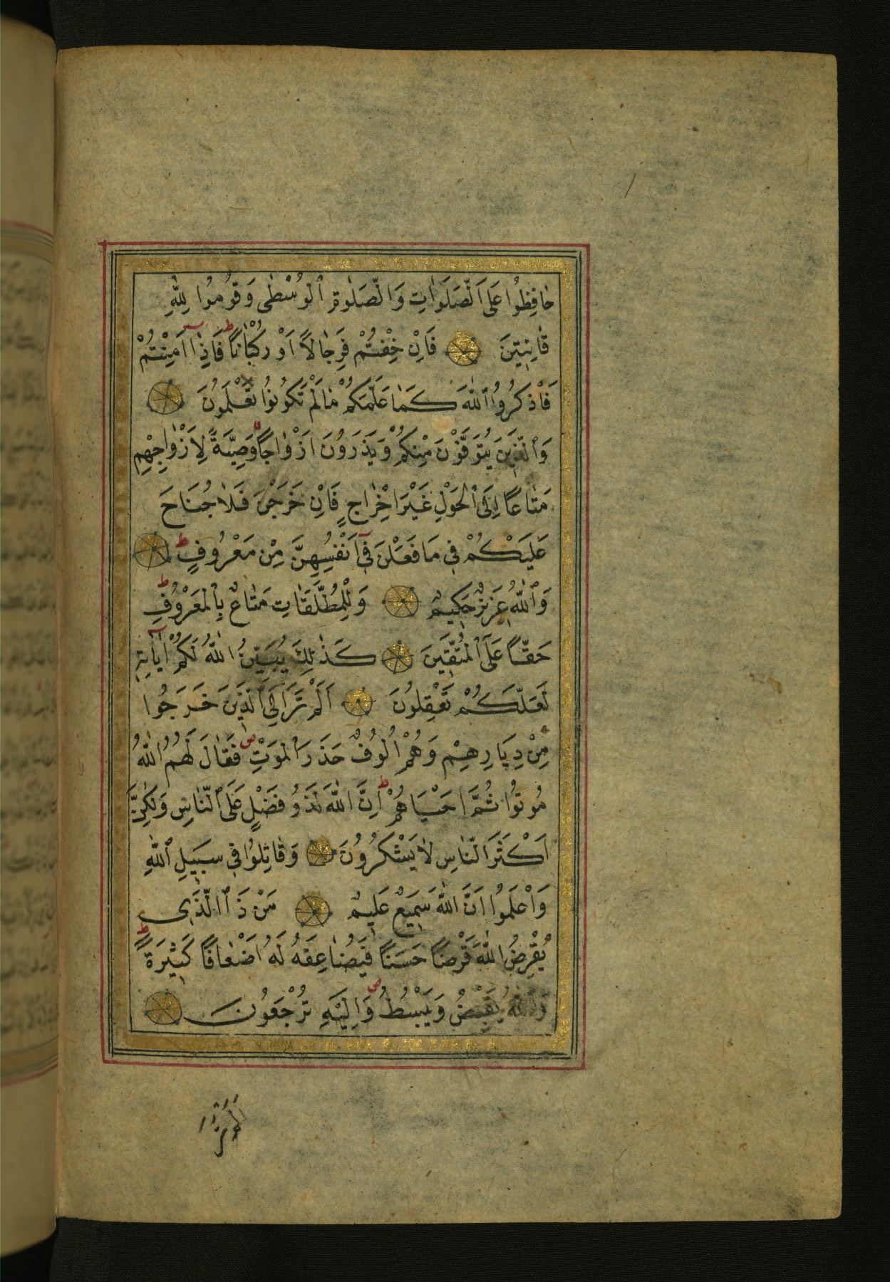 This small, illuminated single-volume copy of the Qurʾan was produced in Ottoman Turkey in 1282 AH / 1865-6 CE by Muḥammad ibn Muṣṭafá Izmīrī, a pupil of al-Rudūsī. The colophon in ijāzah script indicates that the present codex is the twenty-first copy executed by him (fol. 304b). The manuscript opens with an illuminated double-page incipit with the verses of chapters 1 (Sūrat al-fātiḥah) and 2 (Sūrat al-baqarah) (fols. 1b-2a). The text is written in naskh script in black ink with reading marks in red. Verses are separated by illuminated discs with colored dots and chapter headings are in riqāʿ script in white ink. Polychrome medallions in the margins indicate textual divisions and prostration. The binding of black leather is contemporary with the manuscript and decorated with a tooled and gold-painted geometric design enclosed by gold frames on the upper and lower boards.