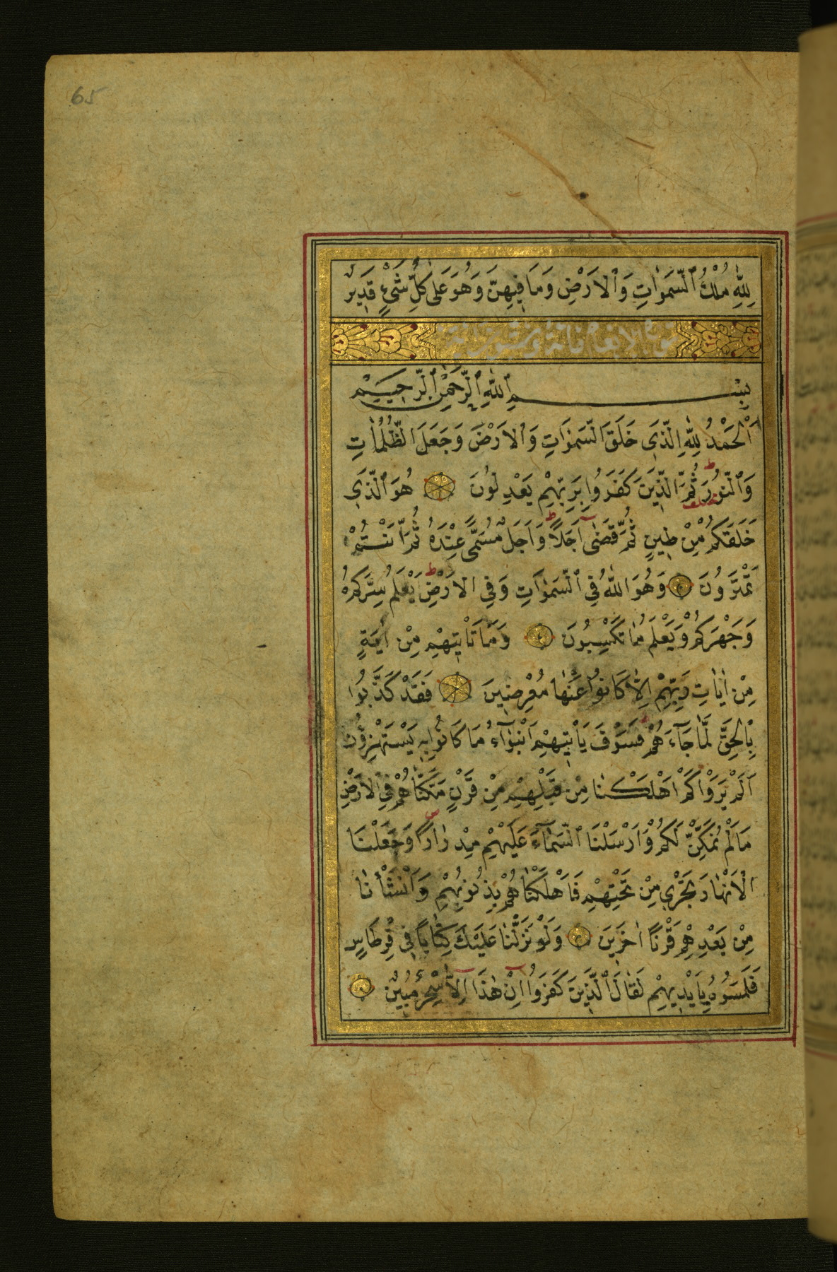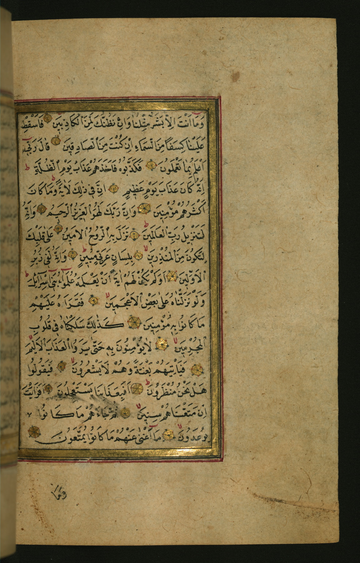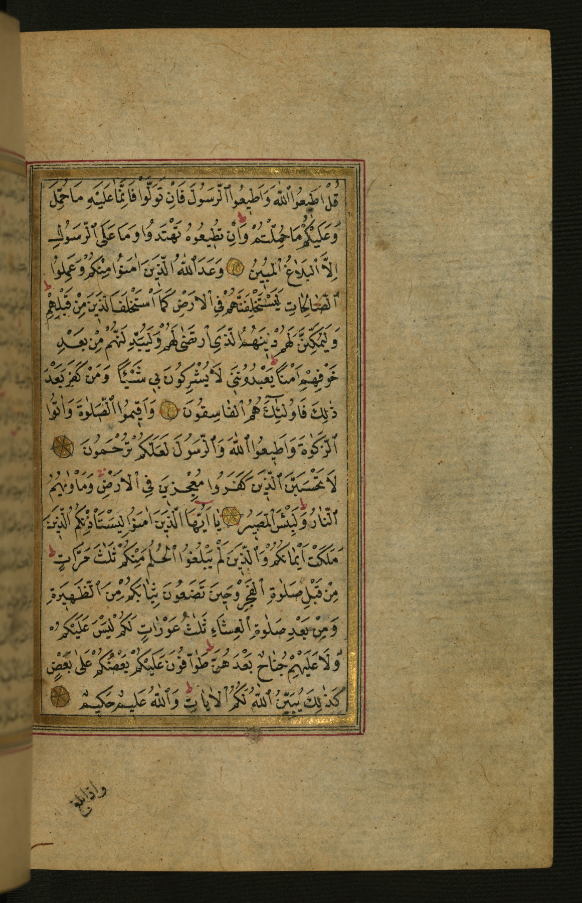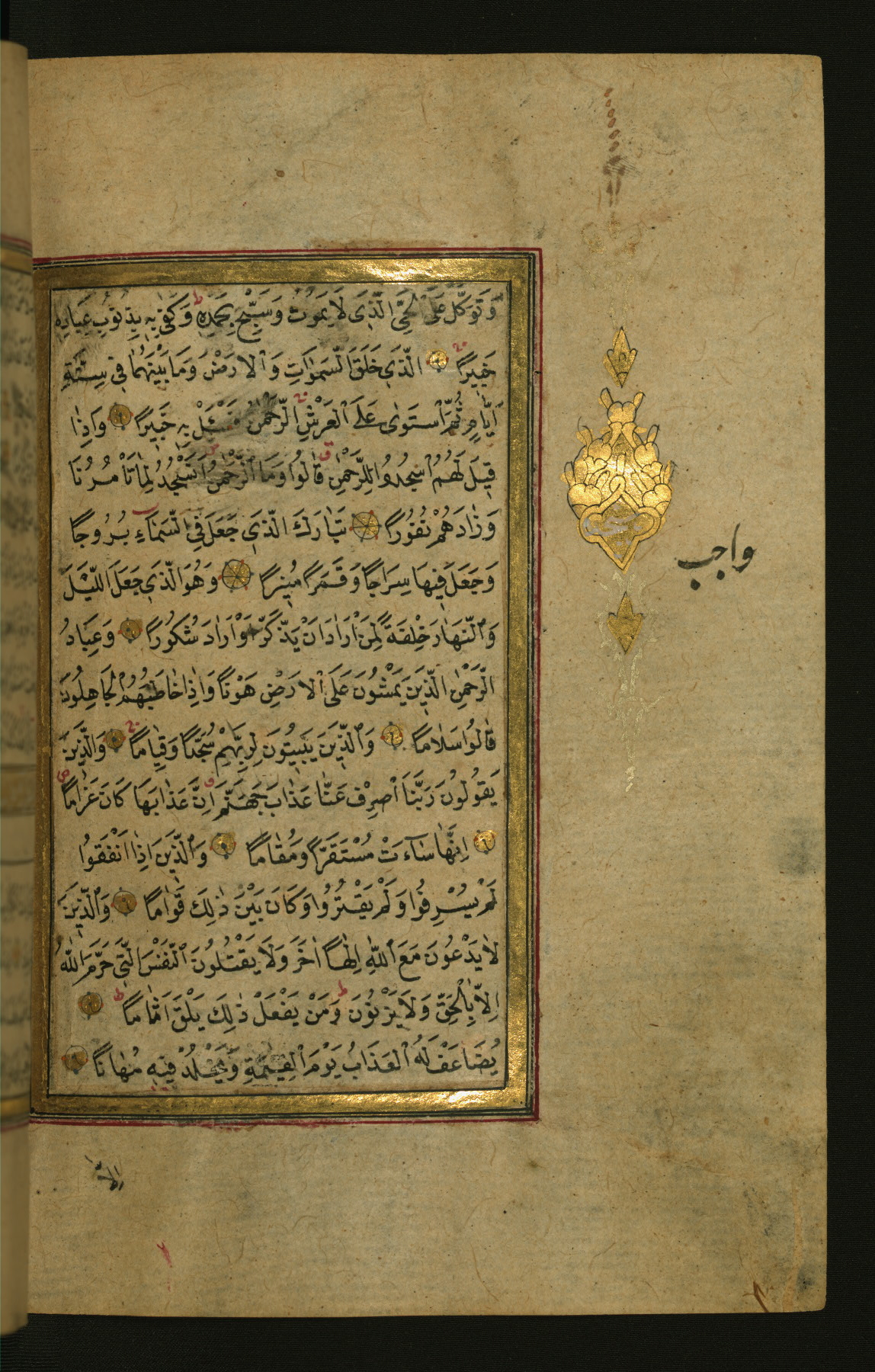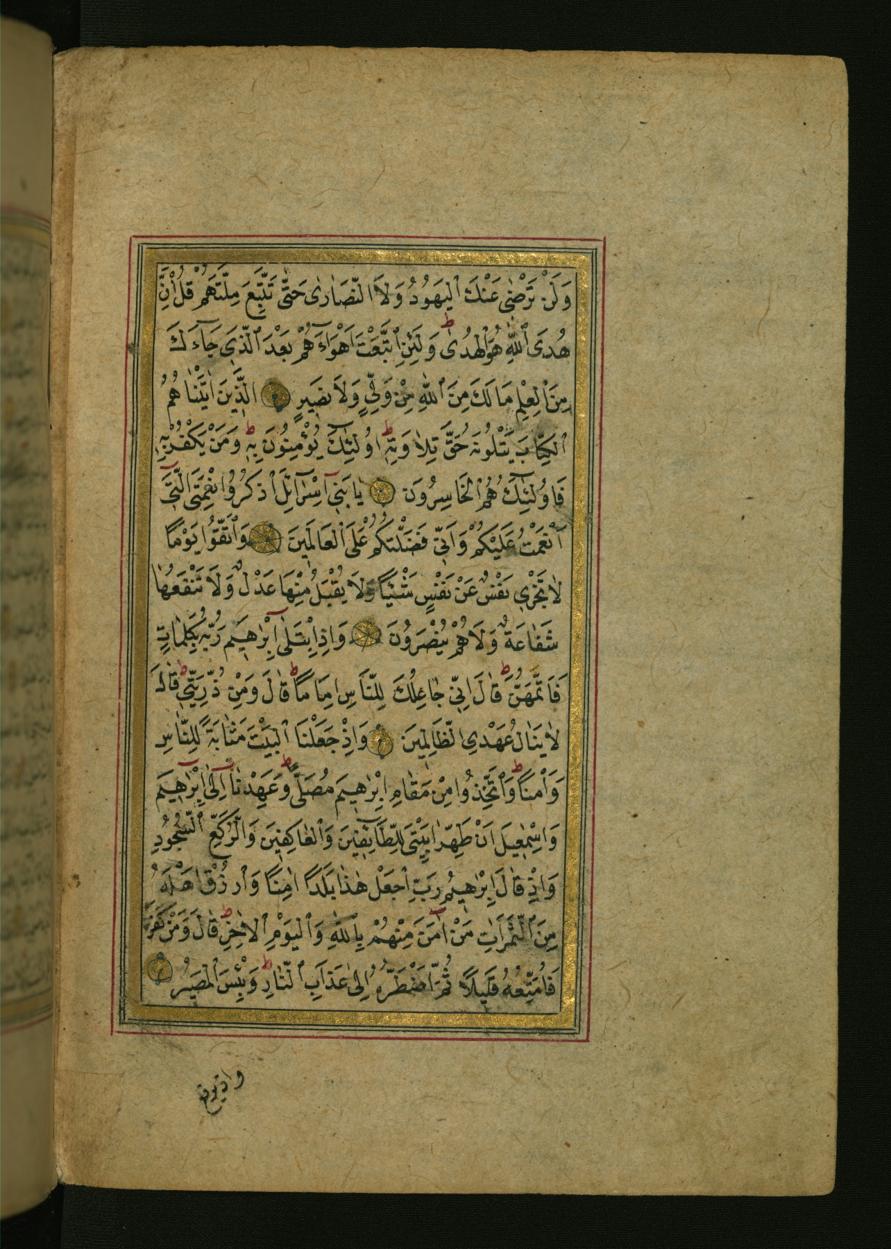 This small, illuminated single-volume copy of the Qurʾan was produced in Ottoman Turkey in 1282 AH / 1865-6 CE by Muḥammad ibn Muṣṭafá Izmīrī, a pupil of al-Rudūsī. The colophon in ijāzah script indicates that the present codex is the twenty-first copy executed by him (fol. 304b). The manuscript opens with an illuminated double-page incipit with the verses of chapters 1 (Sūrat al-fātiḥah) and 2 (Sūrat al-baqarah) (fols. 1b-2a). The text is written in naskh script in black ink with reading marks in red. Verses are separated by illuminated discs with colored dots and chapter headings are in riqāʿ script in white ink. Polychrome medallions in the margins indicate textual divisions and prostration. The binding of black leather is contemporary with the manuscript and decorated with a tooled and gold-painted geometric design enclosed by gold frames on the upper and lower boards.